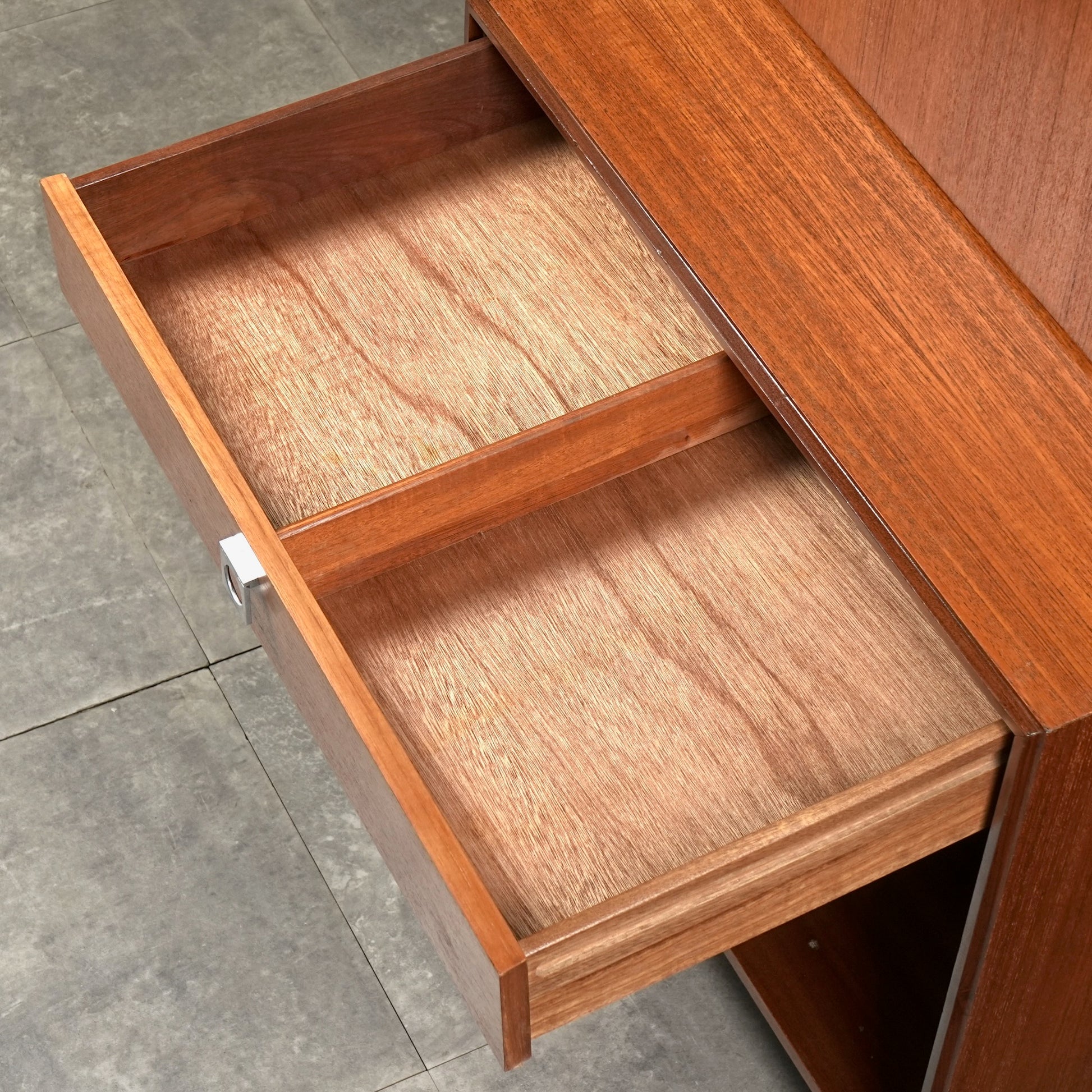 上質なチーク材の木目と質感に加えて、すっきりとした直線的なデザインからは、どんな空間にも溶け込むミニマルな美しさが感じられます。