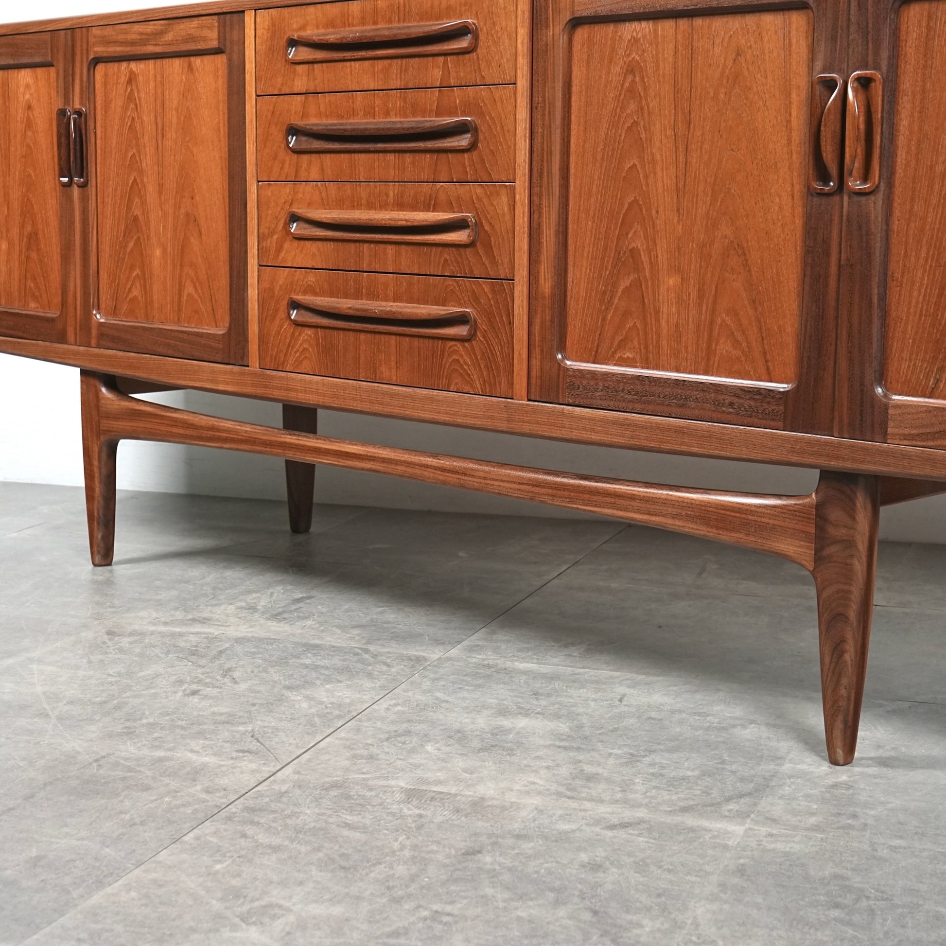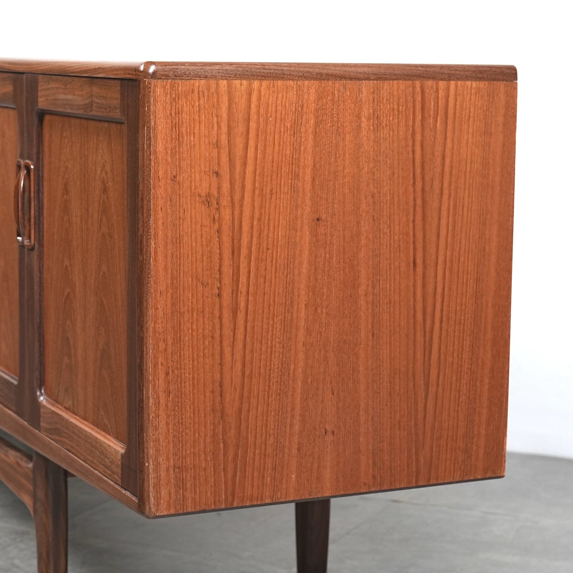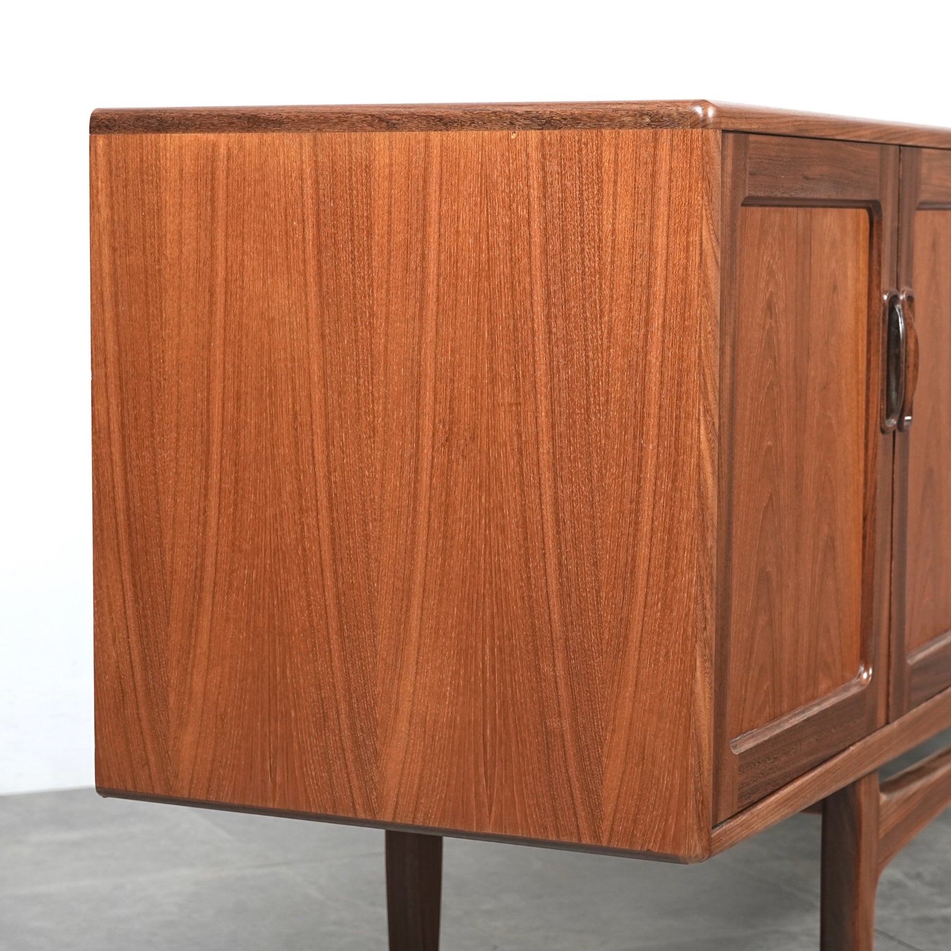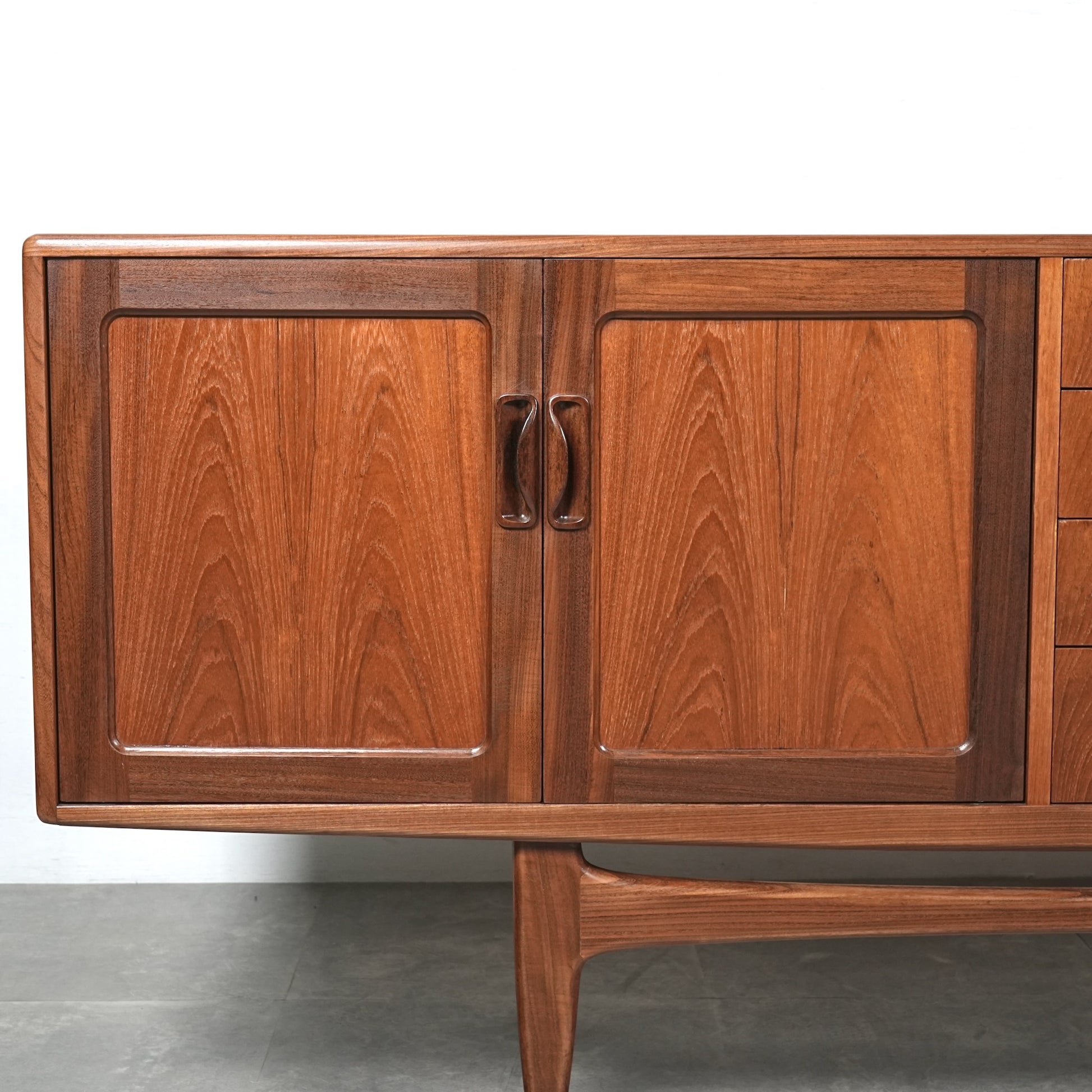 現地ではLong John(ロングジョン)という相性で親しまれている名作サイドボードで、チーク材の木目と質感に加えて、Frescoシリーズの特徴でもある削り出しの可愛らしい取手が良いアクセントになった流石の美しいデザイン。