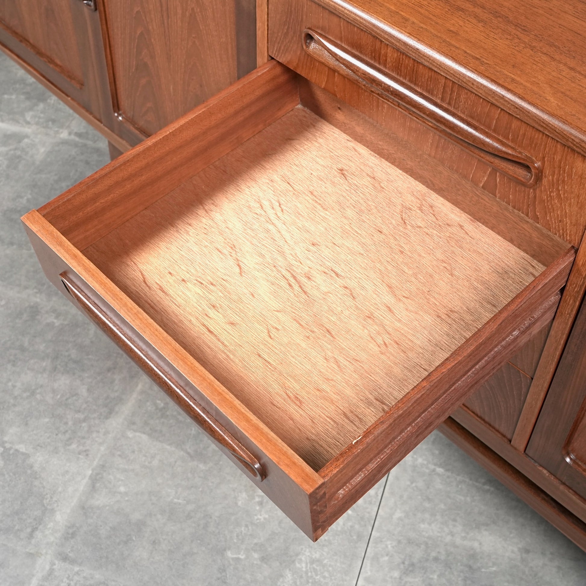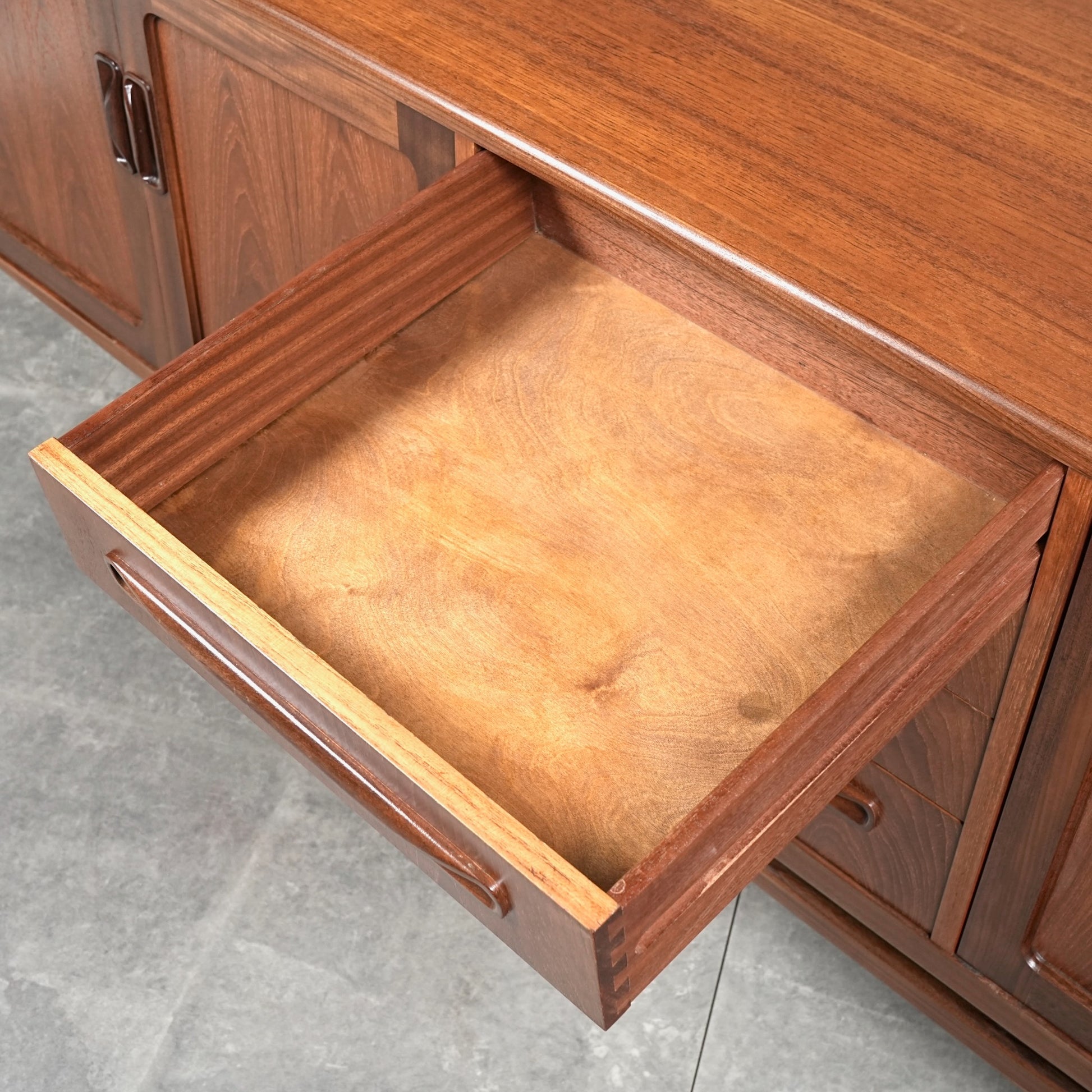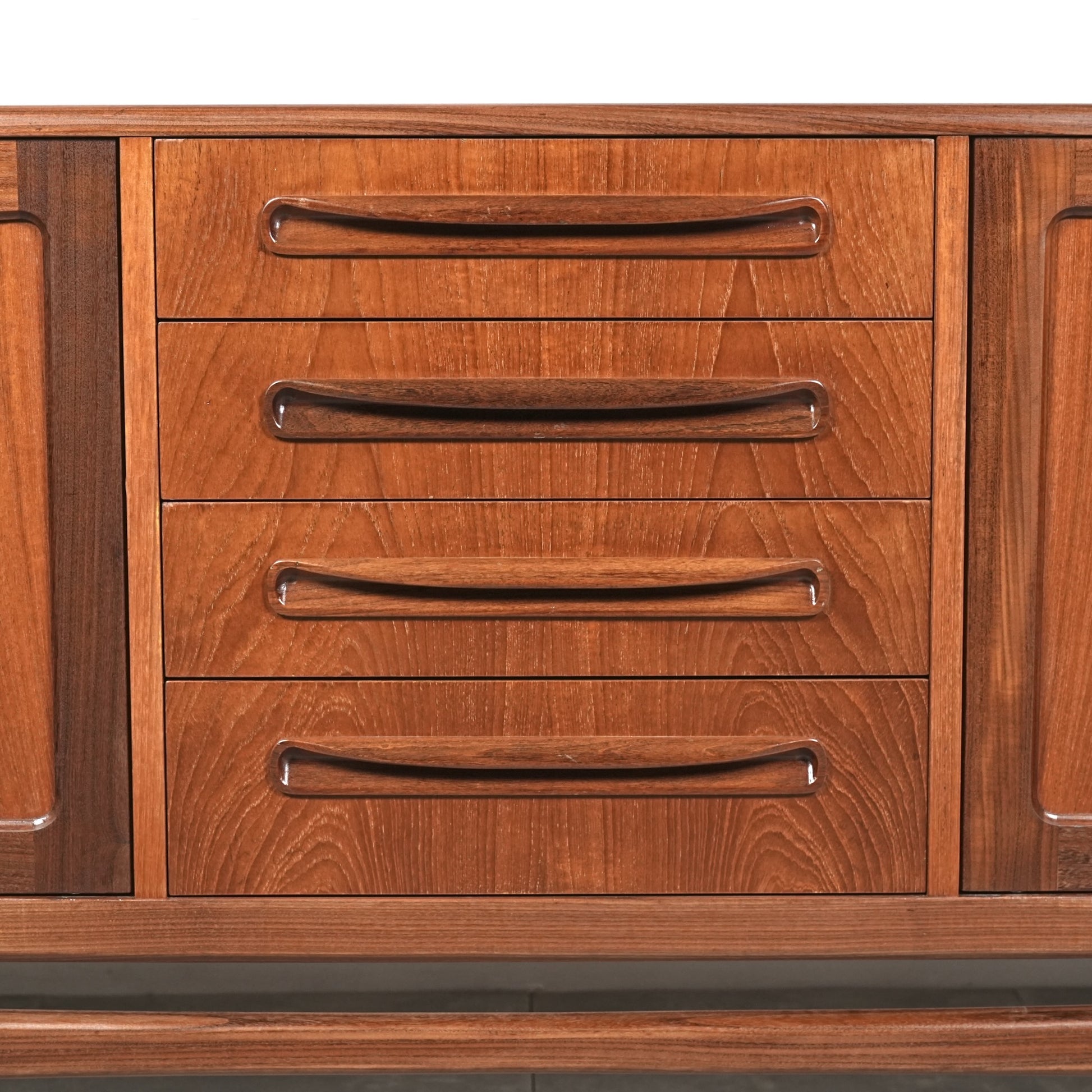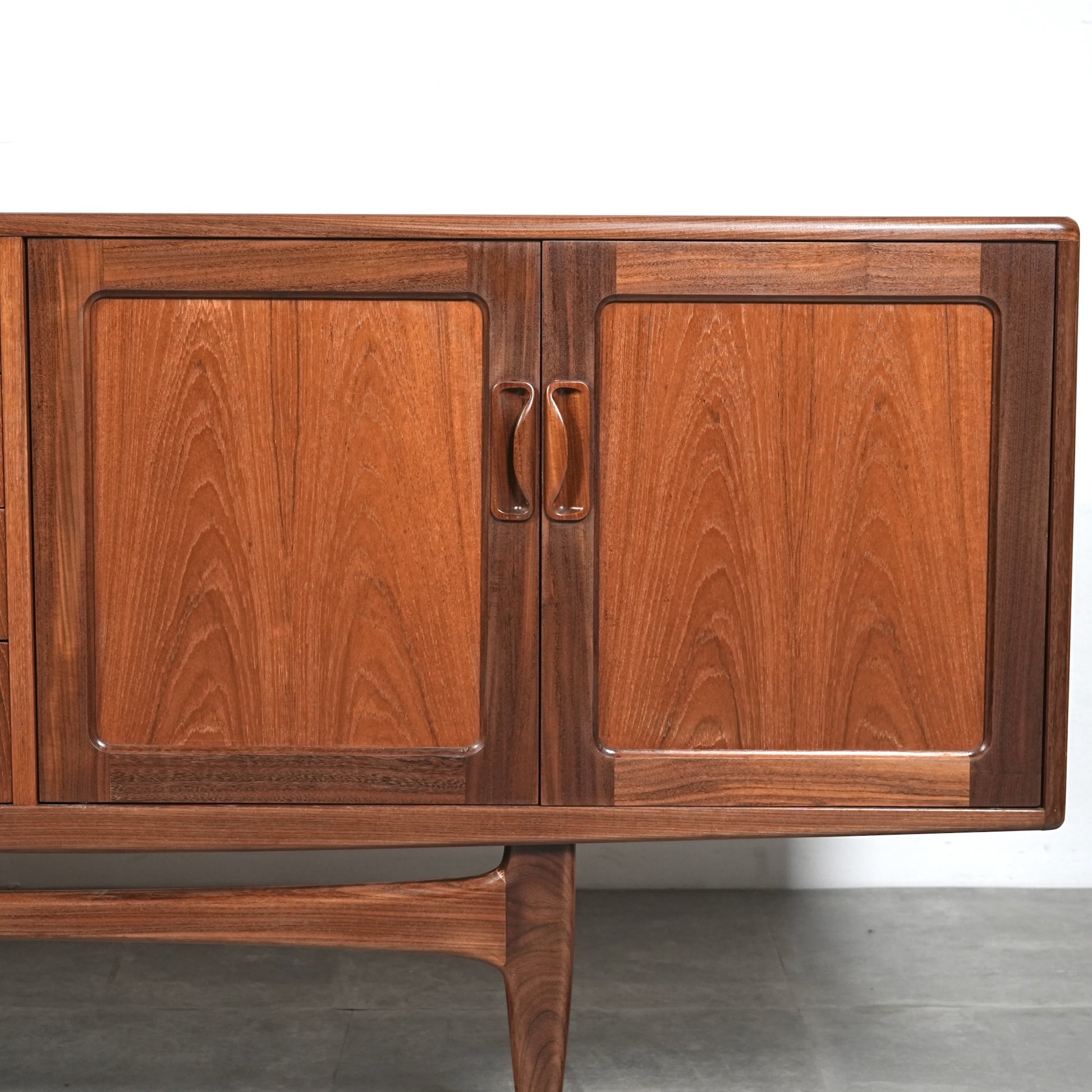 現地ではLong John(ロングジョン)という相性で親しまれている名作サイドボードで、チーク材の木目と質感に加えて、Frescoシリーズの特徴でもある削り出しの可愛らしい取手が良いアクセントになった流石の美しいデザイン。