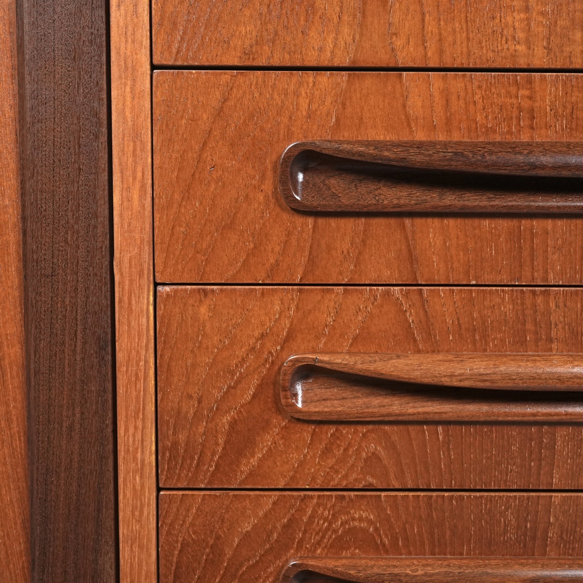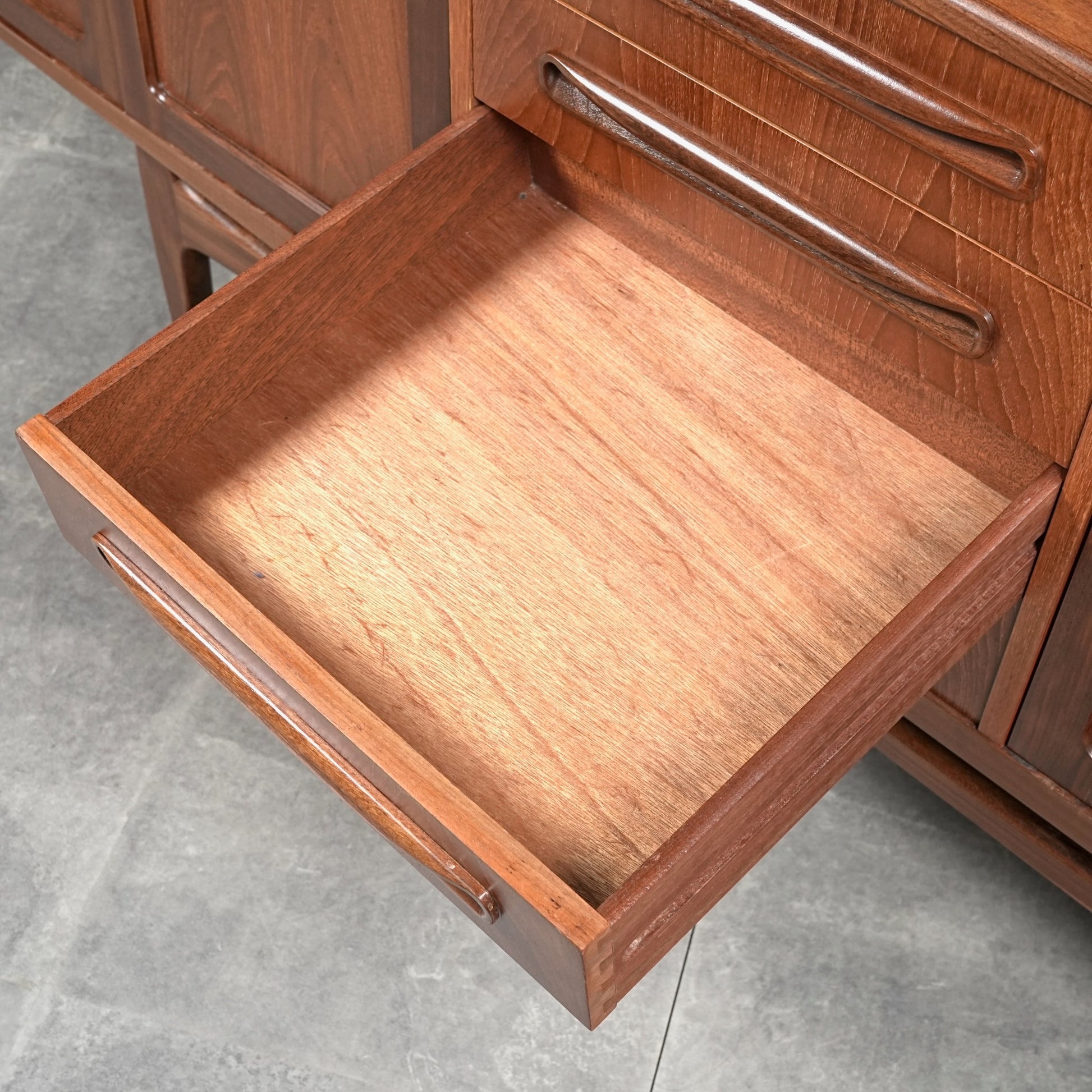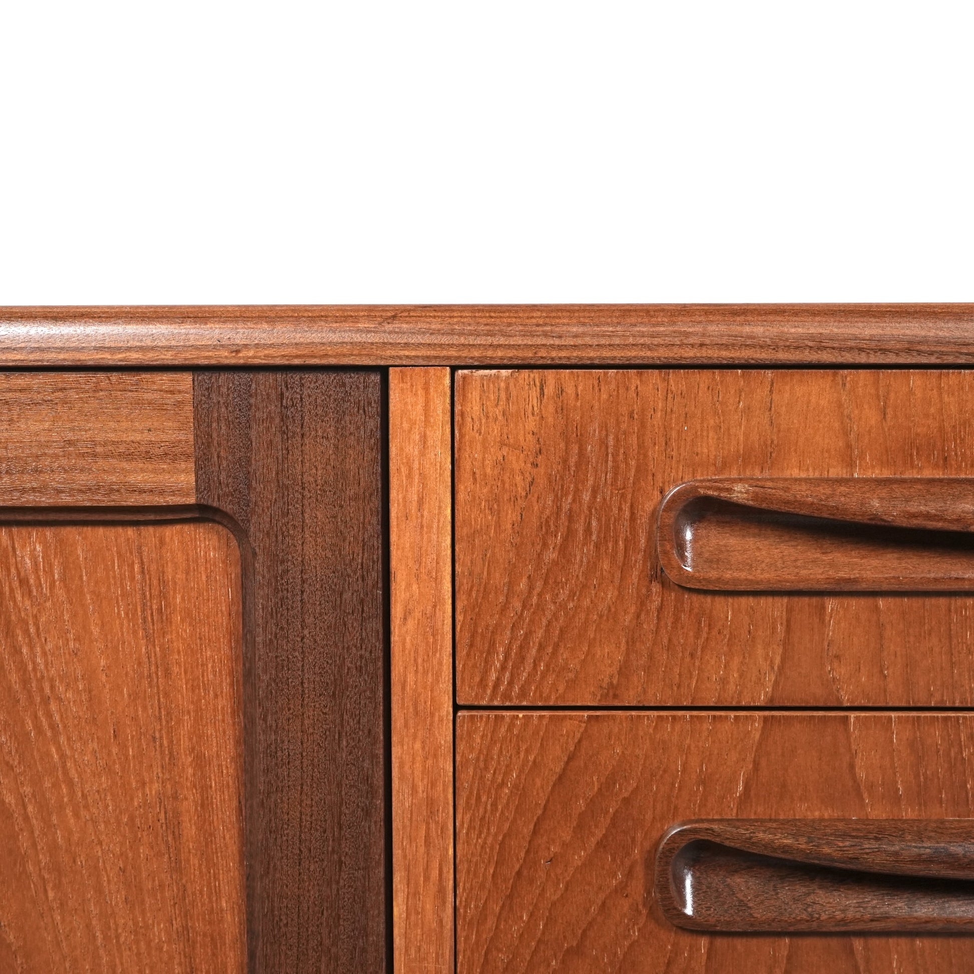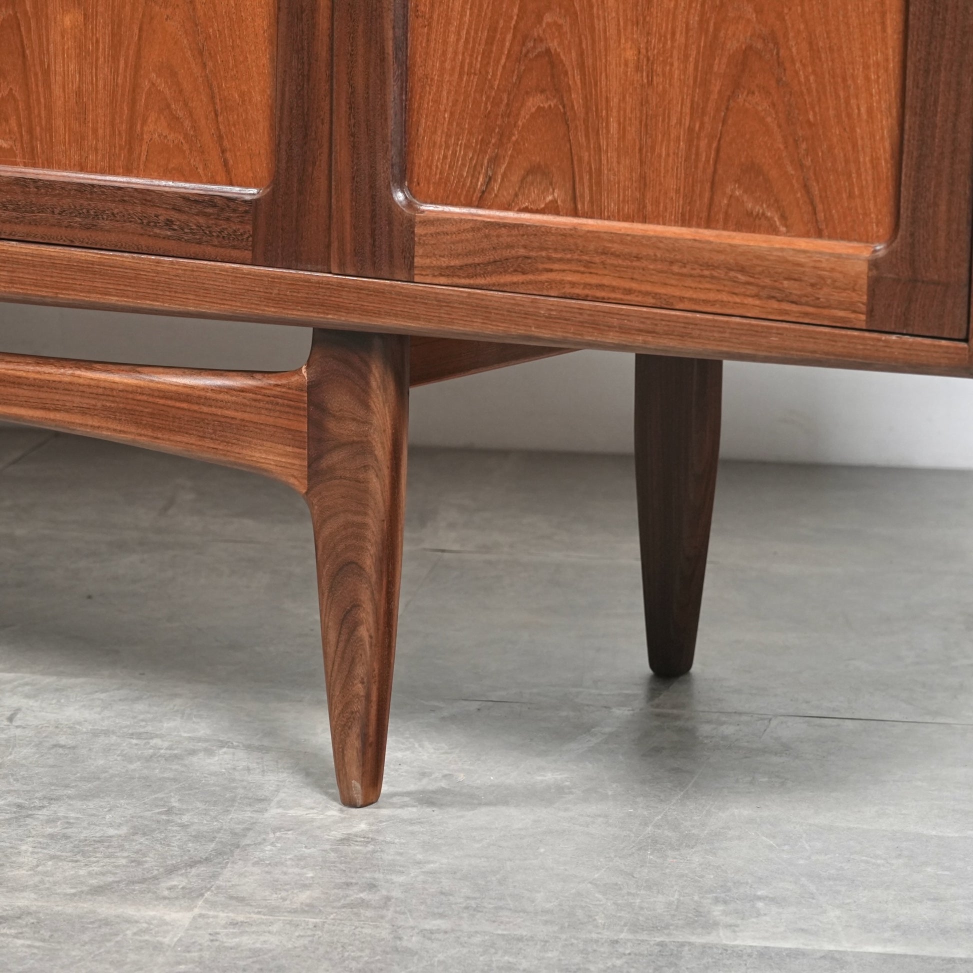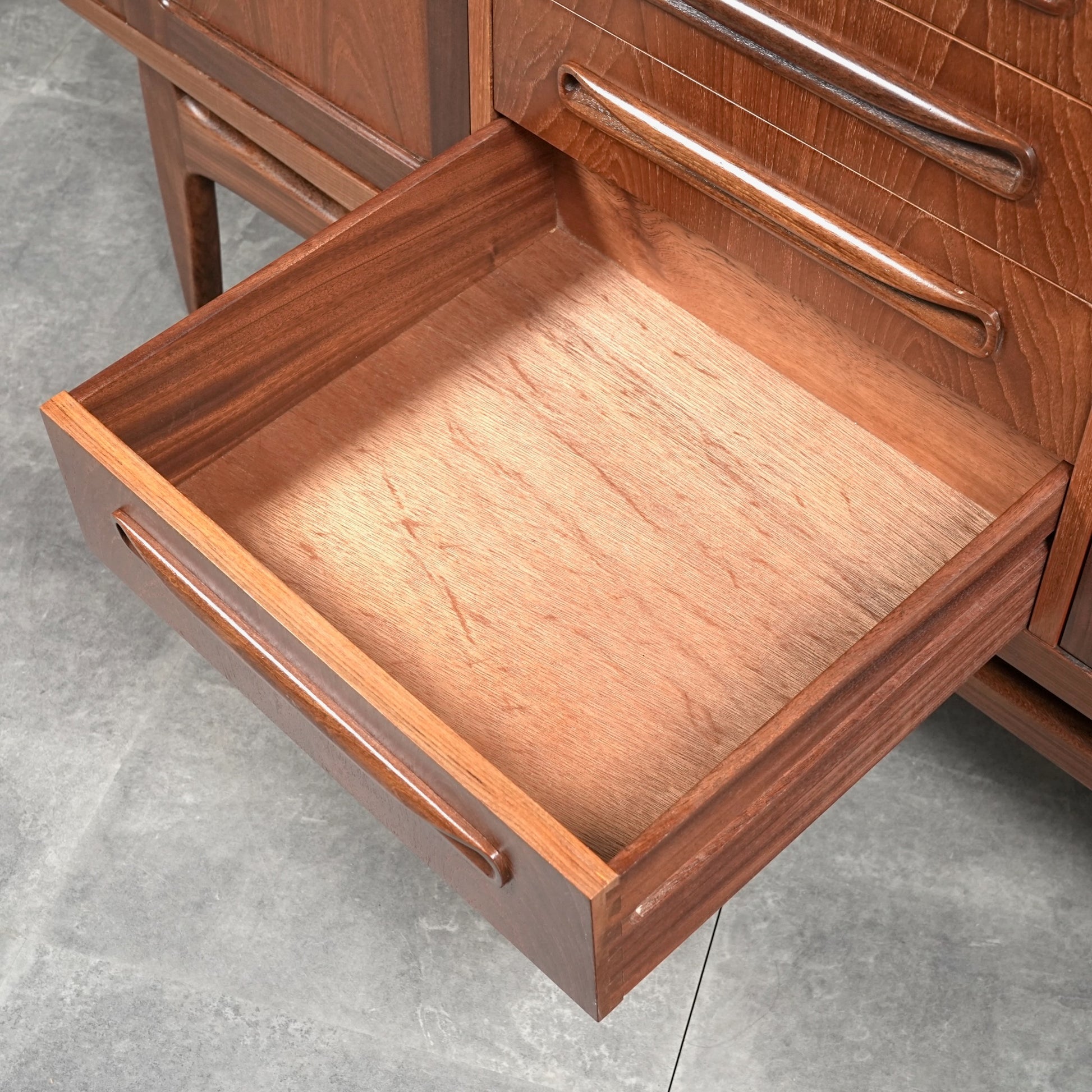 現地ではLong John(ロングジョン)という相性で親しまれている名作サイドボードで、チーク材の木目と質感に加えて、Frescoシリーズの特徴でもある削り出しの可愛らしい取手が良いアクセントになった流石の美しいデザイン。