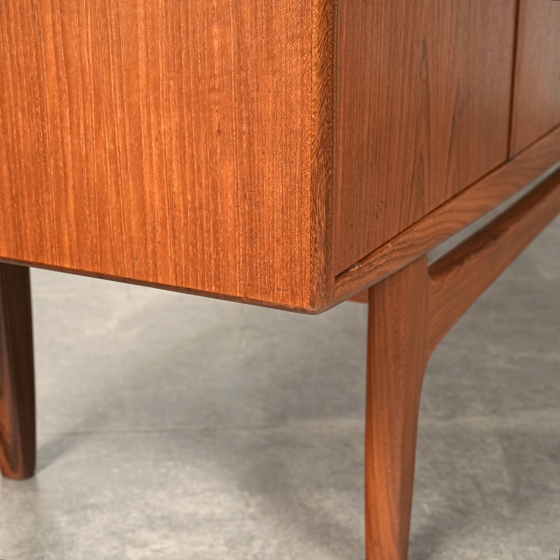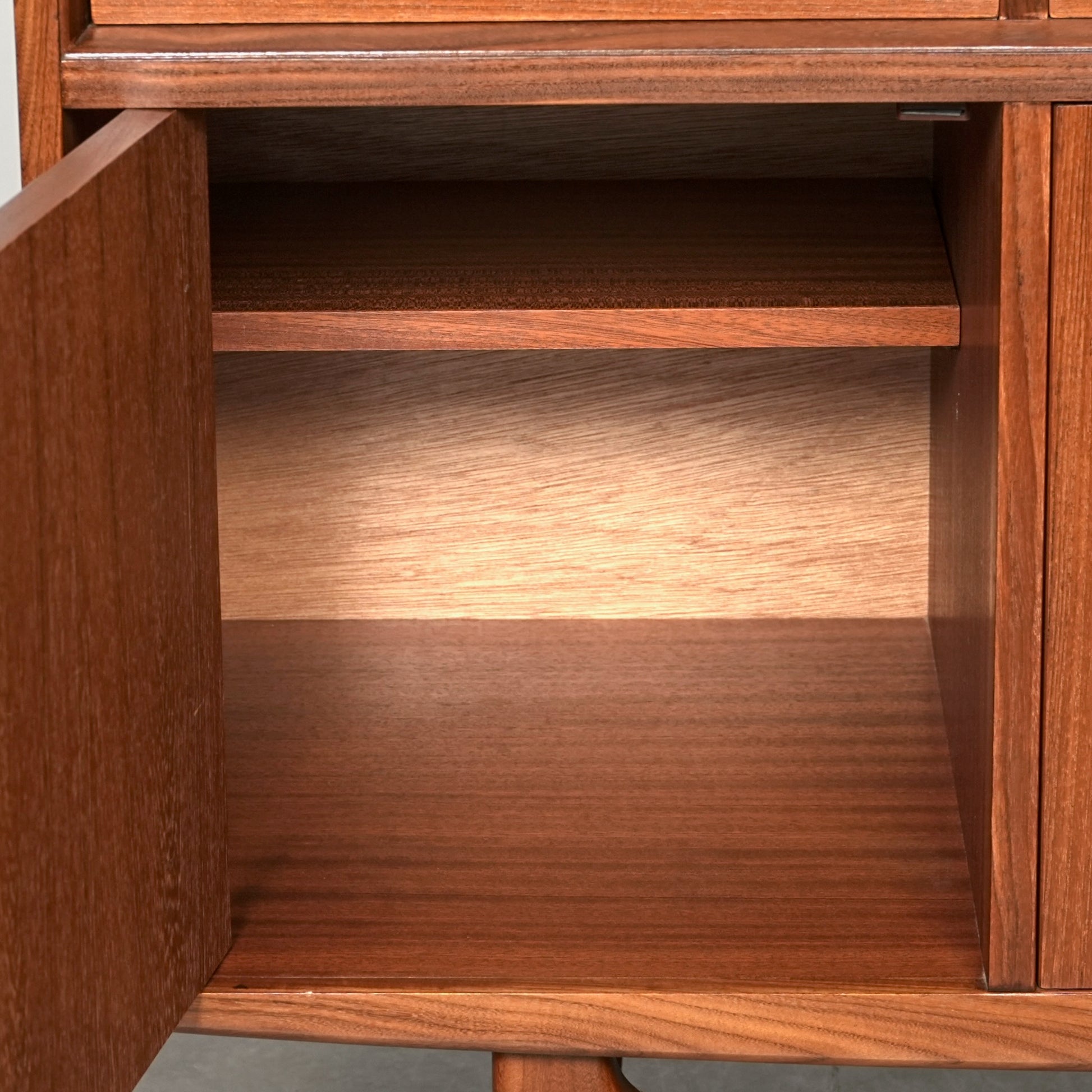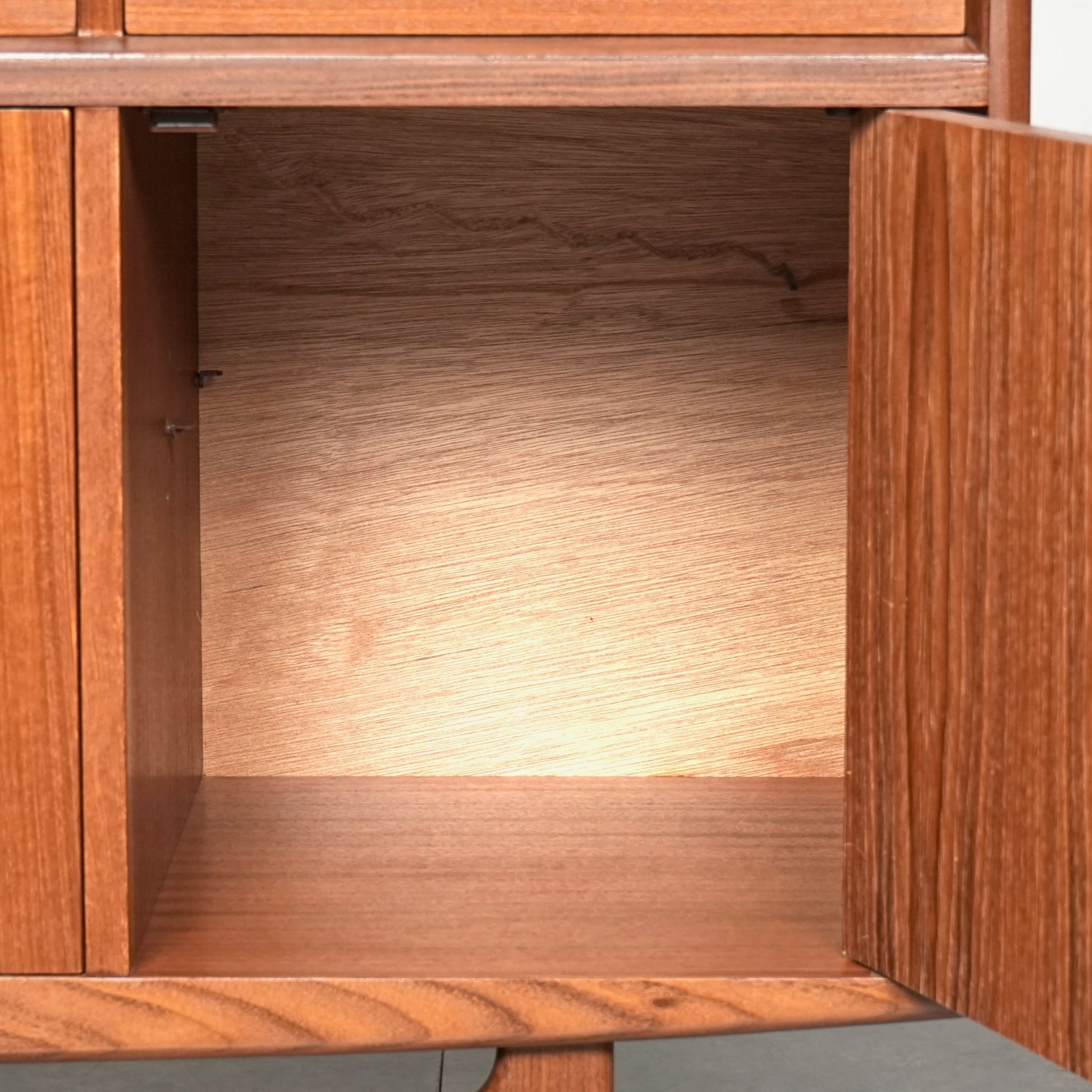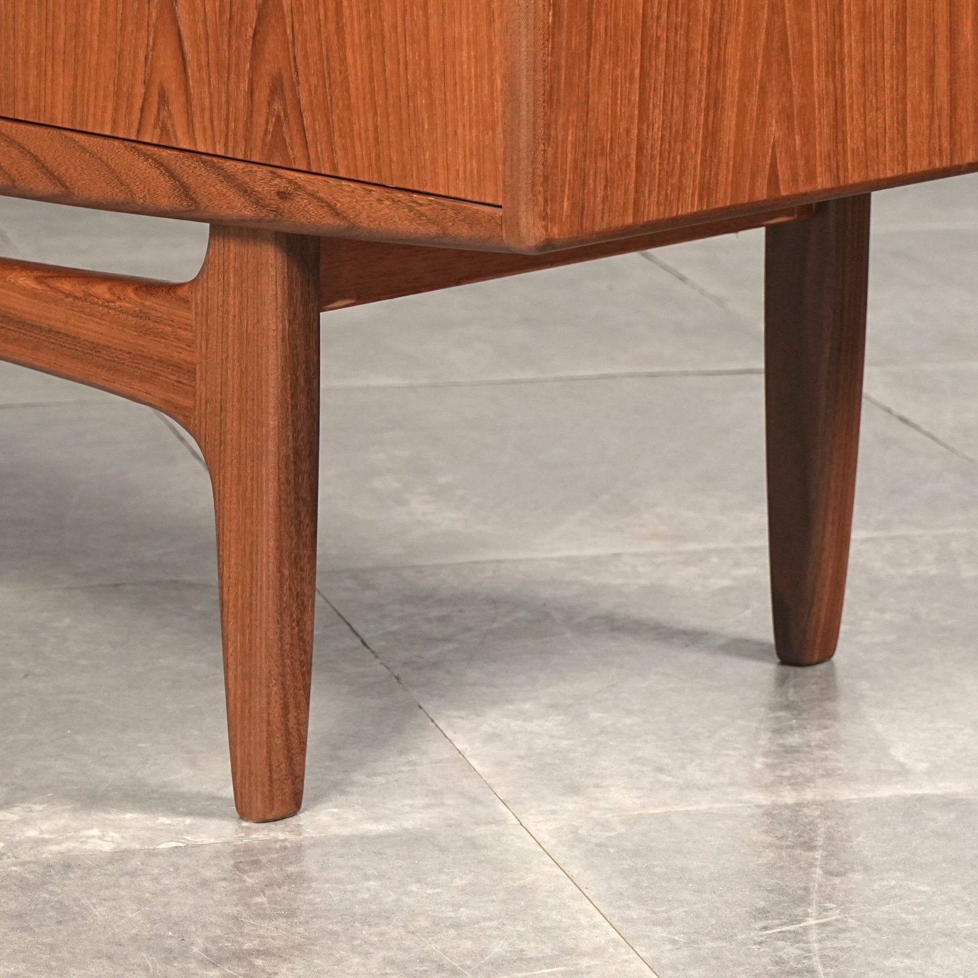 通常のサイドボードよりもコンパクトな嬉しいサイズ感で、チーク材の木目と質感に加えてFrescoシリーズの特徴でもある削り出しの可愛らしい取手が良いアクセントになった流石の美しいデザイン。