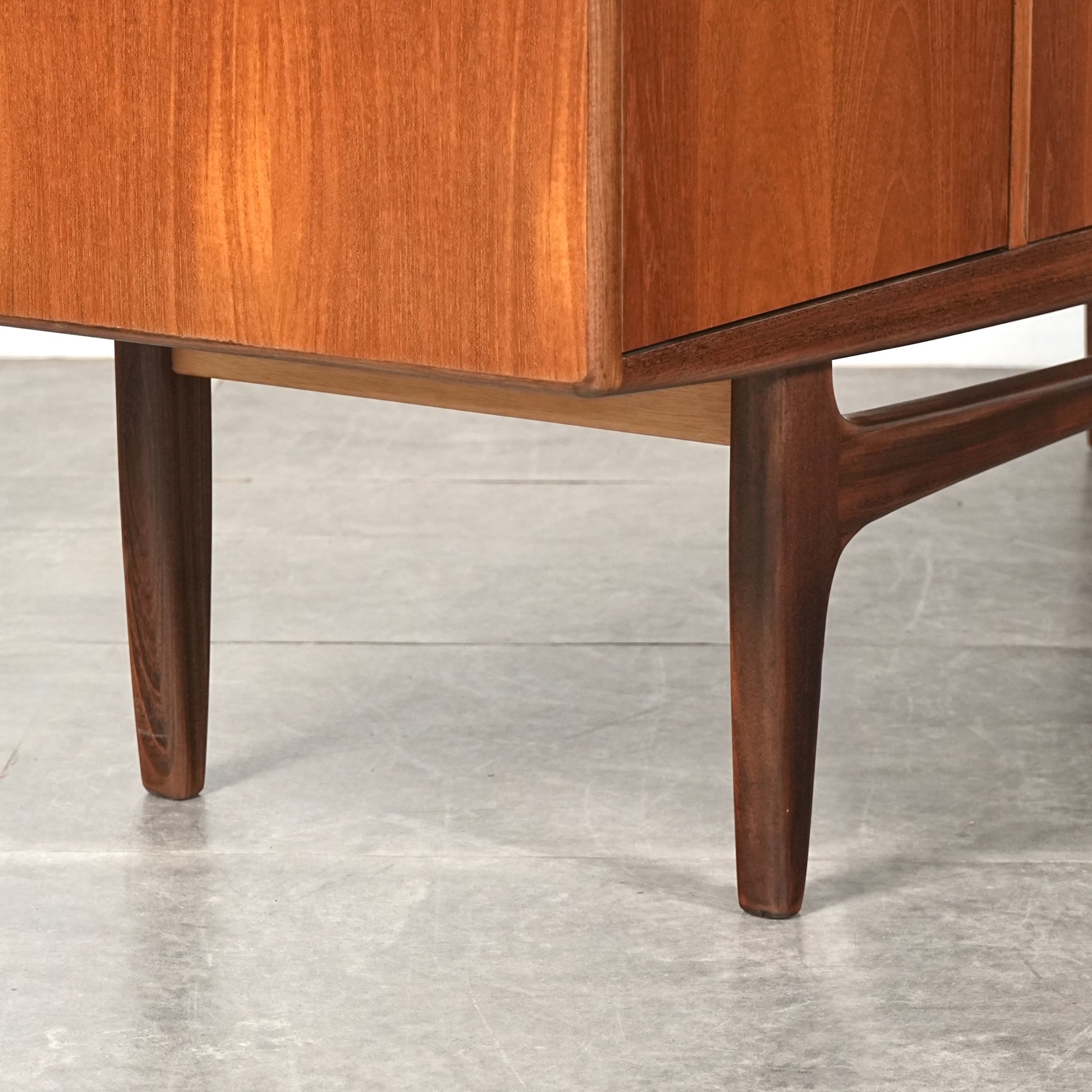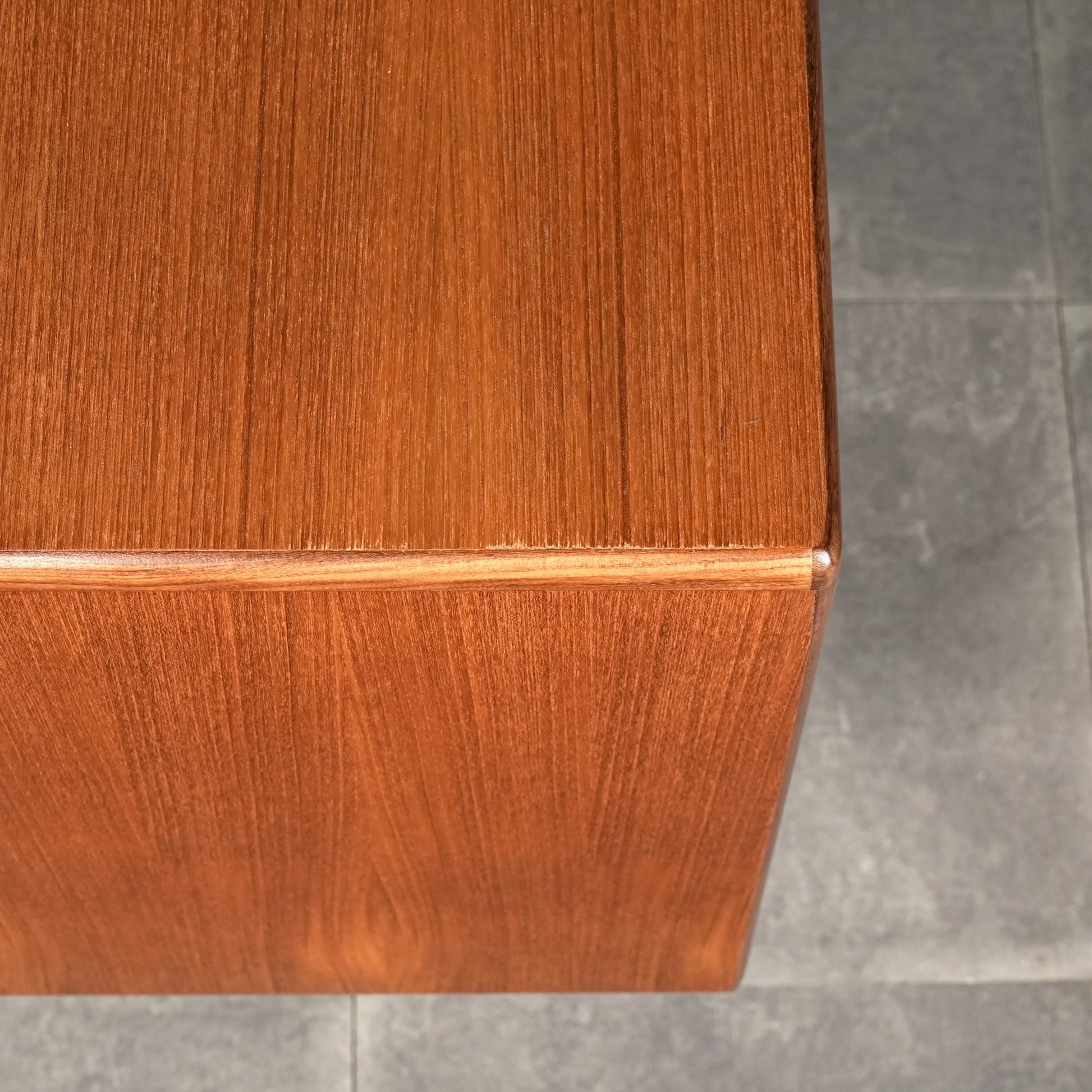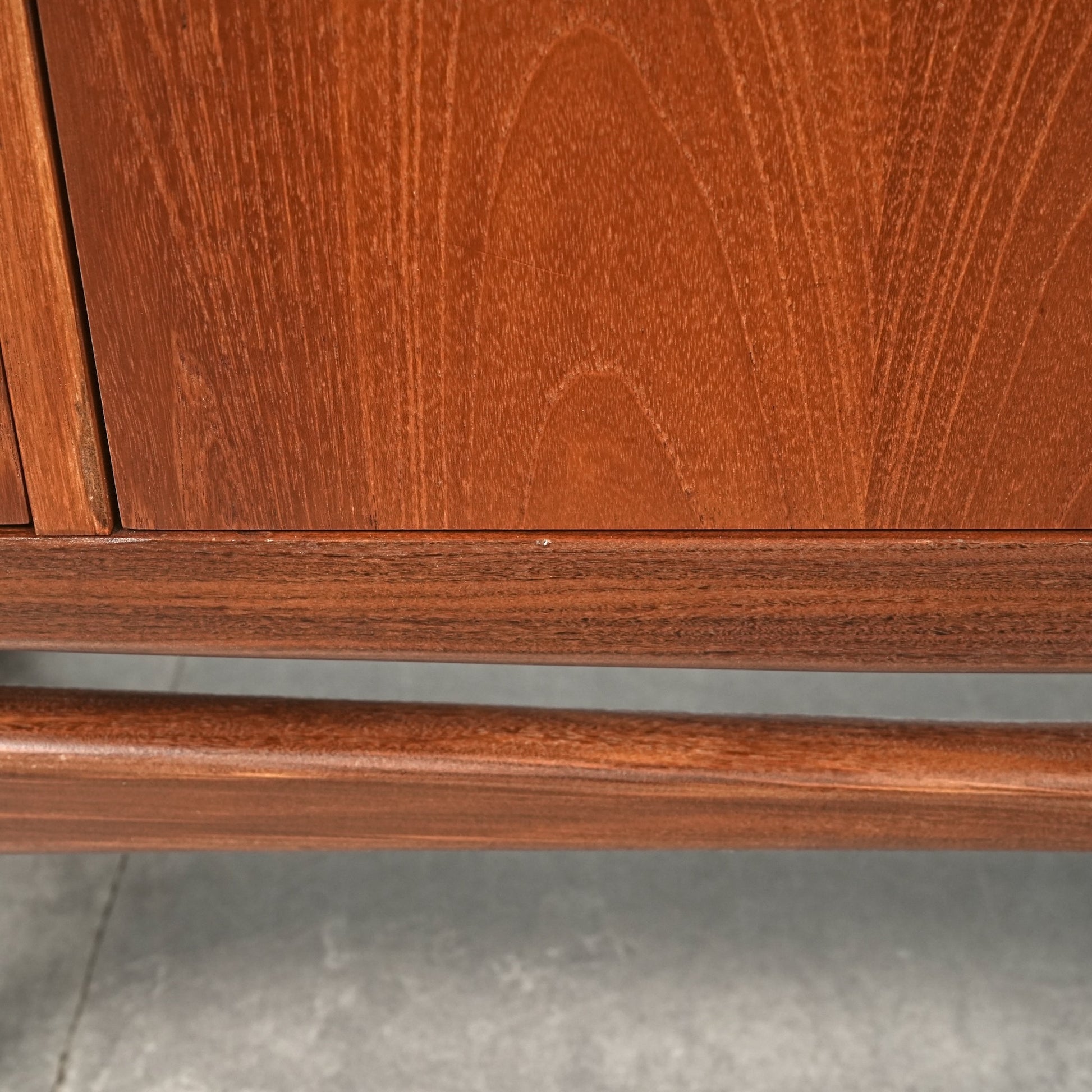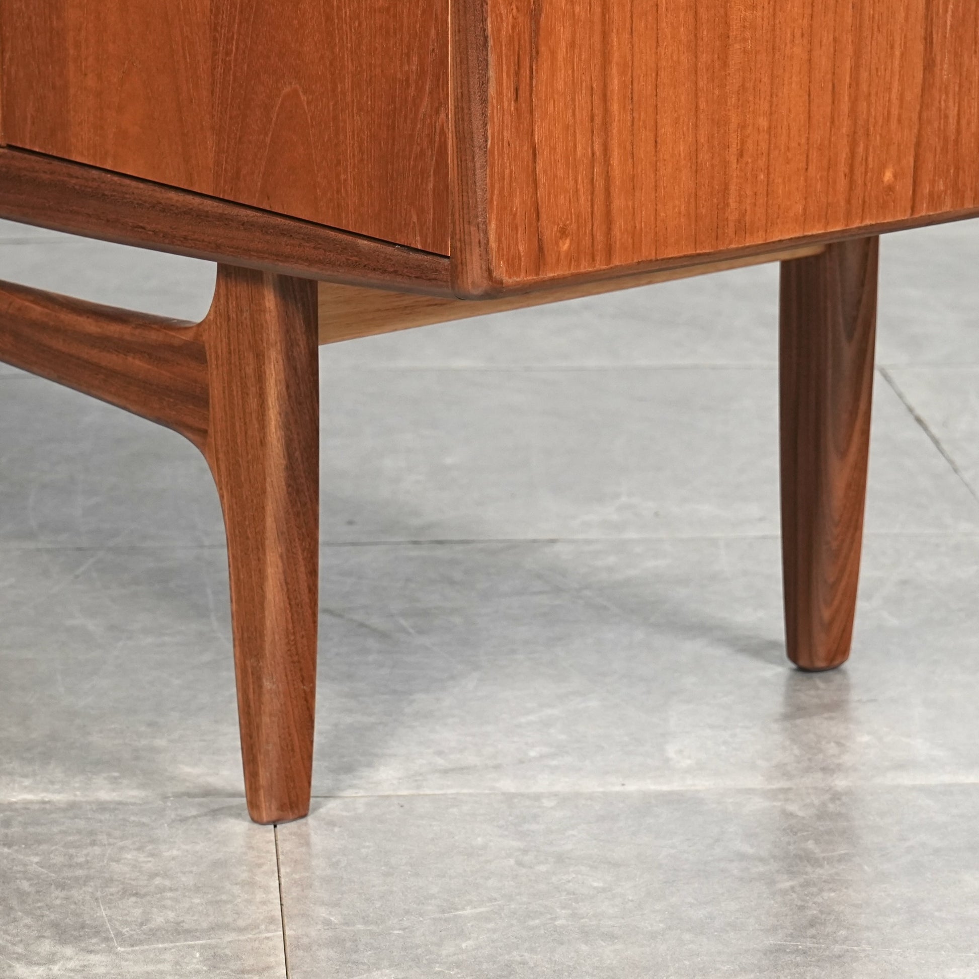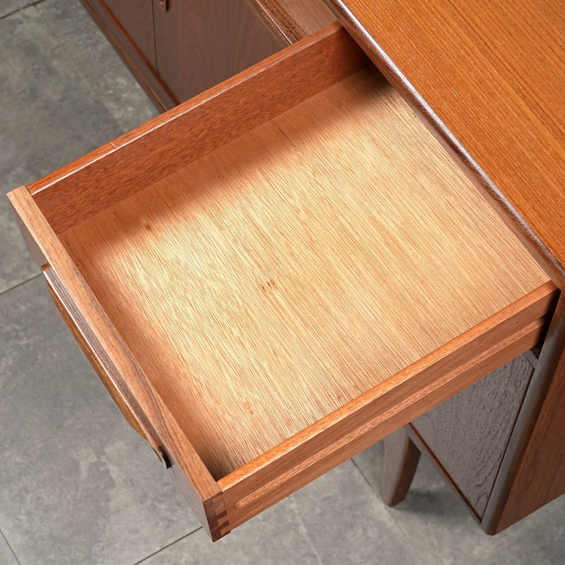 通常のサイドボードよりもコンパクトな嬉しいサイズ感で、チーク材の木目と質感に加えてFrescoシリーズの特徴でもある削り出しの可愛らしい取手が良いアクセントになった流石の美しいデザイン。