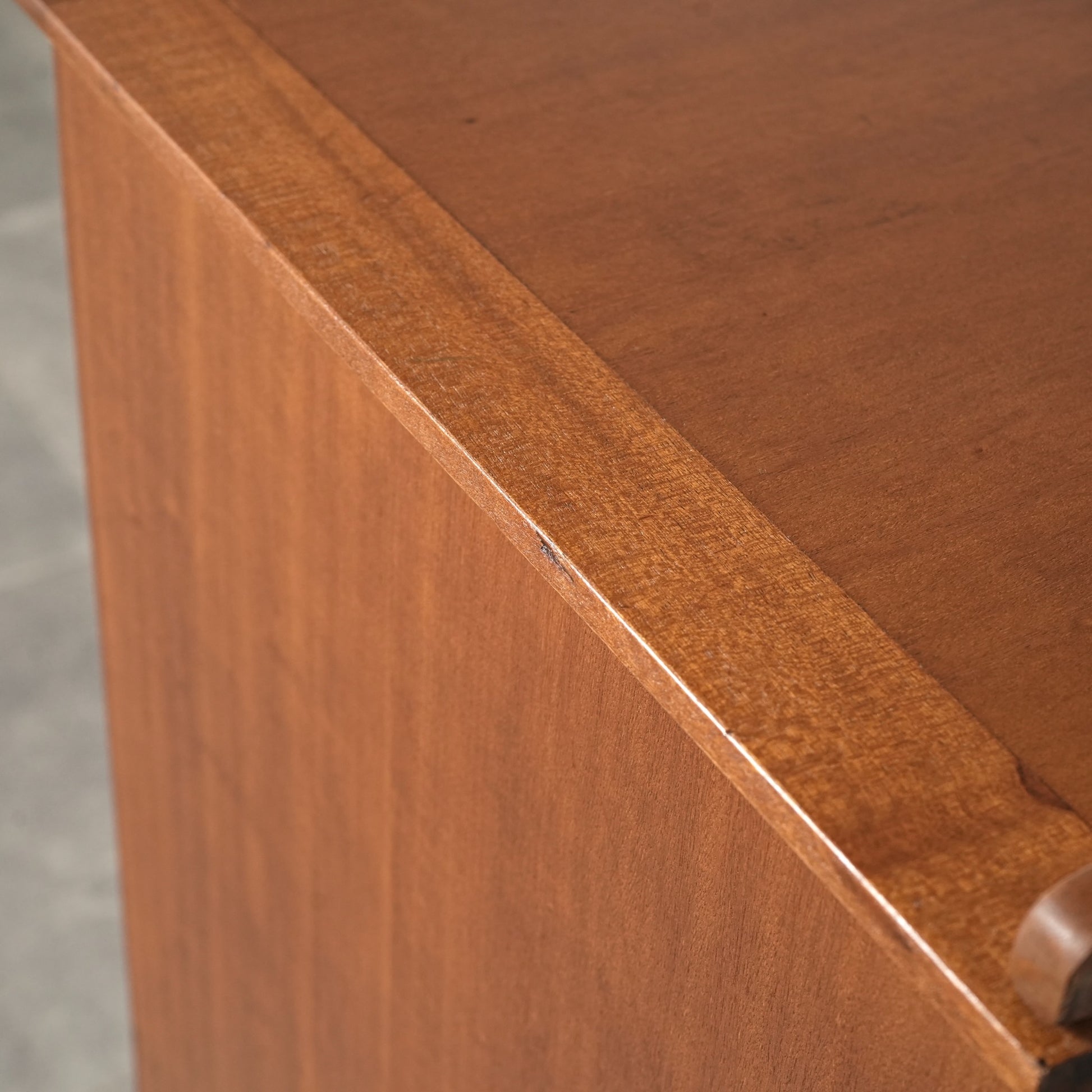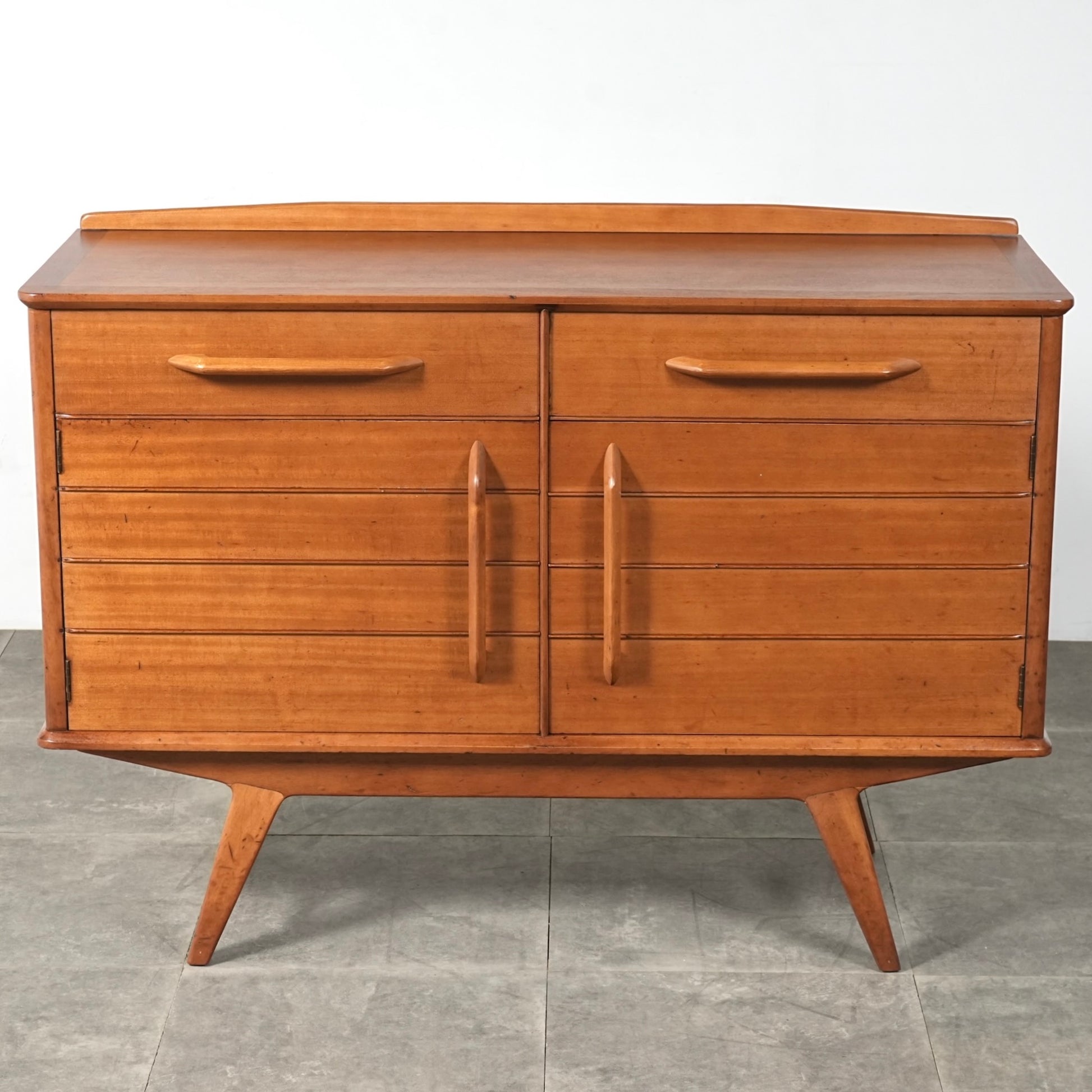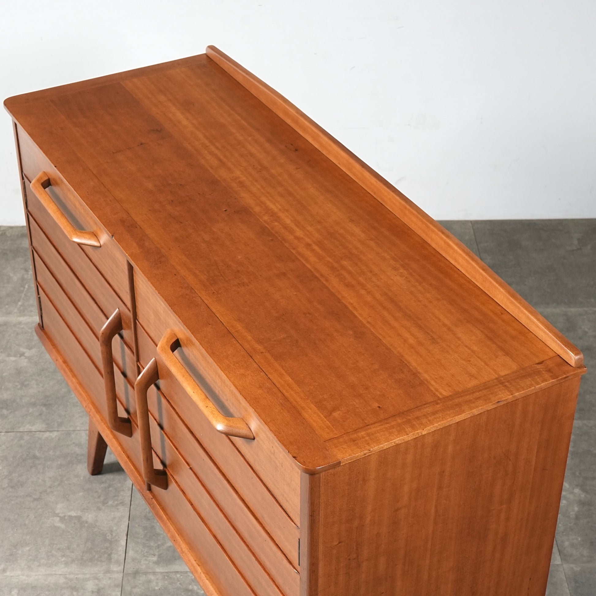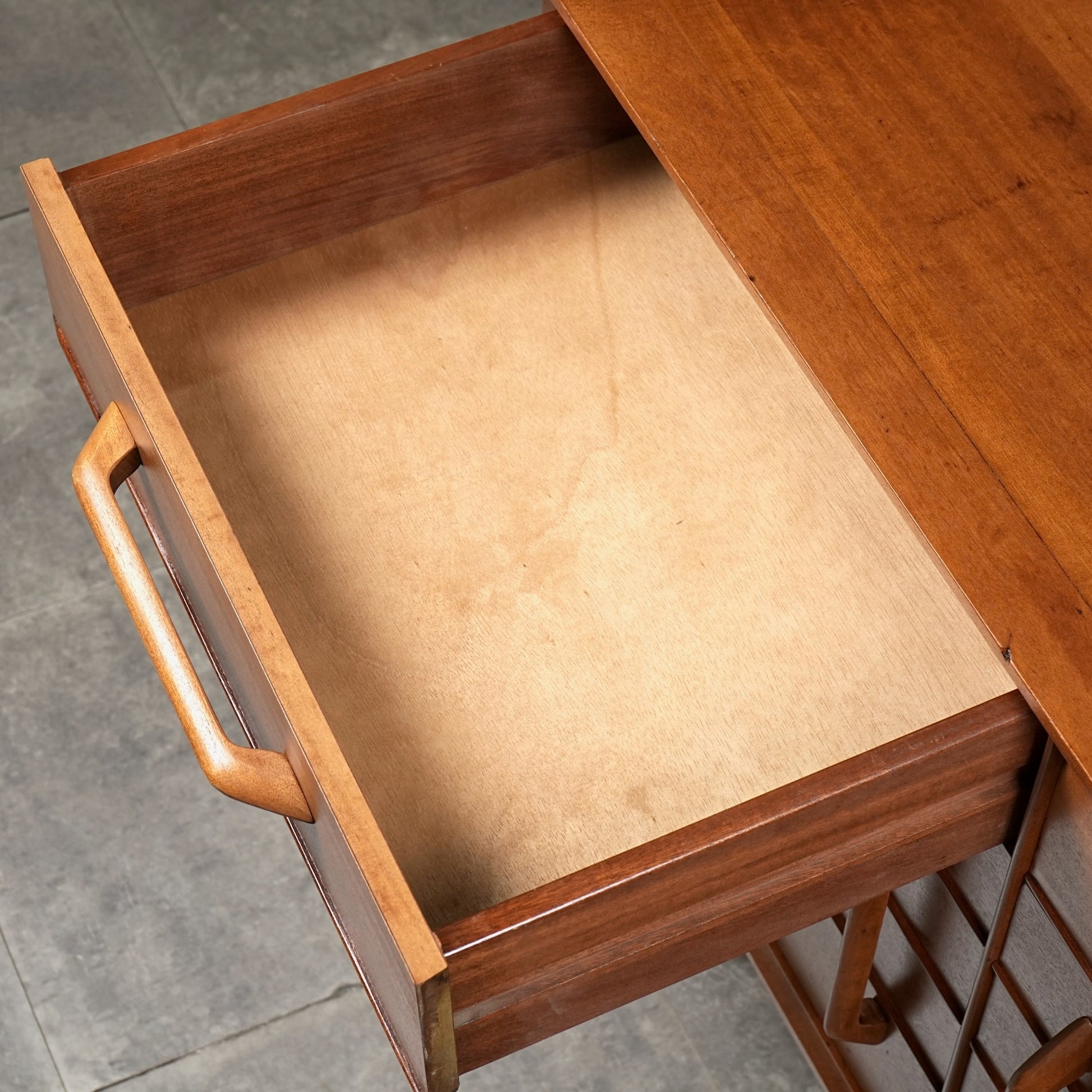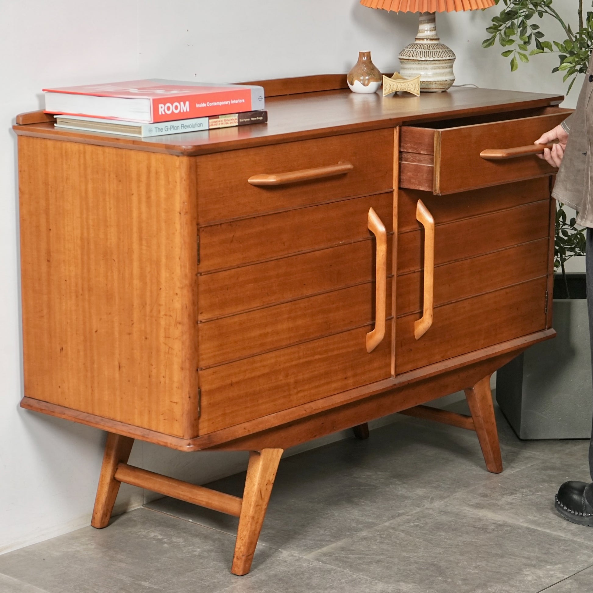 チーク材の家具とは異なるナチュラルな質感が印象的で、取手や脚部のシャープなフォルムも良いアクセントとなっており、現代の住環境にも取り入れやすいデザインではないでしょうか。