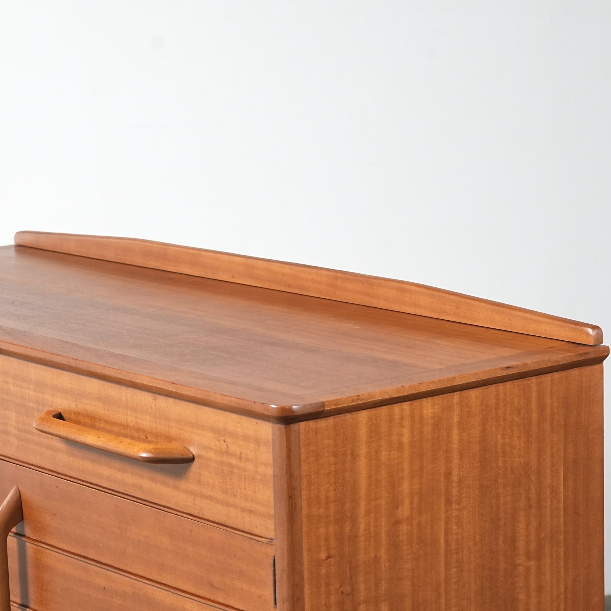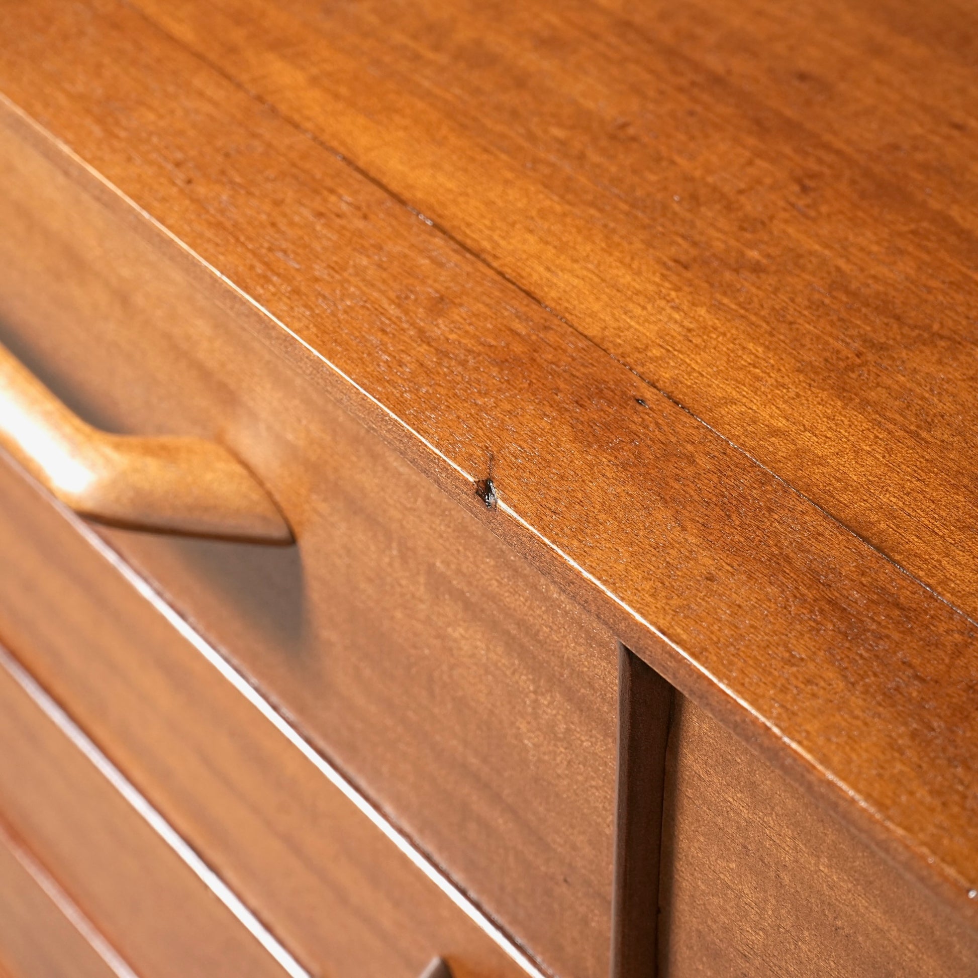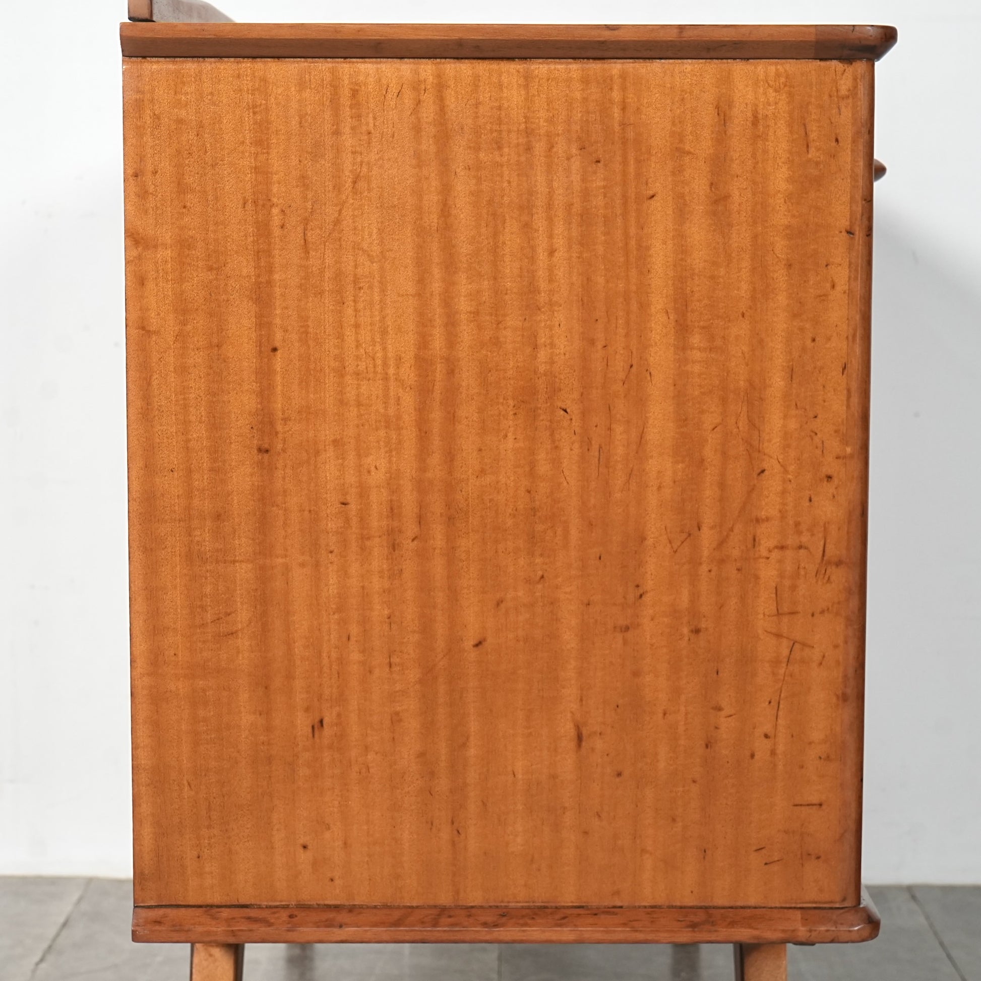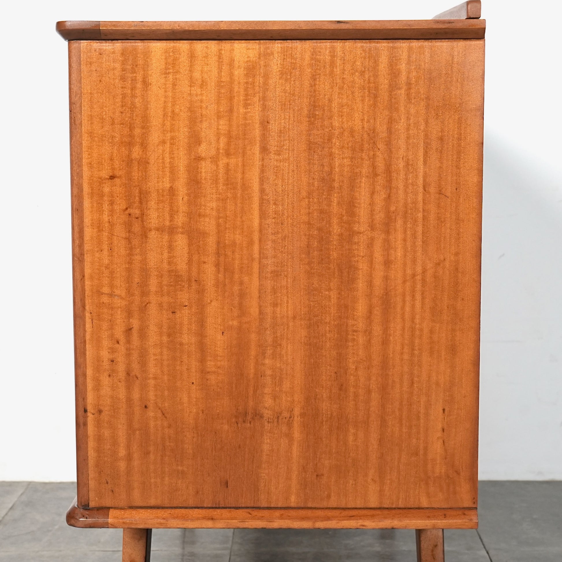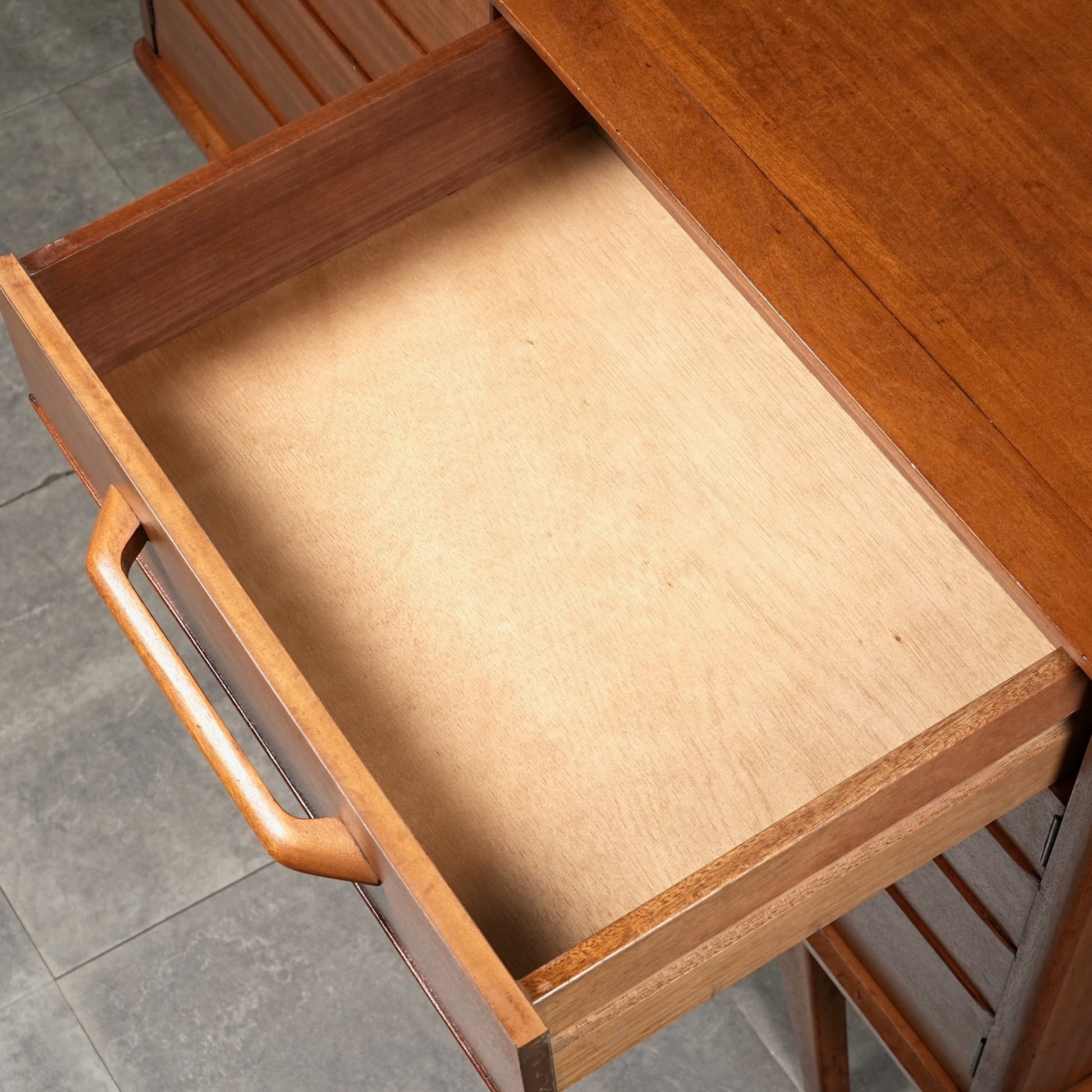チーク材の家具とは異なるナチュラルな質感が印象的で、取手や脚部のシャープなフォルムも良いアクセントとなっており、現代の住環境にも取り入れやすいデザインではないでしょうか。