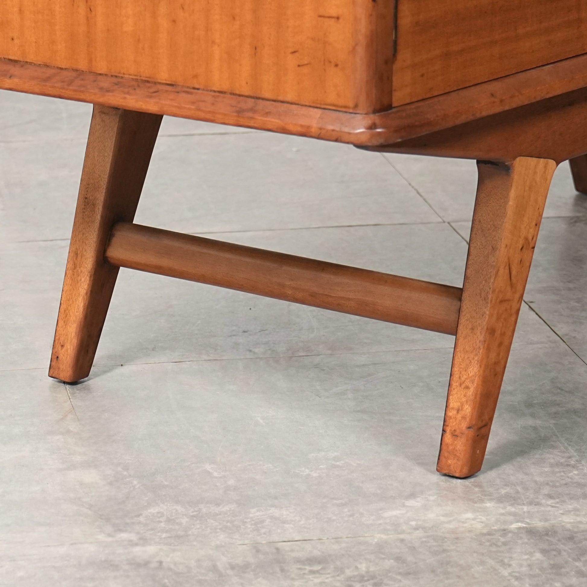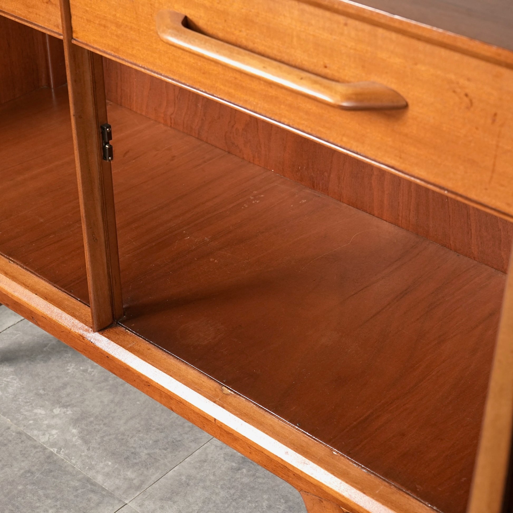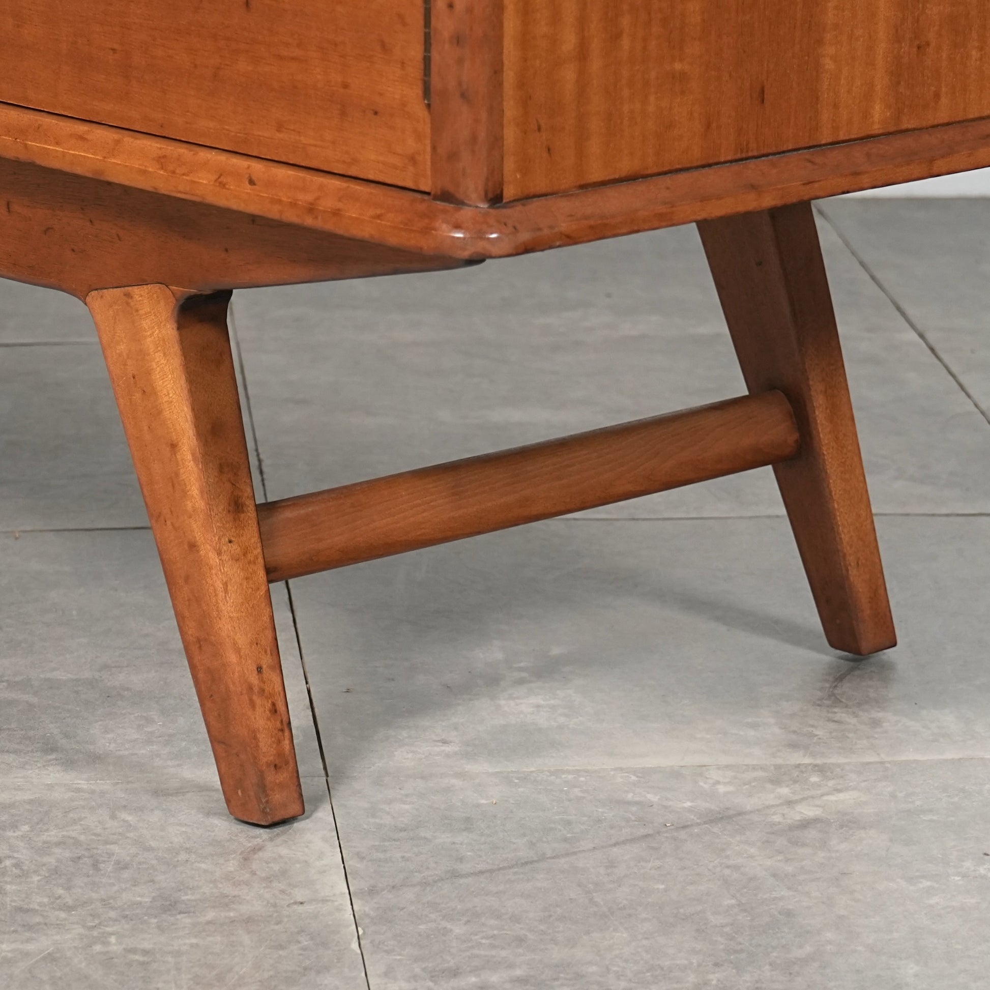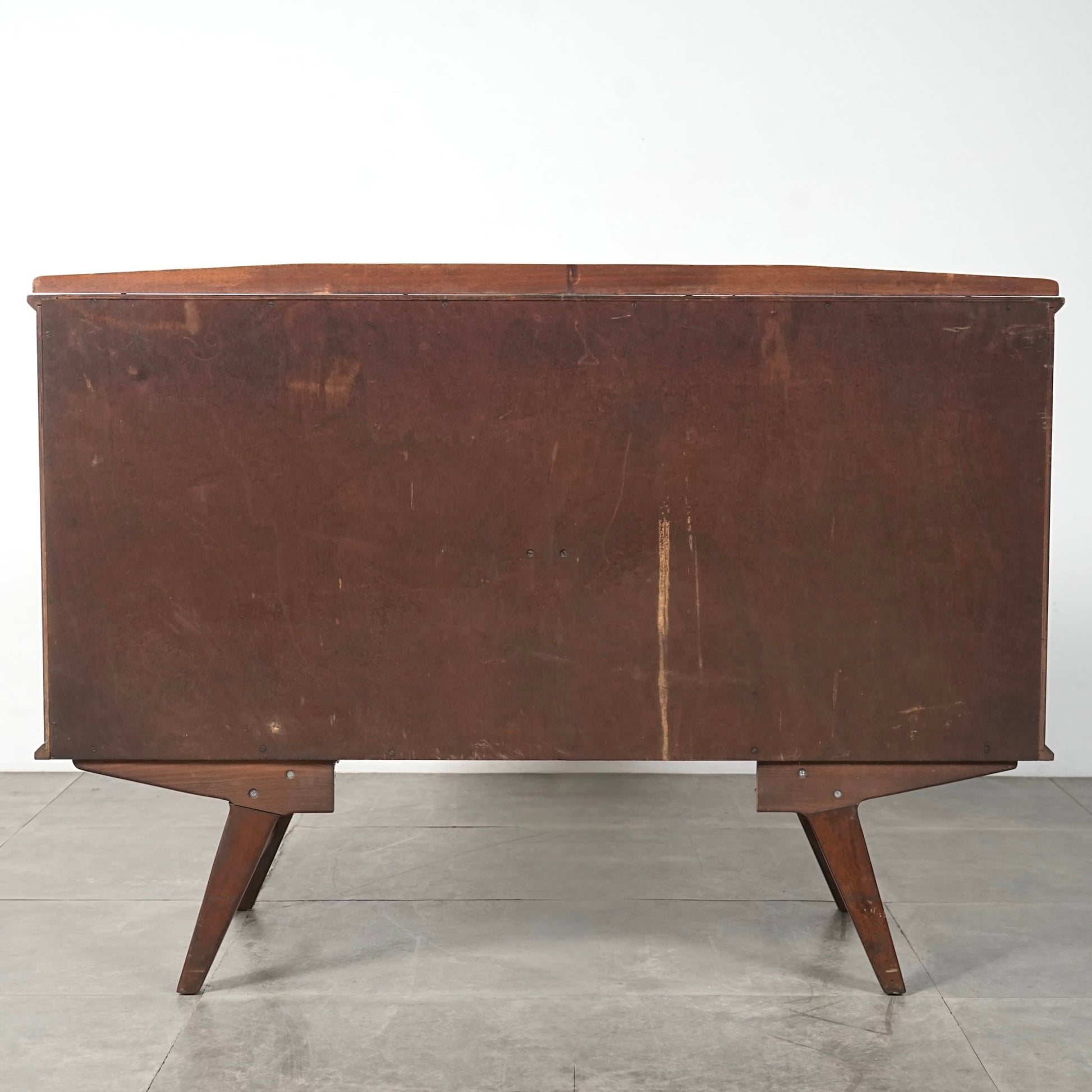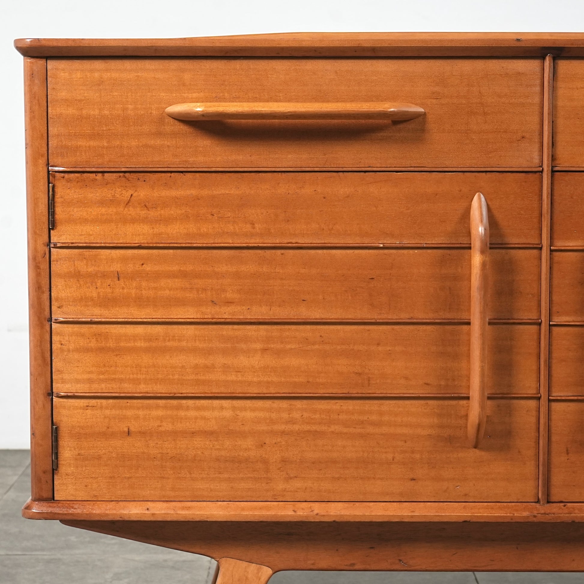 チーク材の家具とは異なるナチュラルな質感が印象的で、取手や脚部のシャープなフォルムも良いアクセントとなっており、現代の住環境にも取り入れやすいデザインではないでしょうか。