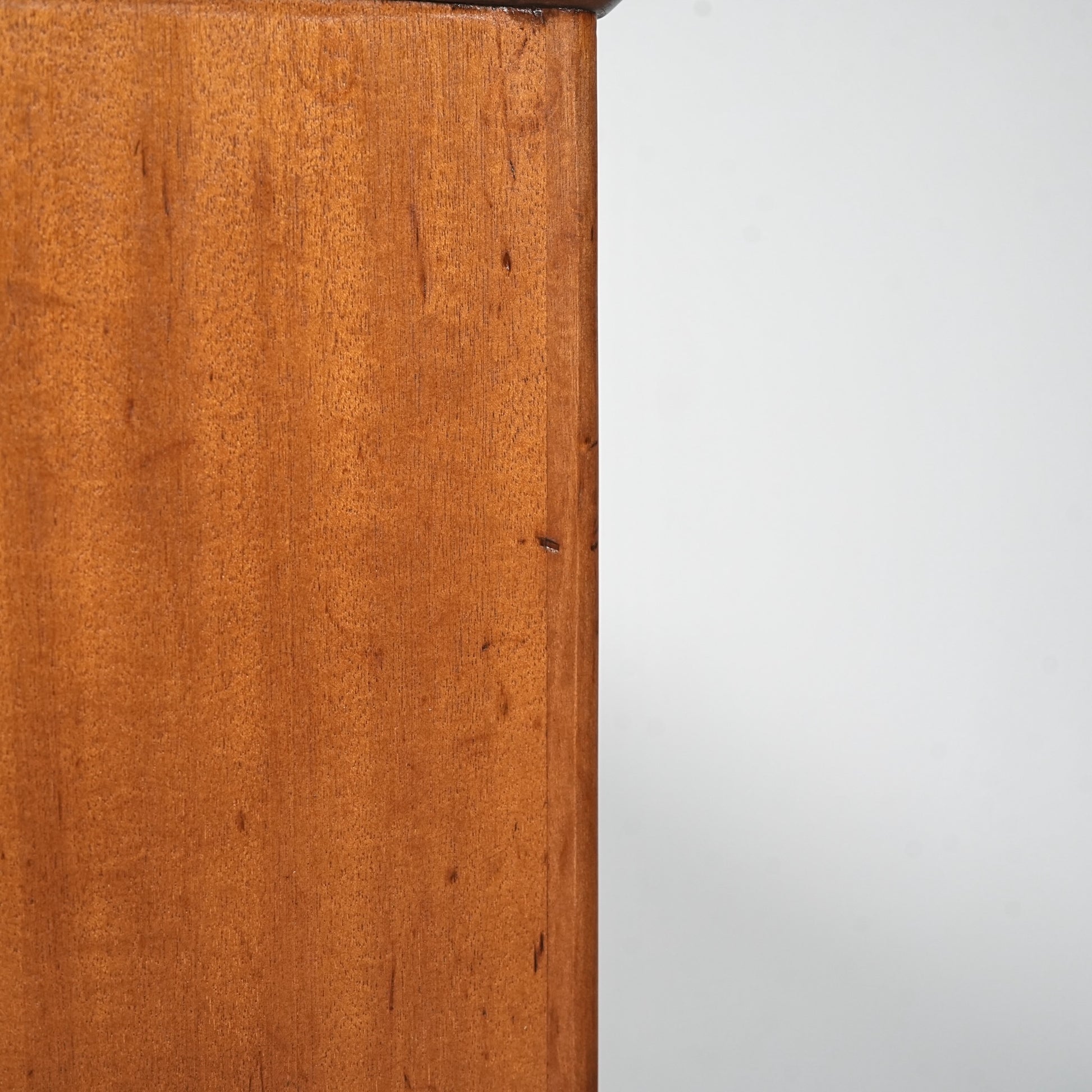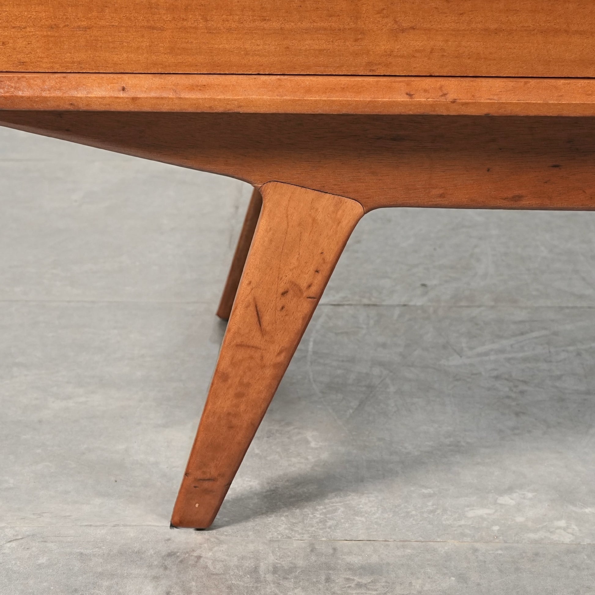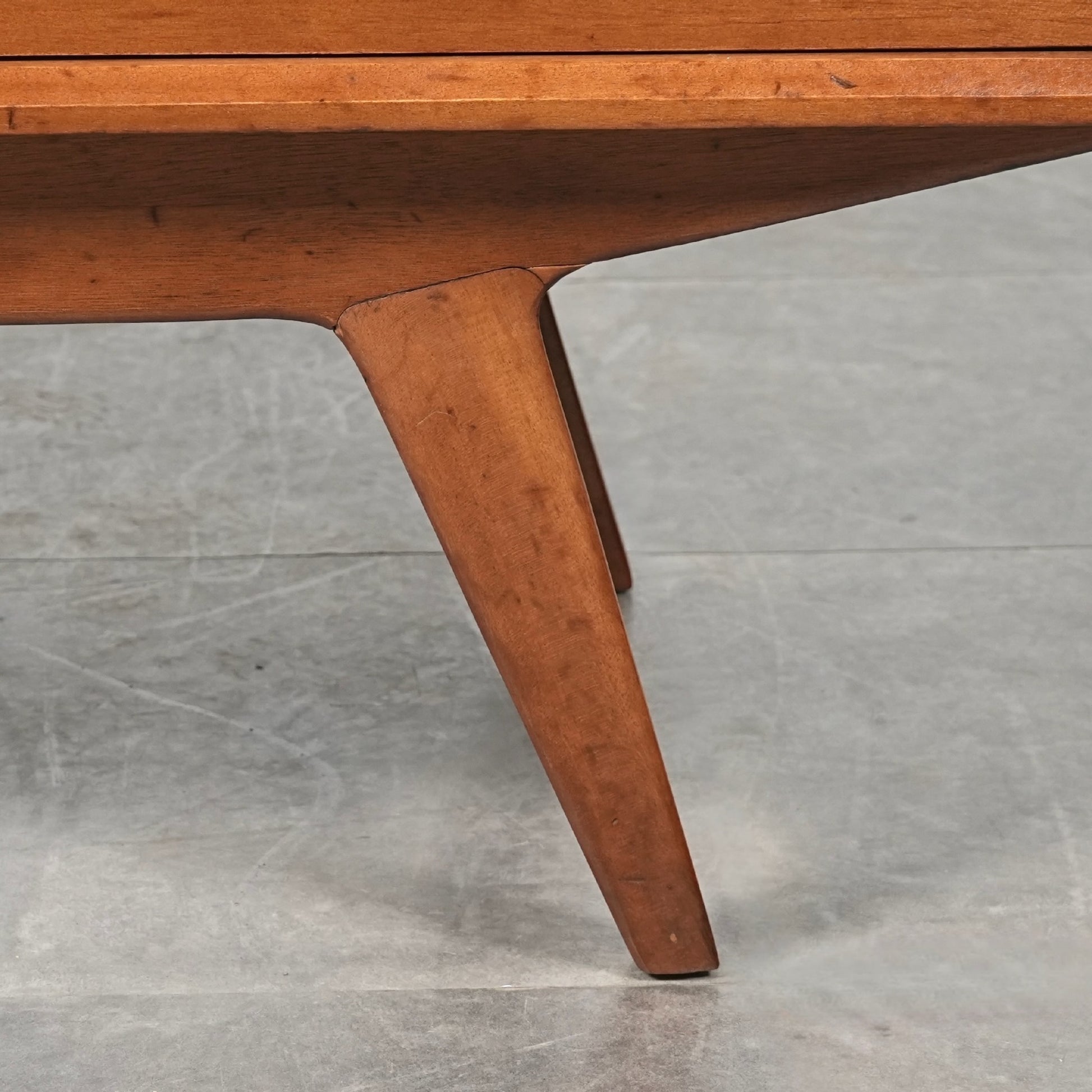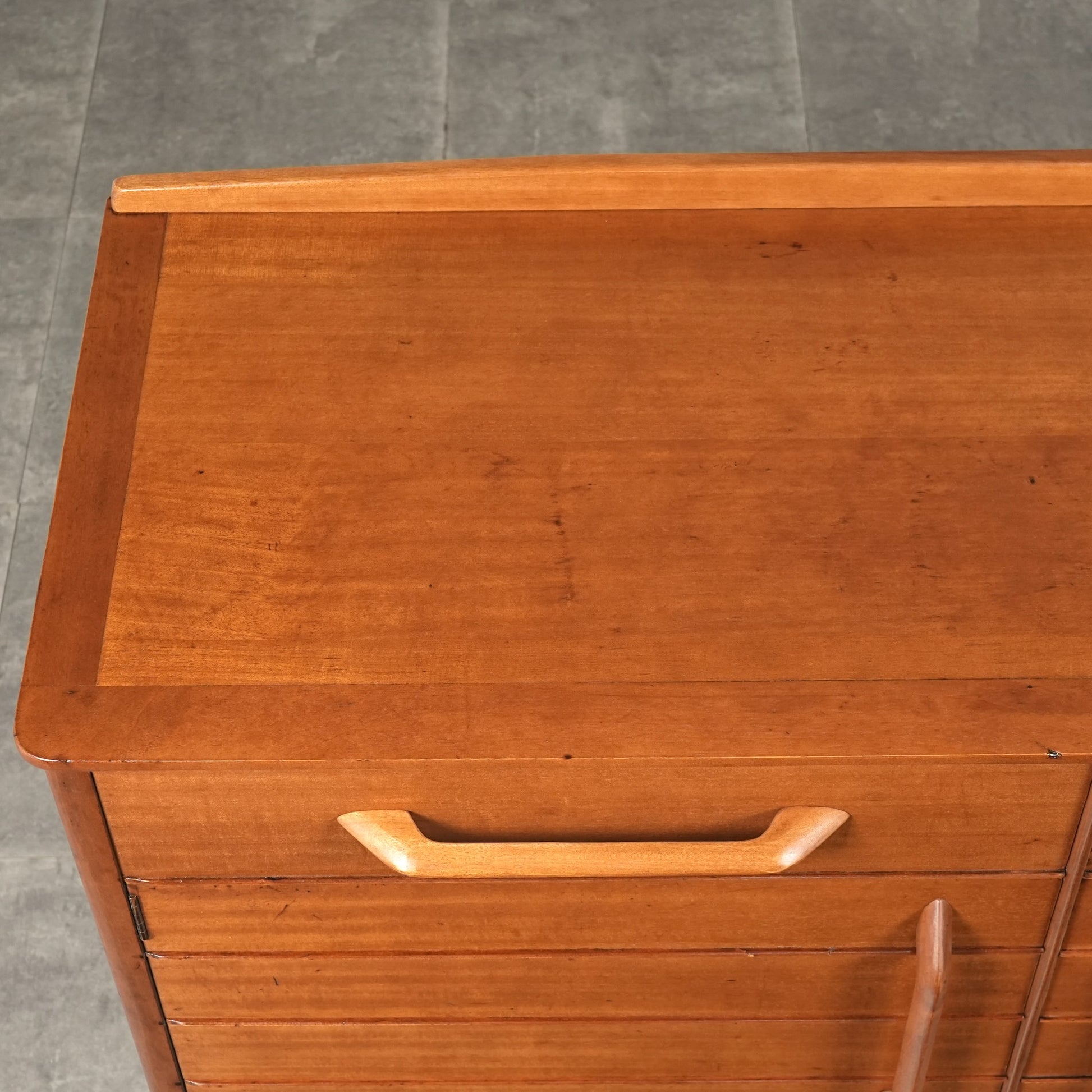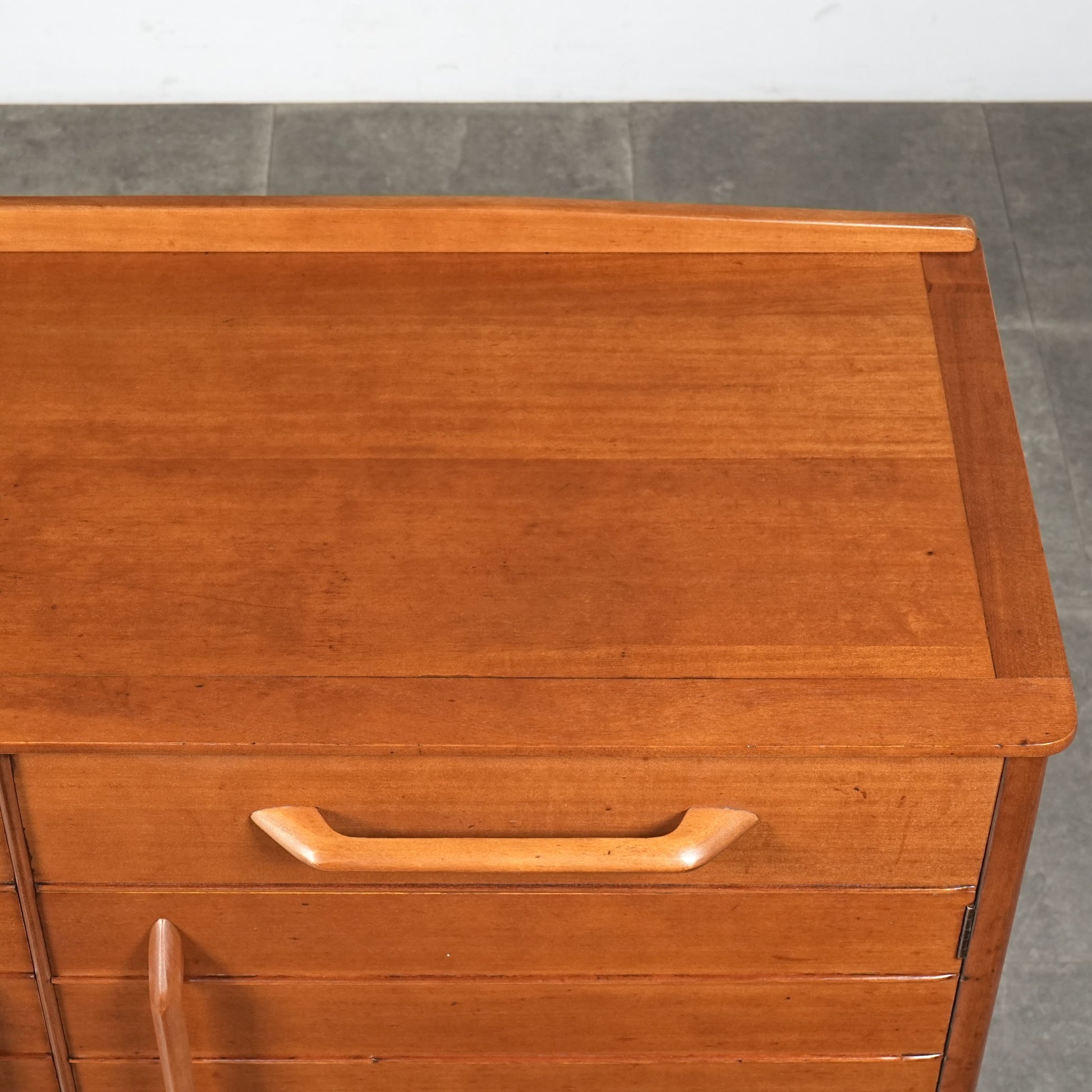 チーク材の家具とは異なるナチュラルな質感が印象的で、取手や脚部のシャープなフォルムも良いアクセントとなっており、現代の住環境にも取り入れやすいデザインではないでしょうか。
