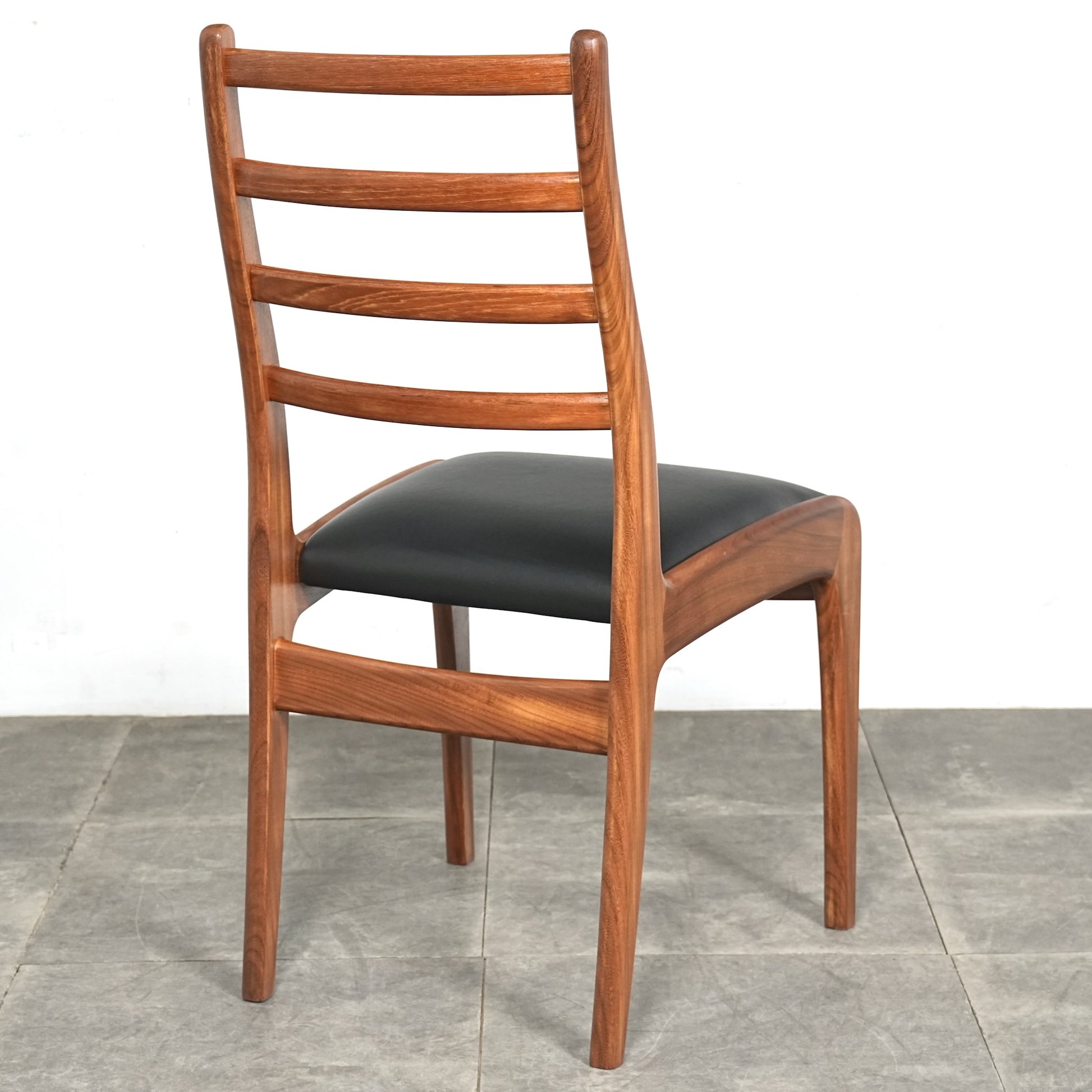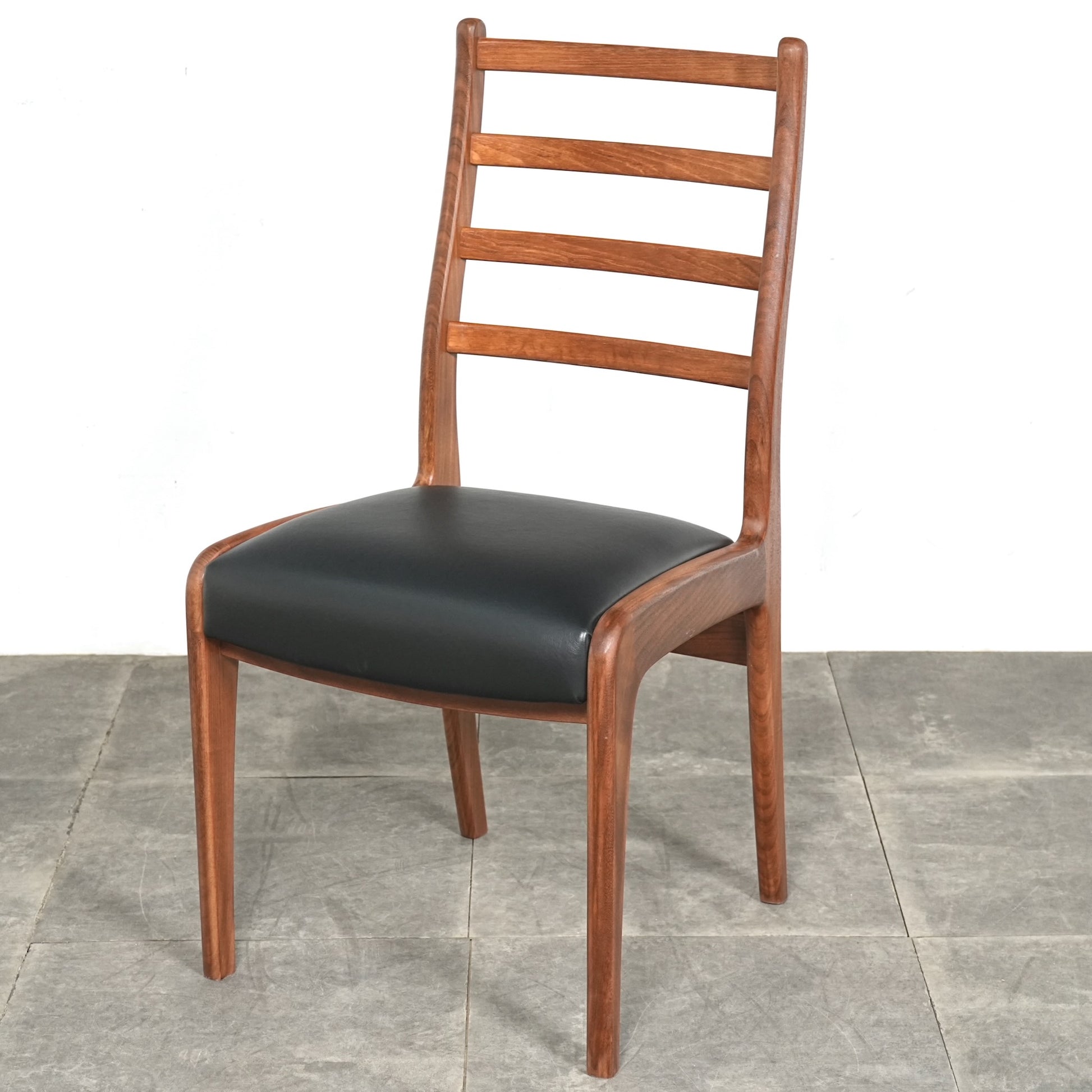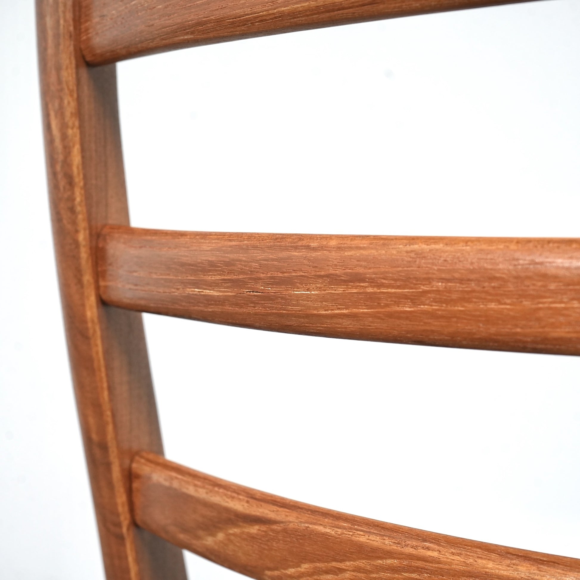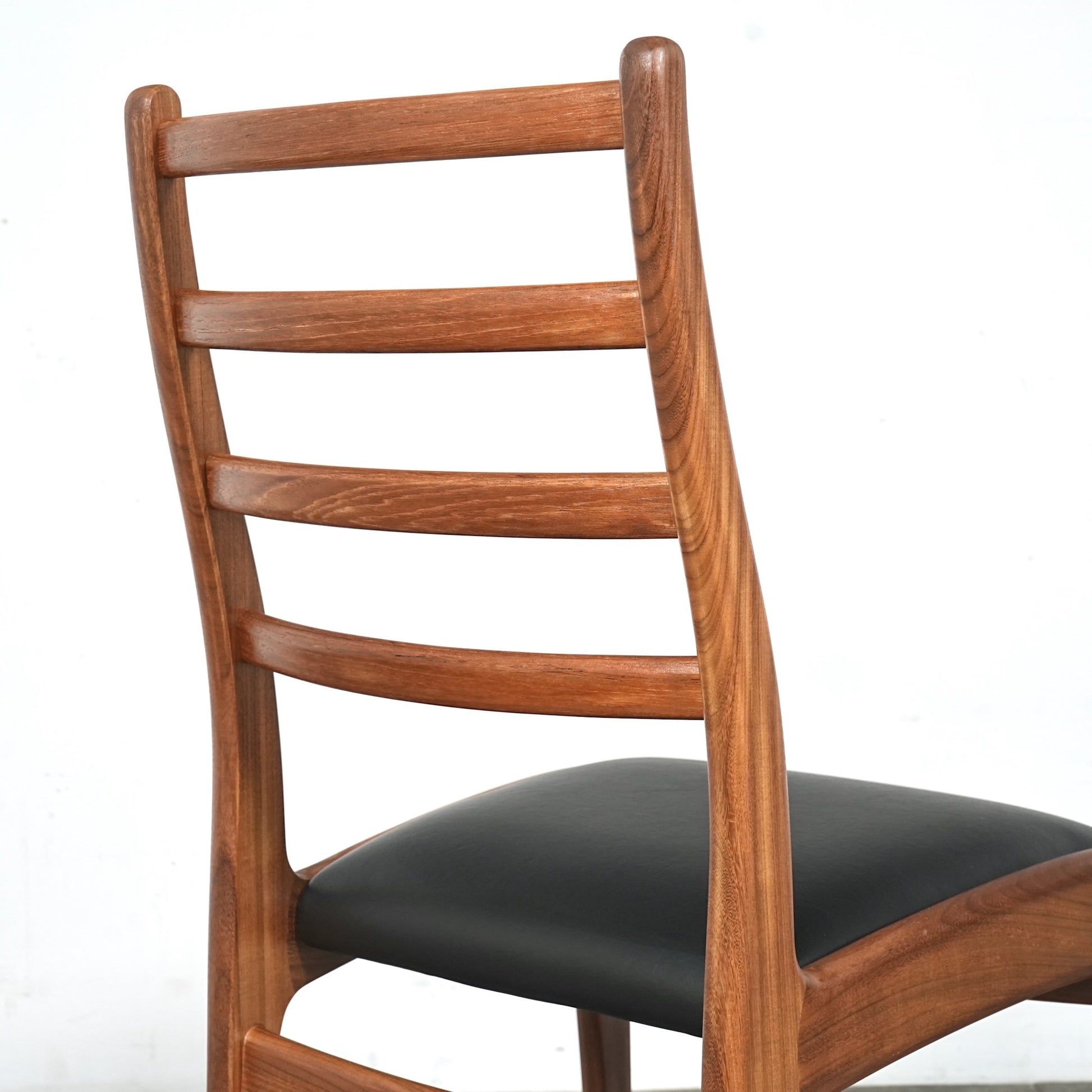 良質なチーク材のフレームはラダーバックとも呼ばれる背もたれが特徴的で、全体の美しい曲線からは当時の流行であった北欧デザインの影響をしっかりと感じ取ることができます。