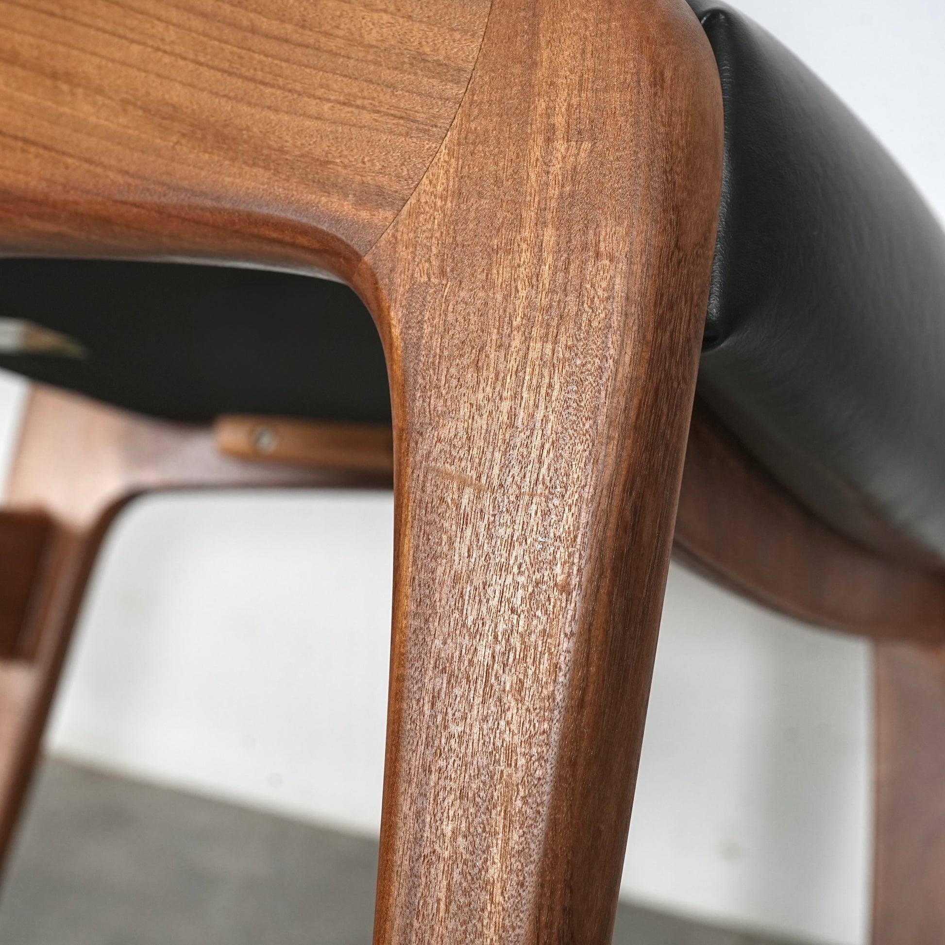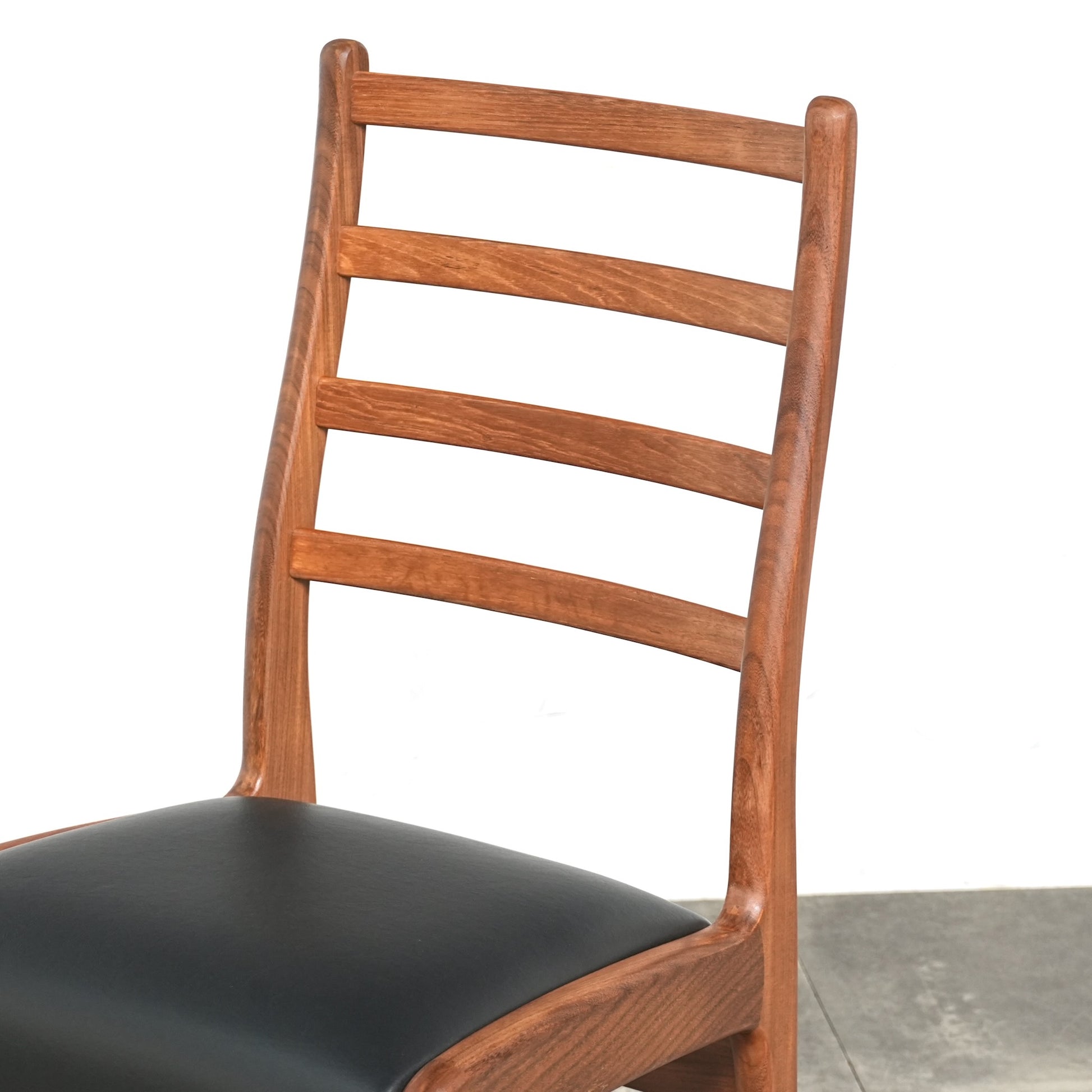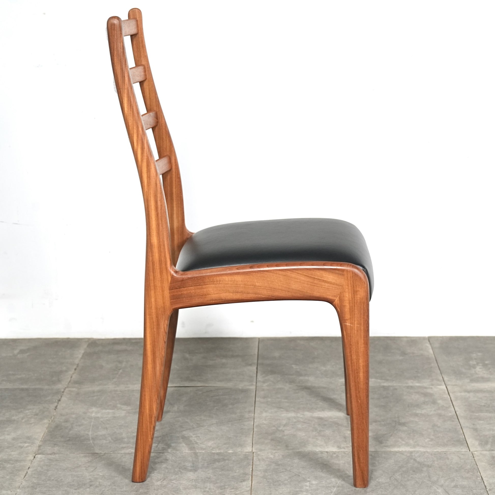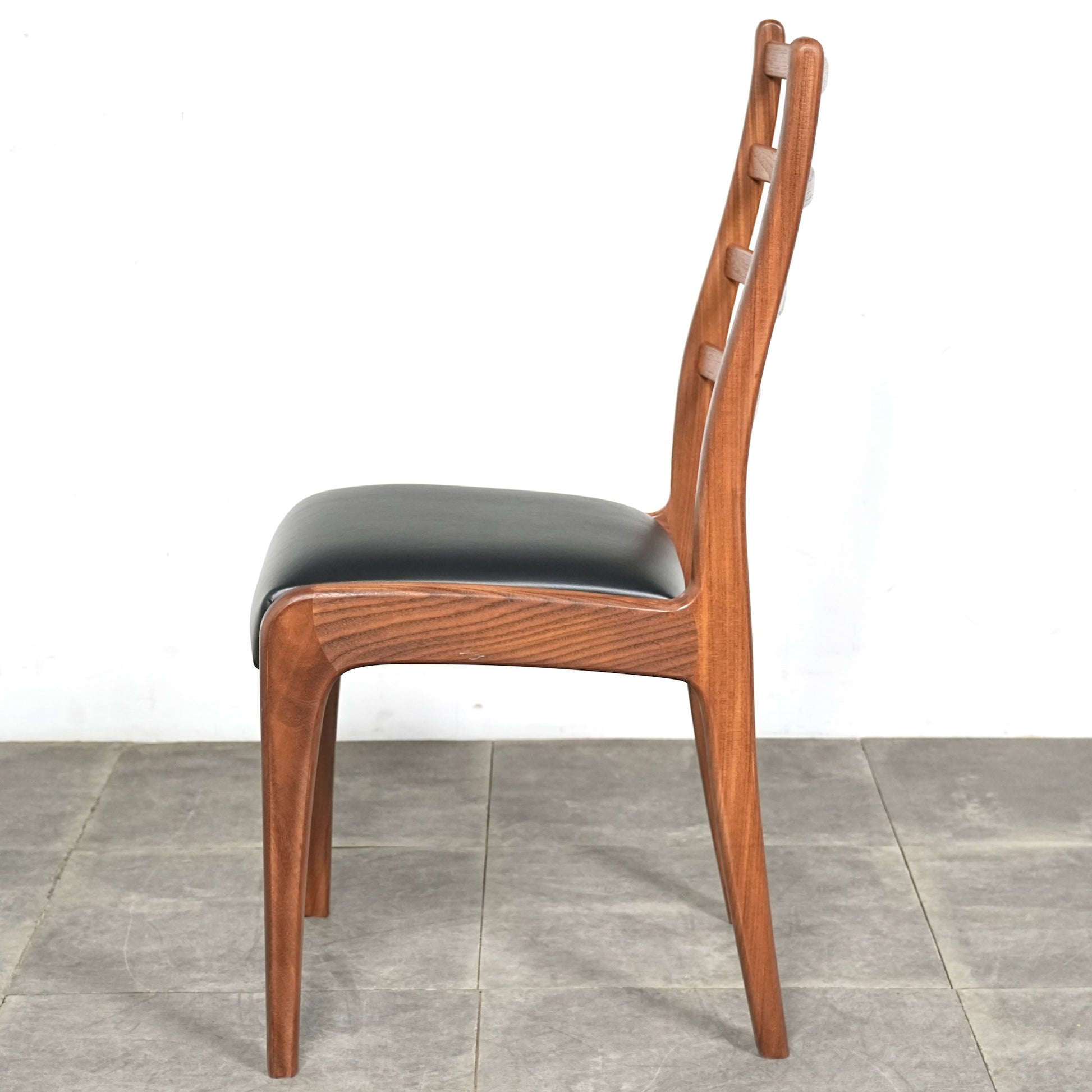 良質なチーク材のフレームはラダーバックとも呼ばれる背もたれが特徴的で、全体の美しい曲線からは当時の流行であった北欧デザインの影響をしっかりと感じ取ることができます。