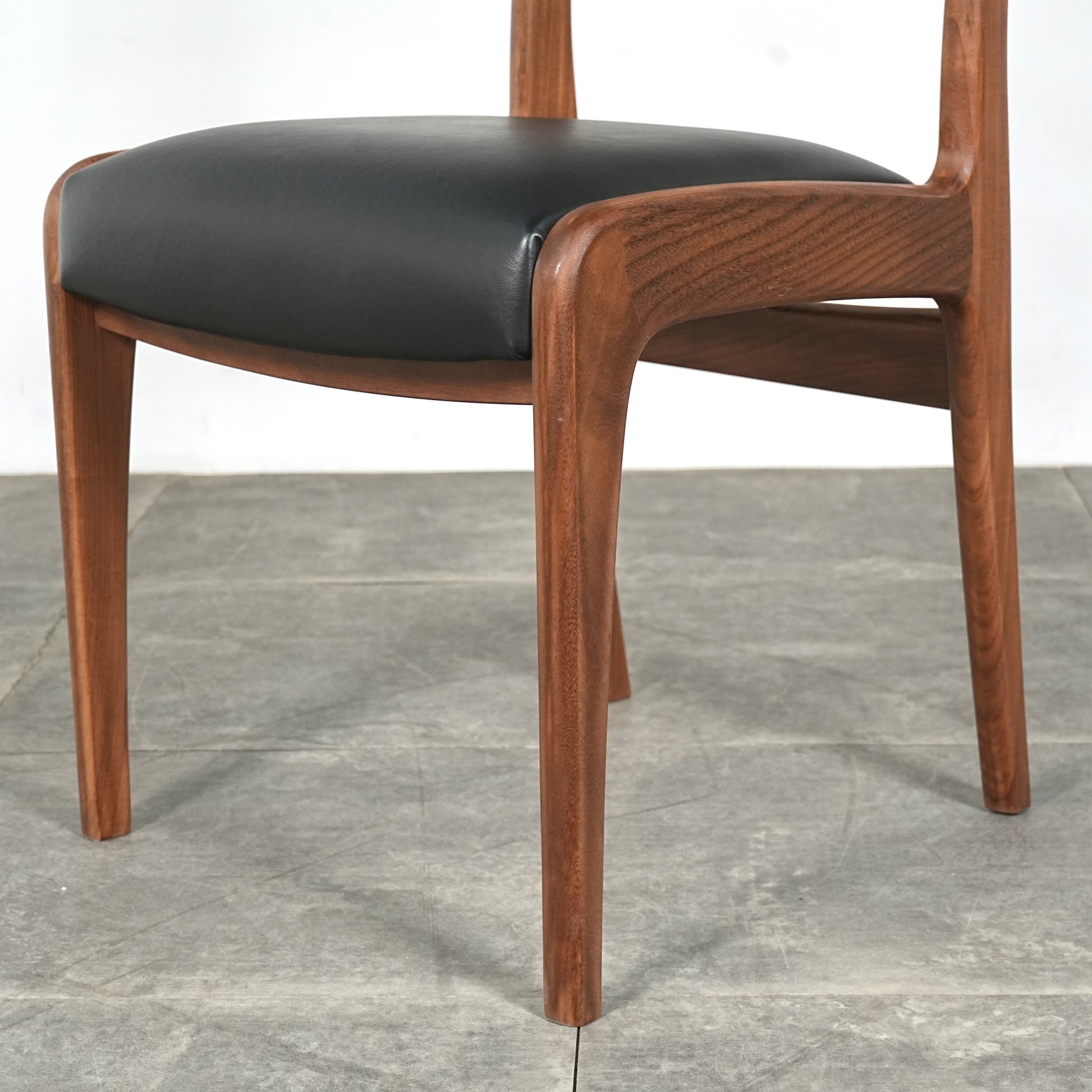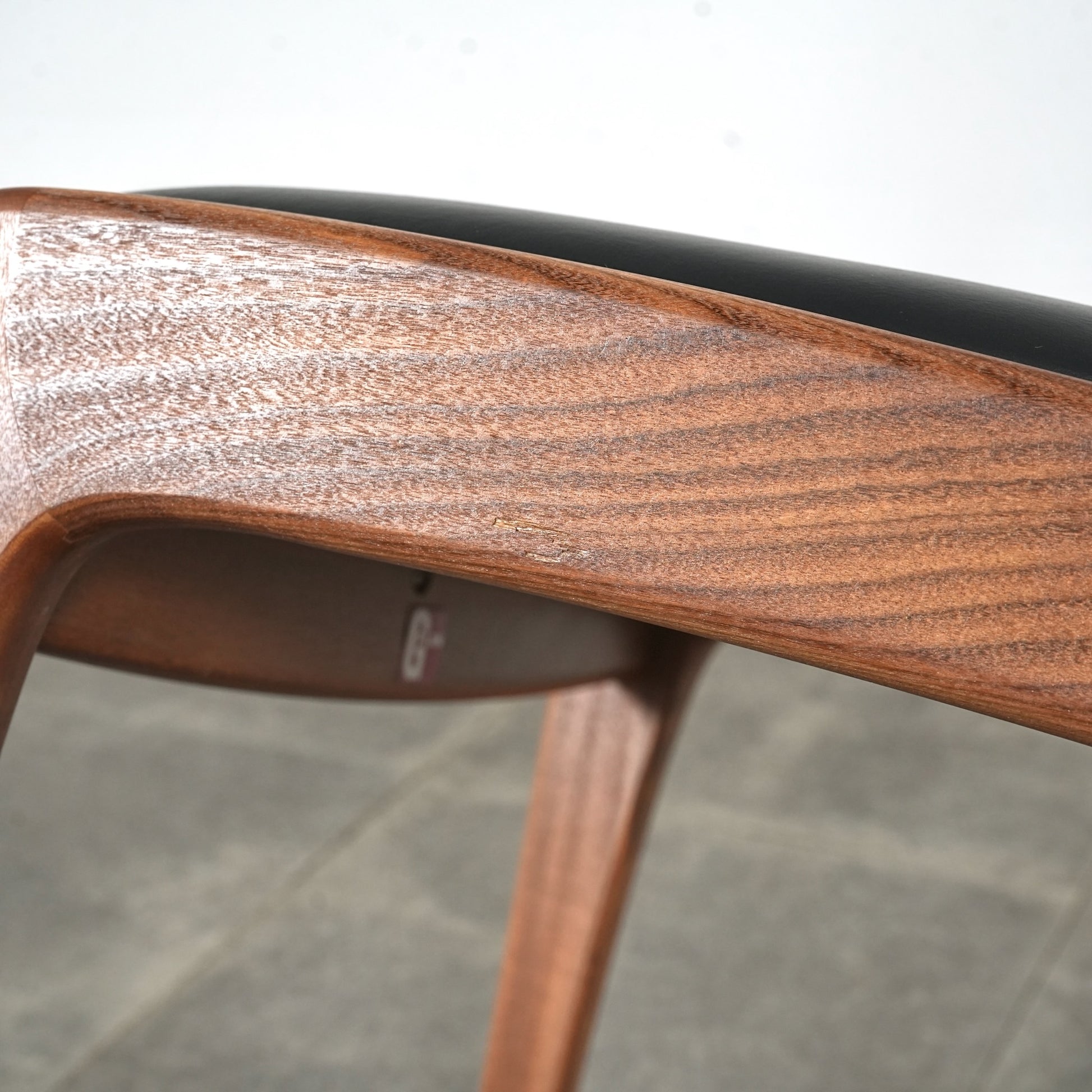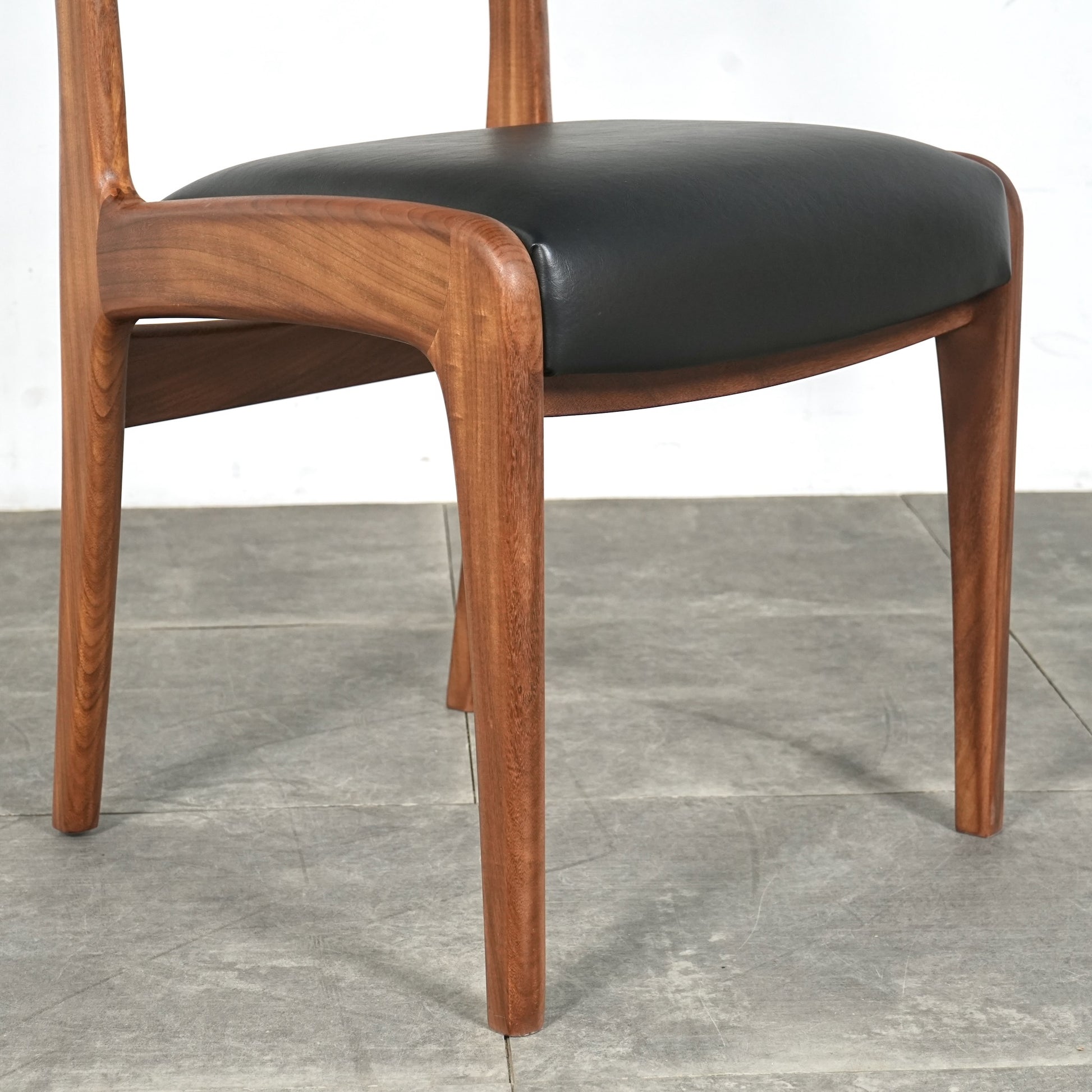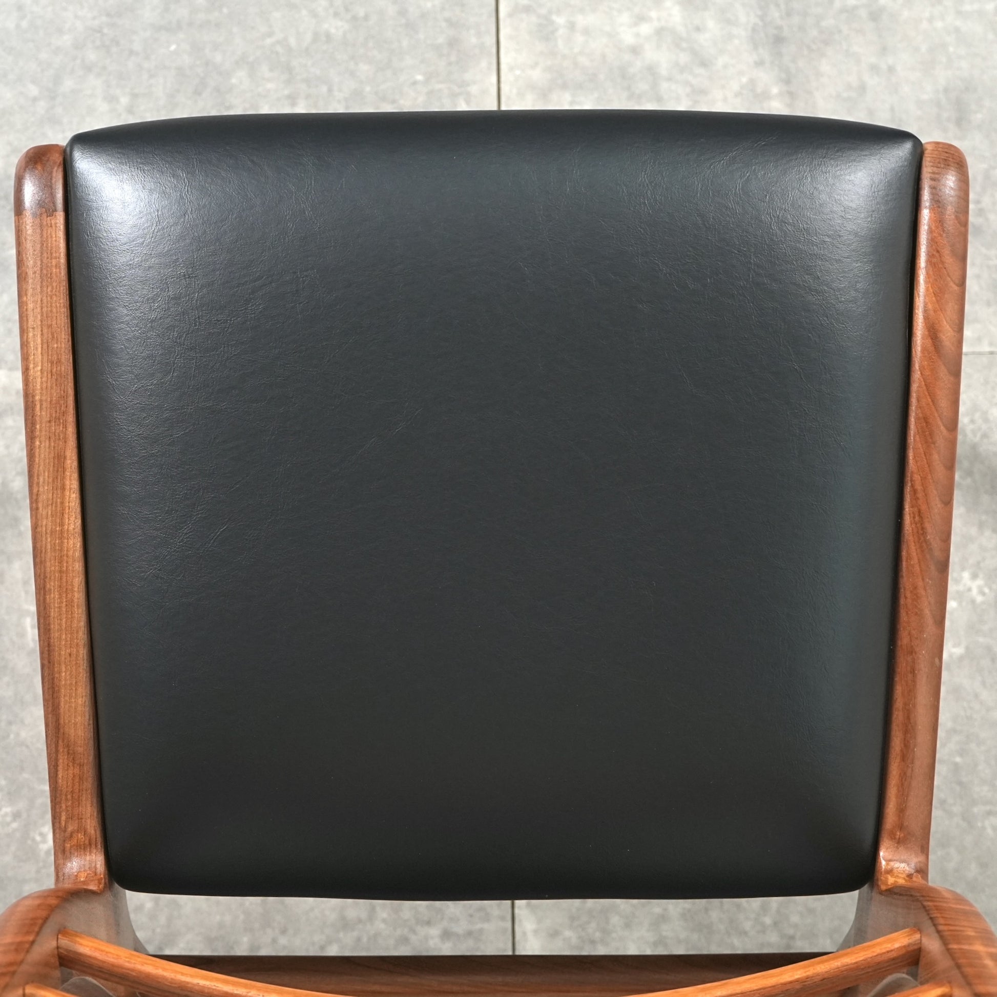良質なチーク材のフレームはラダーバックとも呼ばれる背もたれが特徴的で、全体の美しい曲線からは当時の流行であった北欧デザインの影響をしっかりと感じ取ることができます。