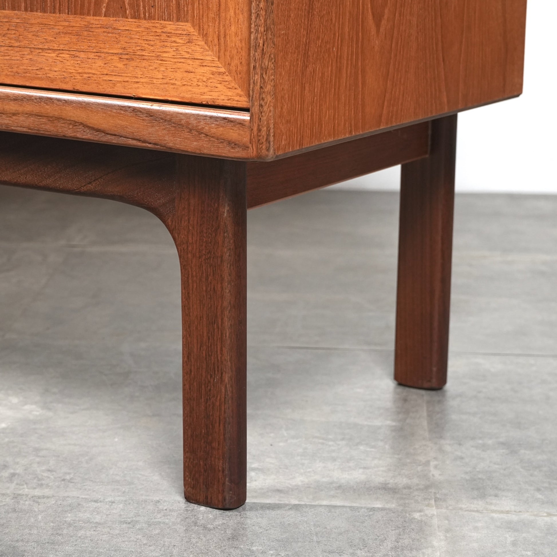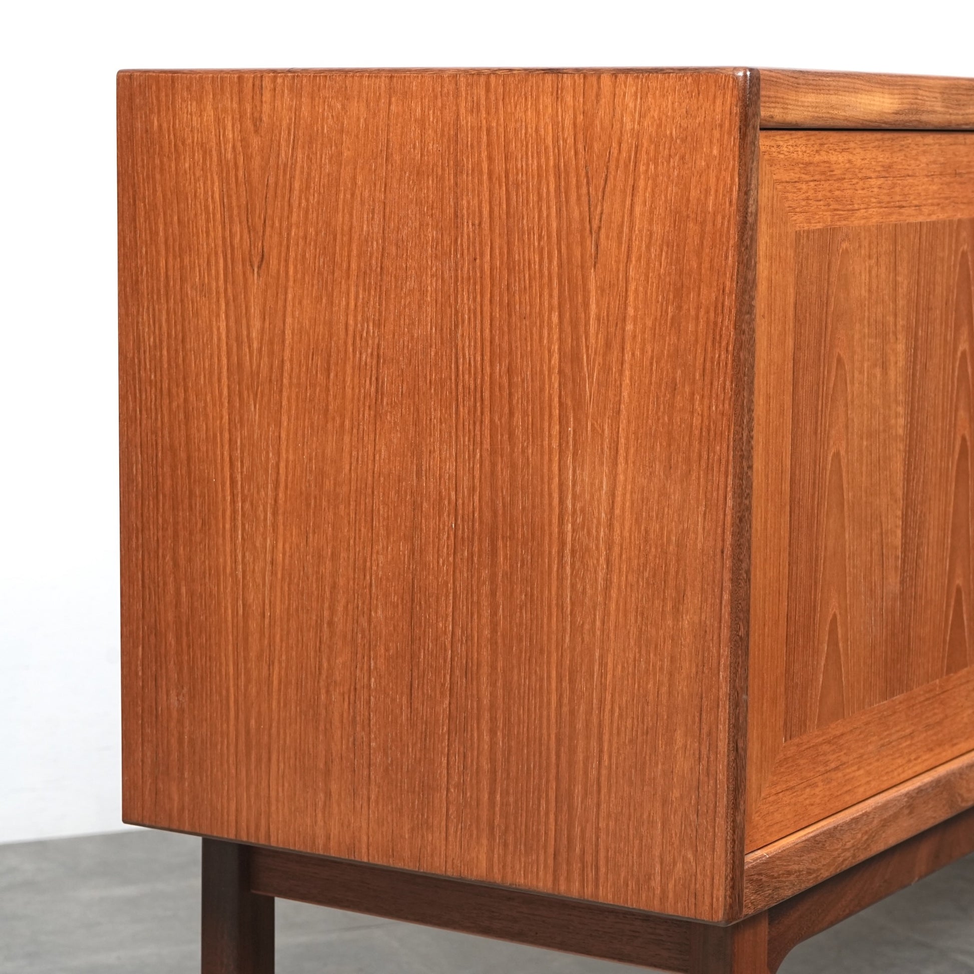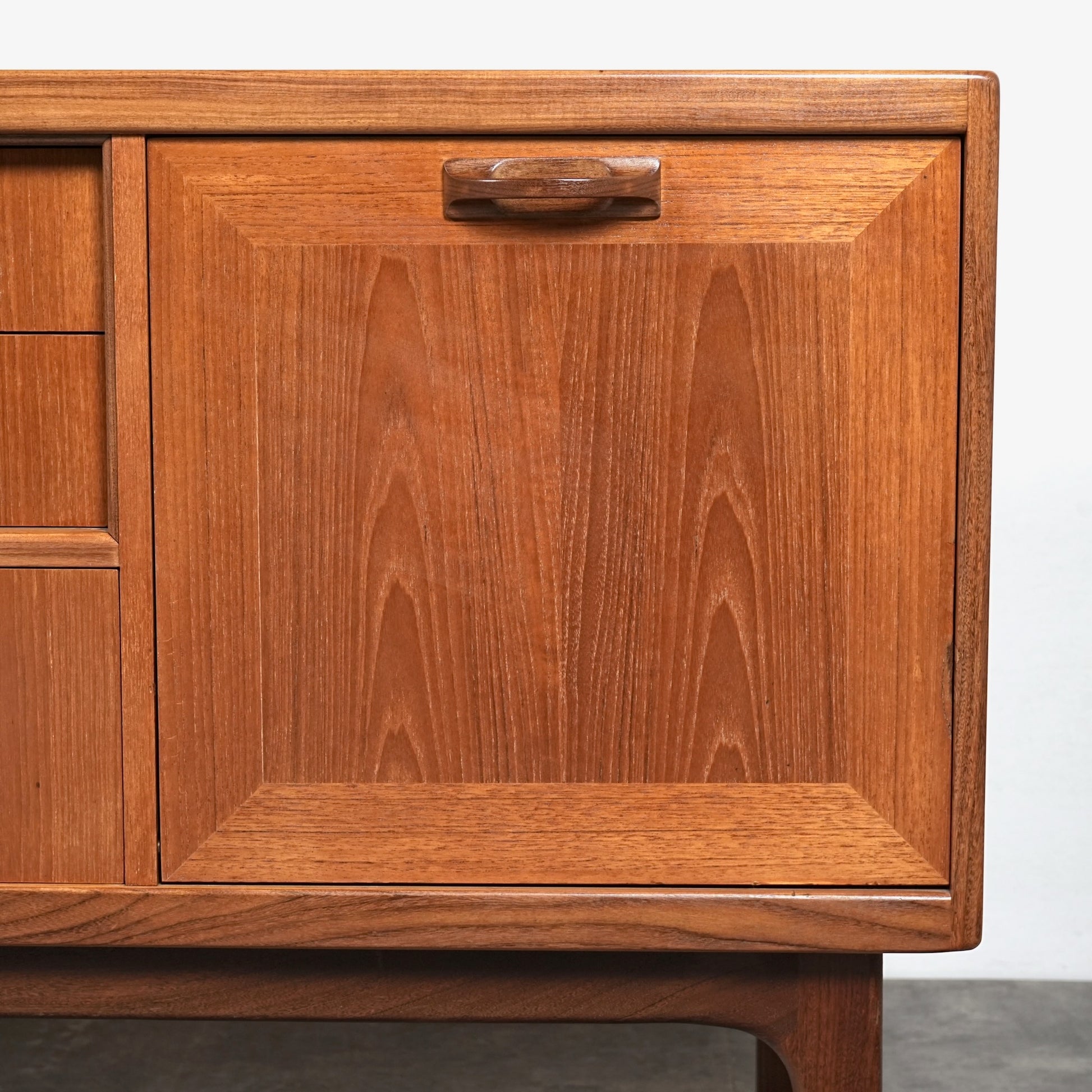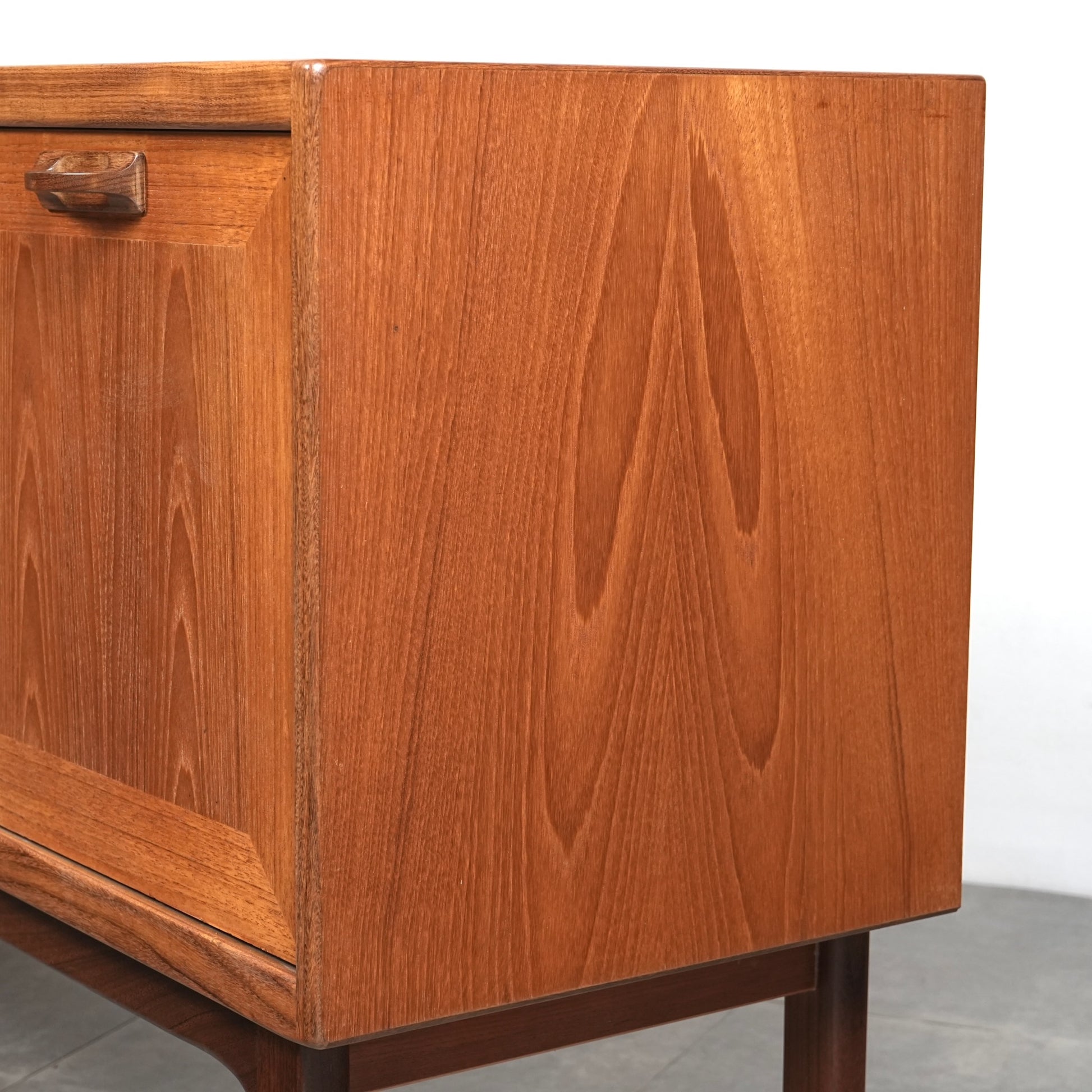 ヴィンテージファンには説明不要とも言える名作アイテムの1つとして認知されており、高品質なチーク材の温かみある質感と美しい木目に加えて、直線的なデザインの中に可愛らしい取手や扉の意匠など、気の利いたアクセントがバランス良く配置された逸品です。