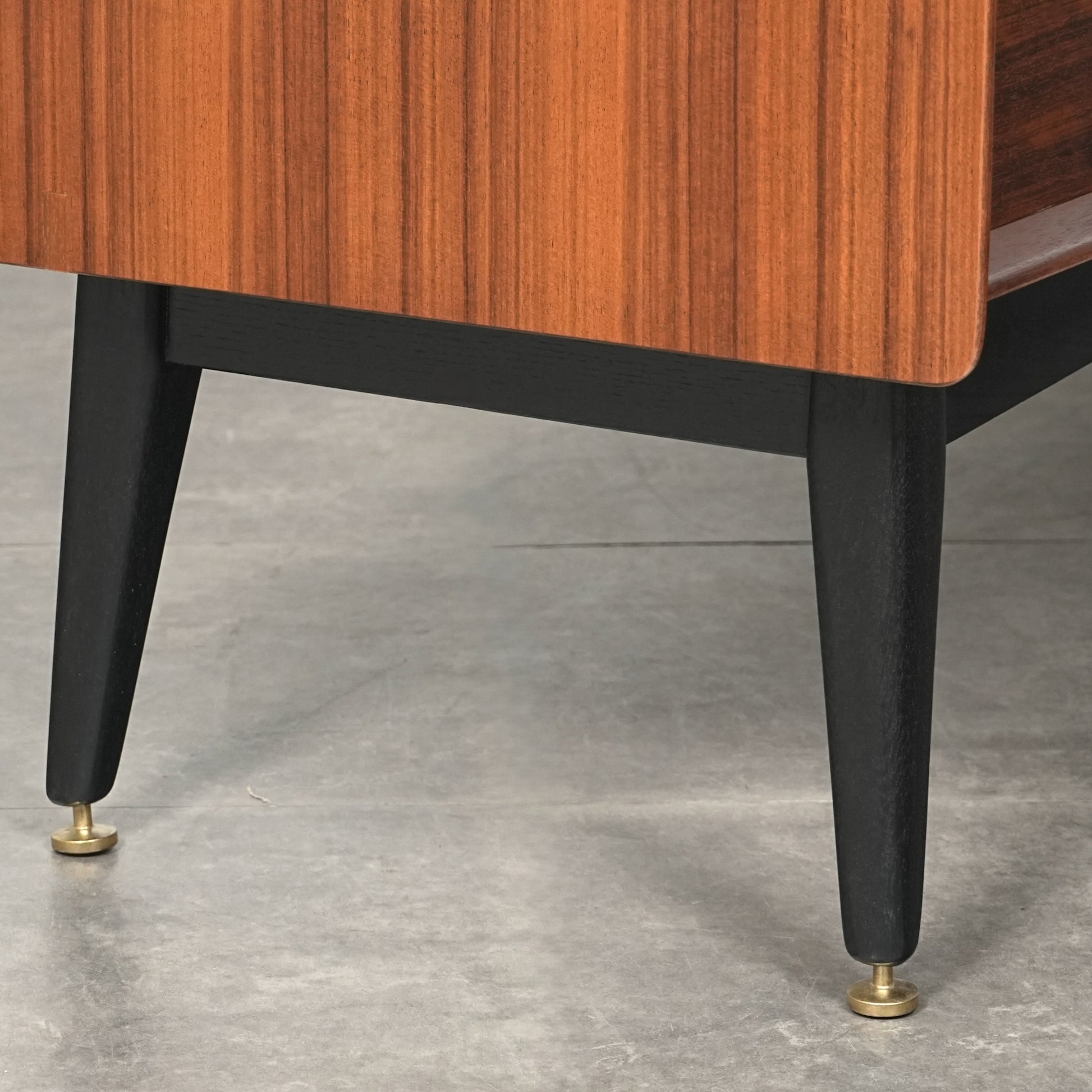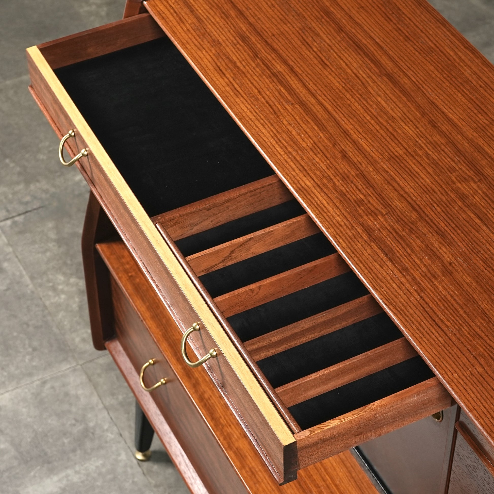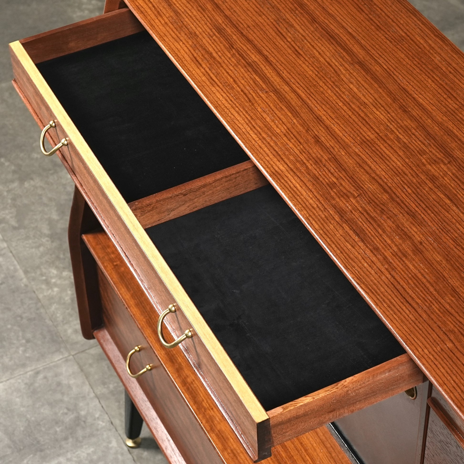 1950年代後半に発表されたTola&Blackシリーズはトラー材特有のユニークな木目と色味に加えて、黒色に塗装された脚部や金色の金具(真鍮メッキ)のバランスが秀逸なアイテムばかり。