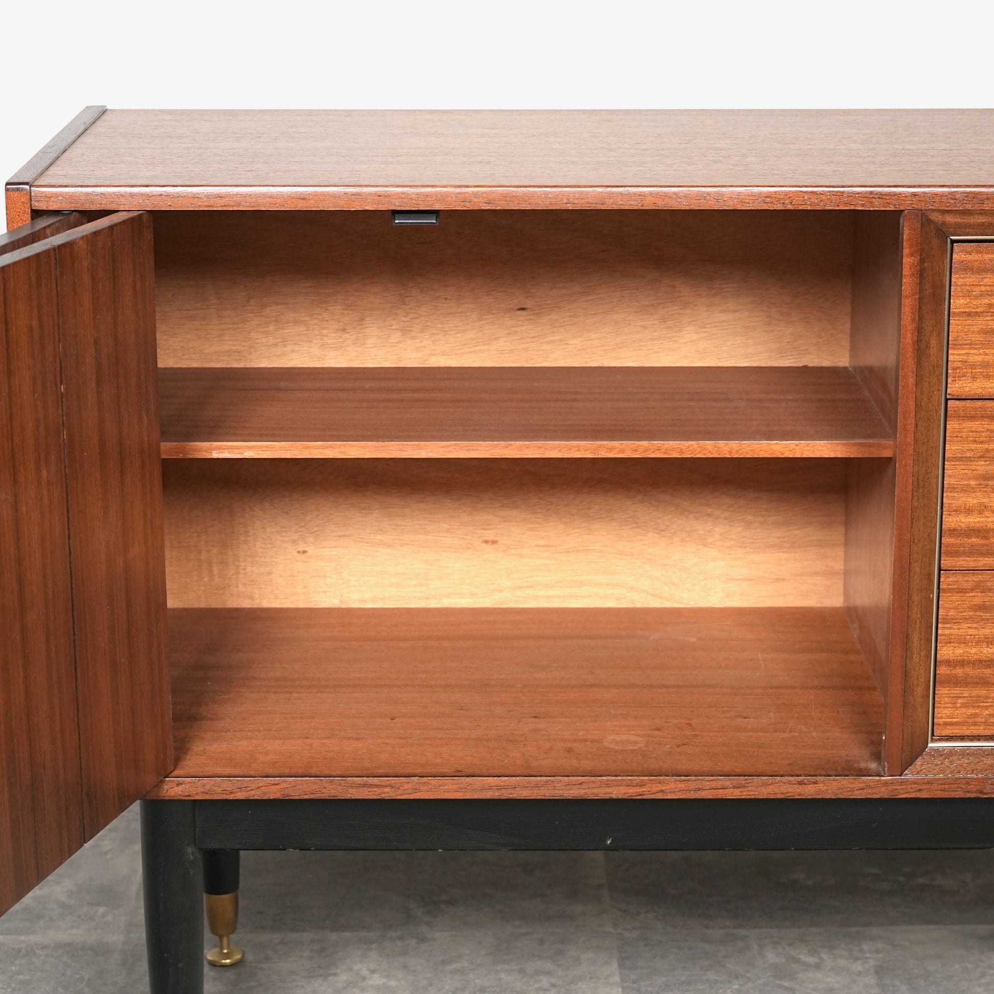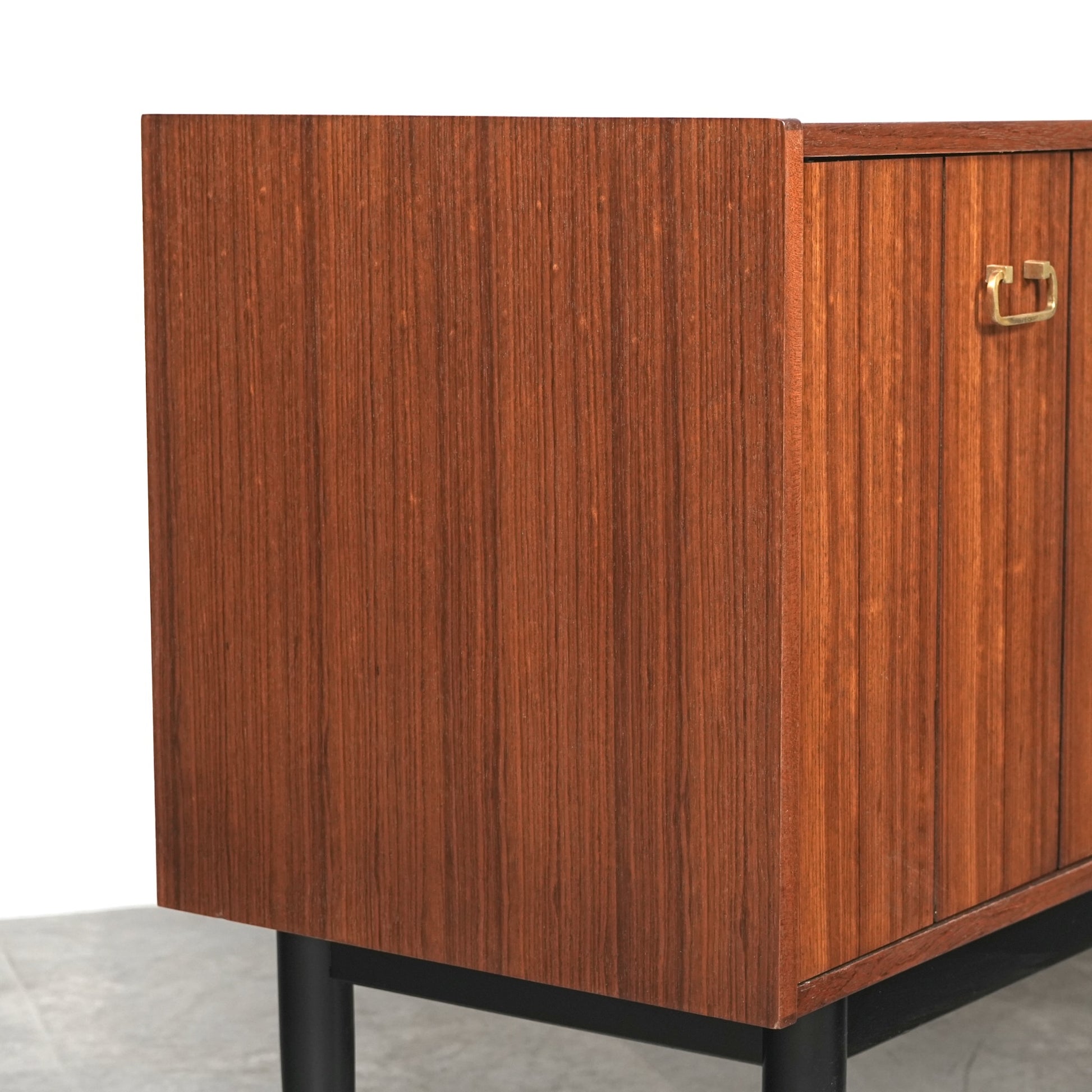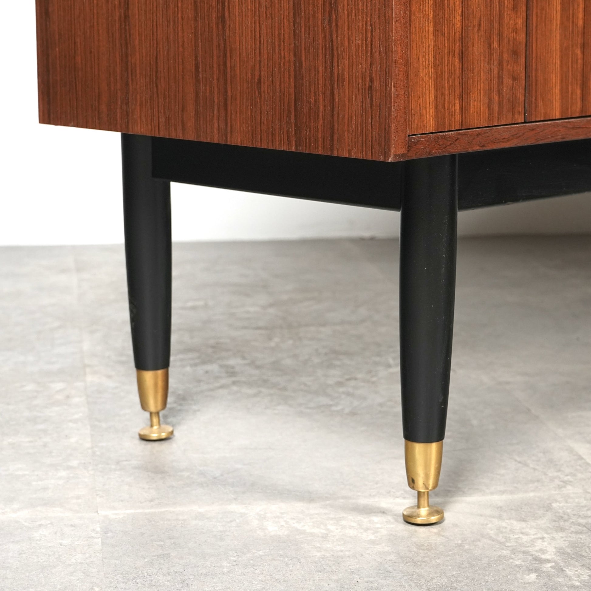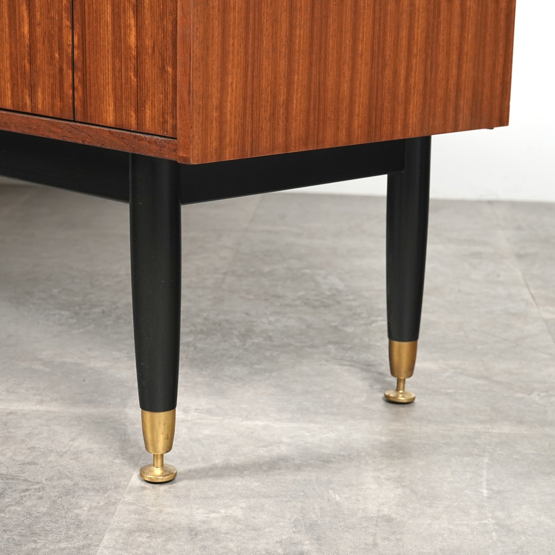 1950年代後半に発表されたTola&Blackシリーズはトラー材特有のユニークな木目と色味に加えて、黒色に塗装された脚部や金色の金具(真鍮メッキ)のバランスが秀逸なアイテムばかり。