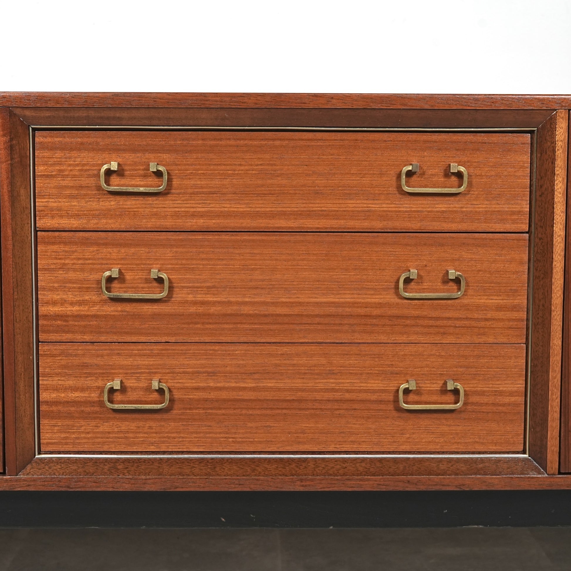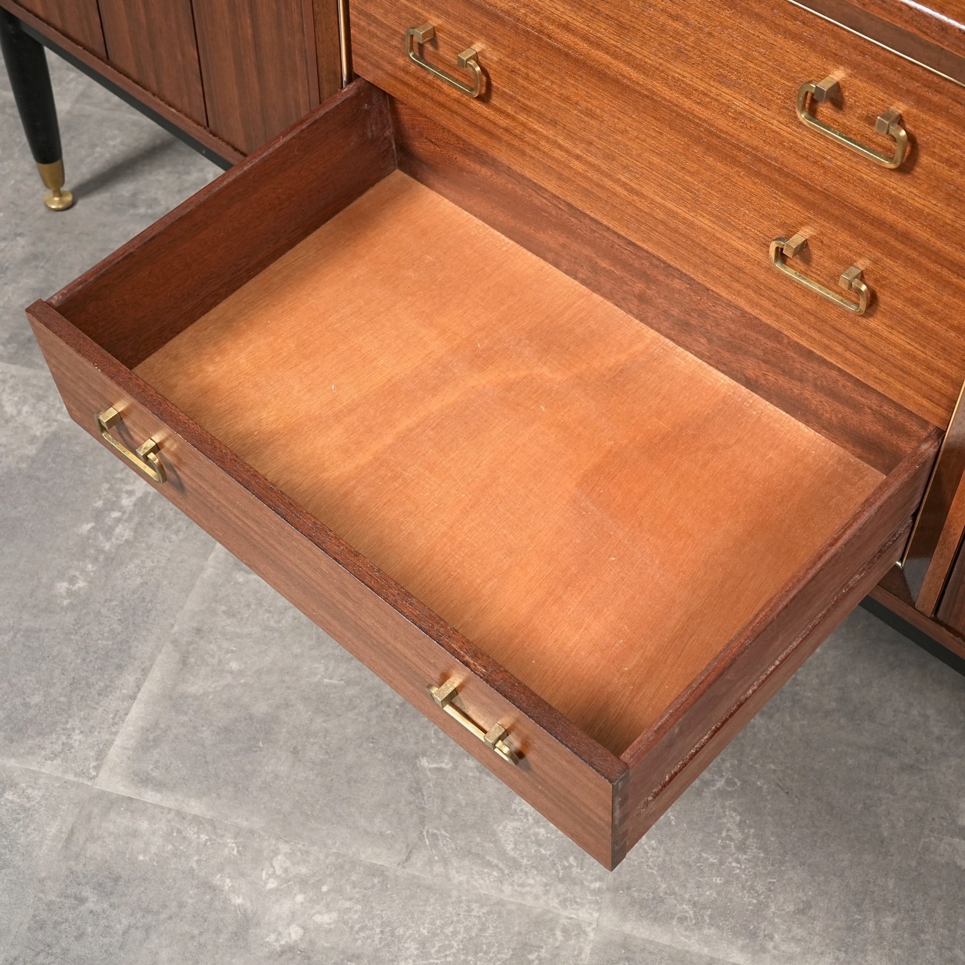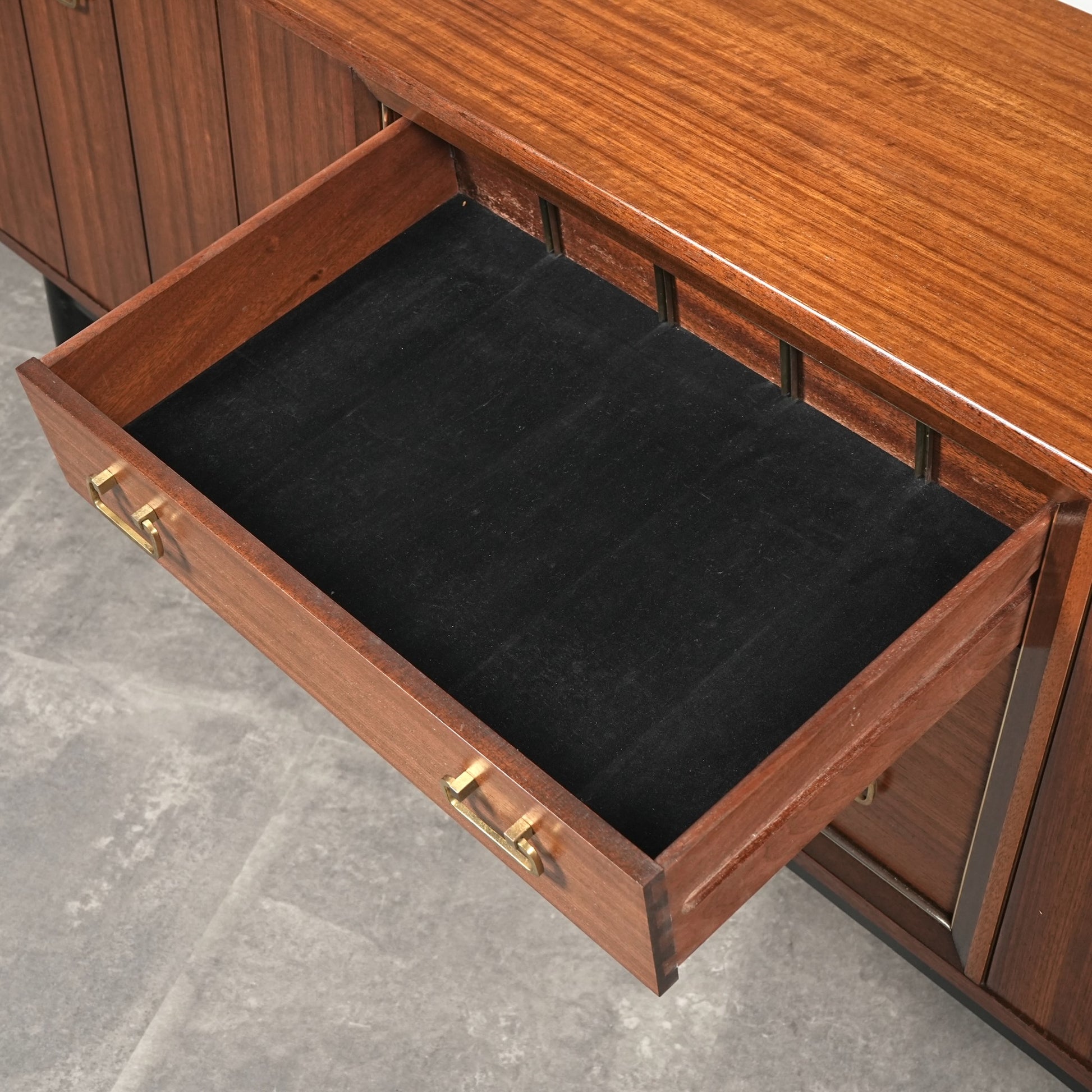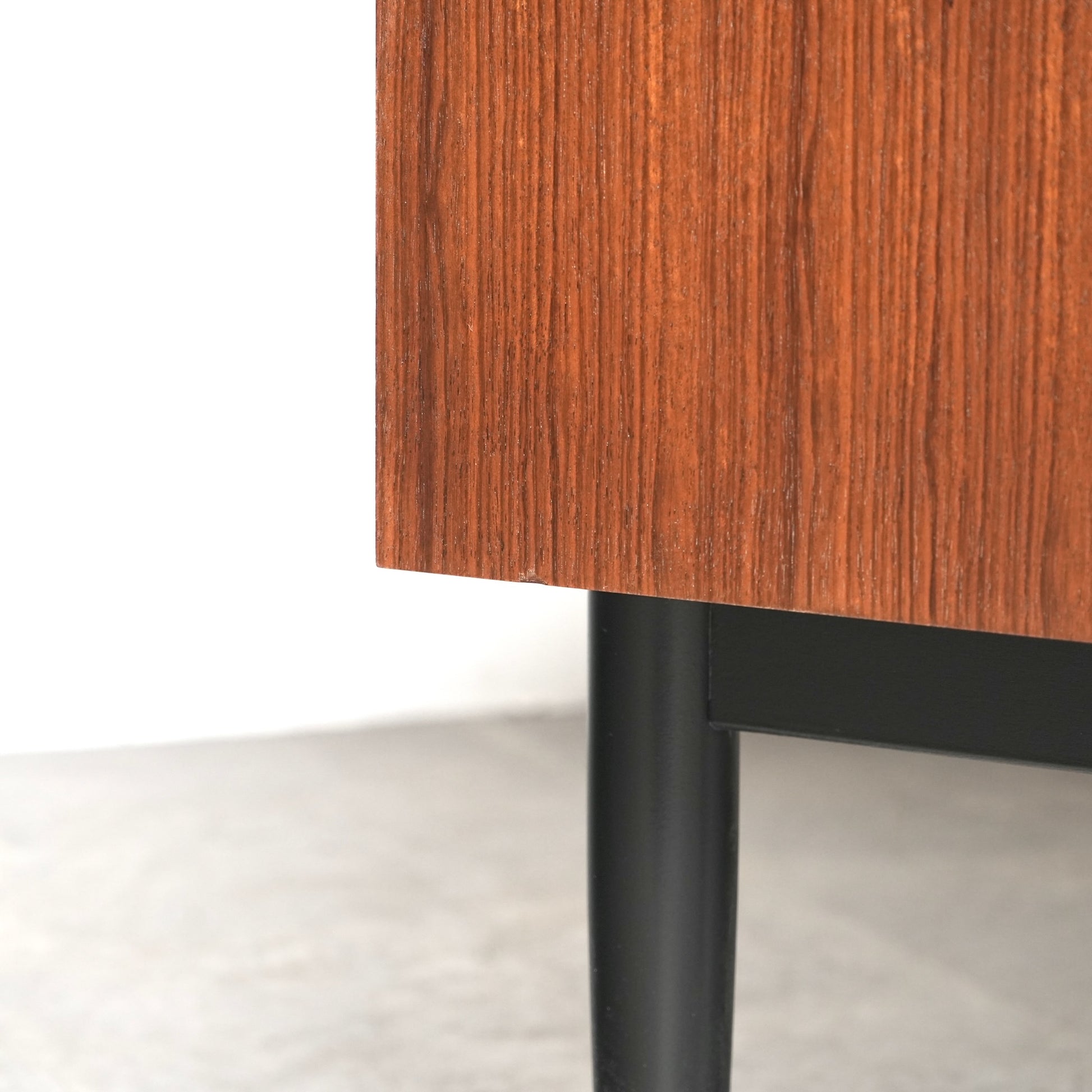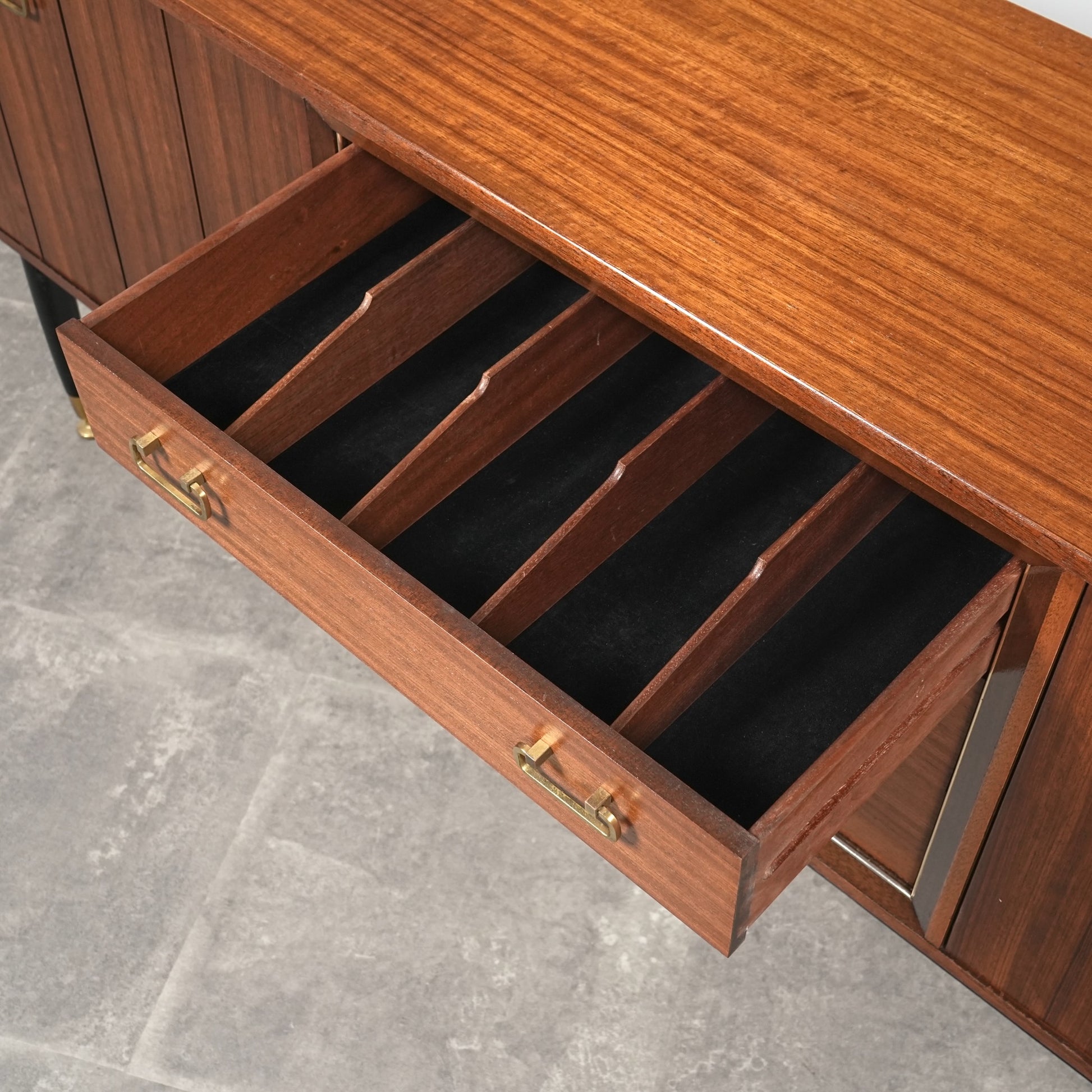 1950年代後半に発表されたTola&Blackシリーズはトラー材特有のユニークな木目と色味に加えて、黒色に塗装された脚部や金色の金具(真鍮メッキ)のバランスが秀逸なアイテムばかり。