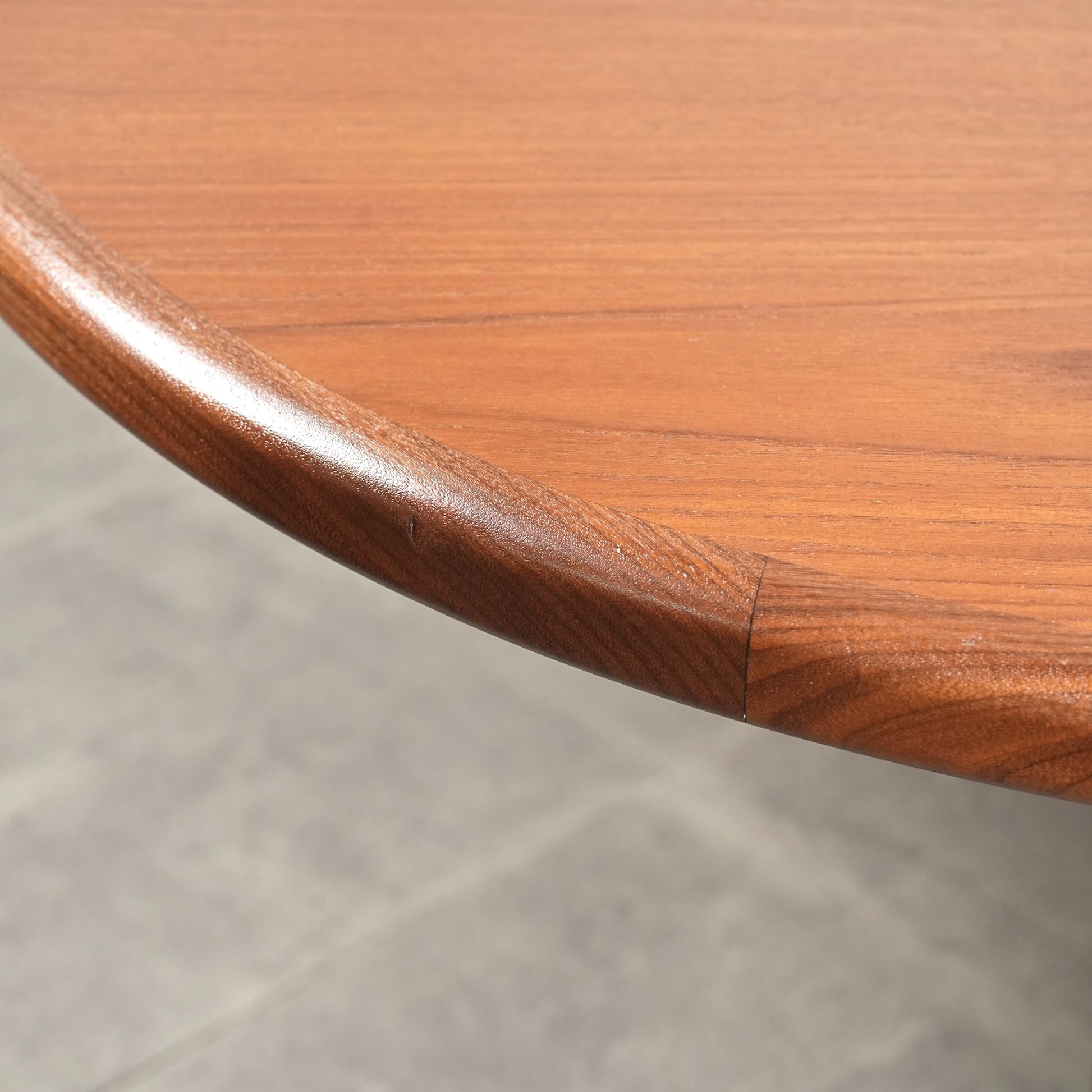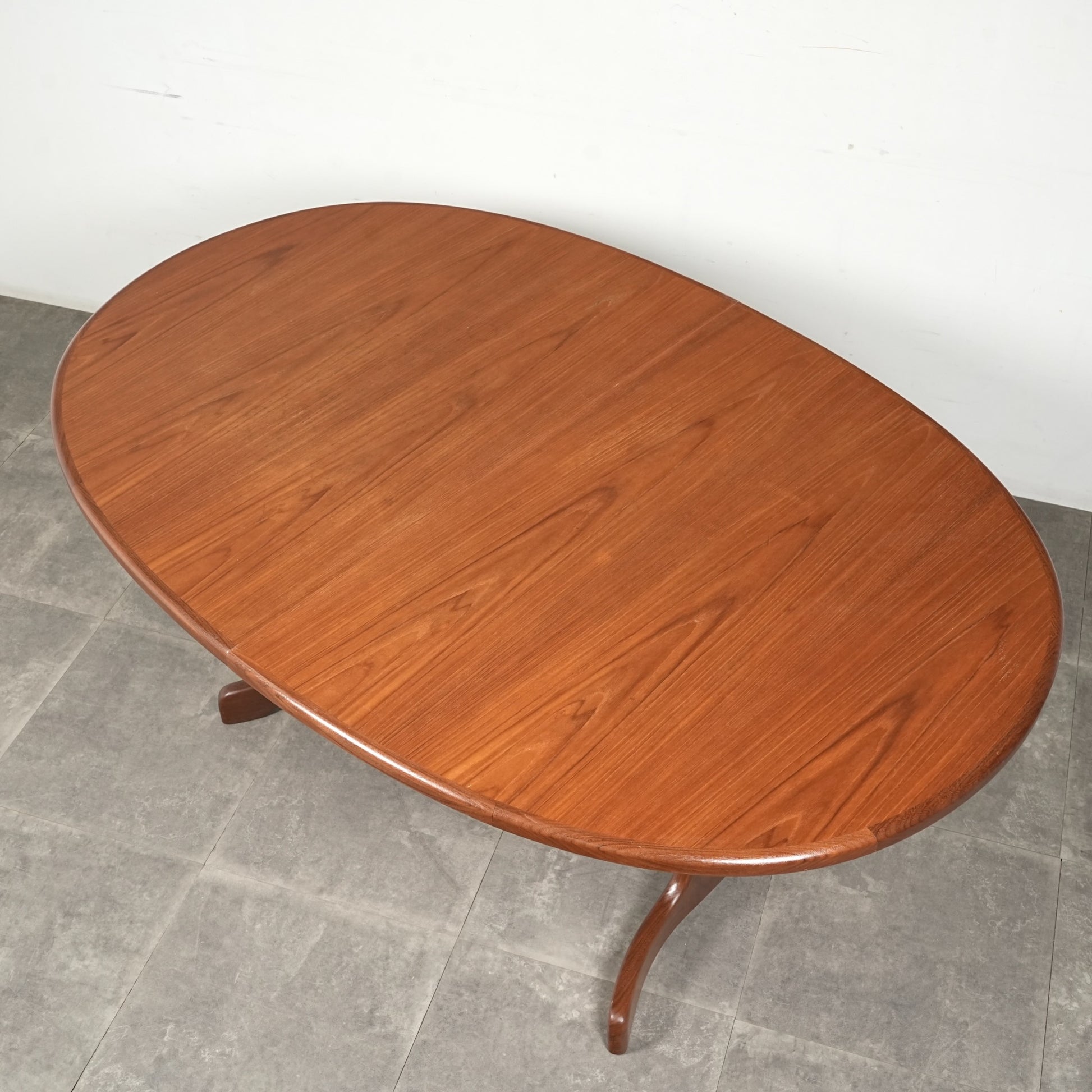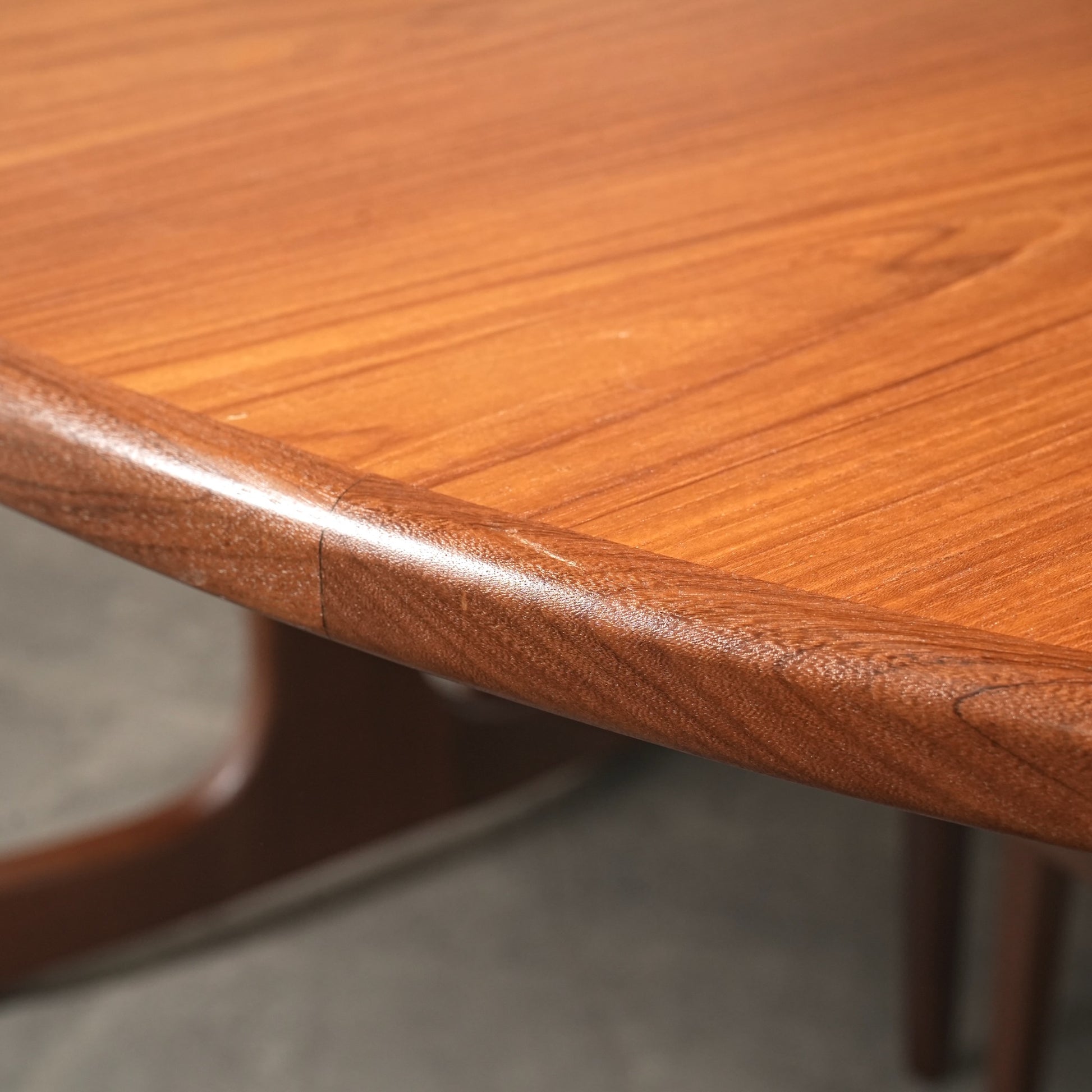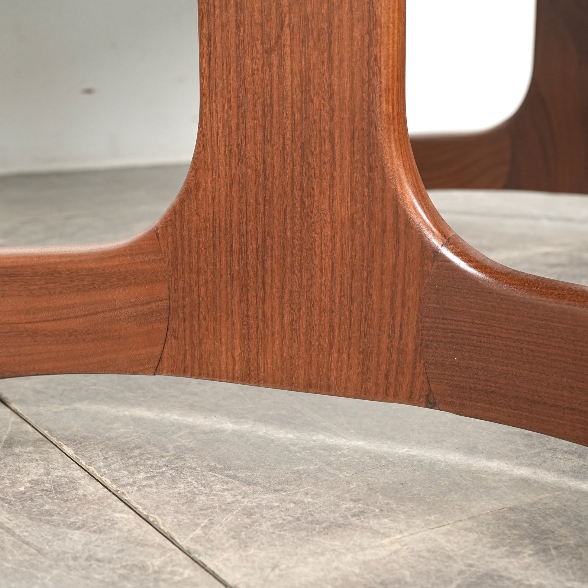 クジラの尻尾に見えることから「ホエールレッグ」とも呼ばれる脚部の曲線美が特徴で、上質なチーク材の美しい木目も相まって 360°どの角度から見ても絵になる流石のデザインです。