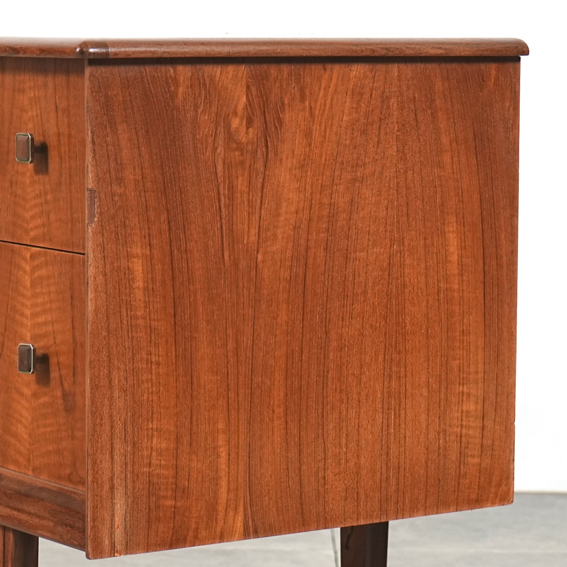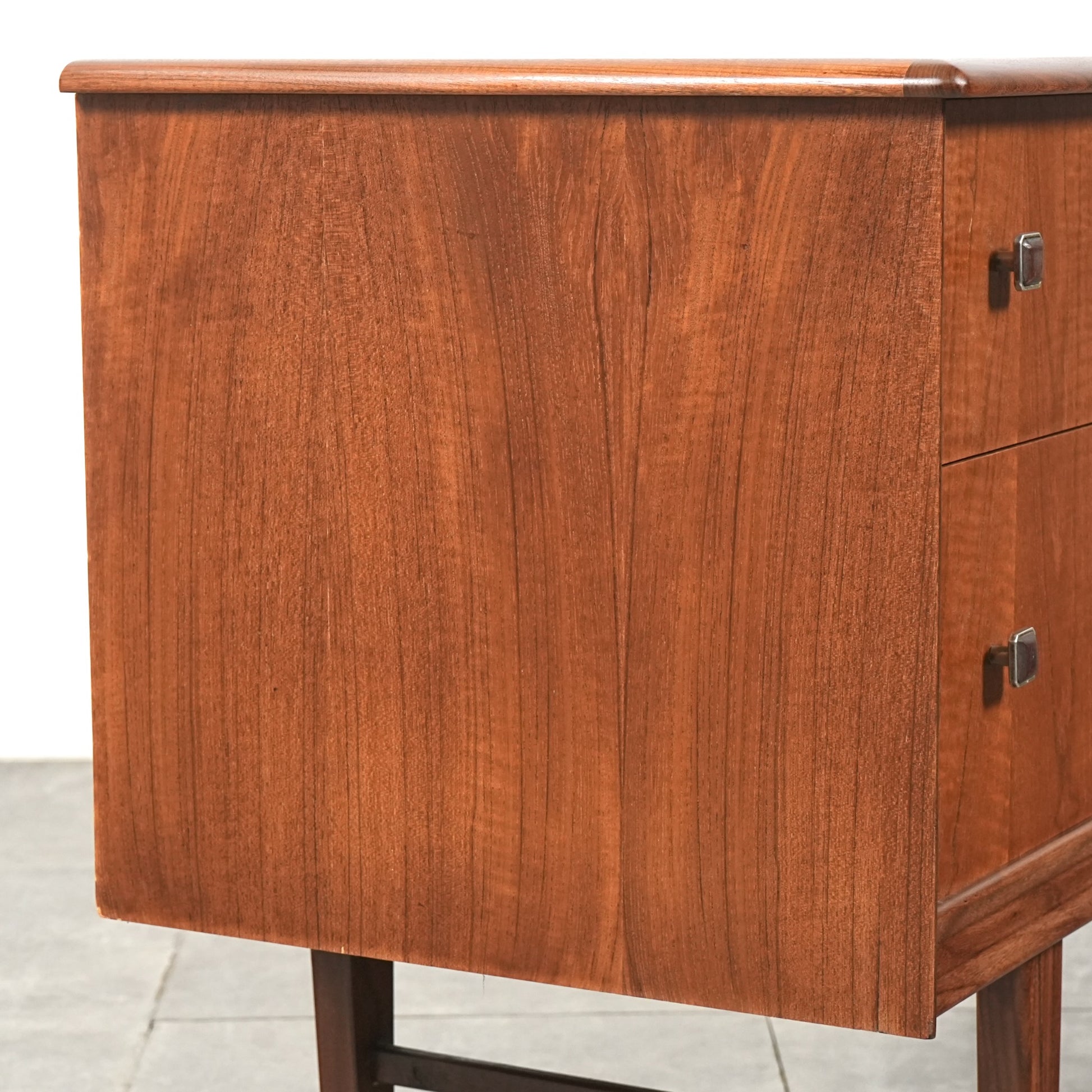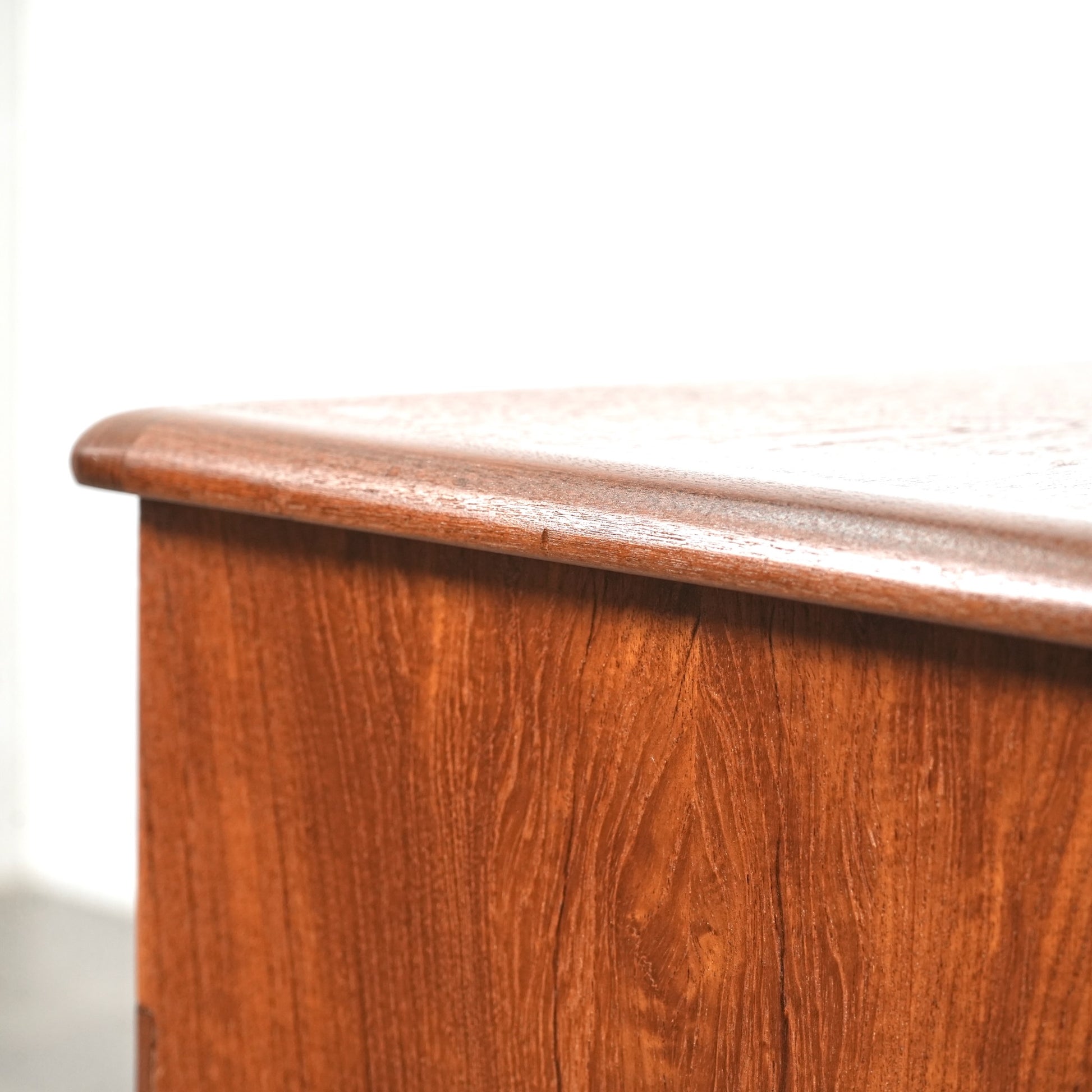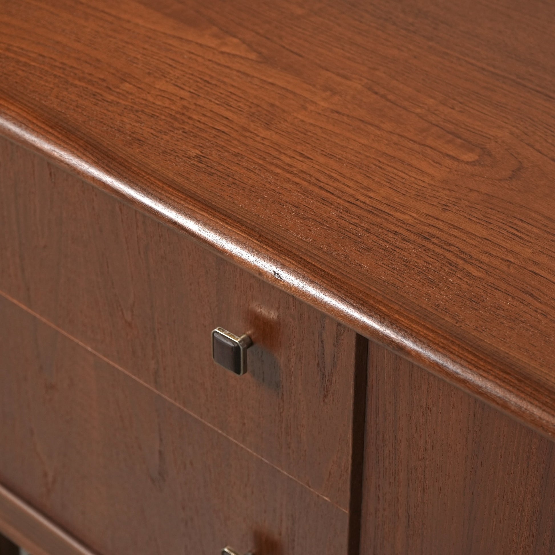 高品質なチーク材を使用しており、全体の直線的なフォルムに対して、脚部のシャープなラインや可愛らしい取手が程よい軽やかさを演出しています。