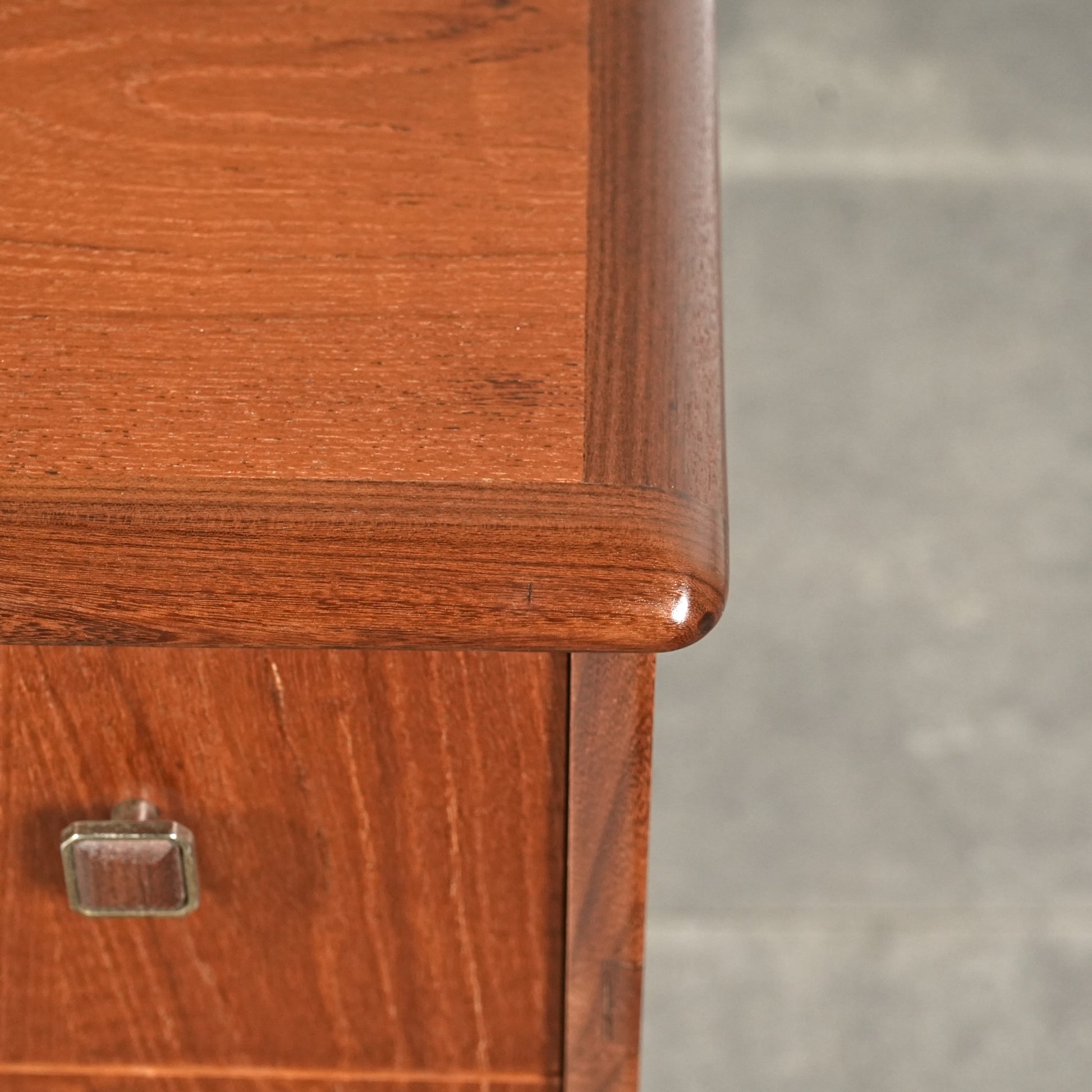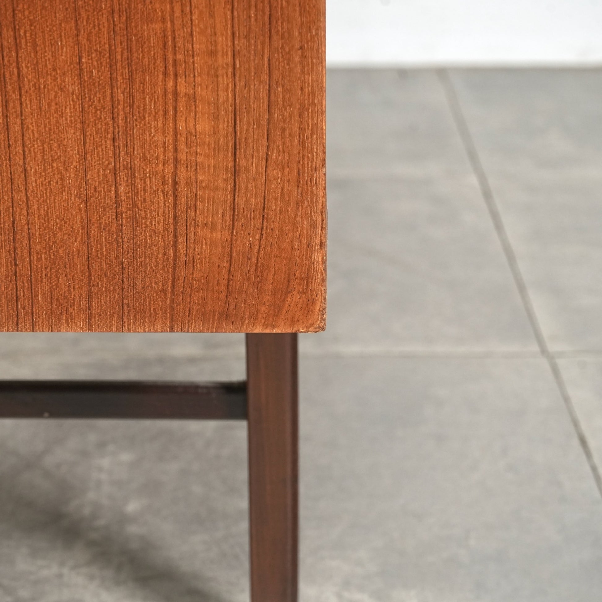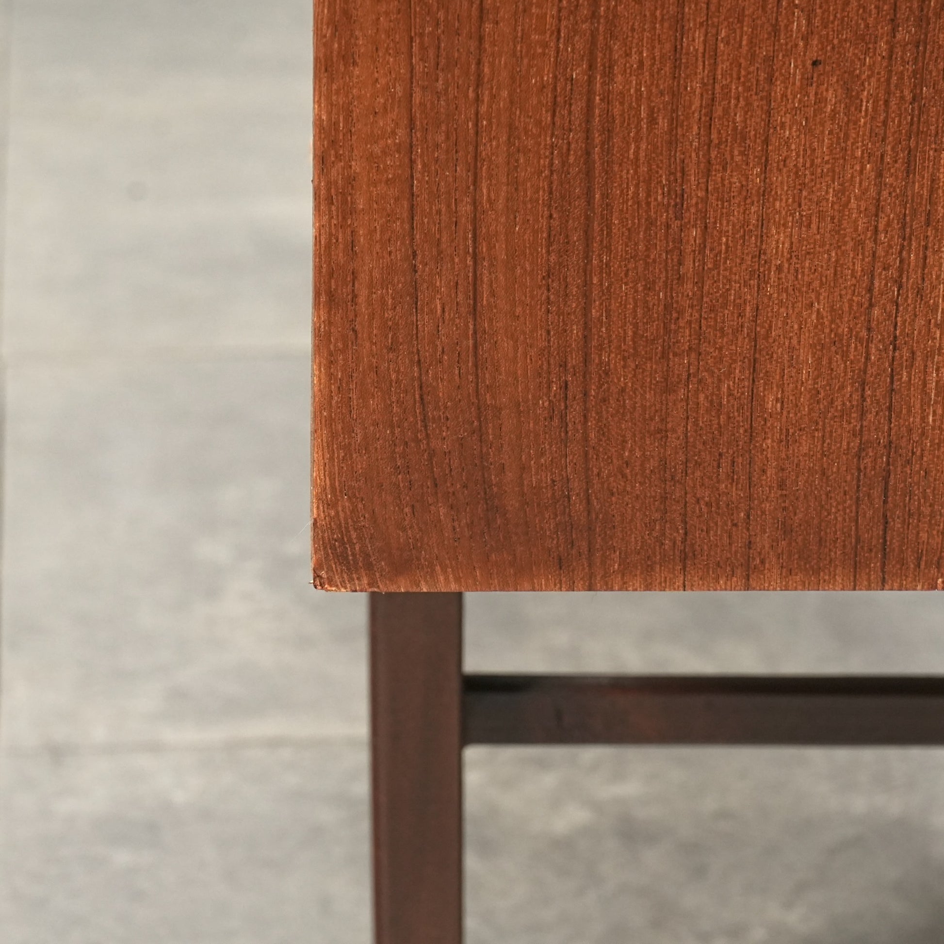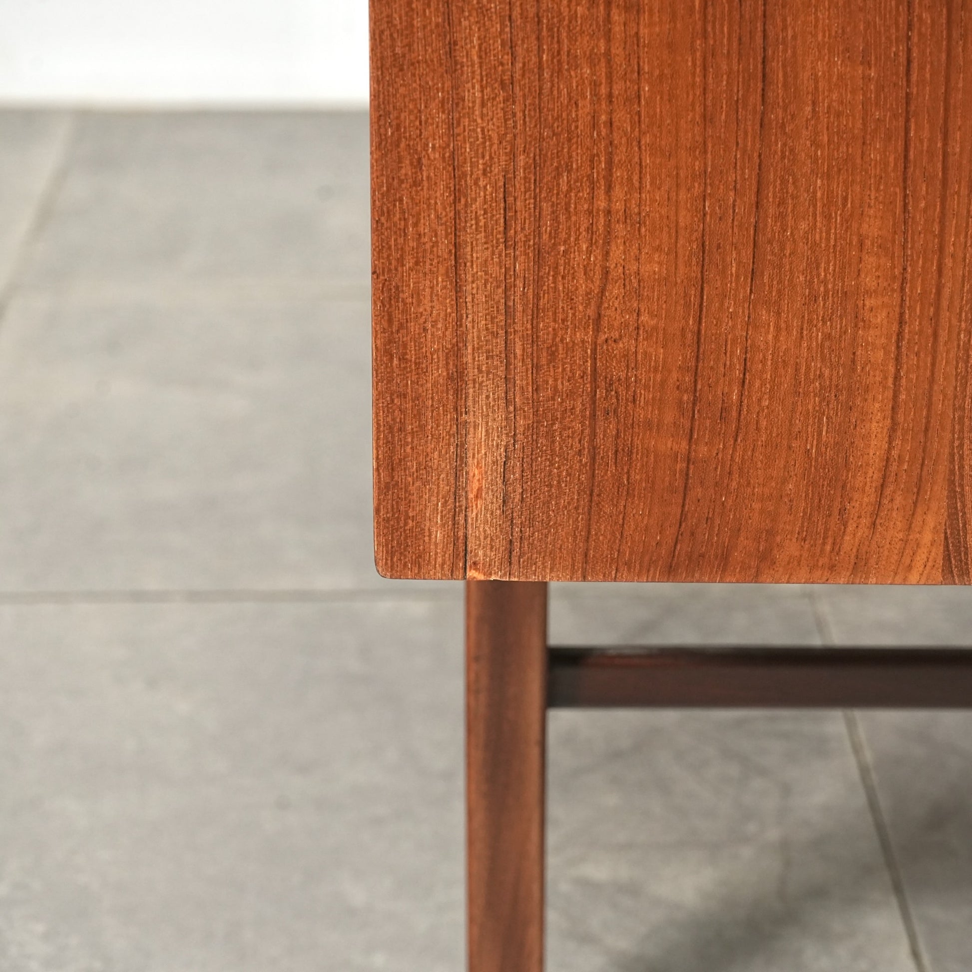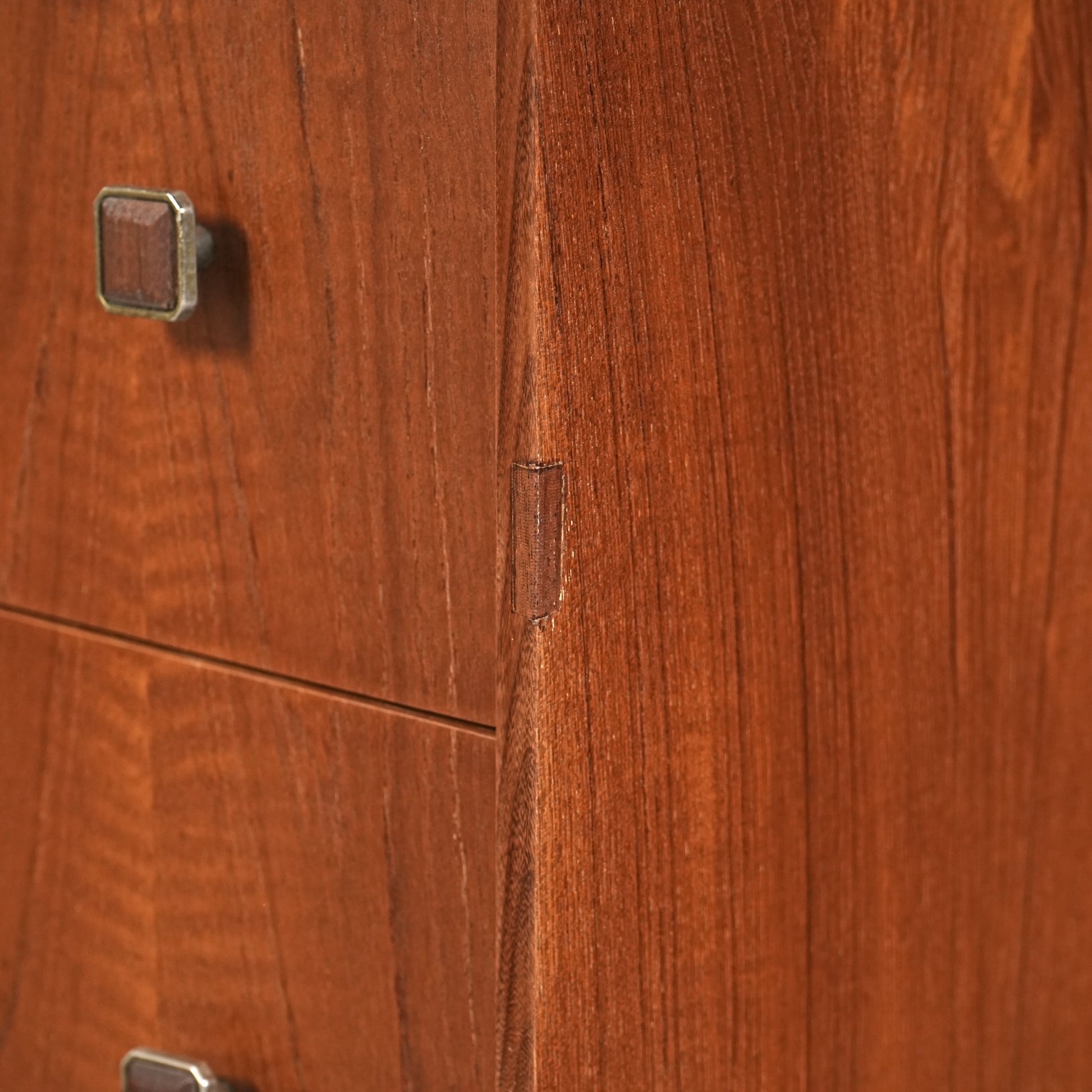 高品質なチーク材を使用しており、全体の直線的なフォルムに対して、脚部のシャープなラインや可愛らしい取手が程よい軽やかさを演出しています。