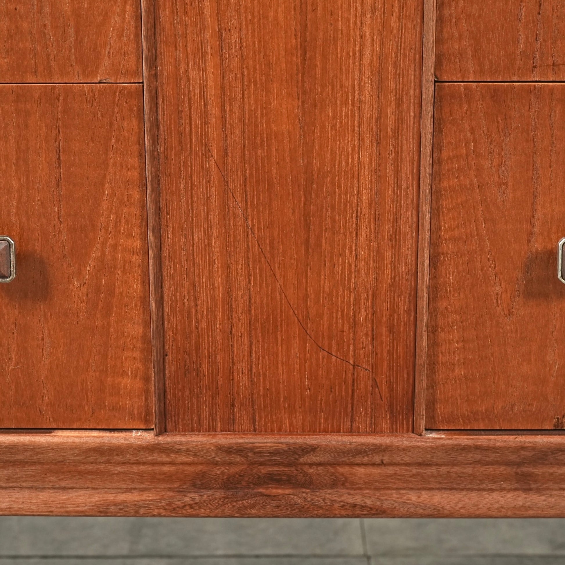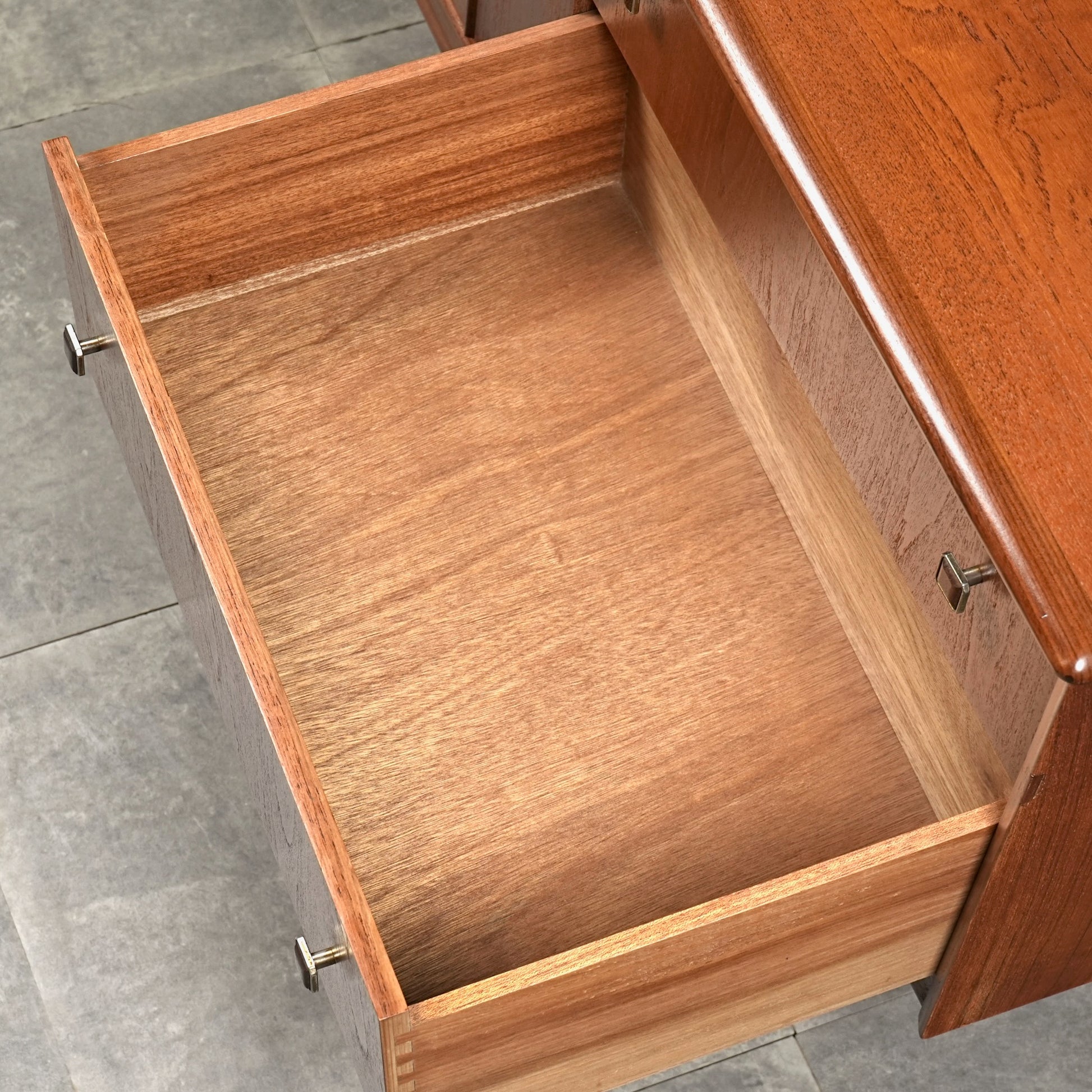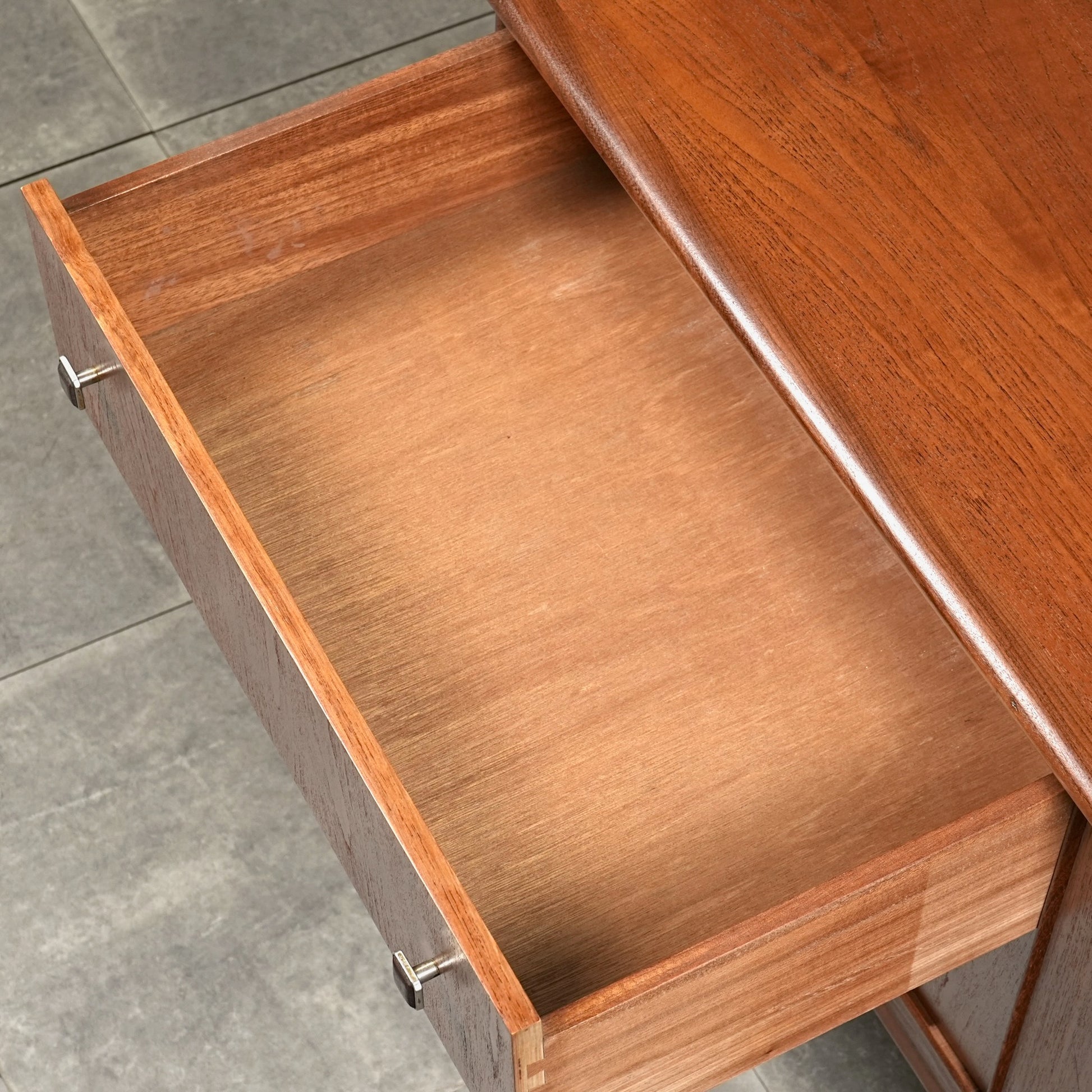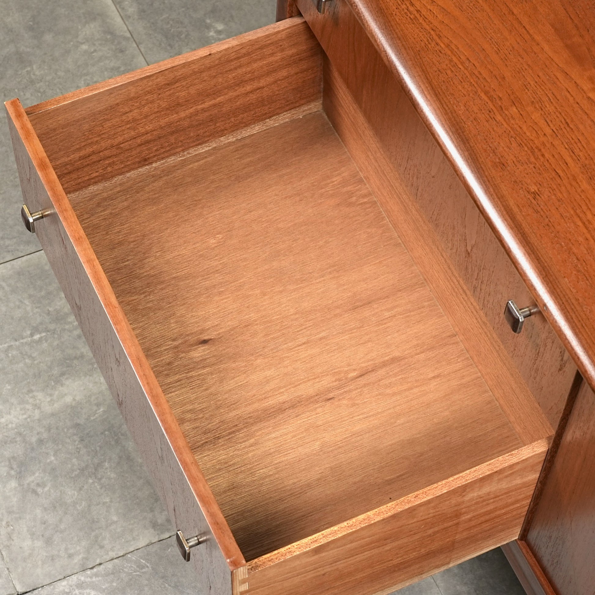 高品質なチーク材を使用しており、全体の直線的なフォルムに対して、脚部のシャープなラインや可愛らしい取手が程よい軽やかさを演出しています。
