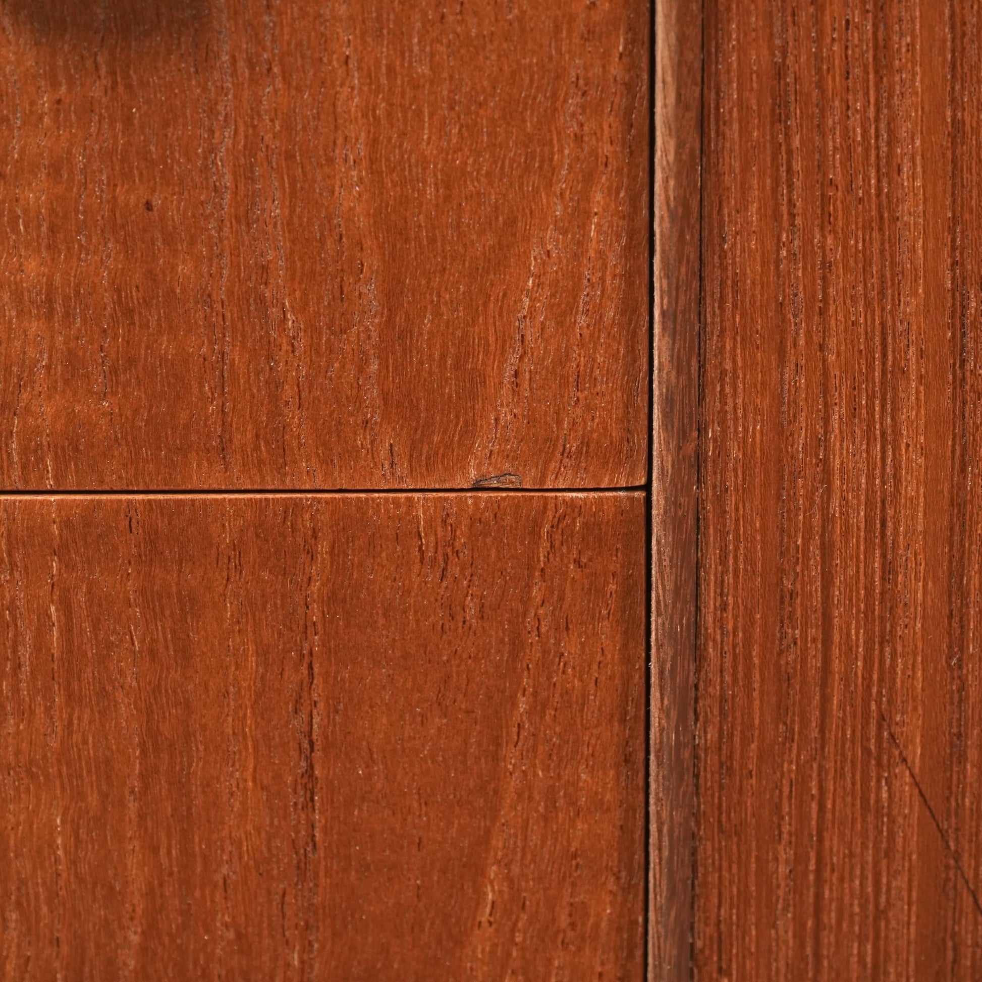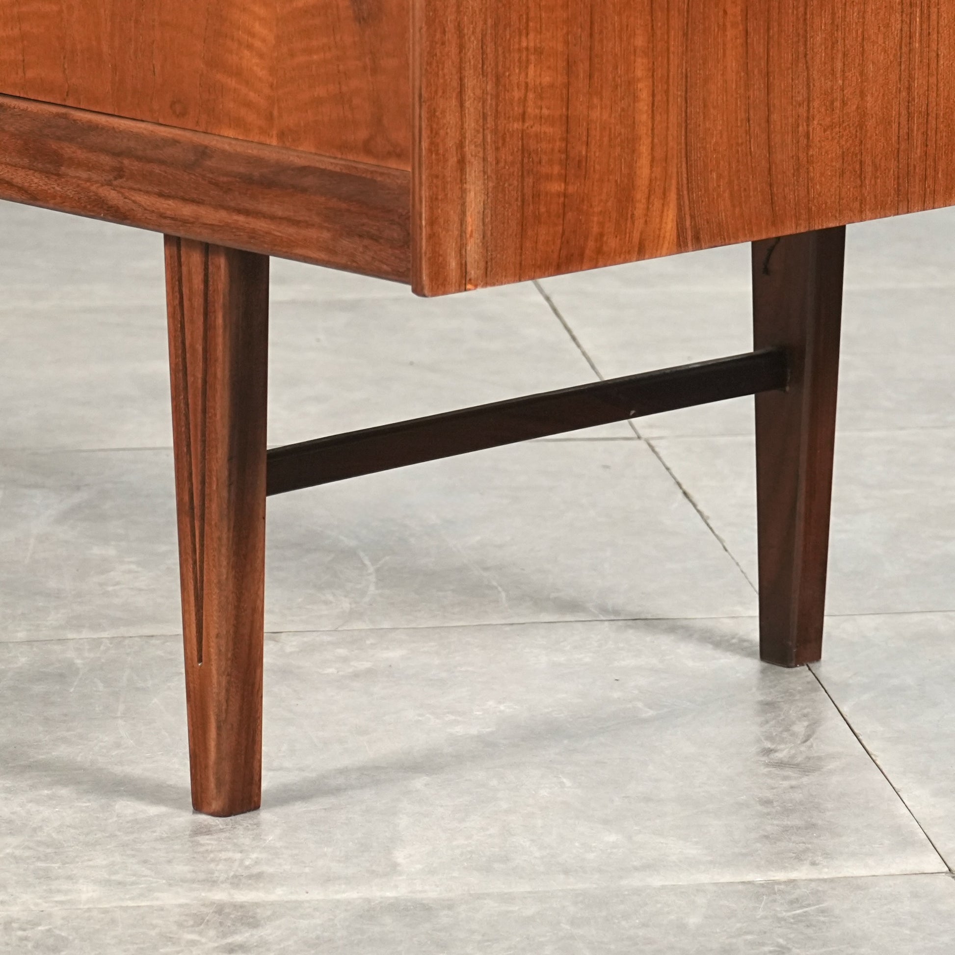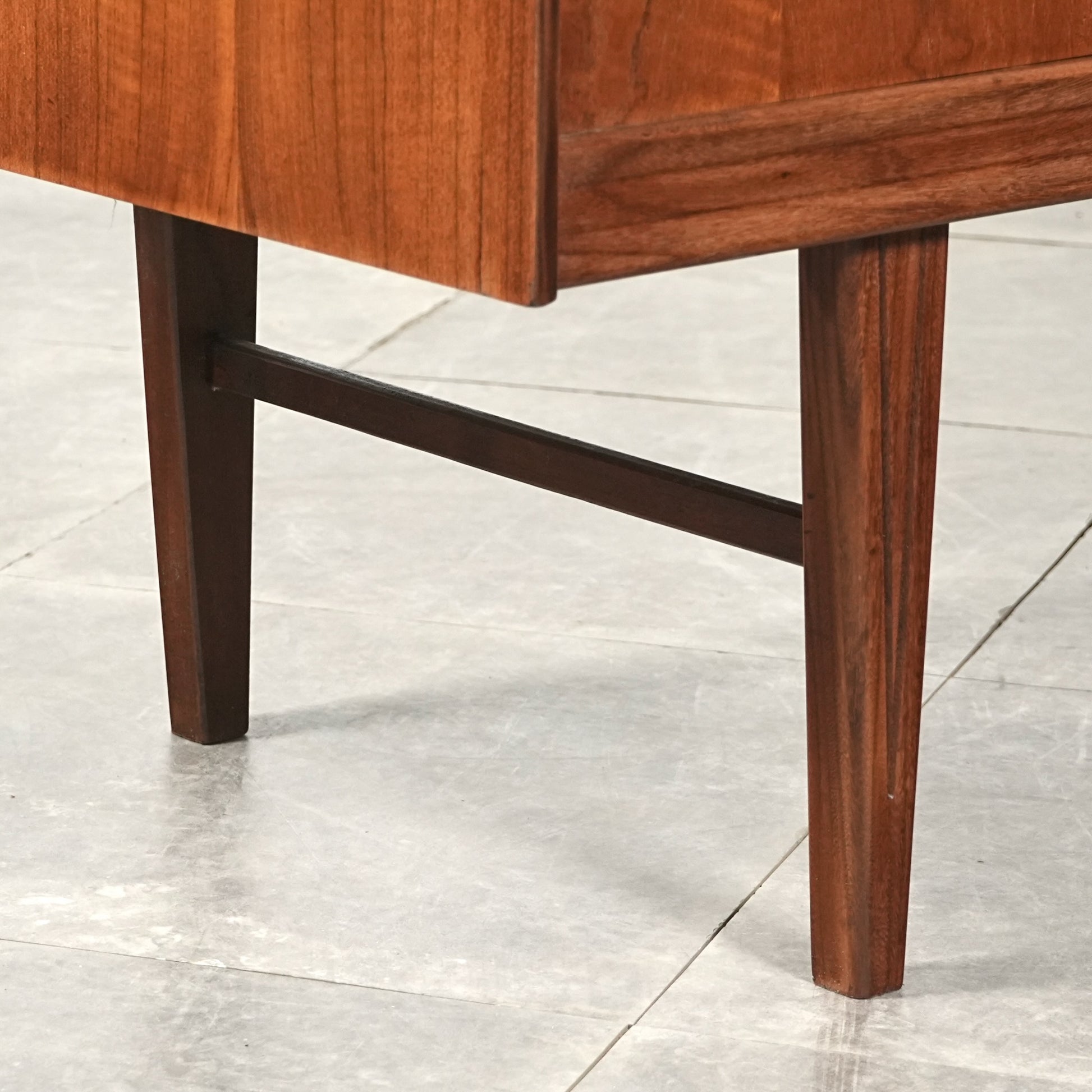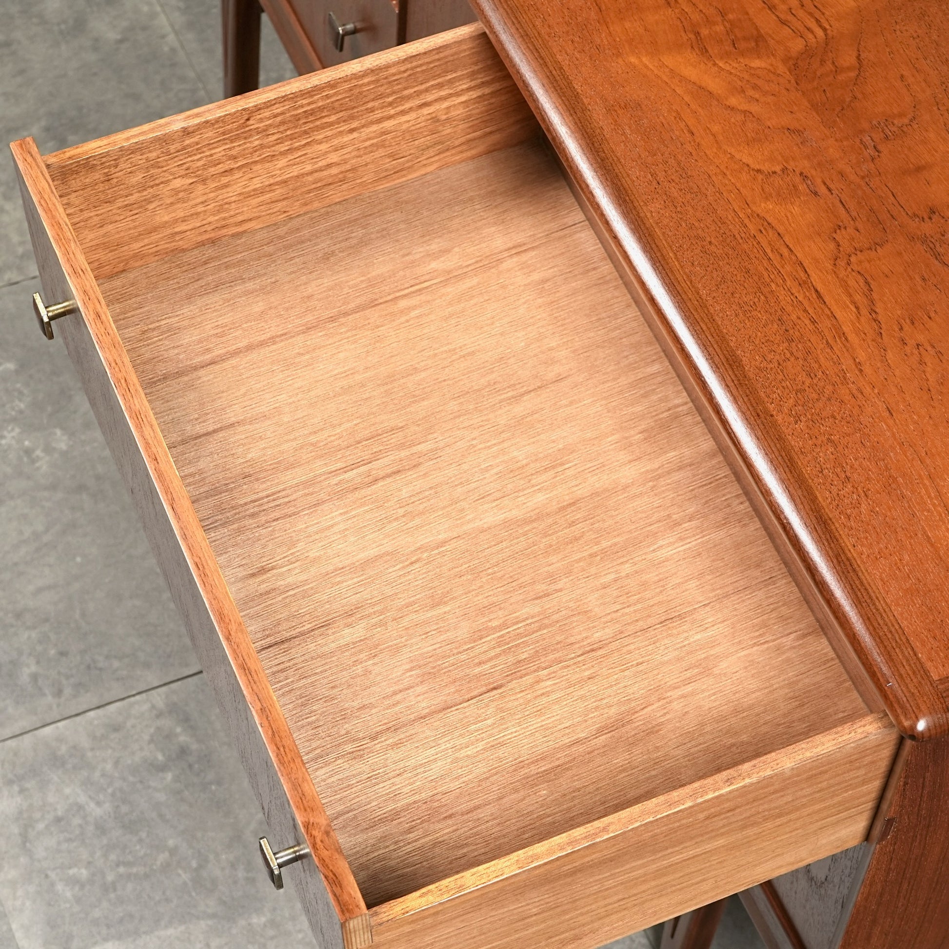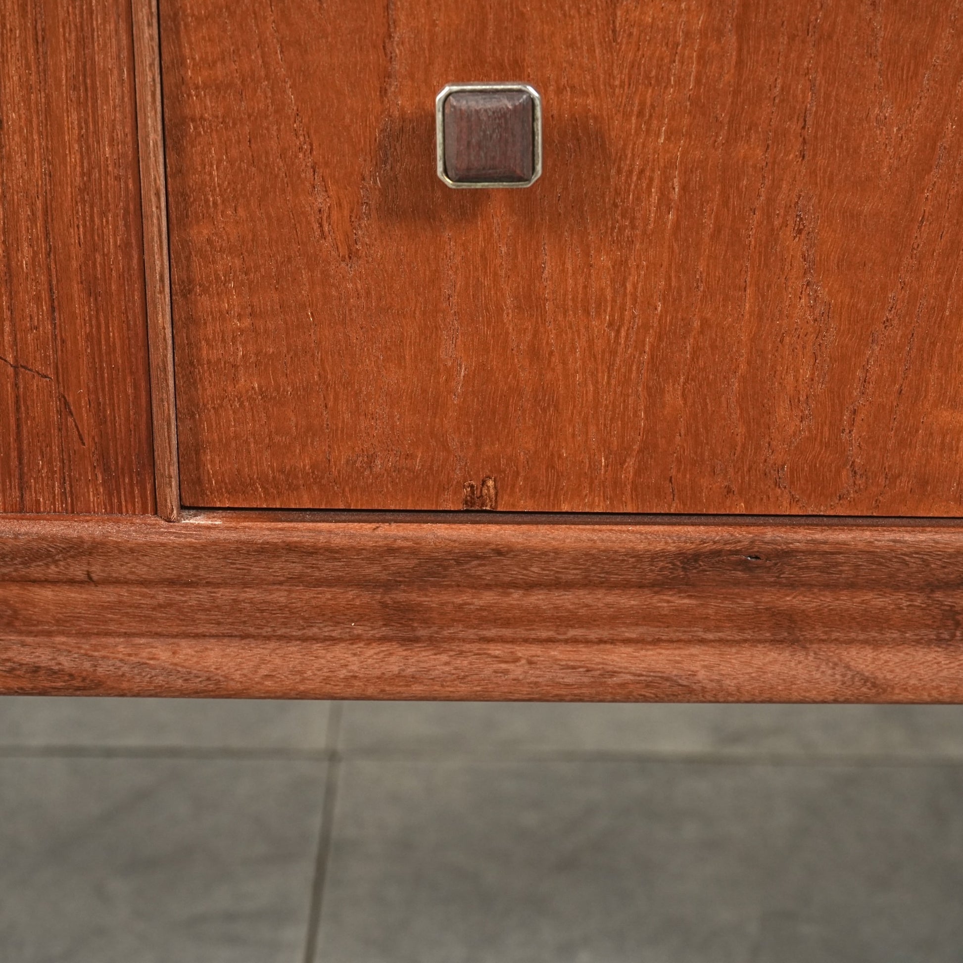 高品質なチーク材を使用しており、全体の直線的なフォルムに対して、脚部のシャープなラインや可愛らしい取手が程よい軽やかさを演出しています。