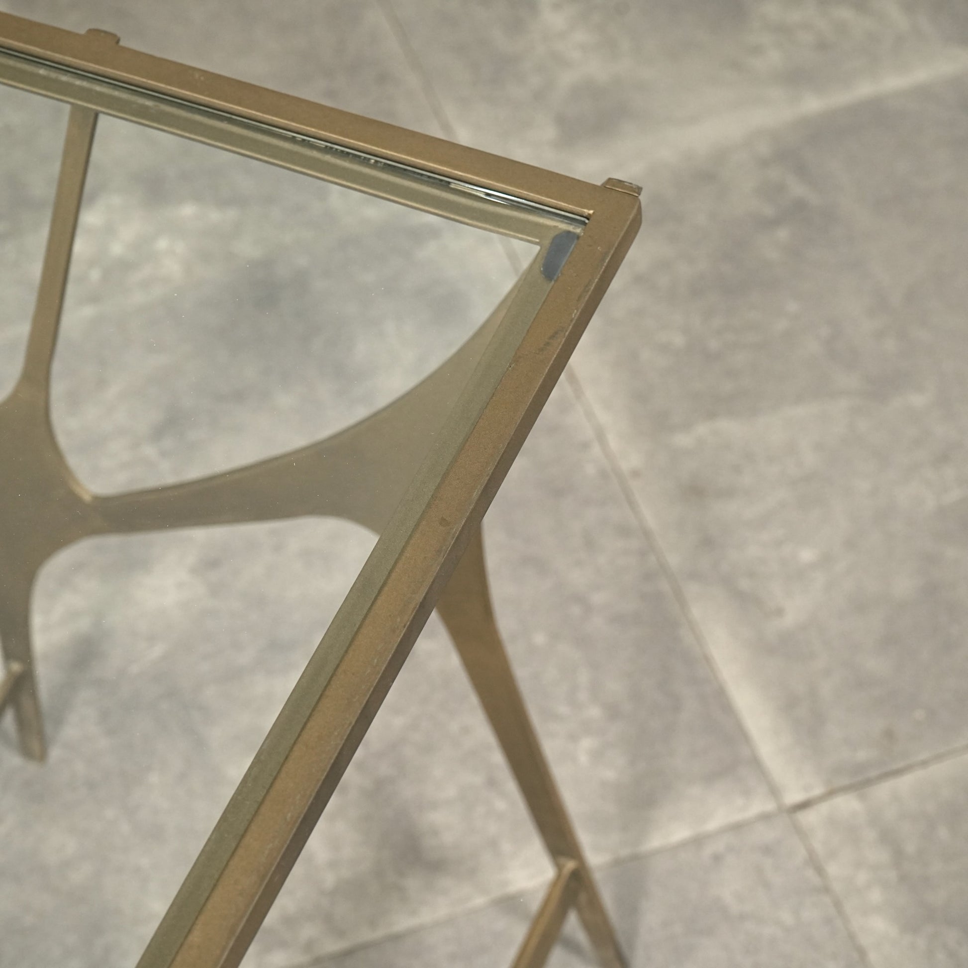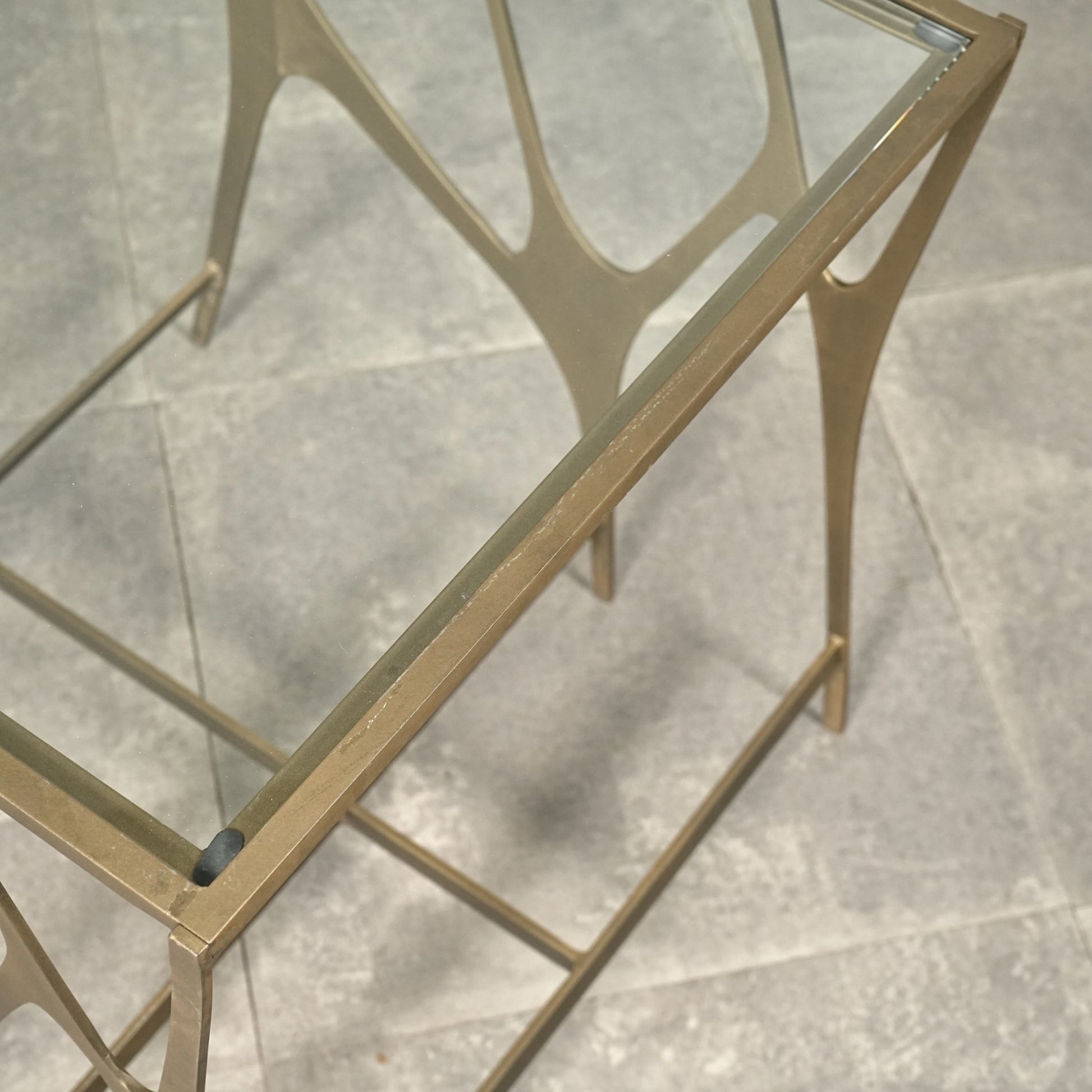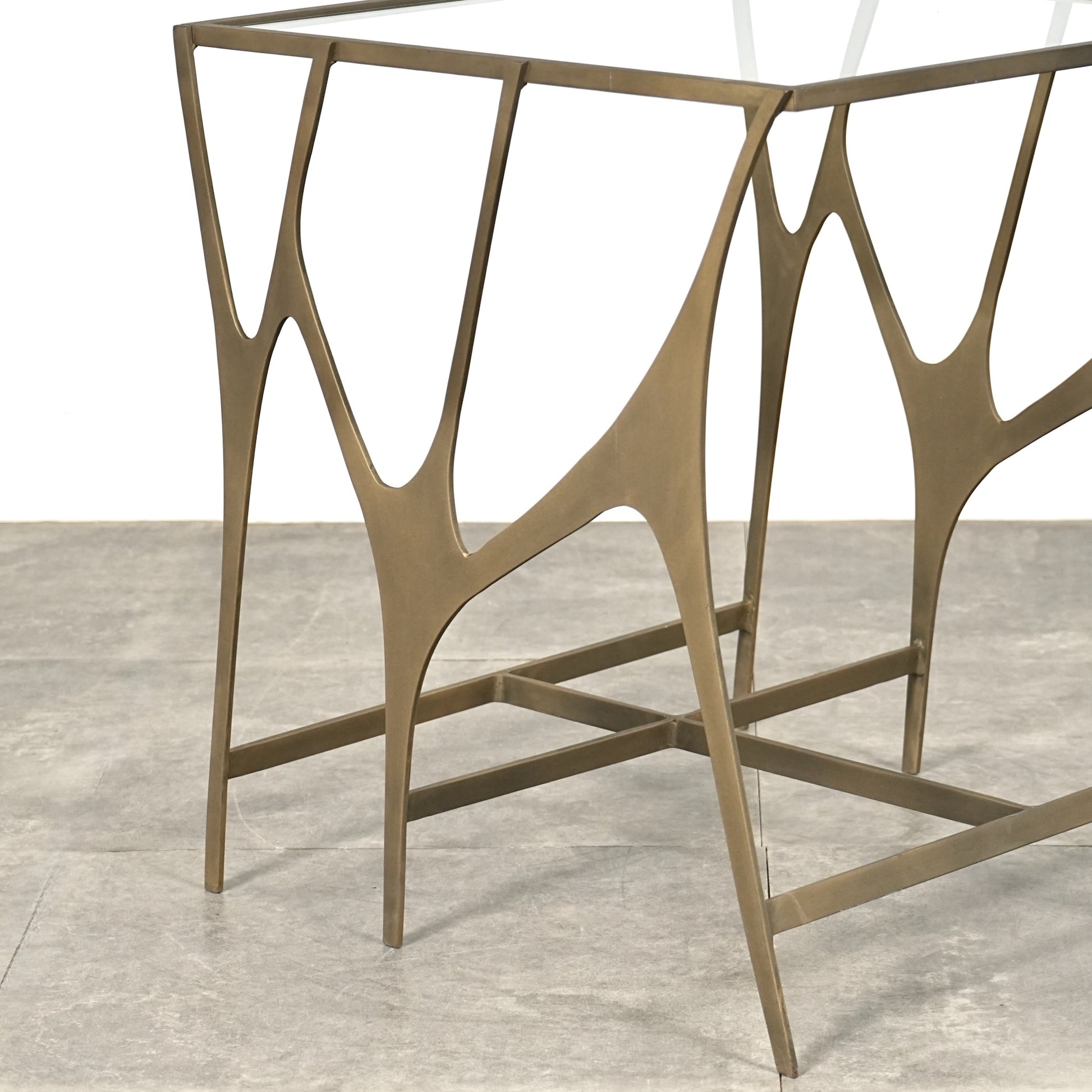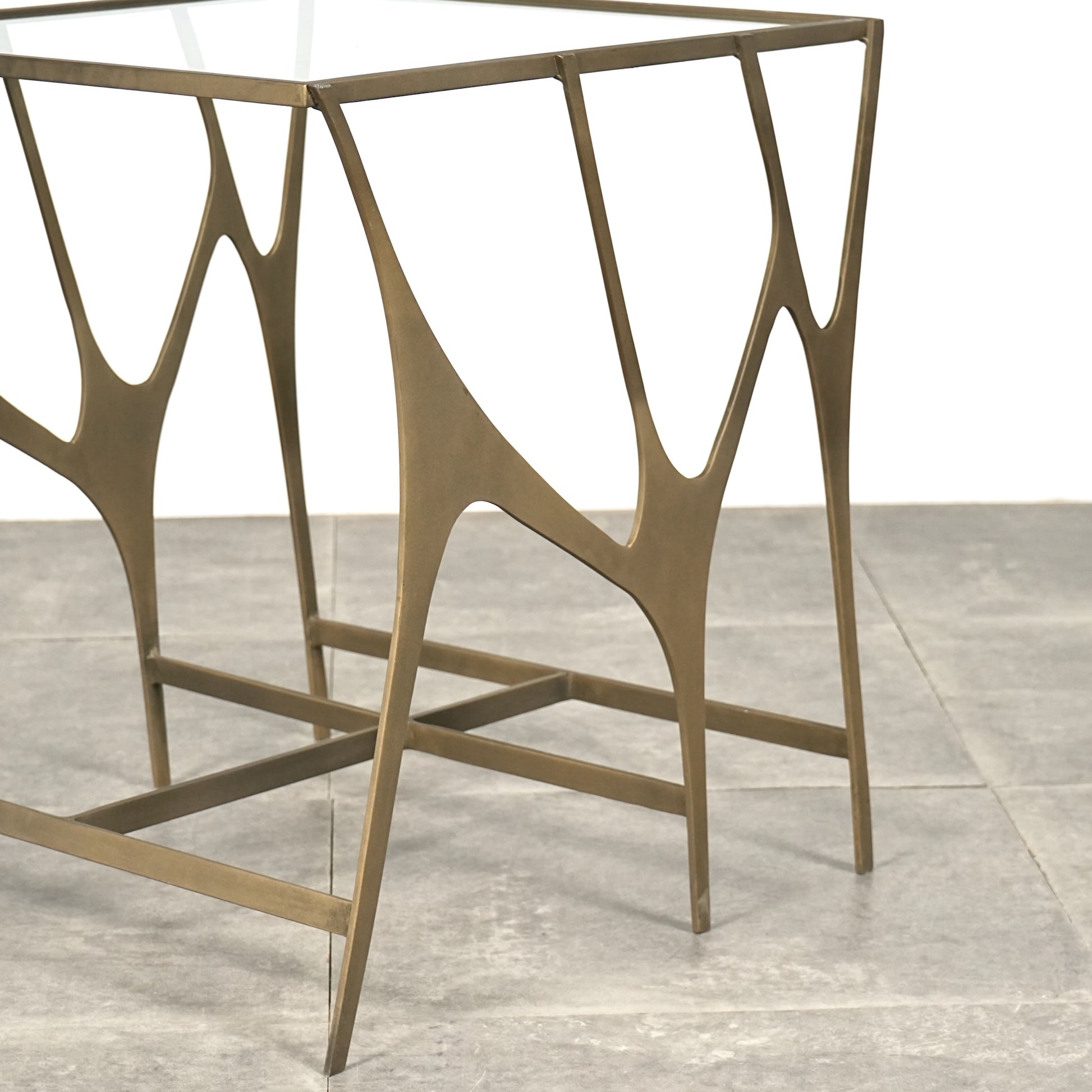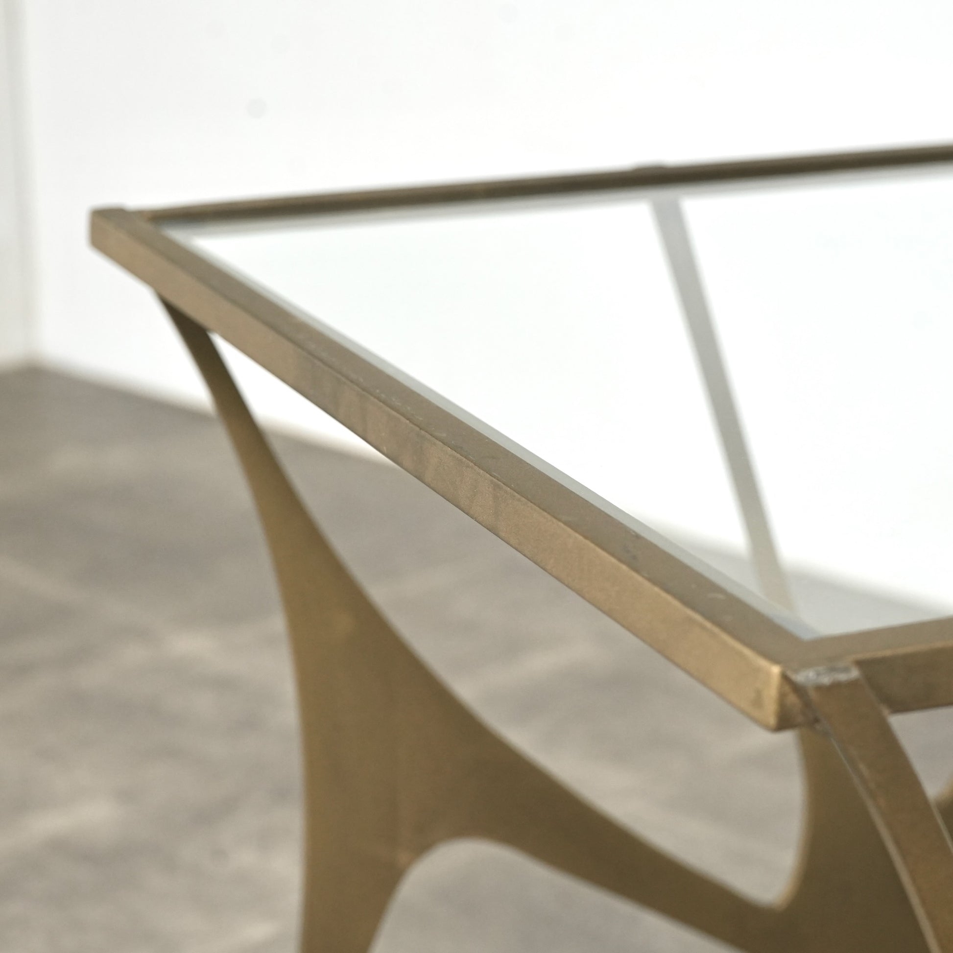 落ち着いたゴールドのアイアンフレームとガラスという異素材が絶妙なバランスで組み合わされており、脚部のユニークなフォルムも相まって非常にモダンな佇まい。