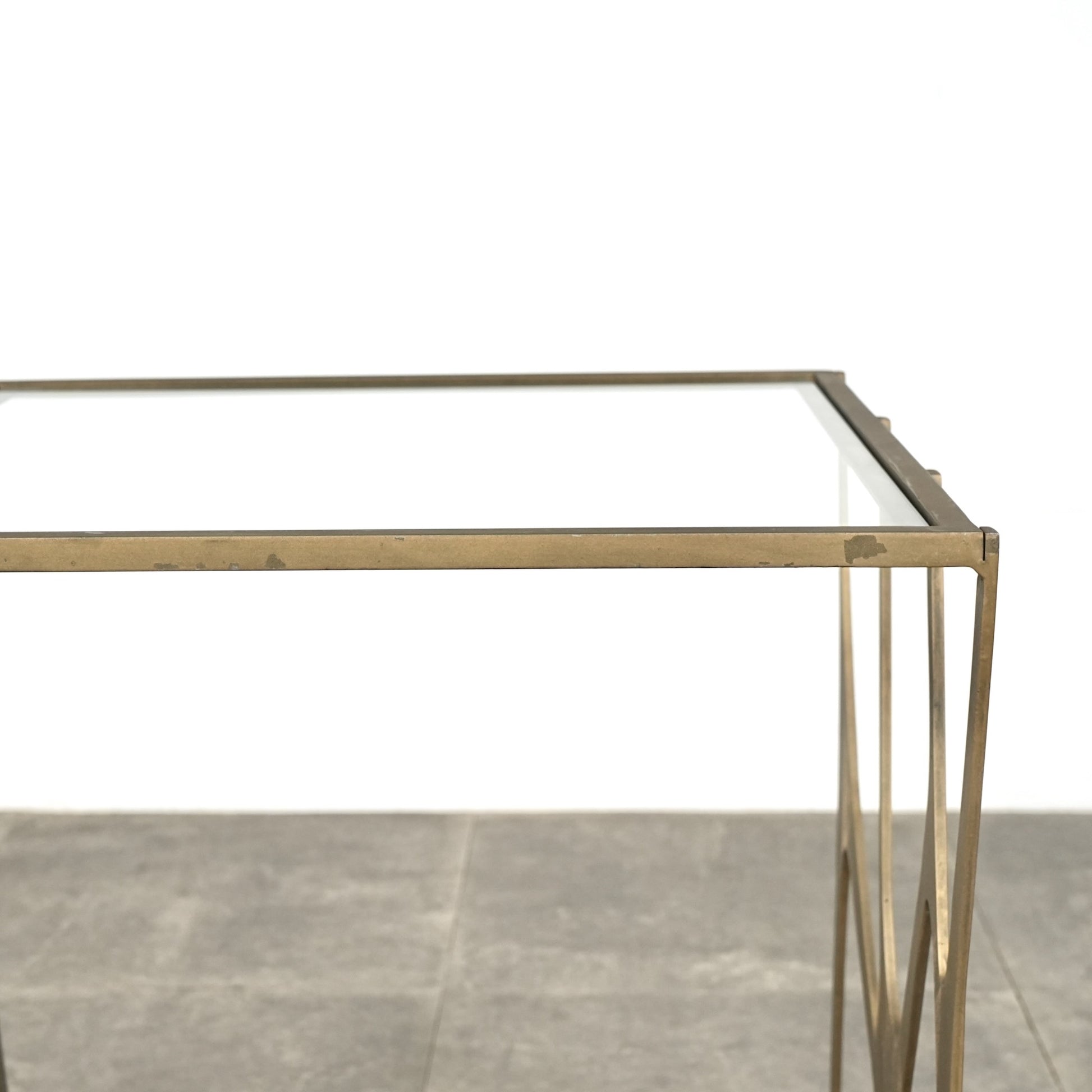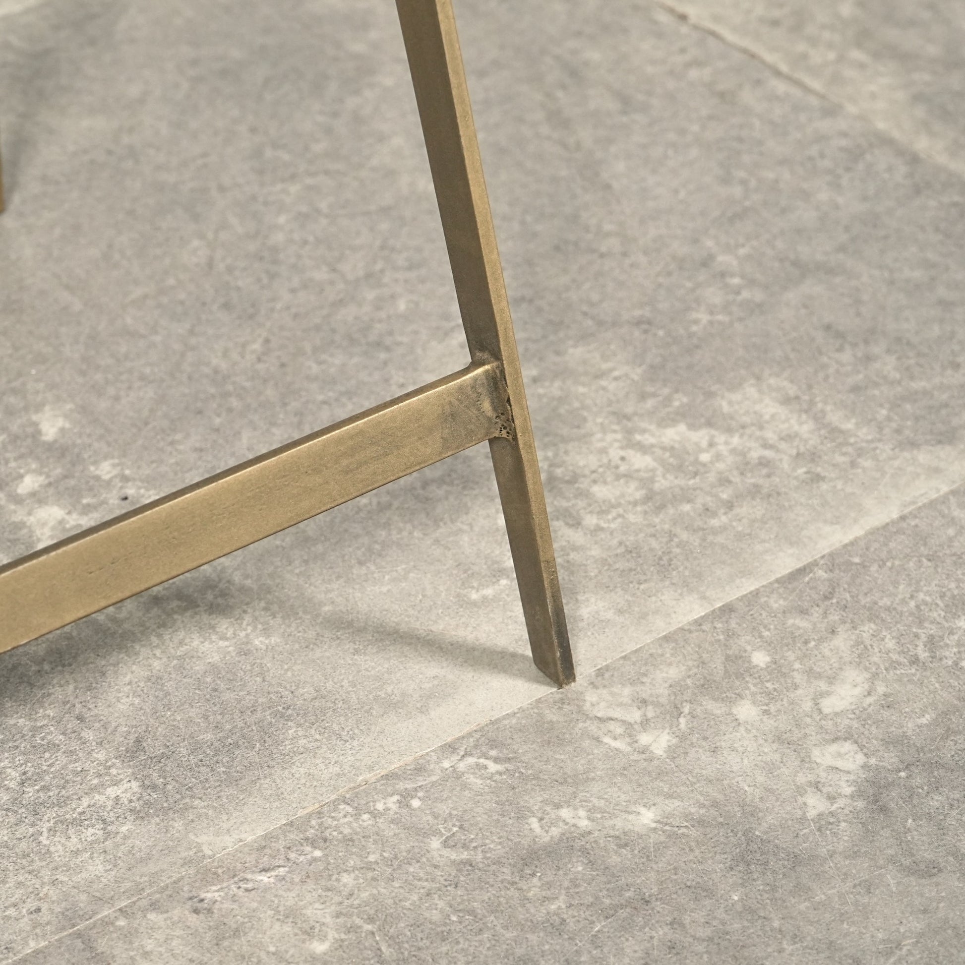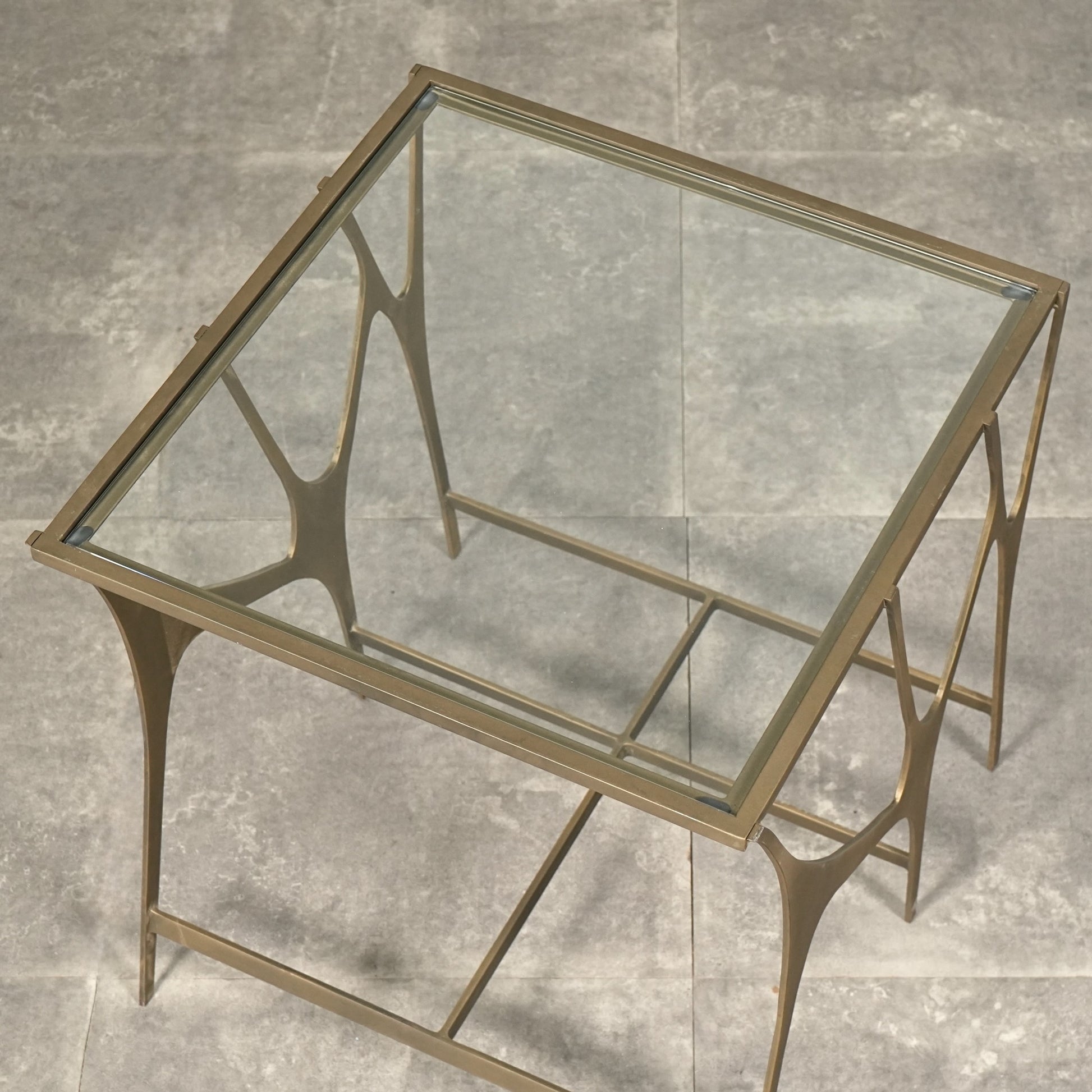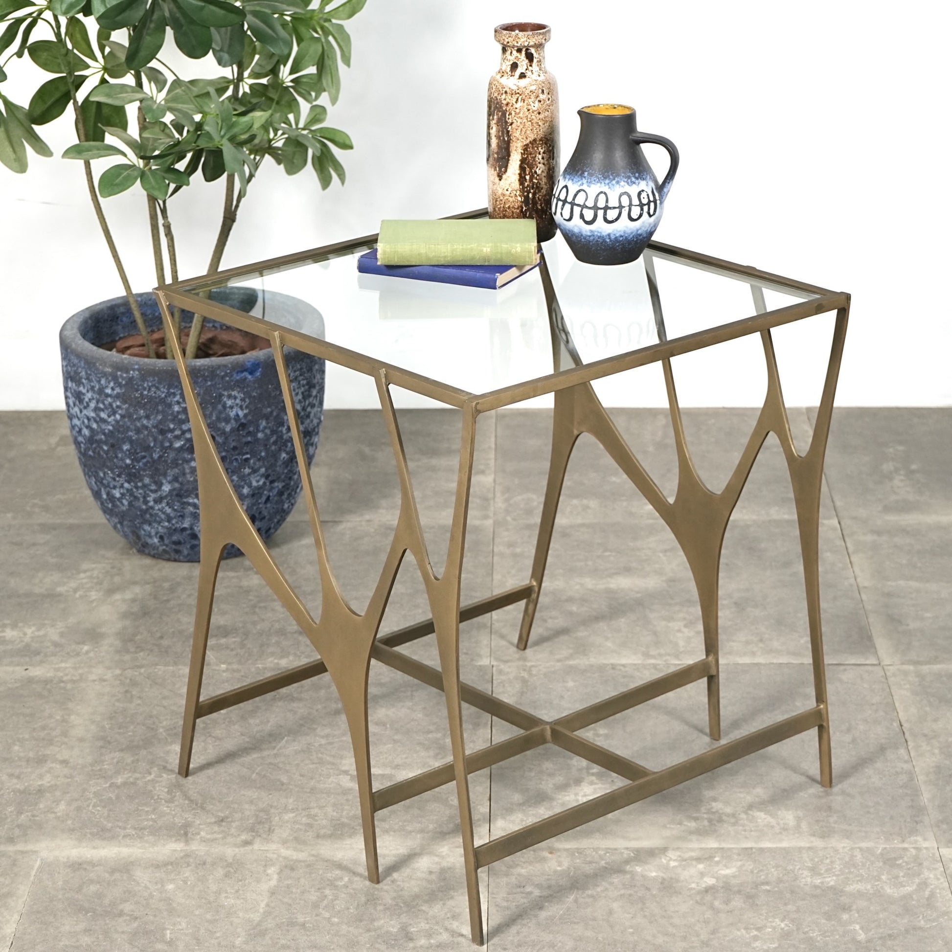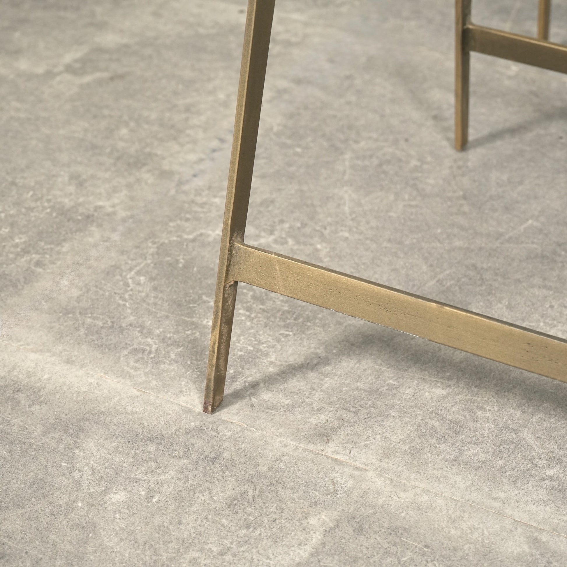落ち着いたゴールドのアイアンフレームとガラスという異素材が絶妙なバランスで組み合わされており、脚部のユニークなフォルムも相まって非常にモダンな佇まい。