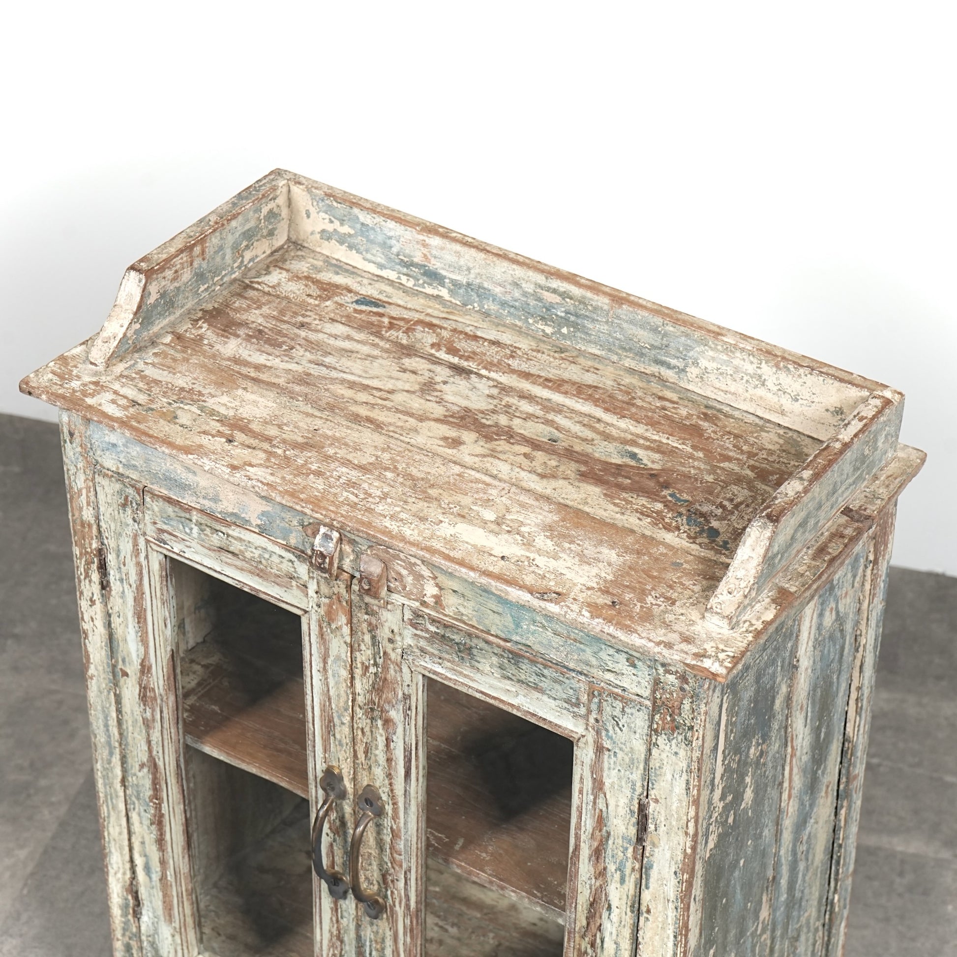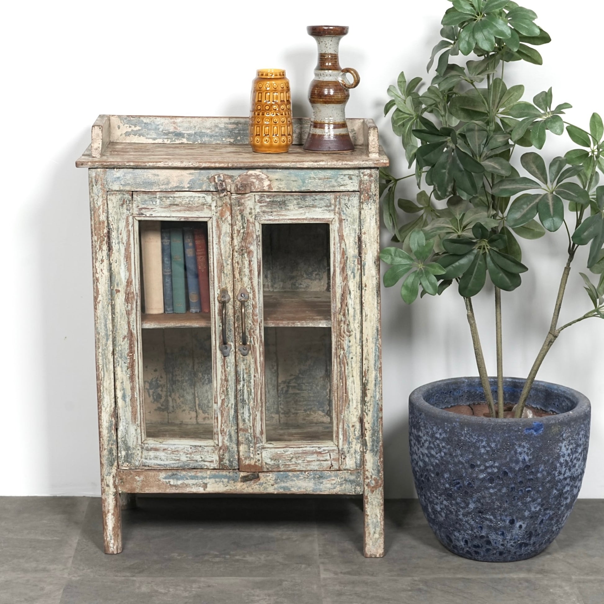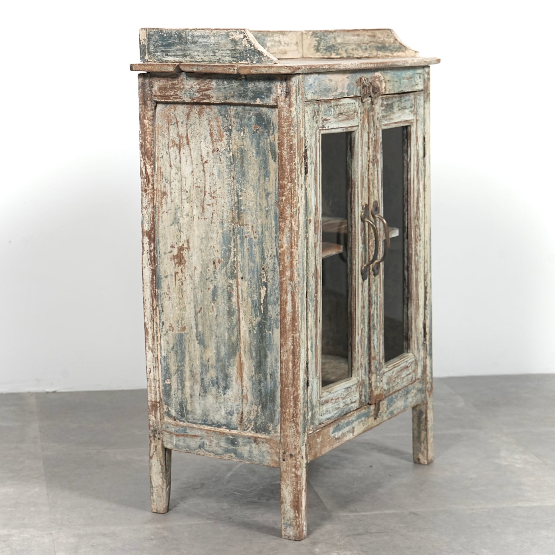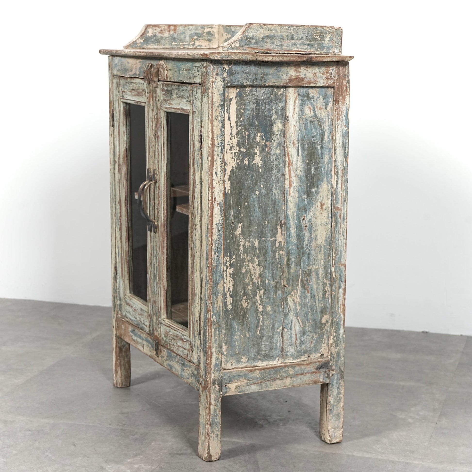 こちらのガラスキャビネットは、長い年月の中で塗り重ねられたペイントの経年変化が最大の魅力で、インドヴィンテージならではの異質な存在感を放ちます。