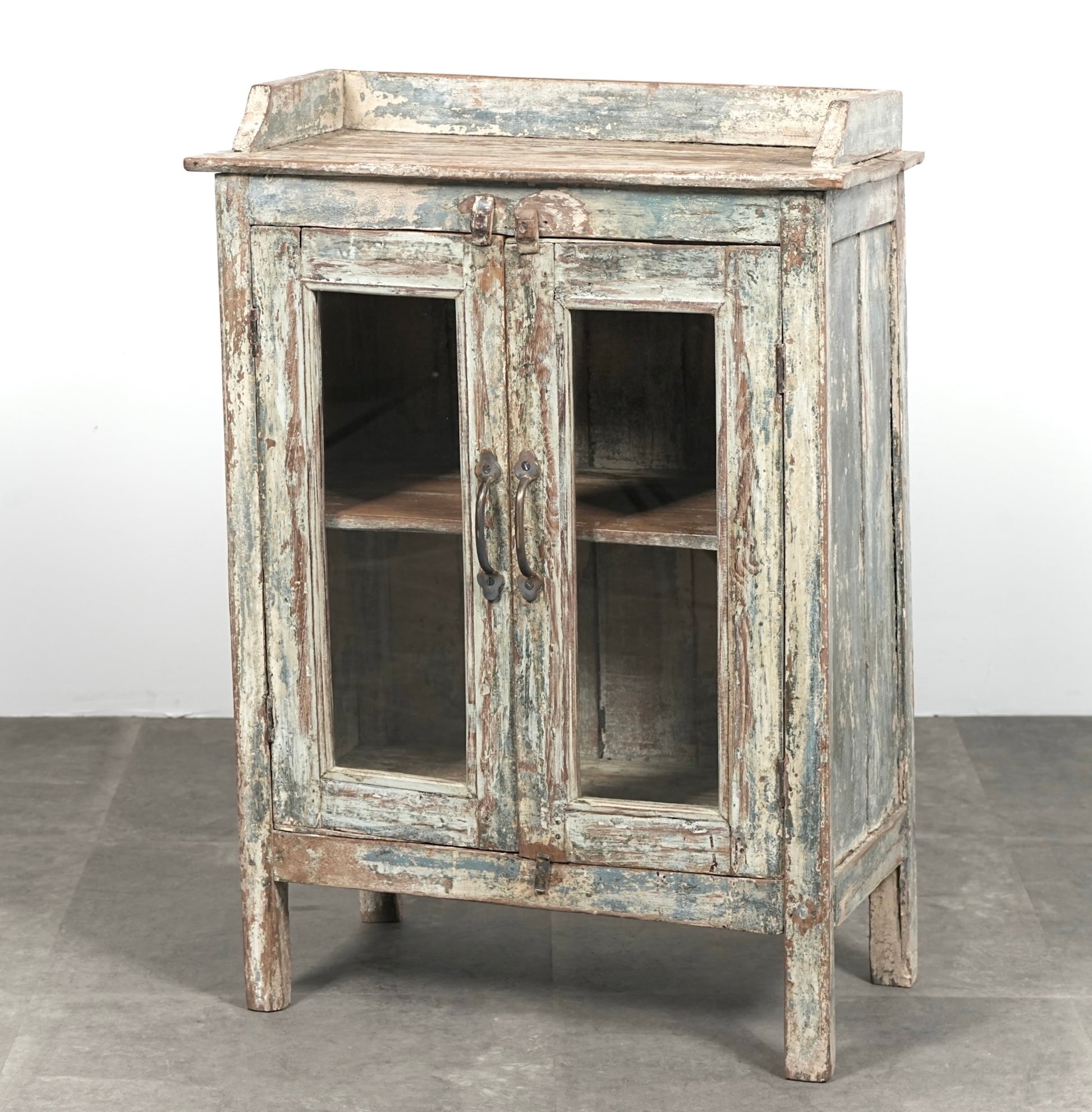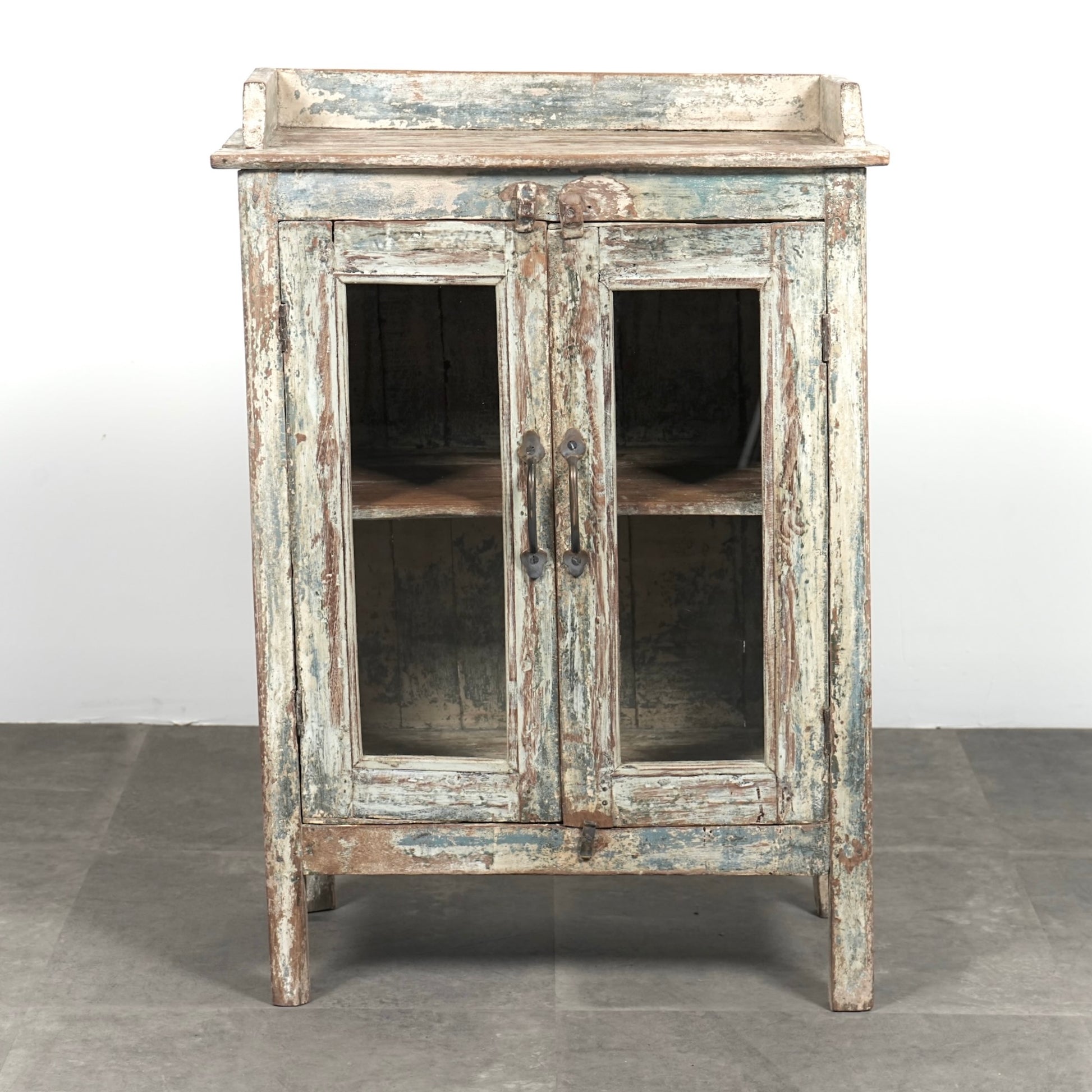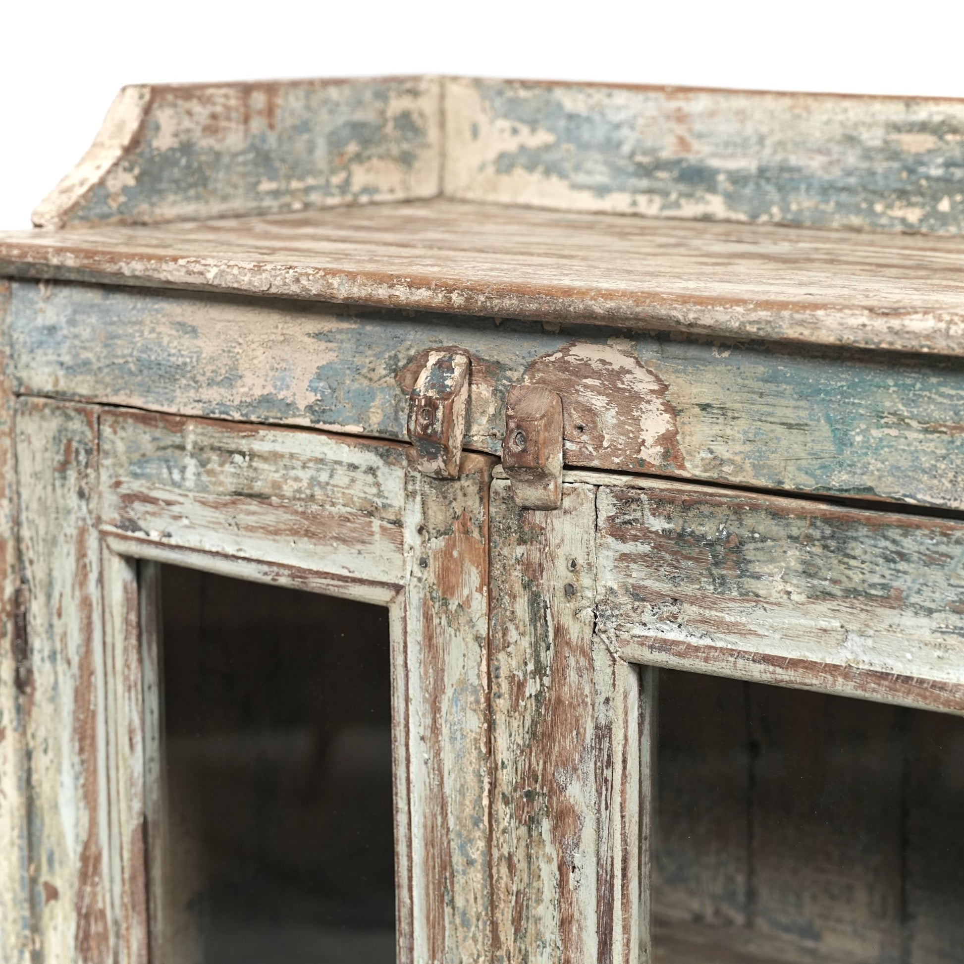 こちらのガラスキャビネットは、長い年月の中で塗り重ねられたペイントの経年変化が最大の魅力で、インドヴィンテージならではの異質な存在感を放ちます。