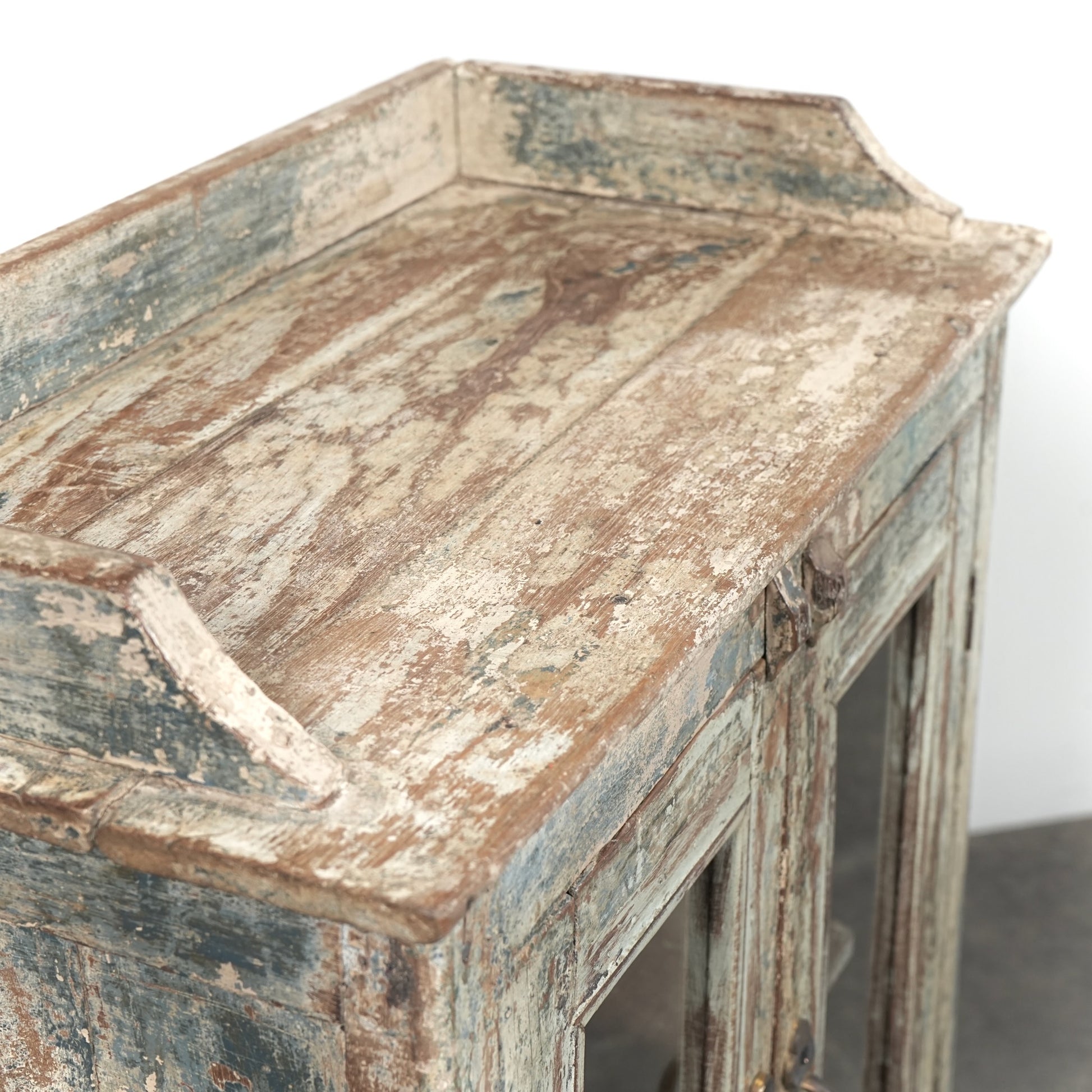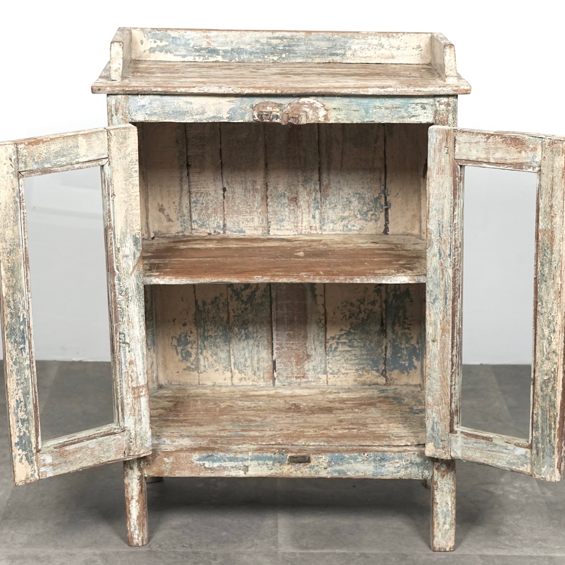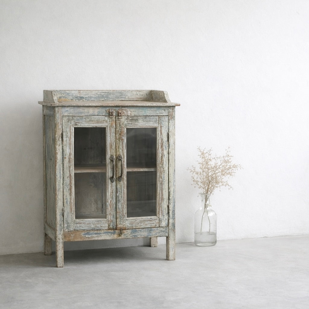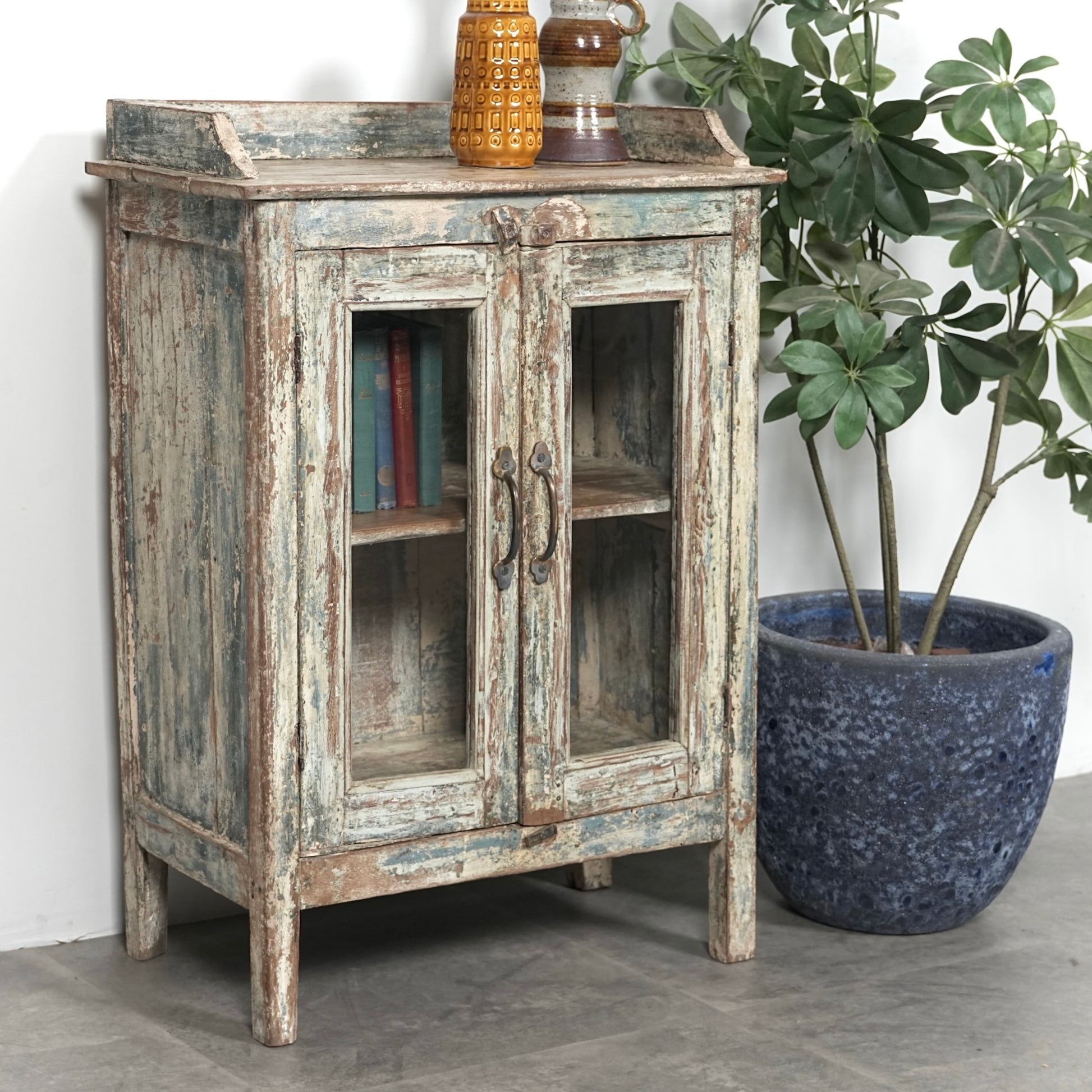 こちらのガラスキャビネットは、長い年月の中で塗り重ねられたペイントの経年変化が最大の魅力で、インドヴィンテージならではの異質な存在感を放ちます。