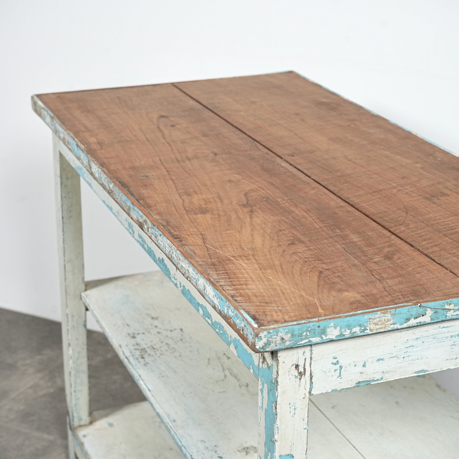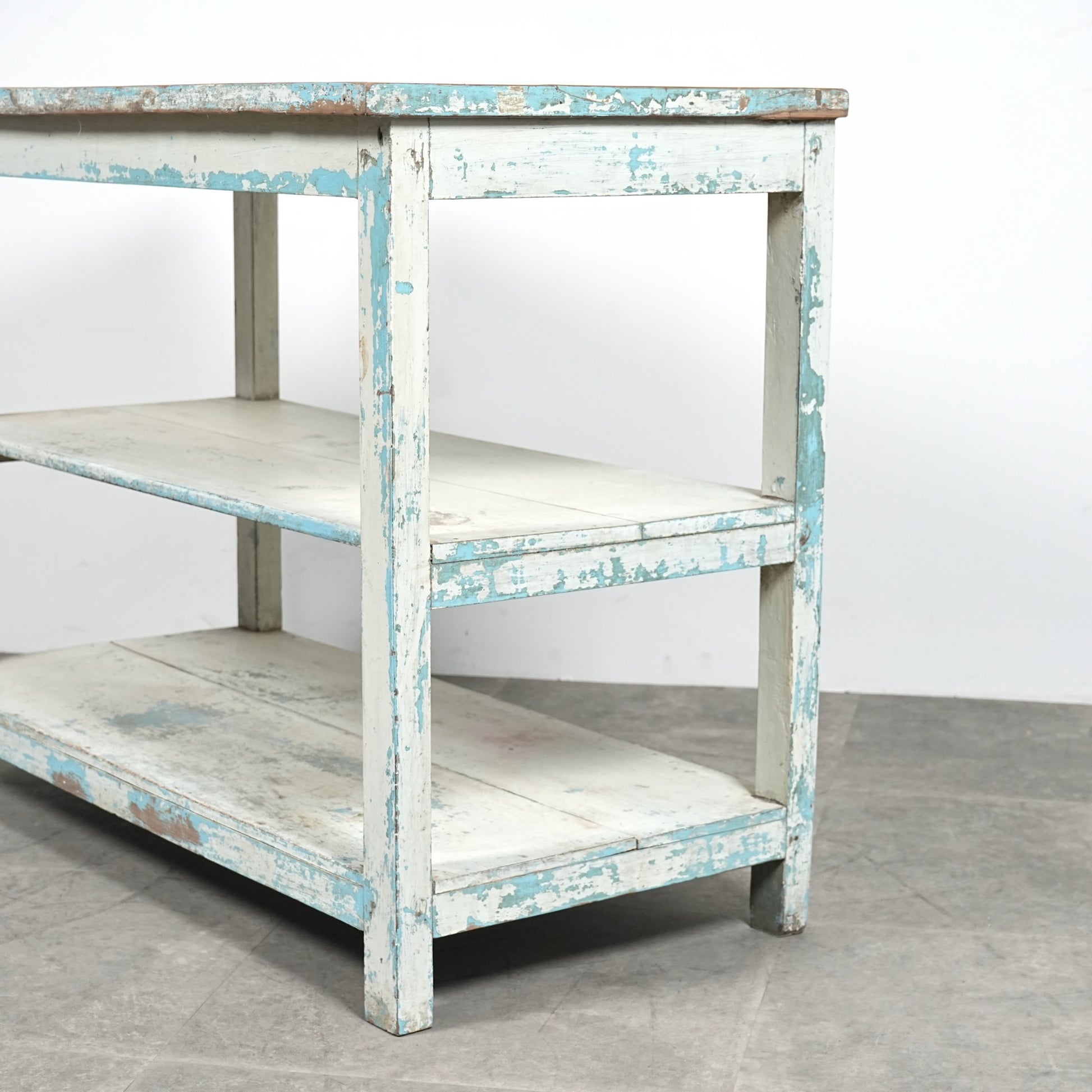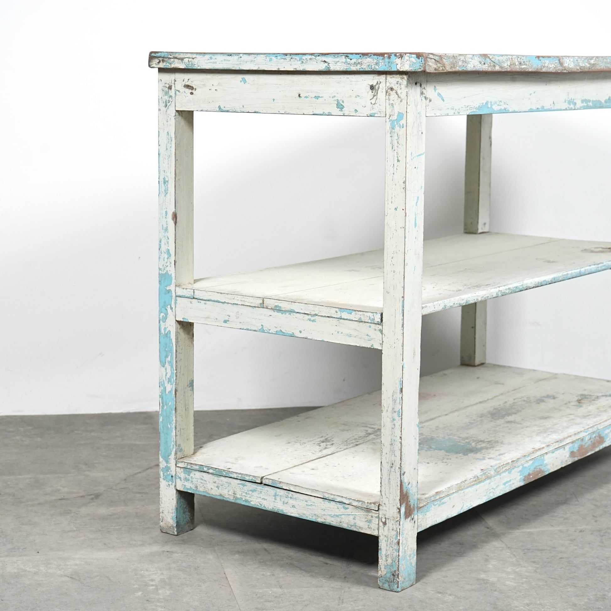 このオープンシェルフは長い年月の中で塗り重ねられたペイントの風合い&表情が見事で、天板は無垢材の木肌が現れており、そのコントラストも絶妙です。