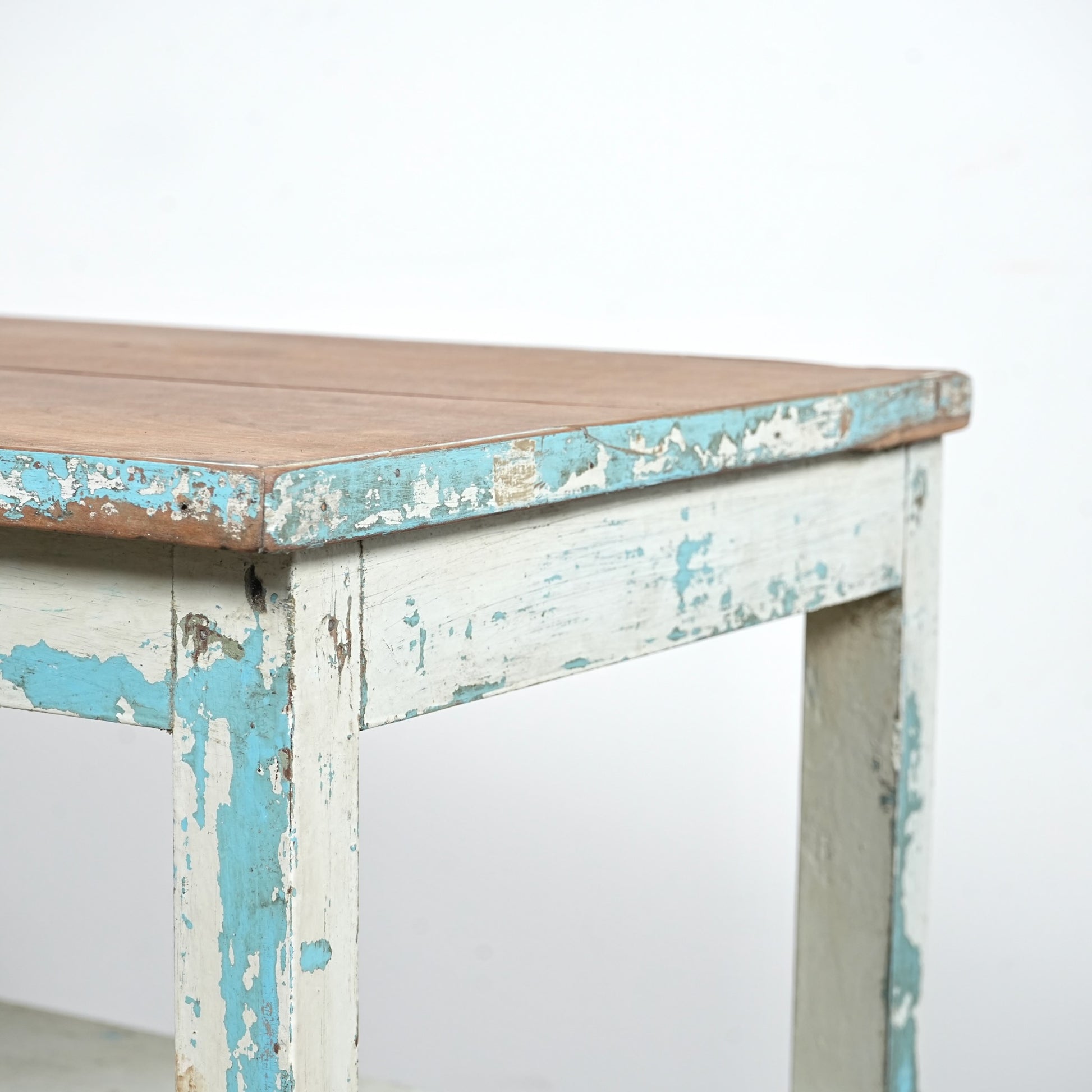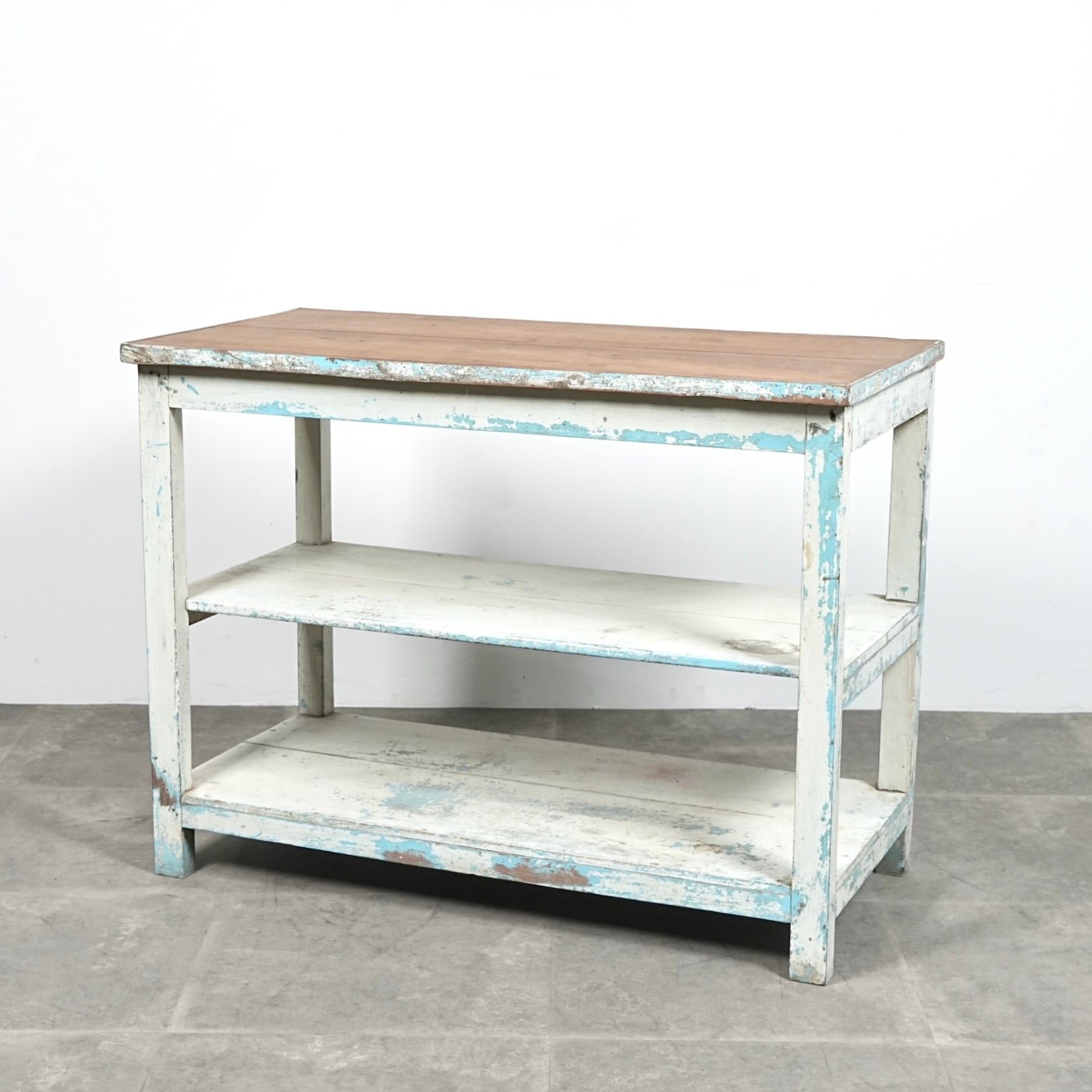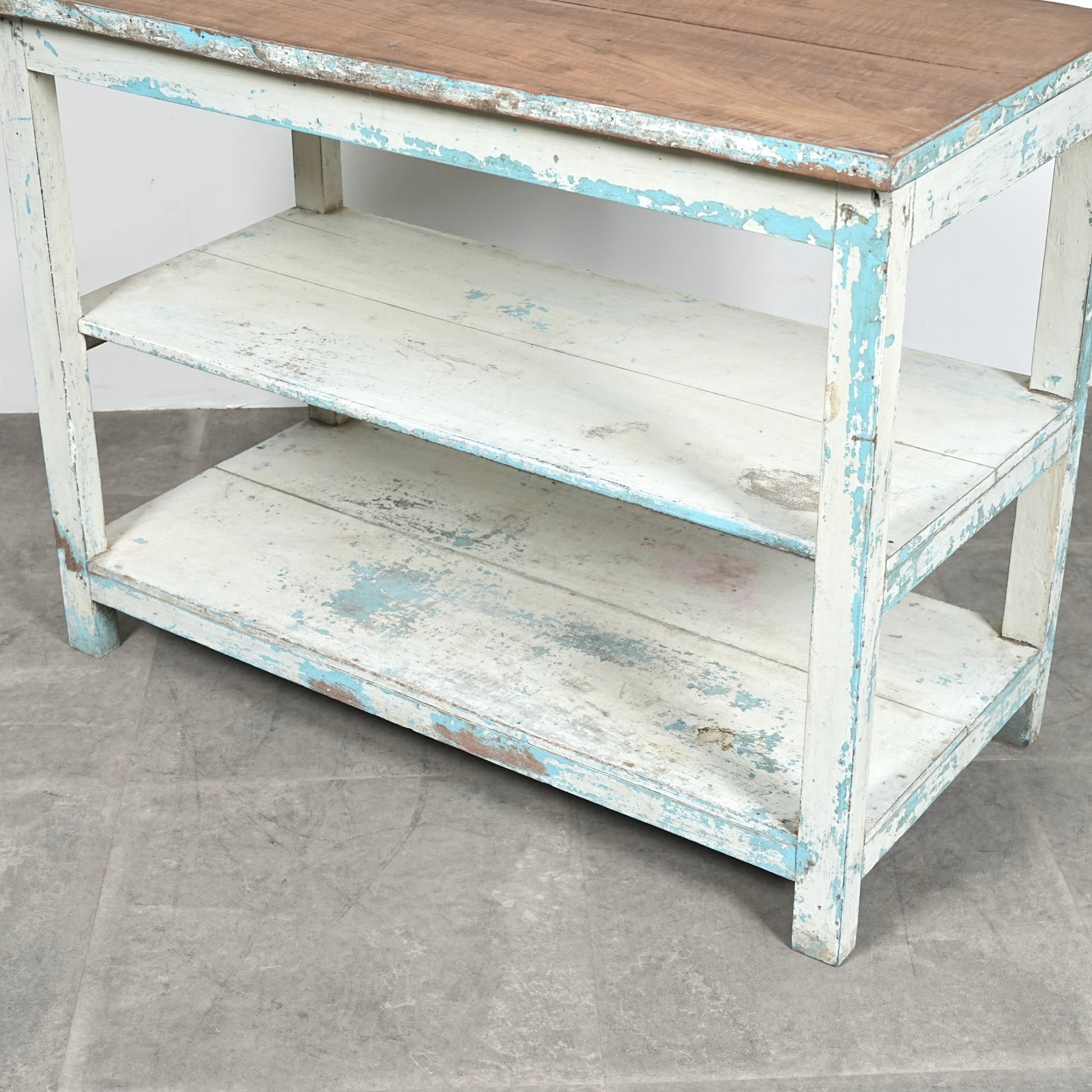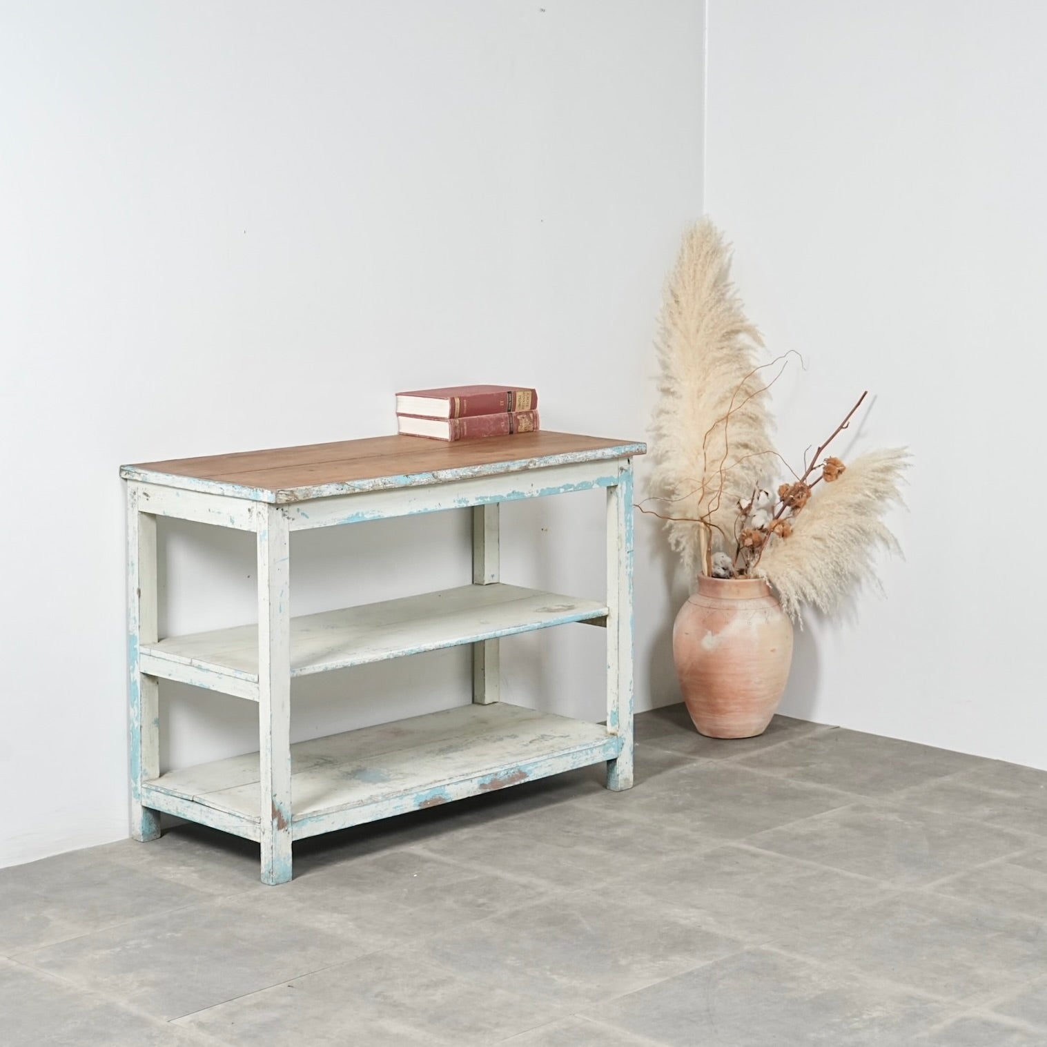 このオープンシェルフは長い年月の中で塗り重ねられたペイントの風合い&表情が見事で、天板は無垢材の木肌が現れており、そのコントラストも絶妙です。