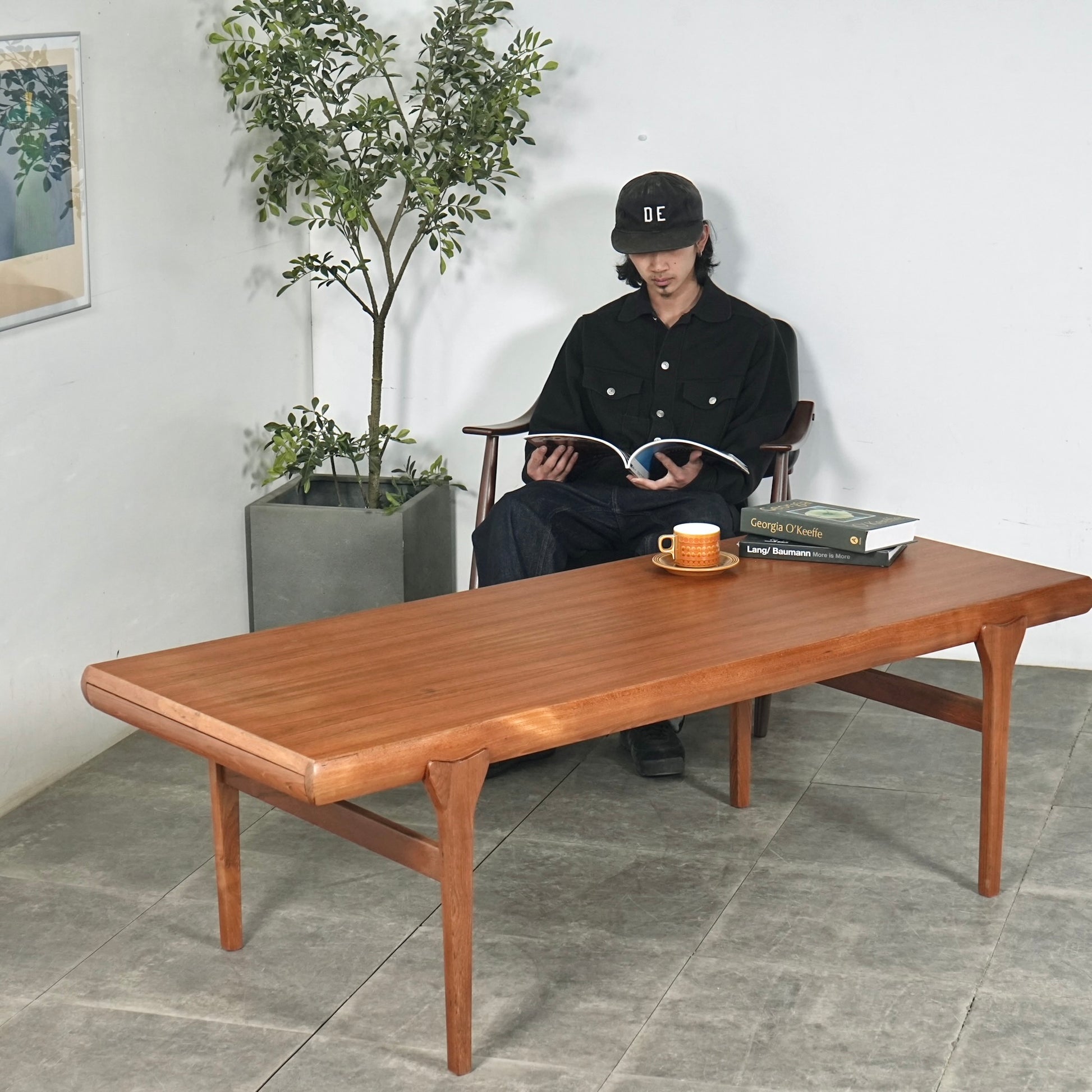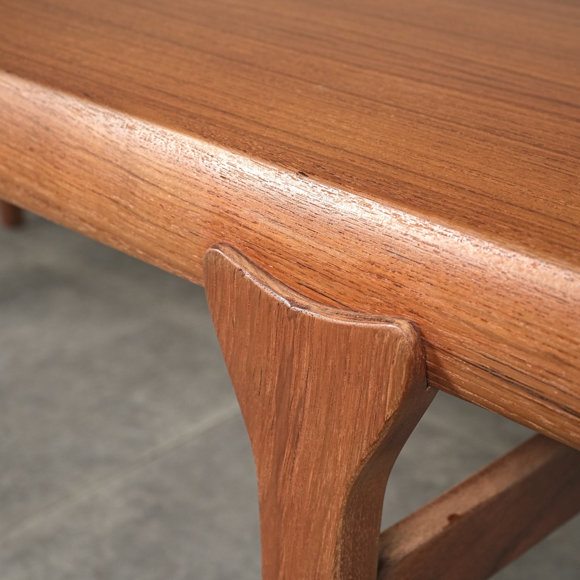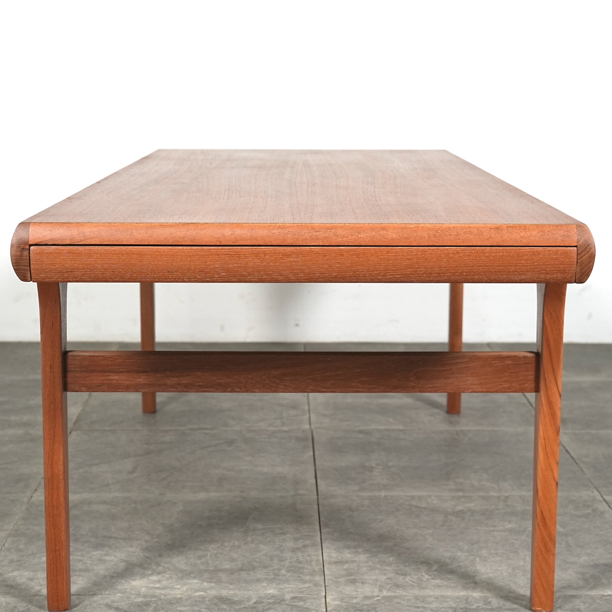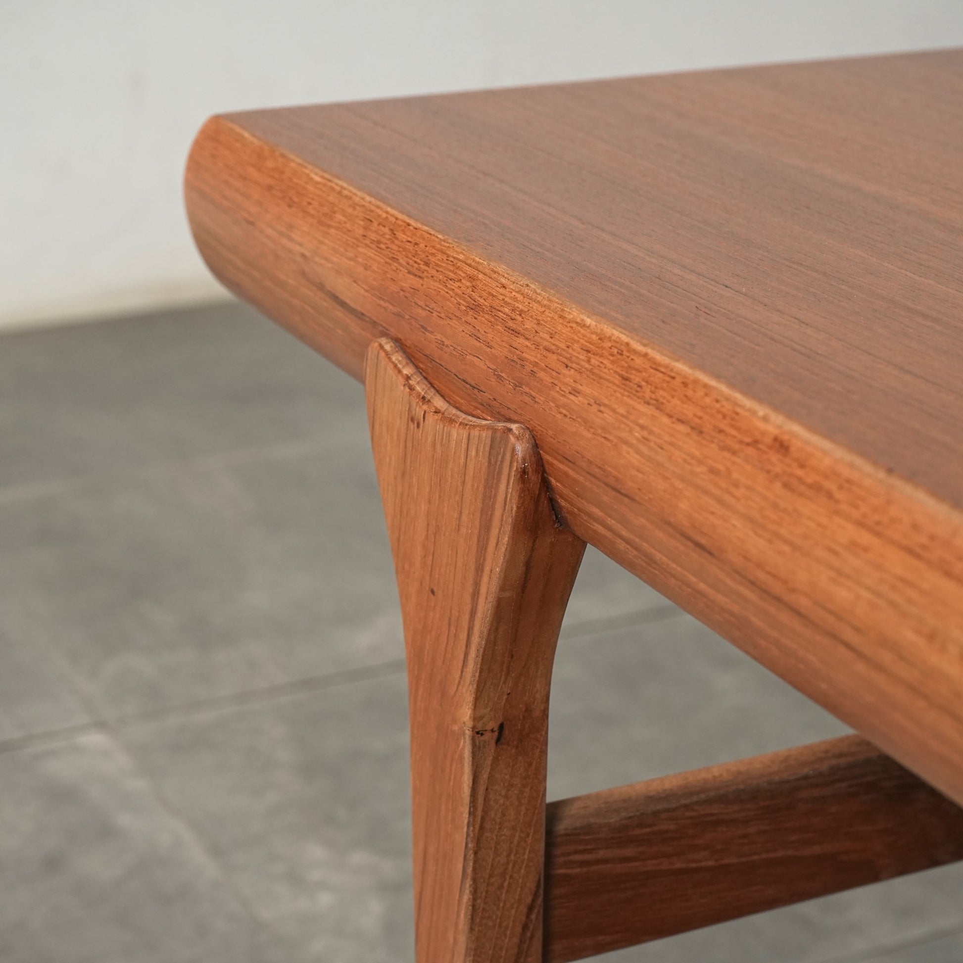 素材には上質なチーク材が使用され、天板の柔らかな丸みや細身の脚部、そしてユニークかつ美しい接合など、北欧デザインらしい洗練された佇まいが魅力の一台です。