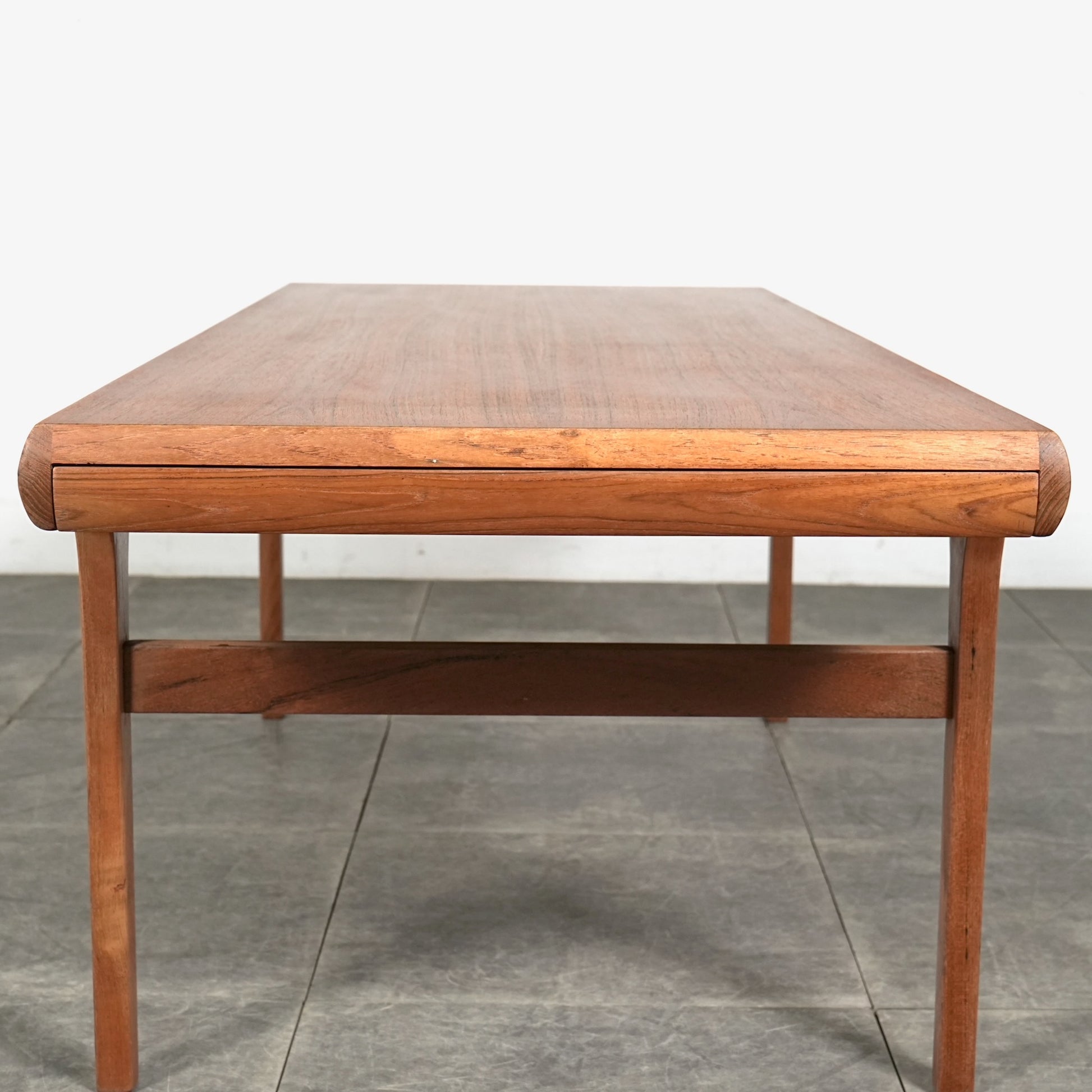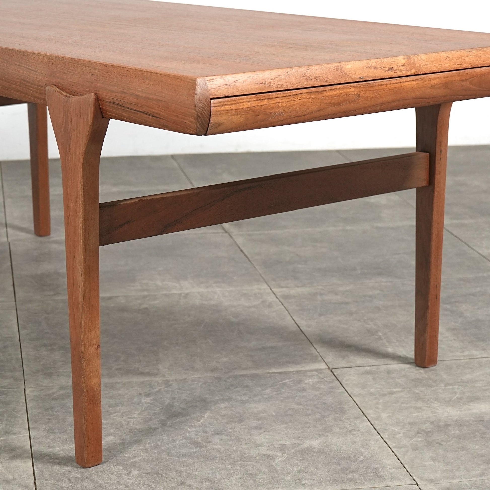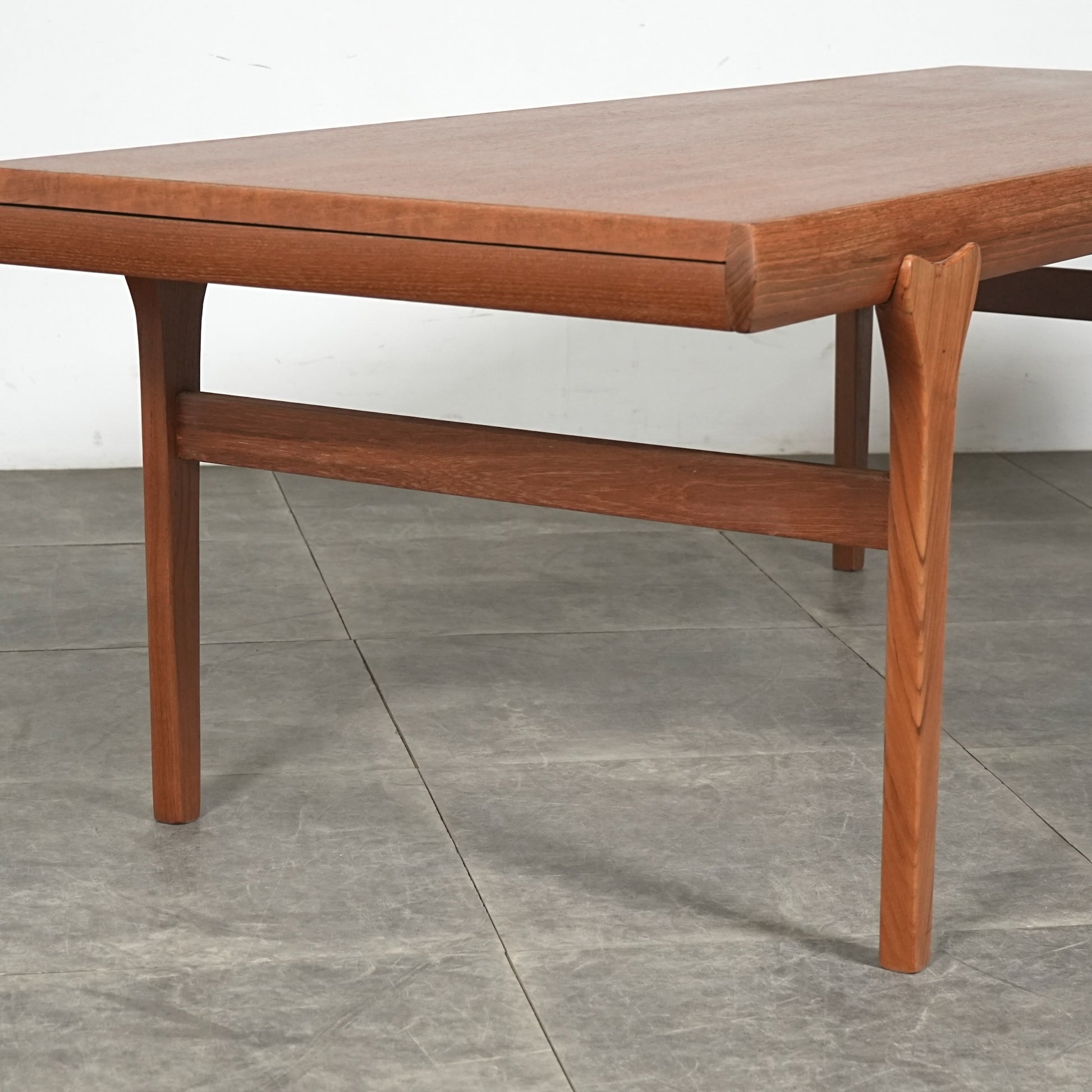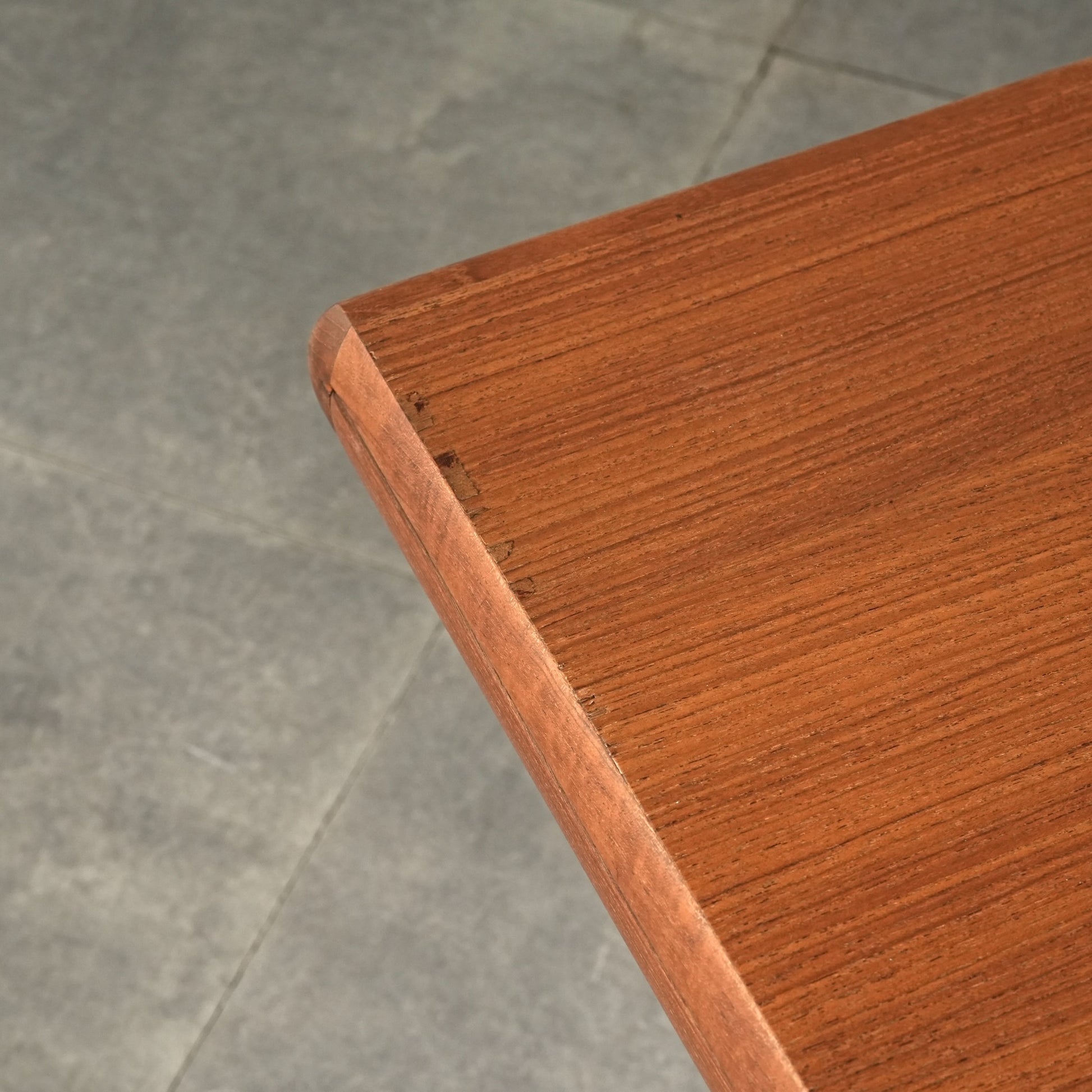 素材には上質なチーク材が使用され、天板の柔らかな丸みや細身の脚部、そしてユニークかつ美しい接合など、北欧デザインらしい洗練された佇まいが魅力の一台です。