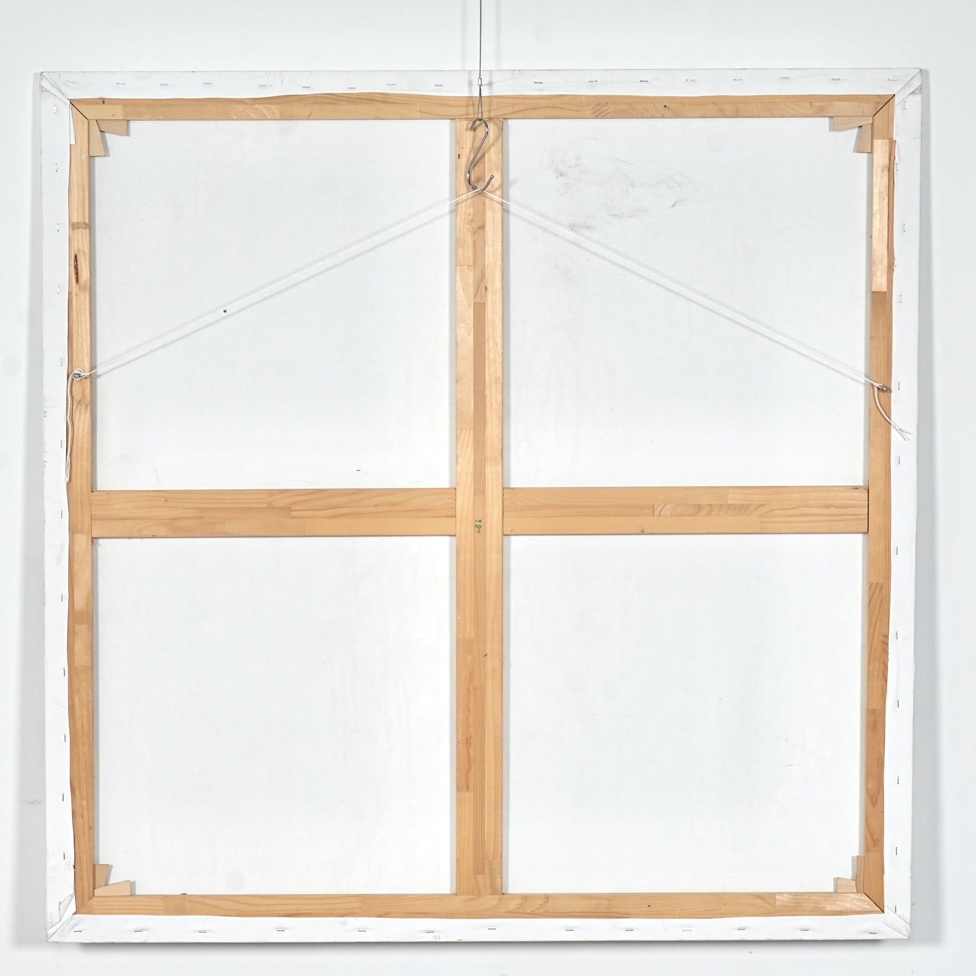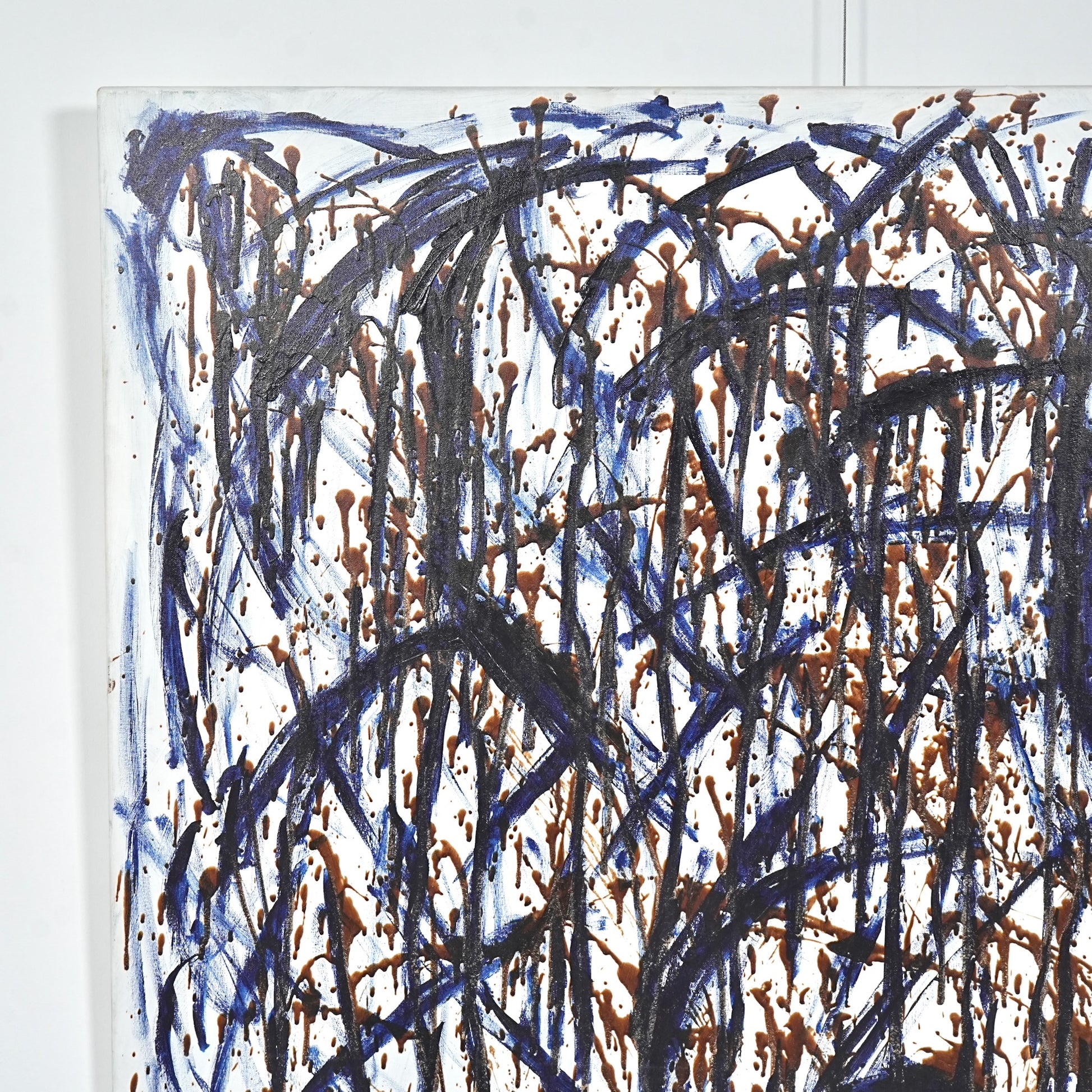 120cm×120cmという特大サイズのキャンバスの上に、ブルーとブラウンのペイントが勢いよく重なり合う、力強くも繊細なバランスが印象的な一枚です。