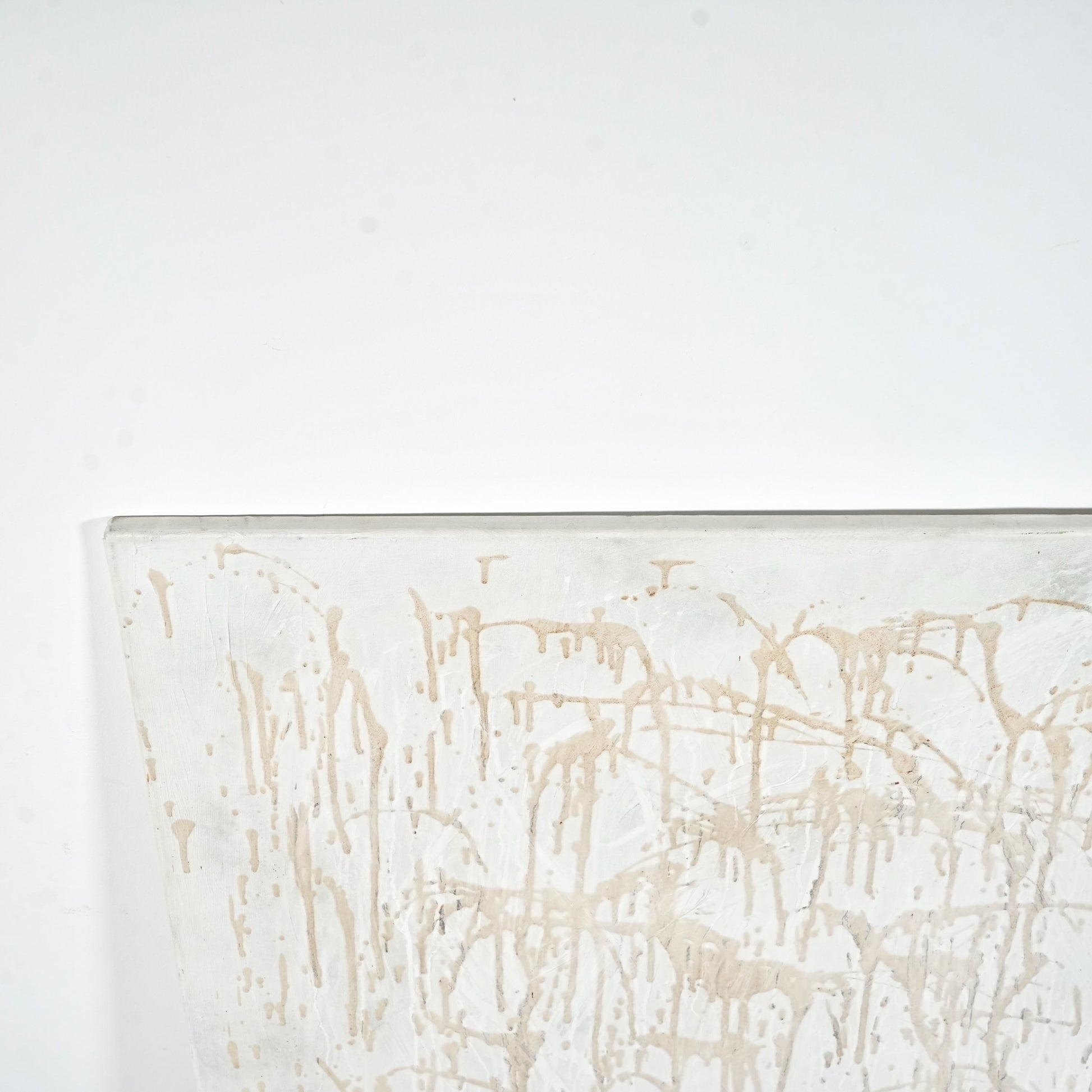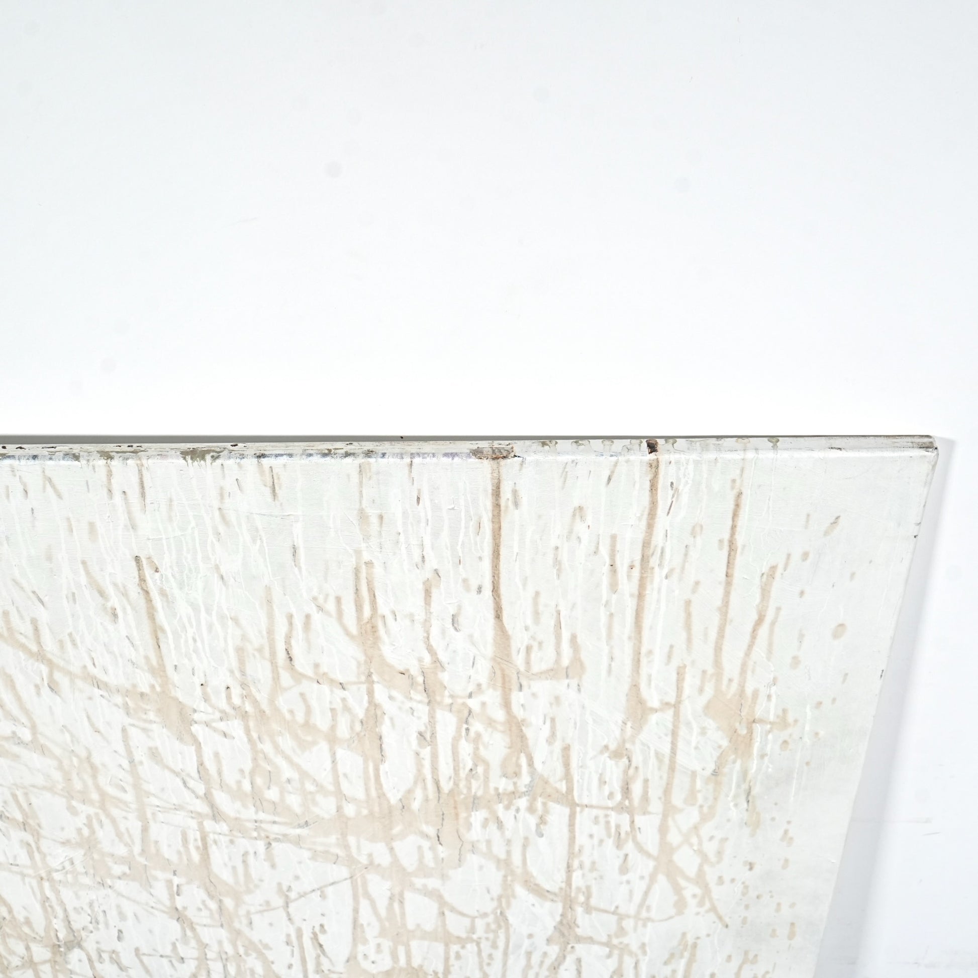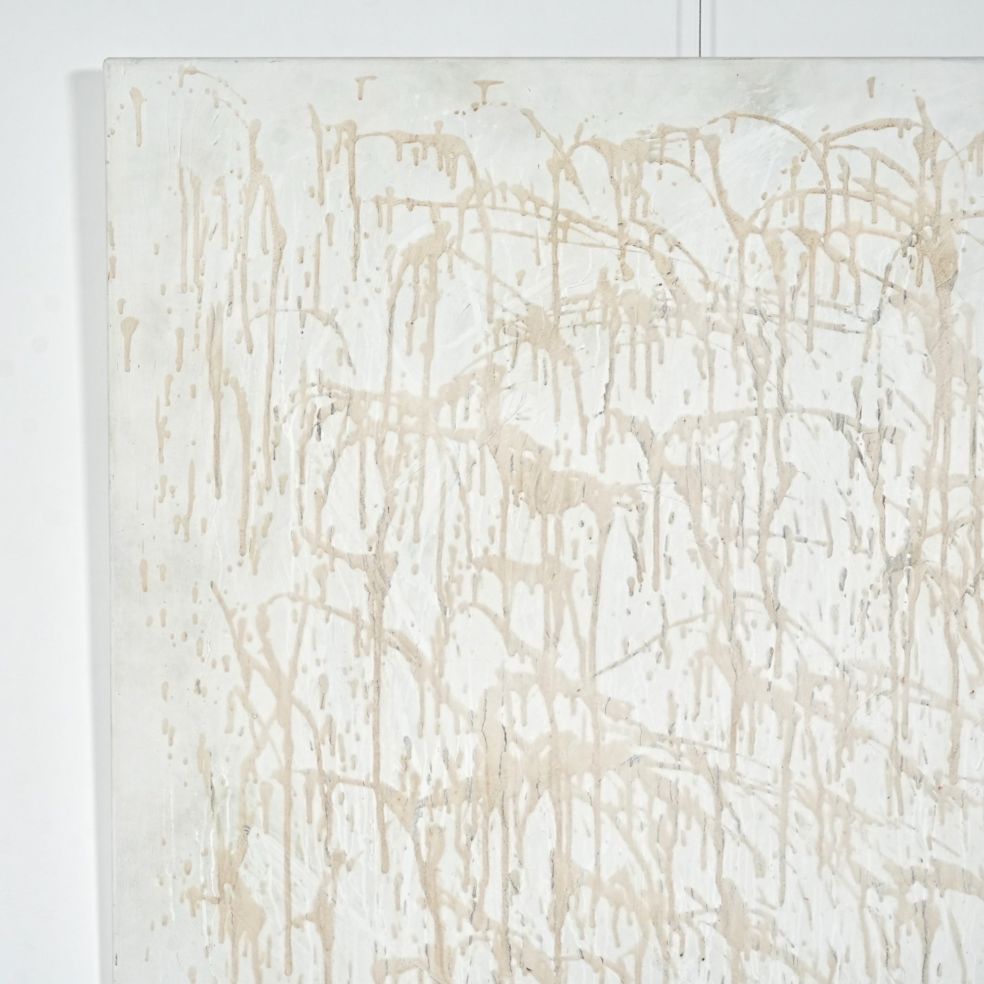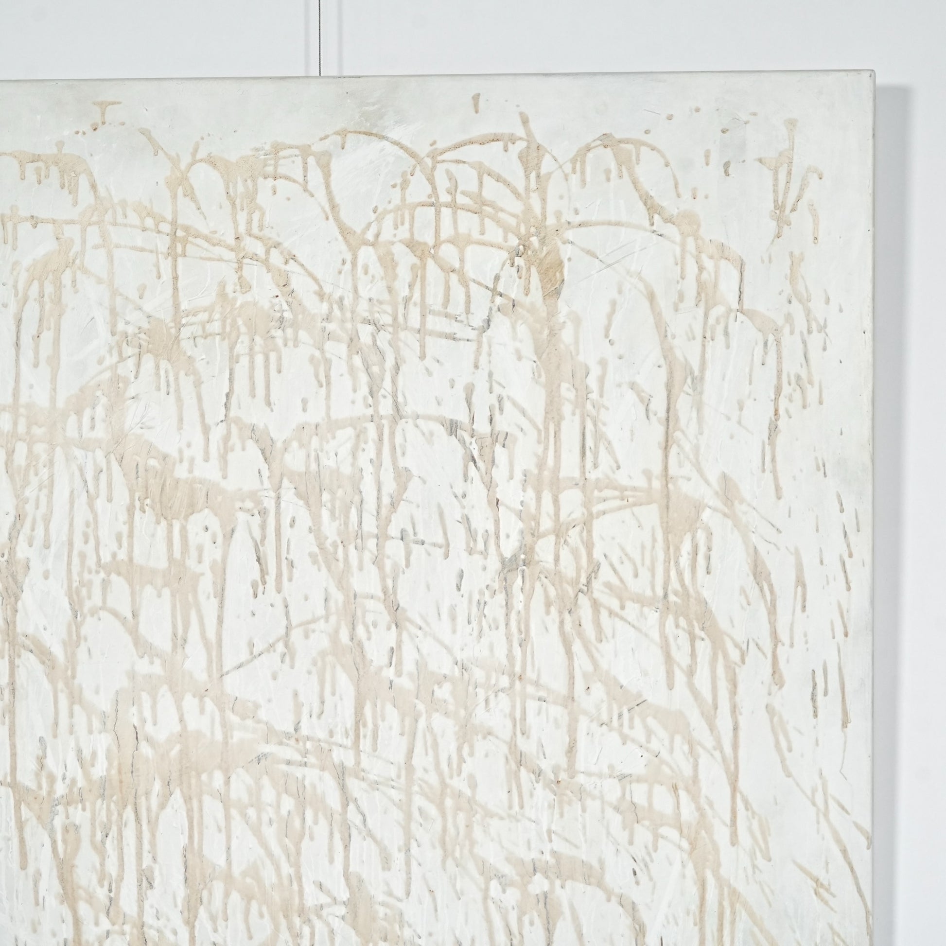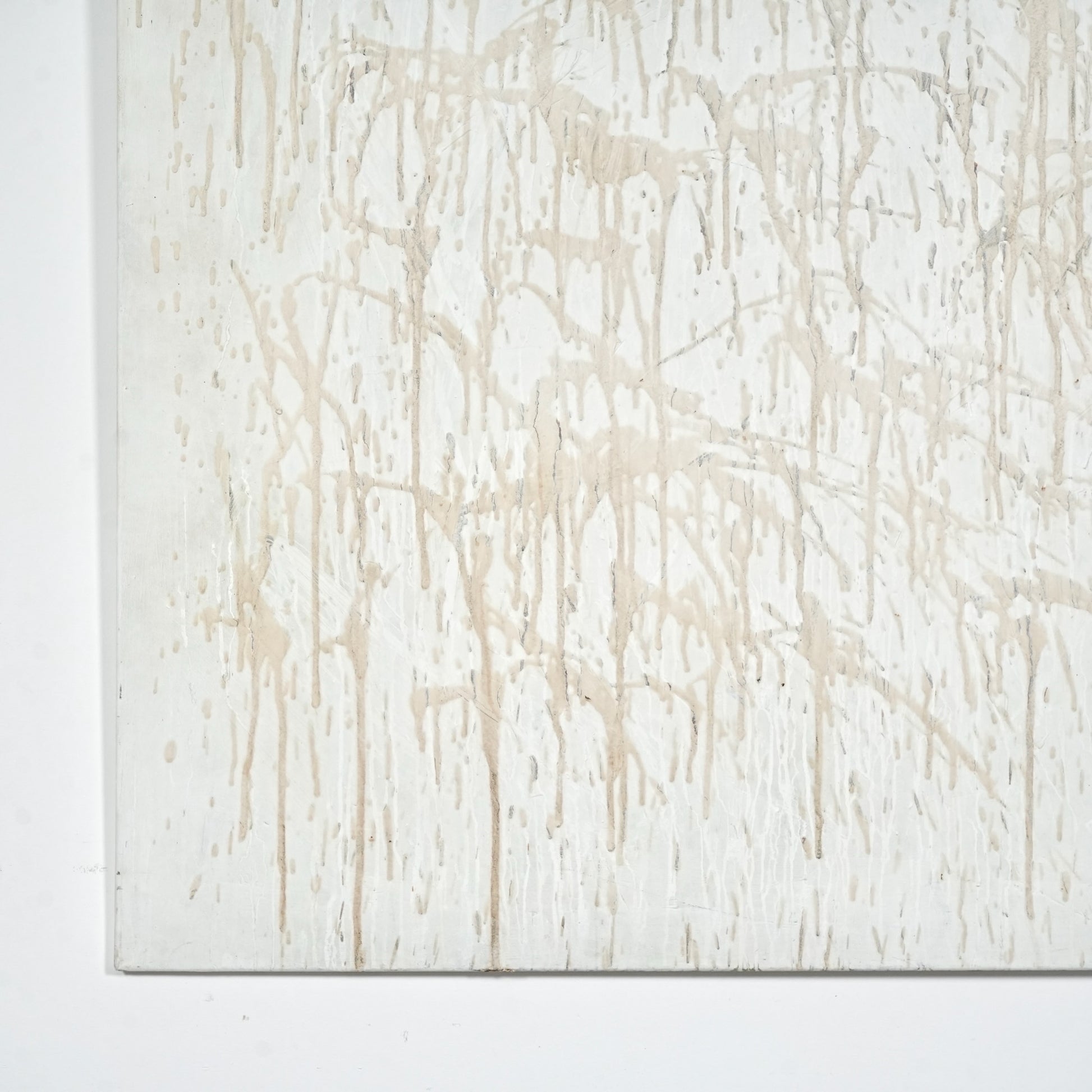 120cm×120cmという特大サイズのキャンバスの上に、淡いトーンの中に垂れ落ちるようなストロークが重なり合い、静けさと動きを同時に感じさせる抽象作品。
