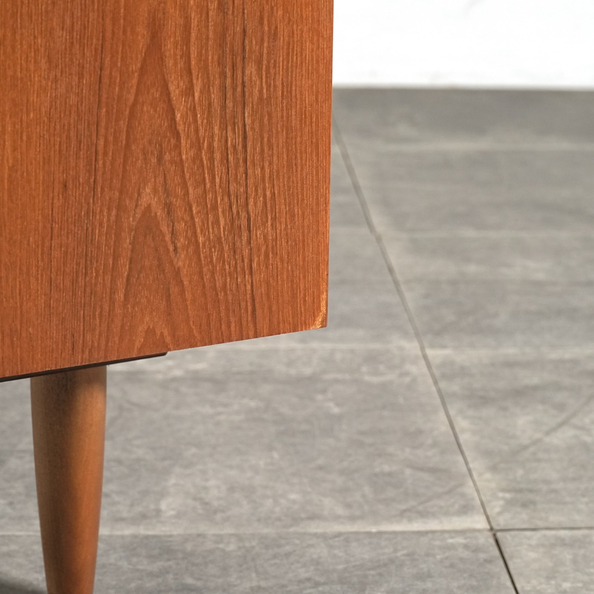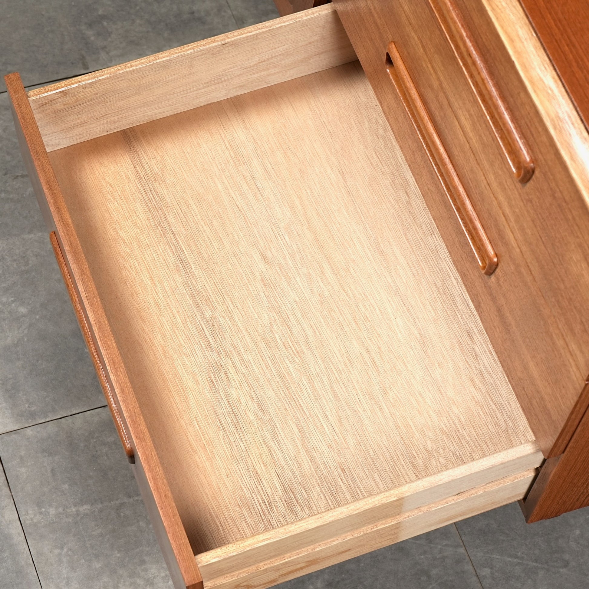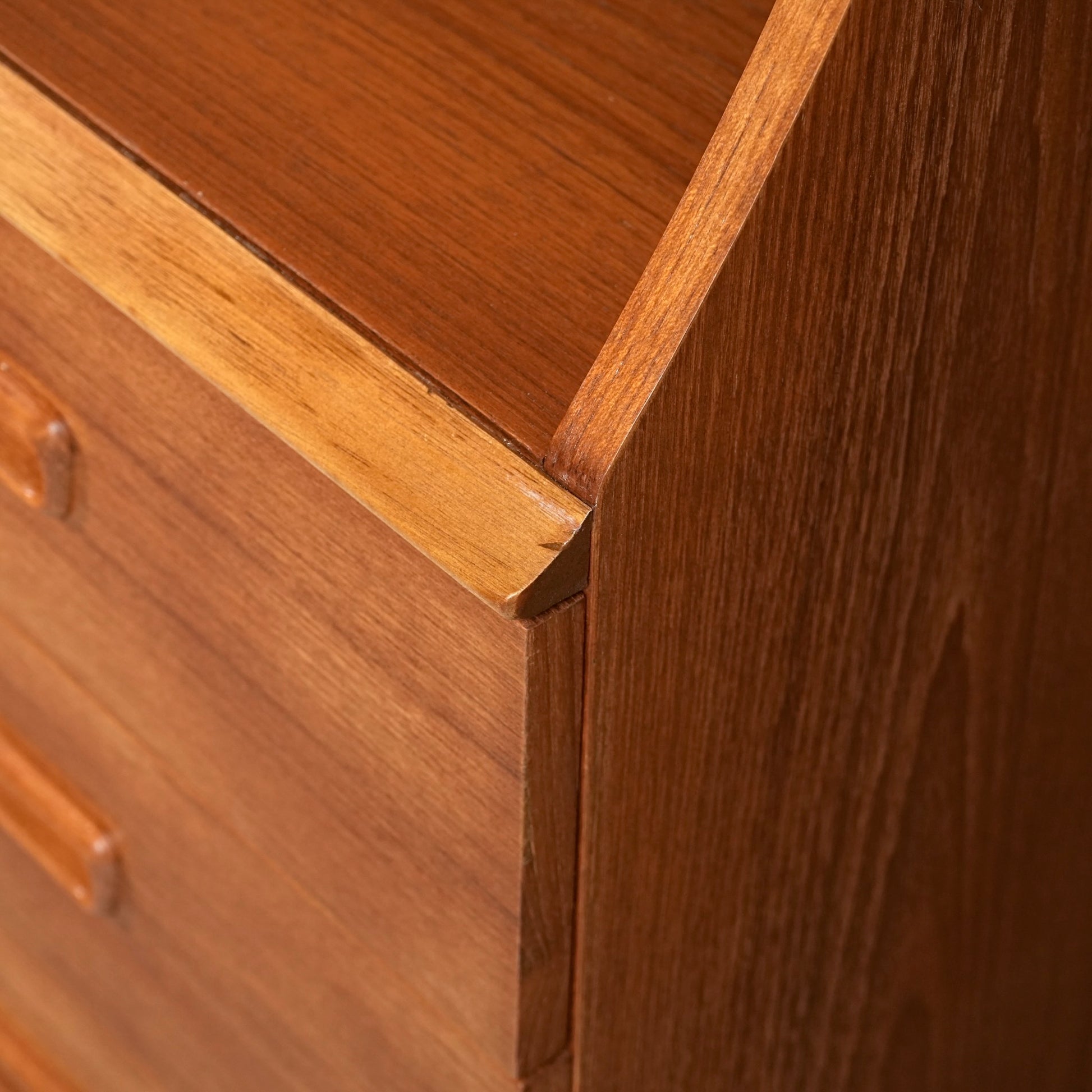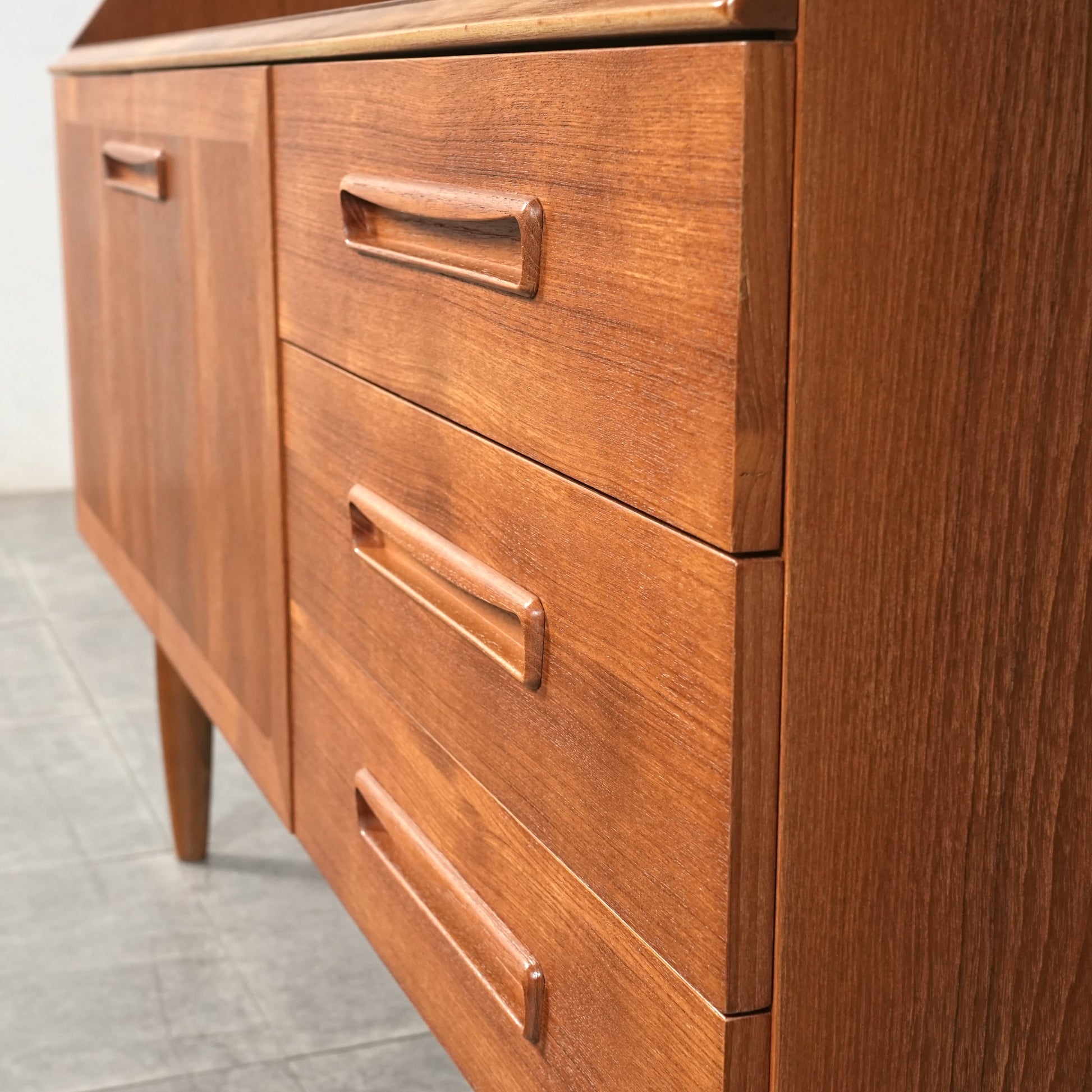 デンマークをはじめとする北欧デザインの影響を感じさせる見事なデザインで、良質なチーク材の質感と削り出しで作られた可愛らしい取手も魅力的。