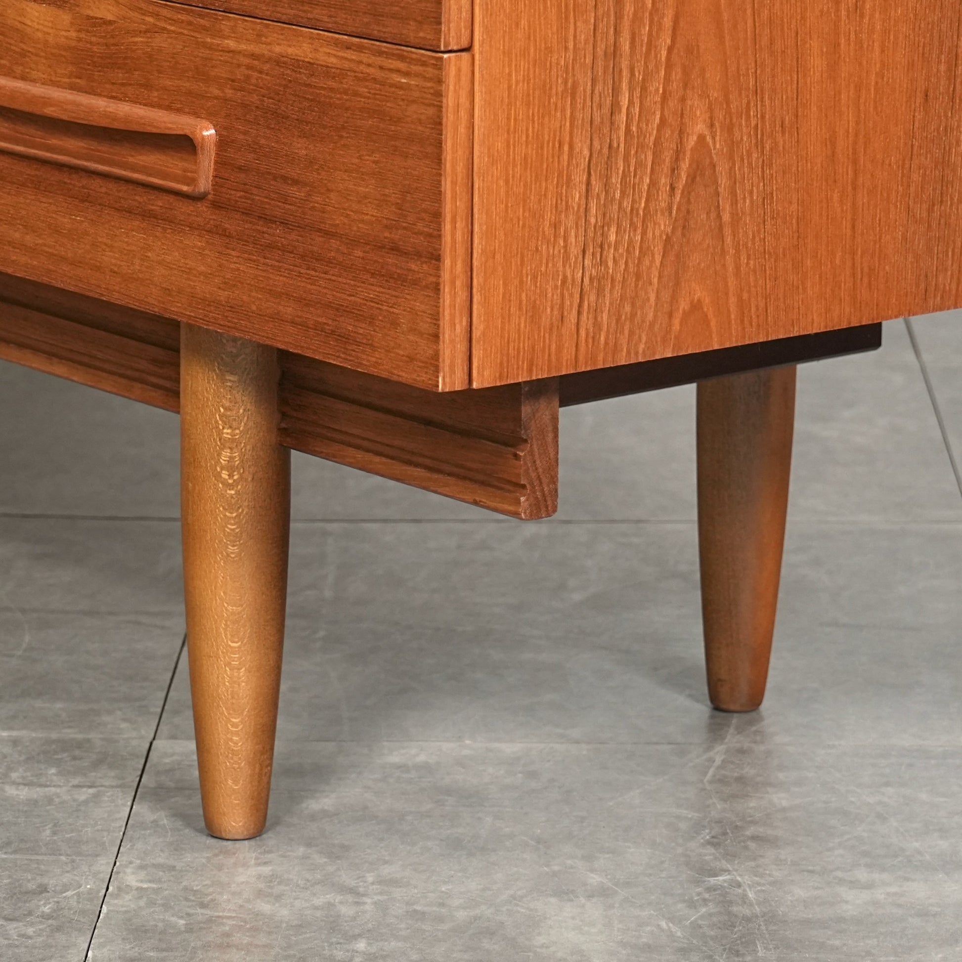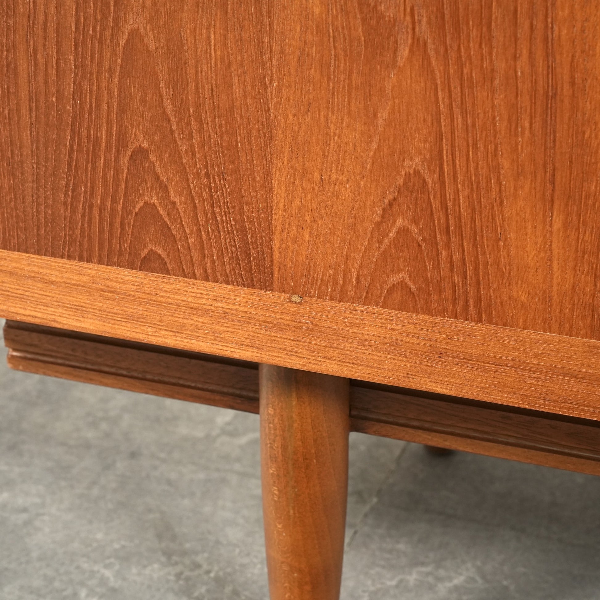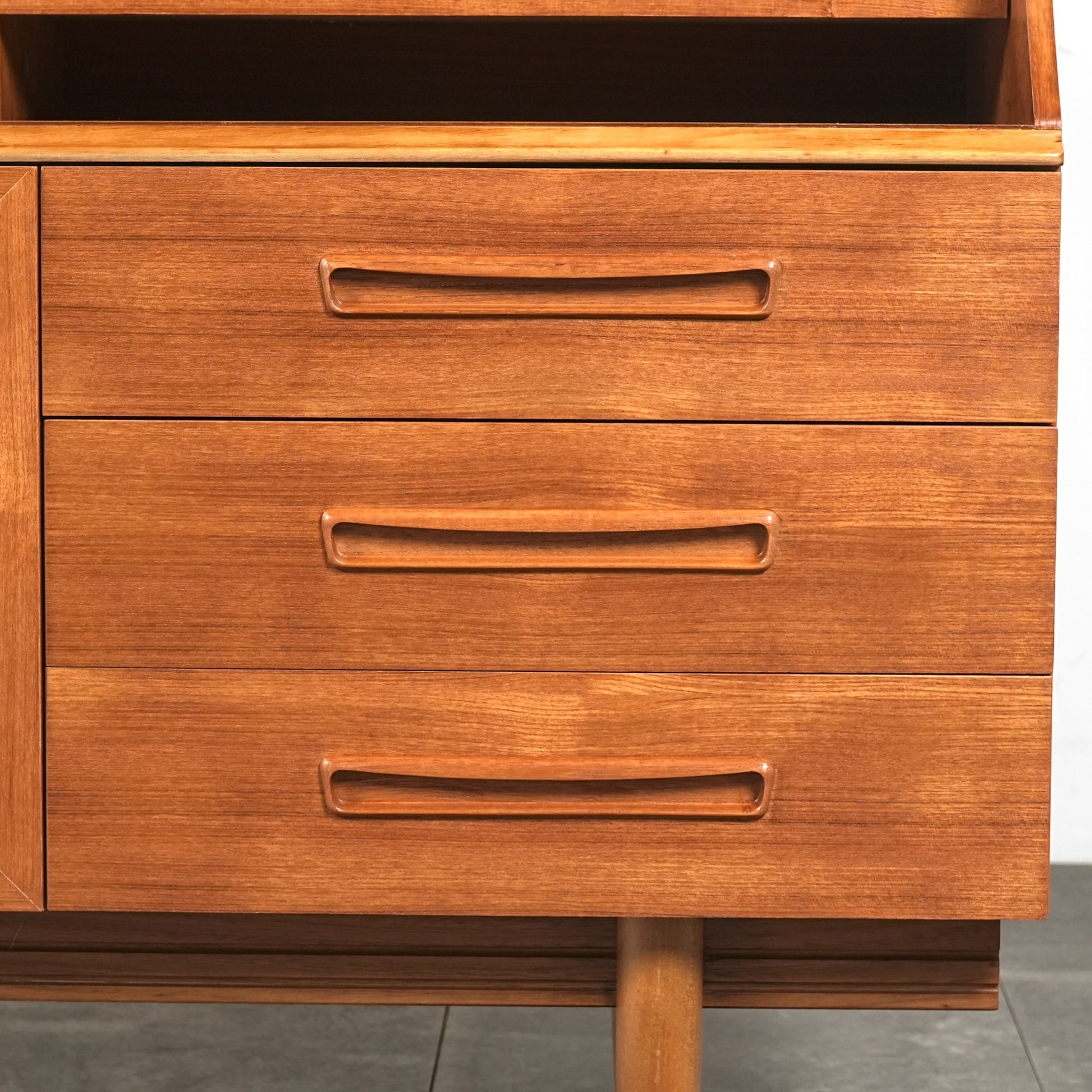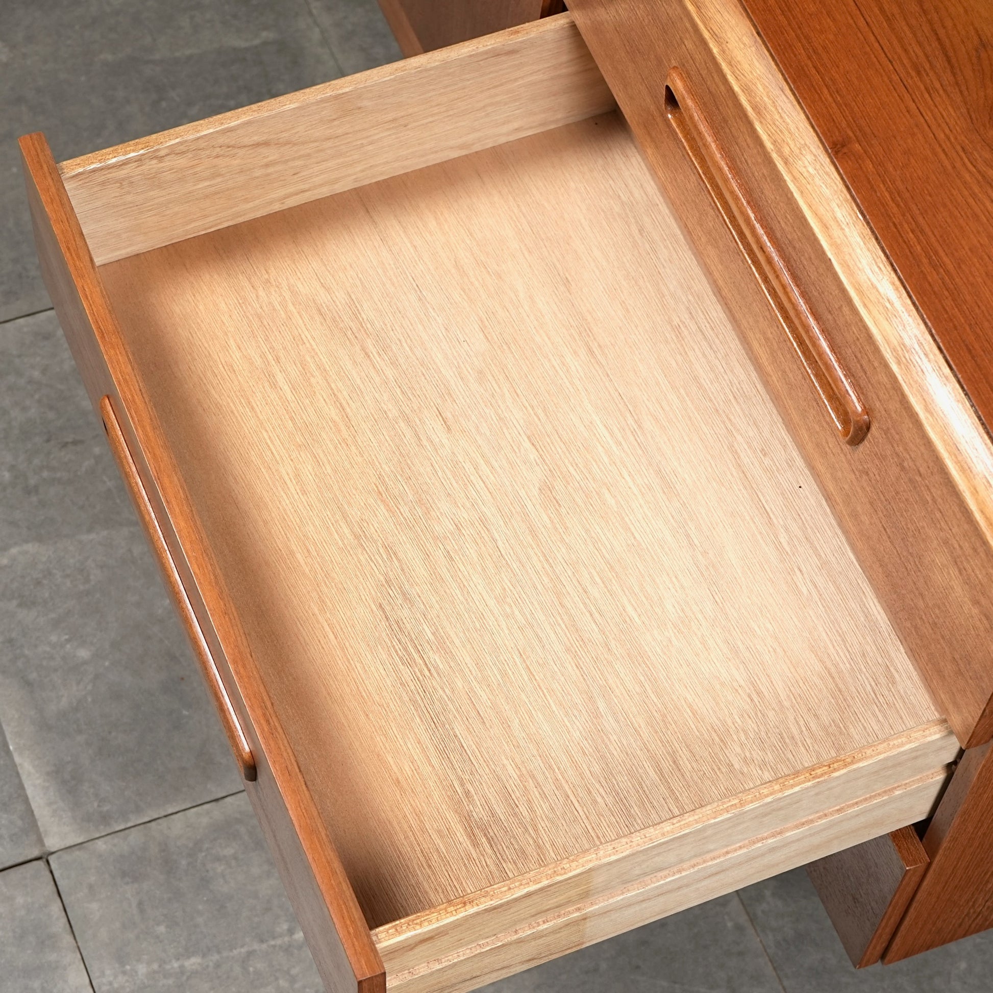 デンマークをはじめとする北欧デザインの影響を感じさせる見事なデザインで、良質なチーク材の質感と削り出しで作られた可愛らしい取手も魅力的。