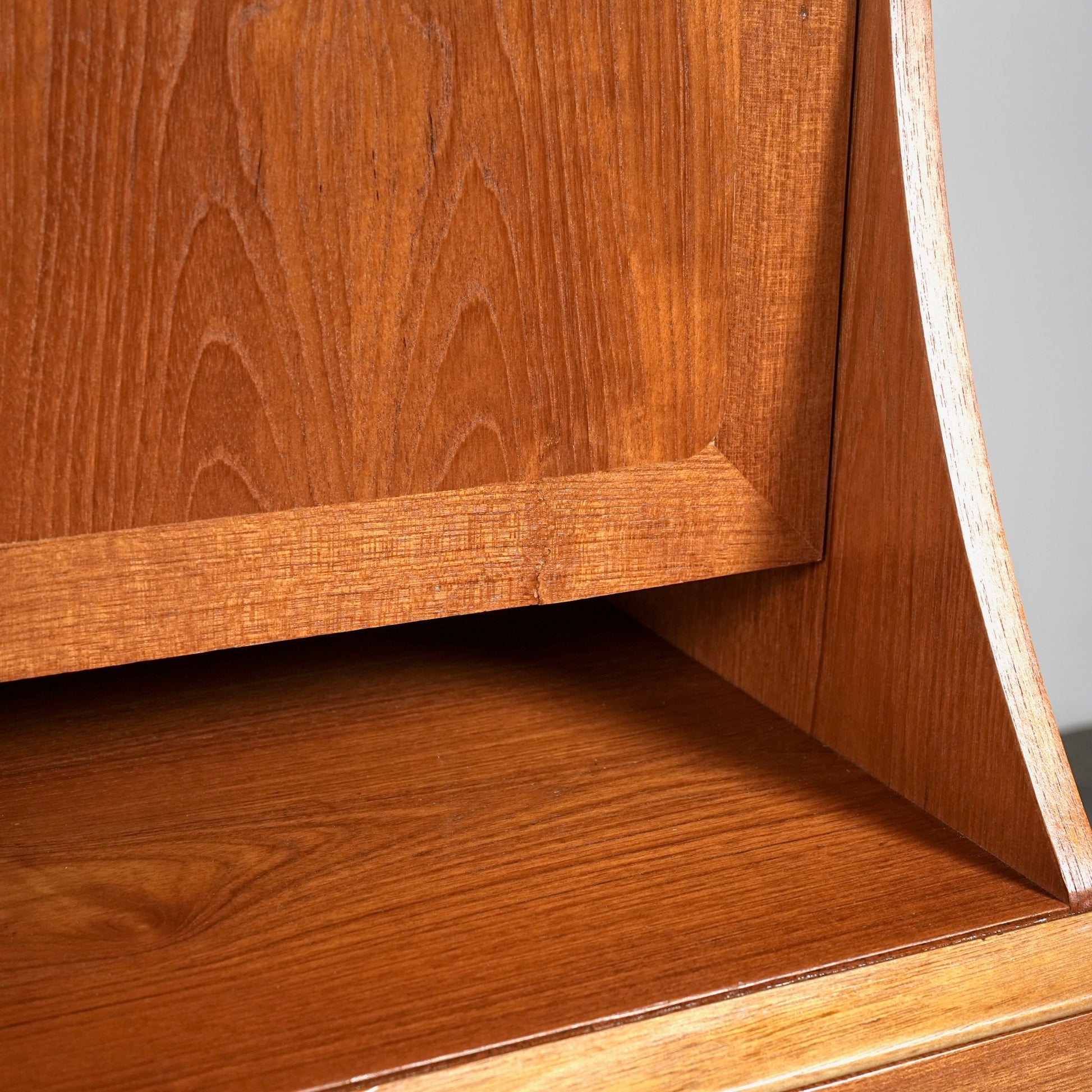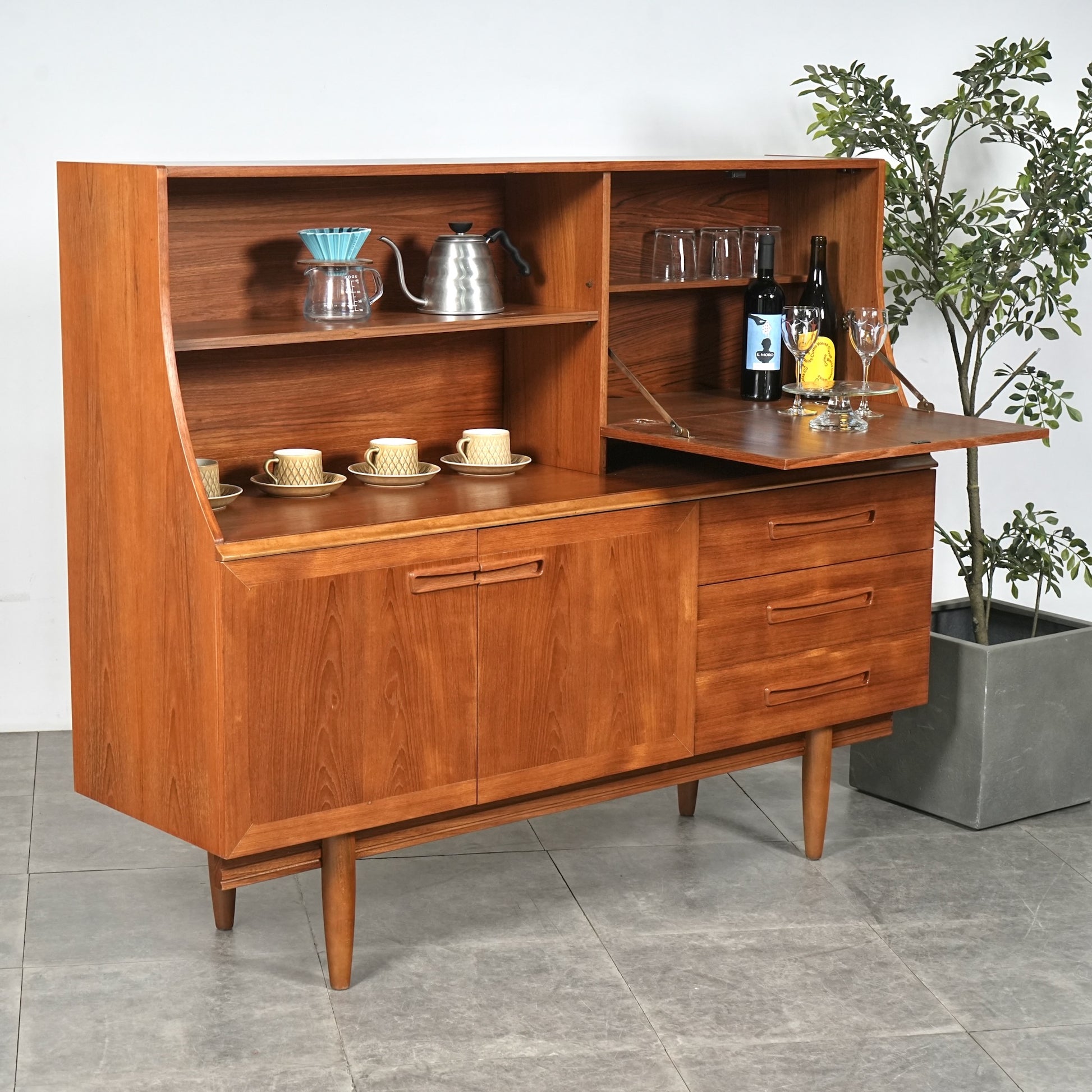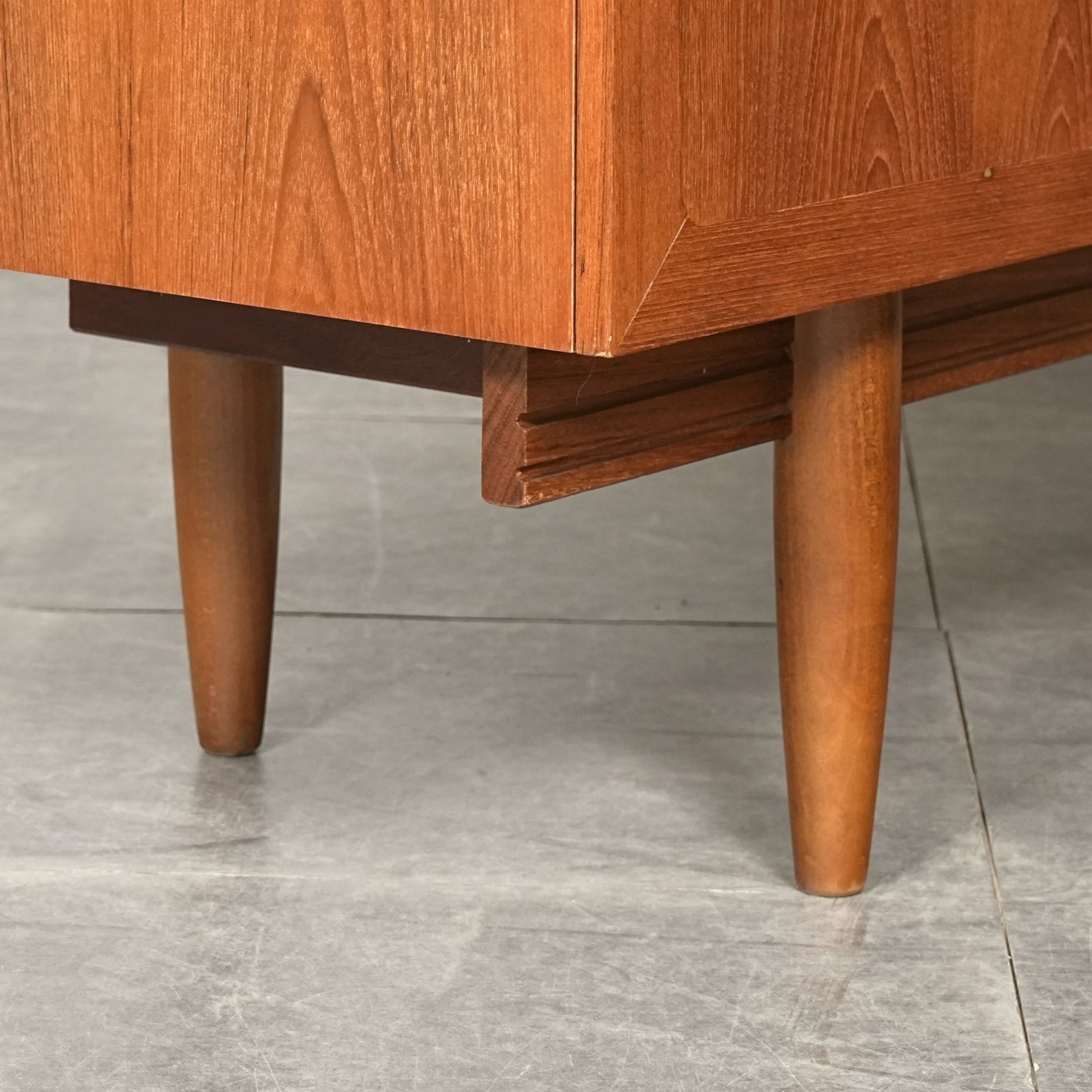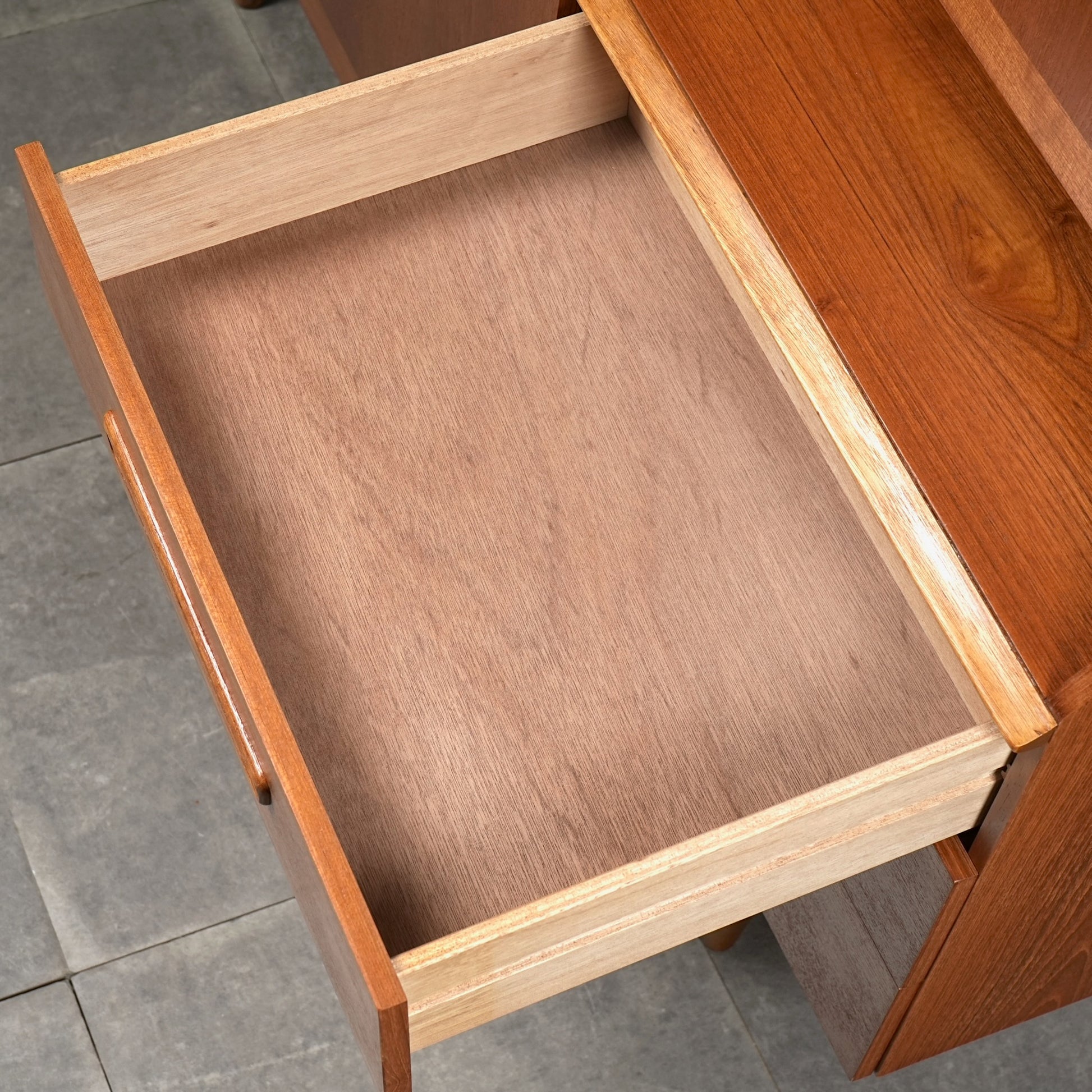 デンマークをはじめとする北欧デザインの影響を感じさせる見事なデザインで、良質なチーク材の質感と削り出しで作られた可愛らしい取手も魅力的。