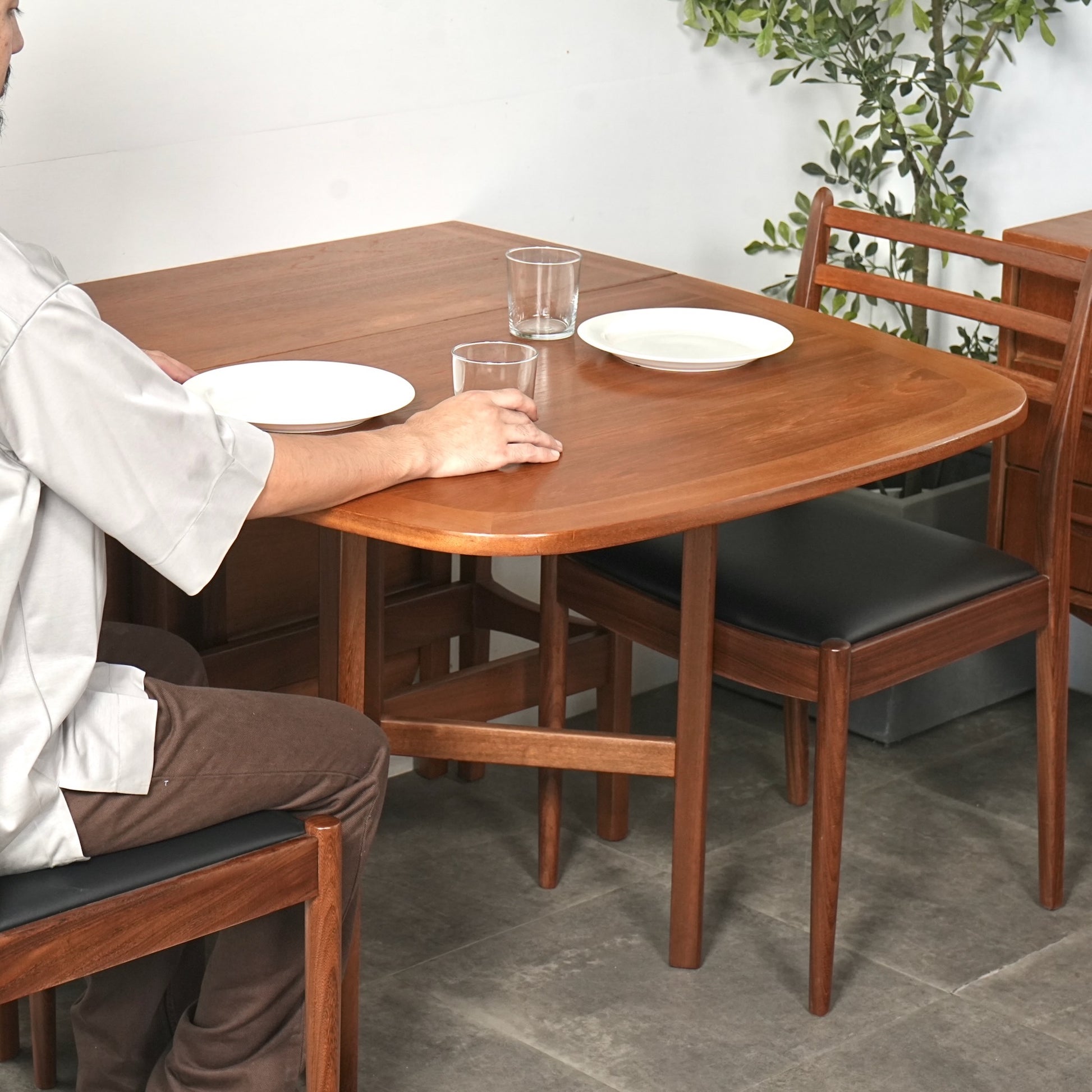1〜2人暮らしの方にぴったりのアイテムで、普段は片側だけ開いて壁付けでお使い頂き、来客時は拡張して4人でお使い頂けます。