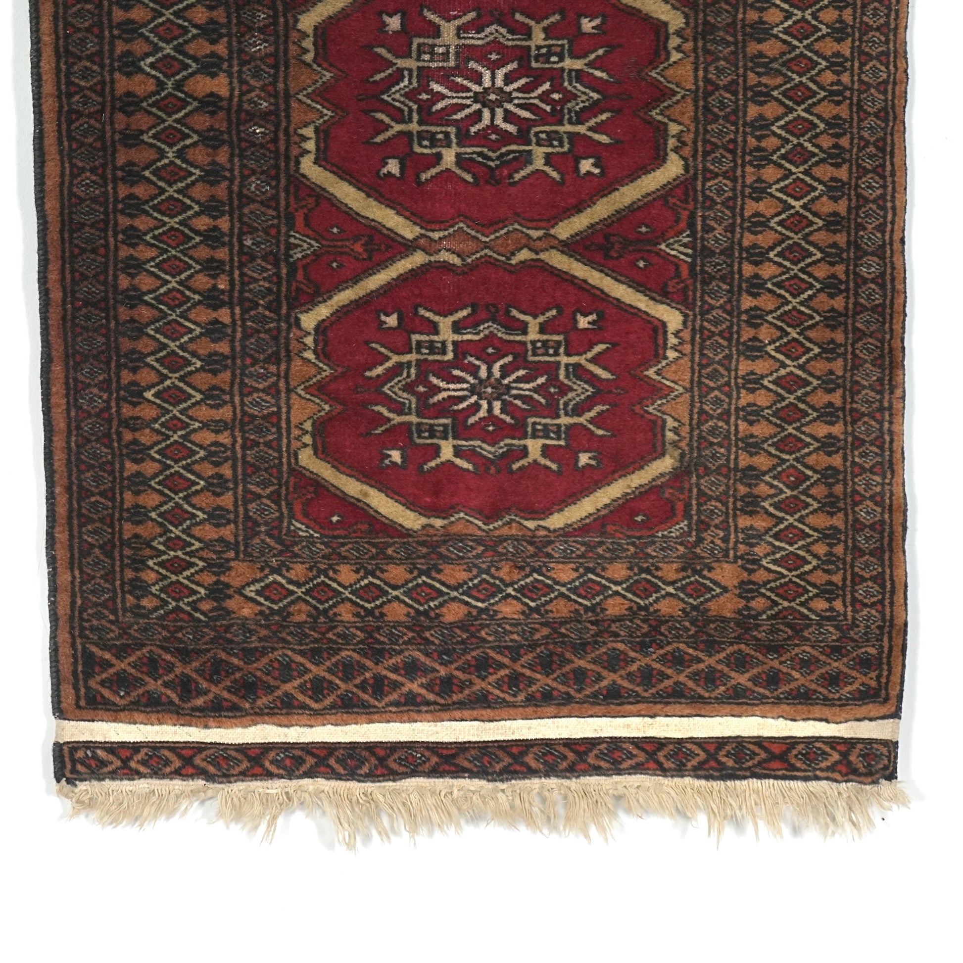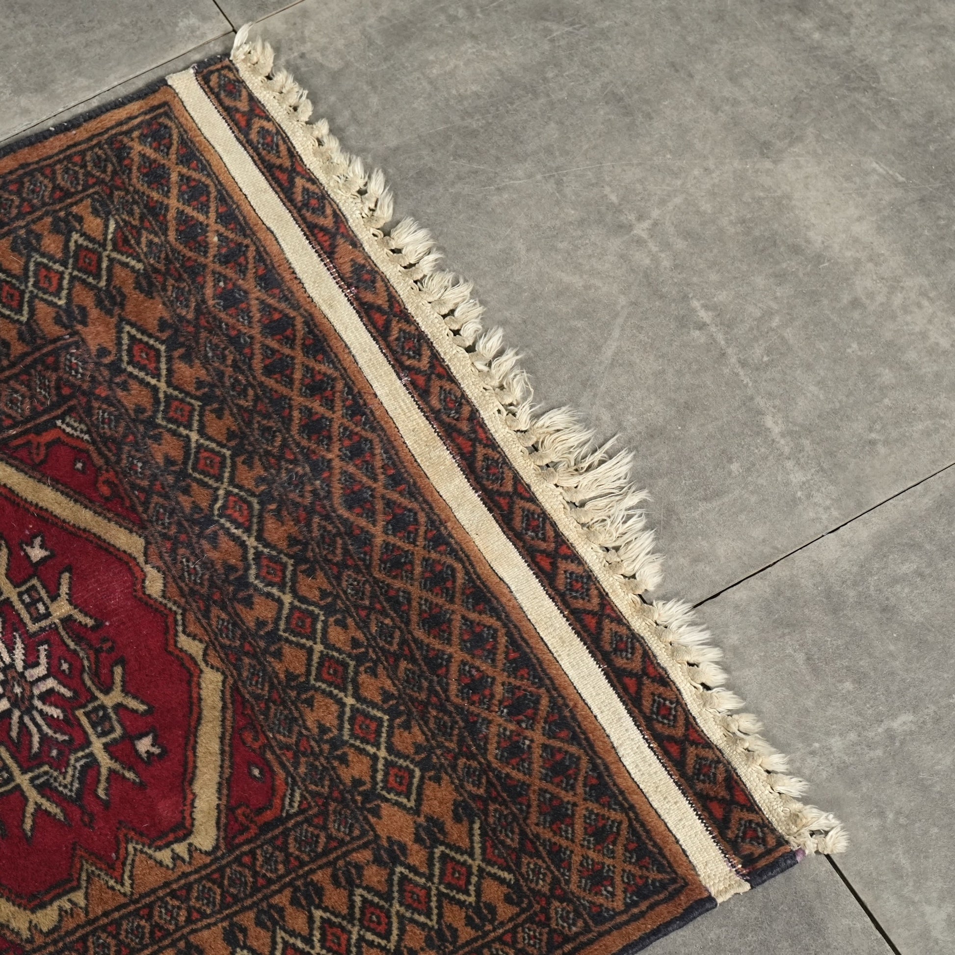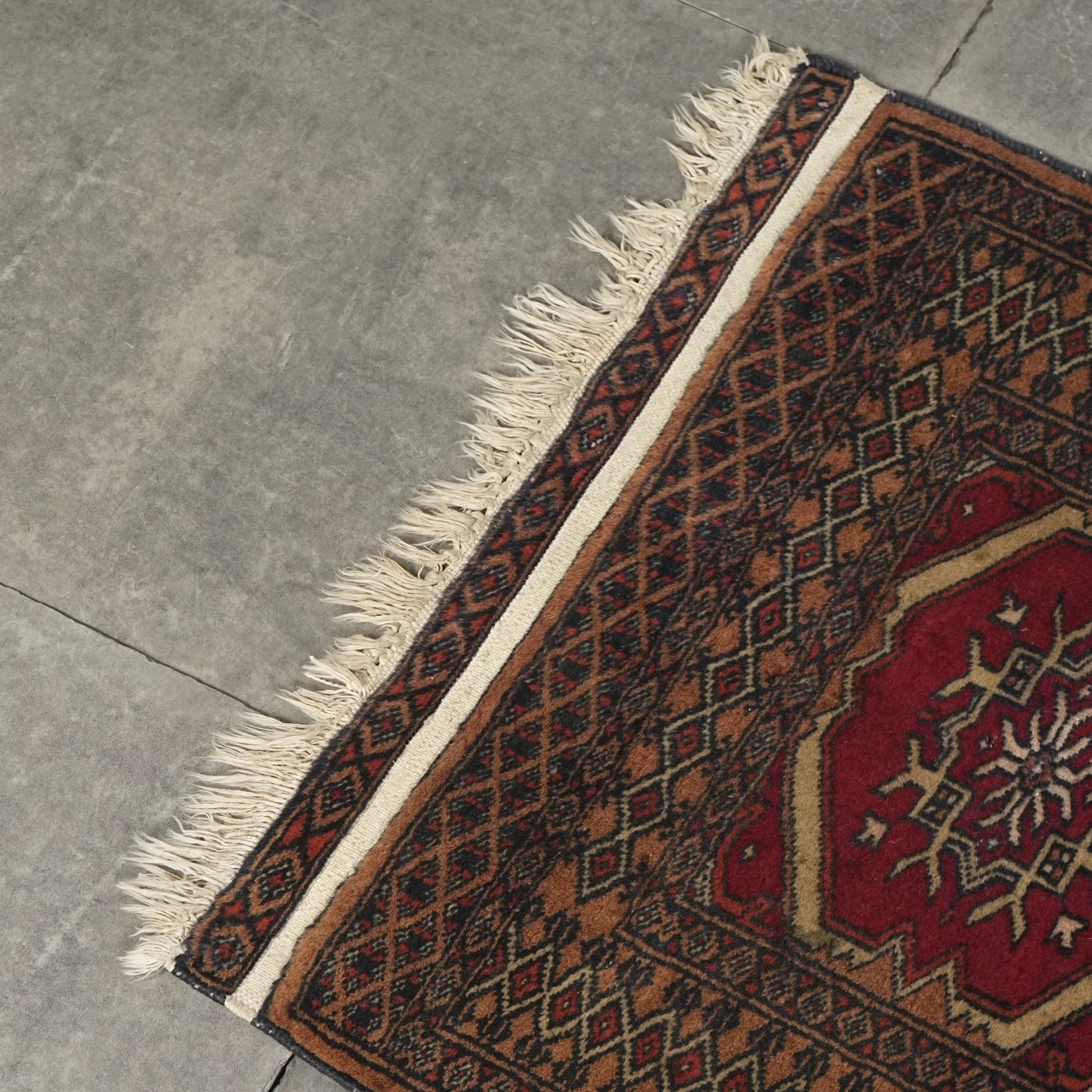 長年に渡って実用されてきたラグとなりますため、経年による色むらやほつれ、擦れや歪みなどの風合いがございますが、それもヴィンテージラグの魅力としてお楽しみください。