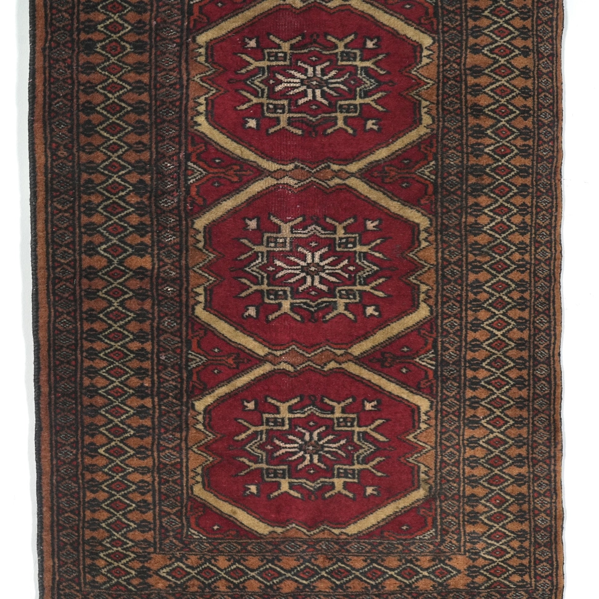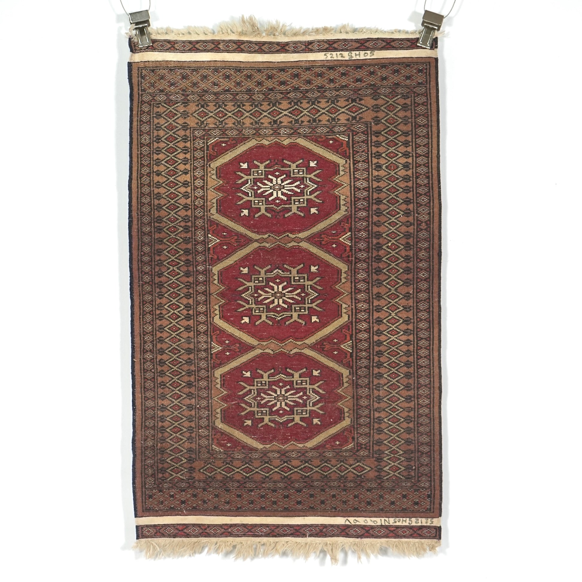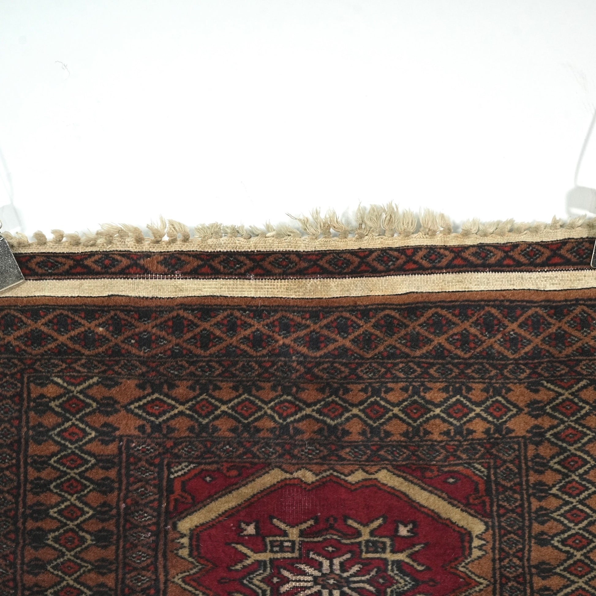 長年に渡って実用されてきたラグとなりますため、経年による色むらやほつれ、擦れや歪みなどの風合いがございますが、それもヴィンテージラグの魅力としてお楽しみください。
