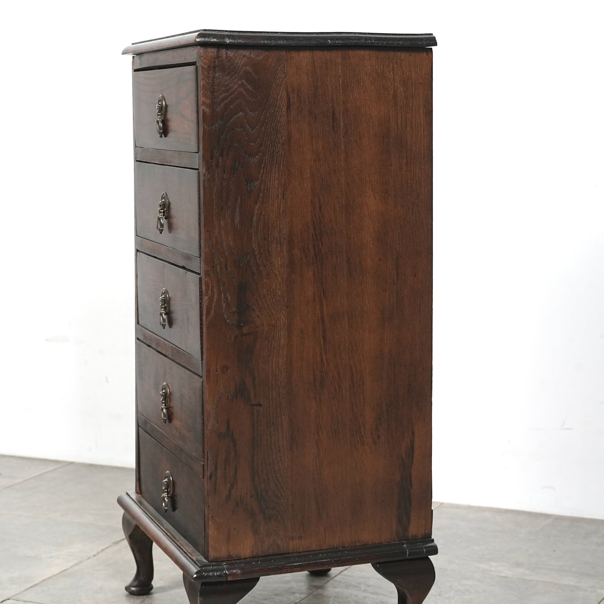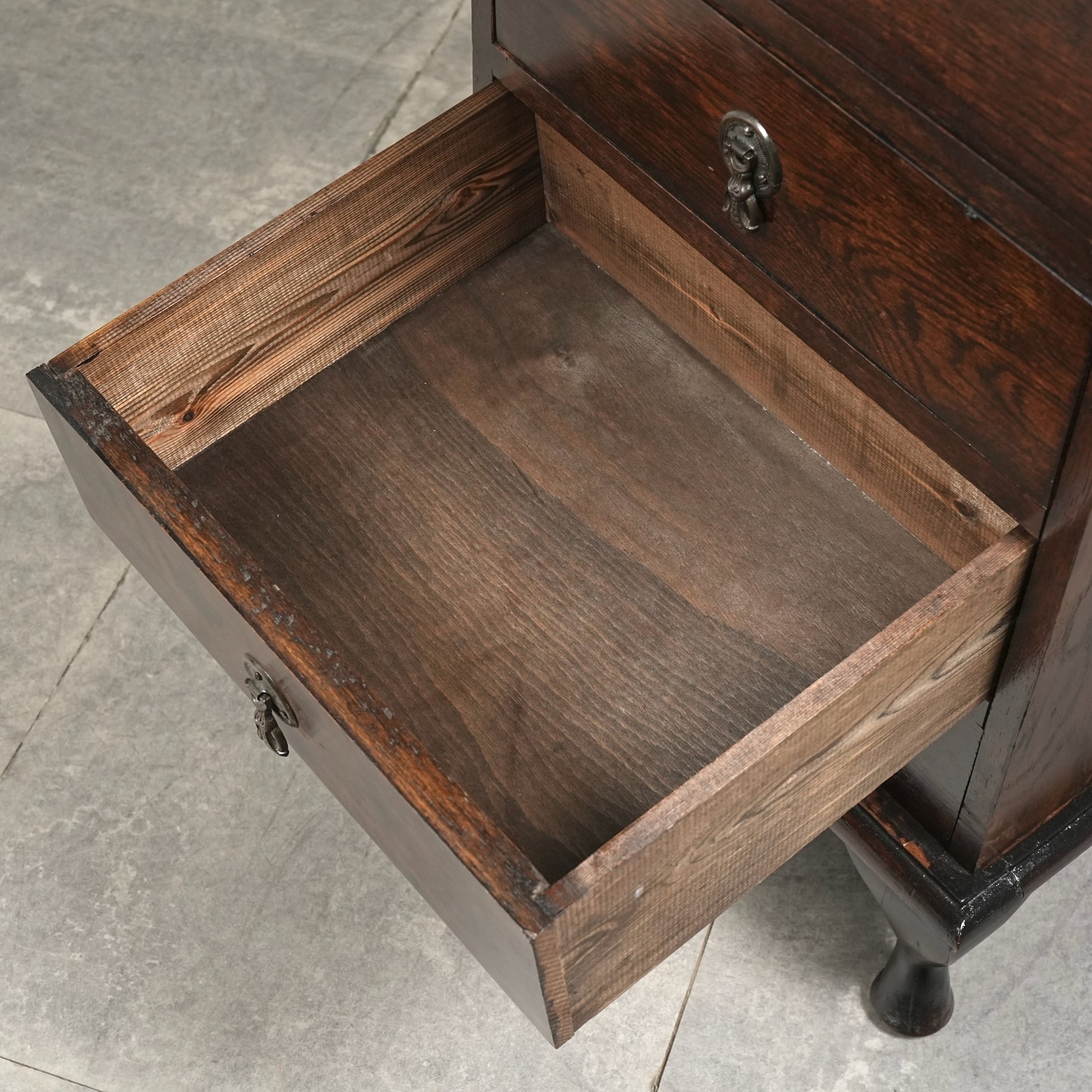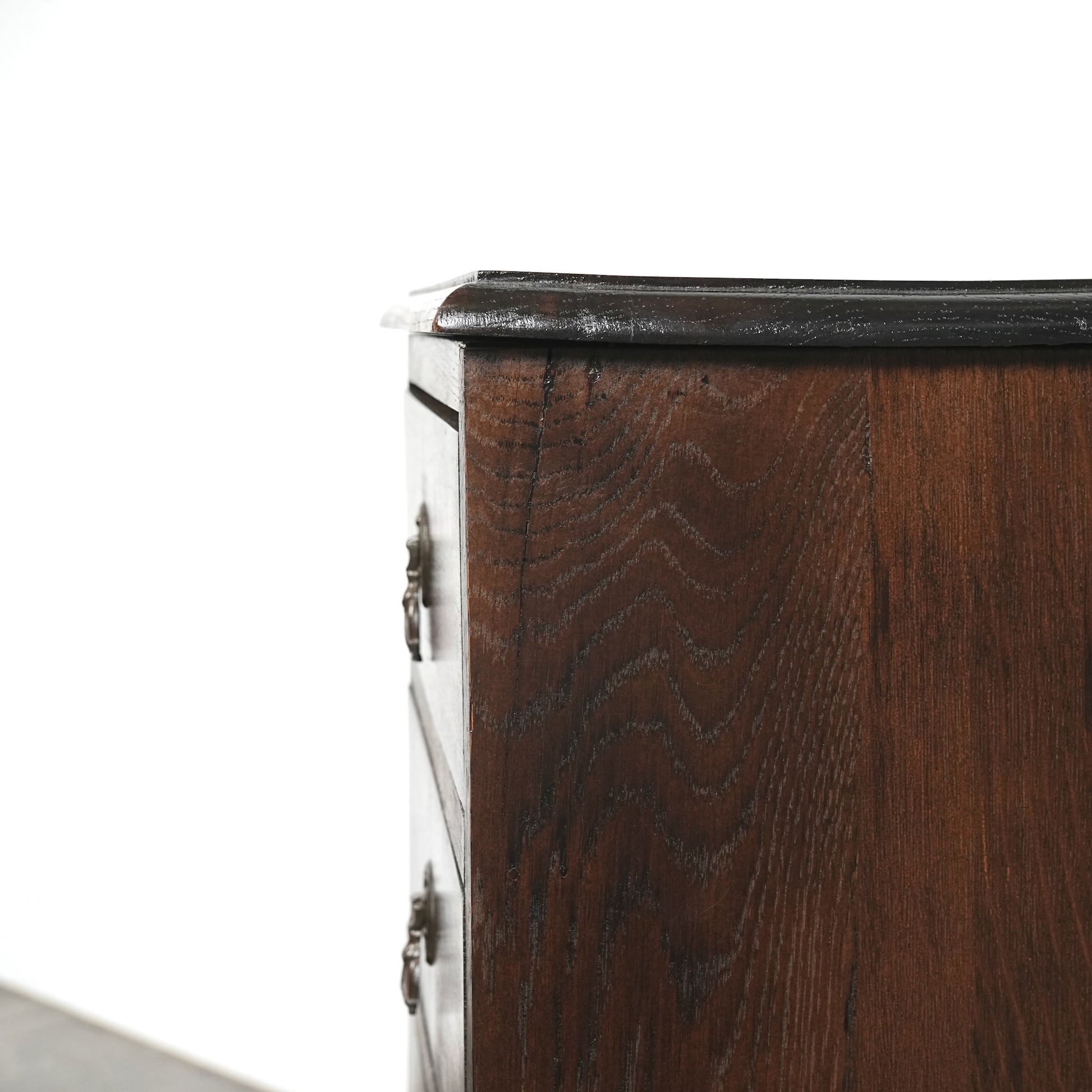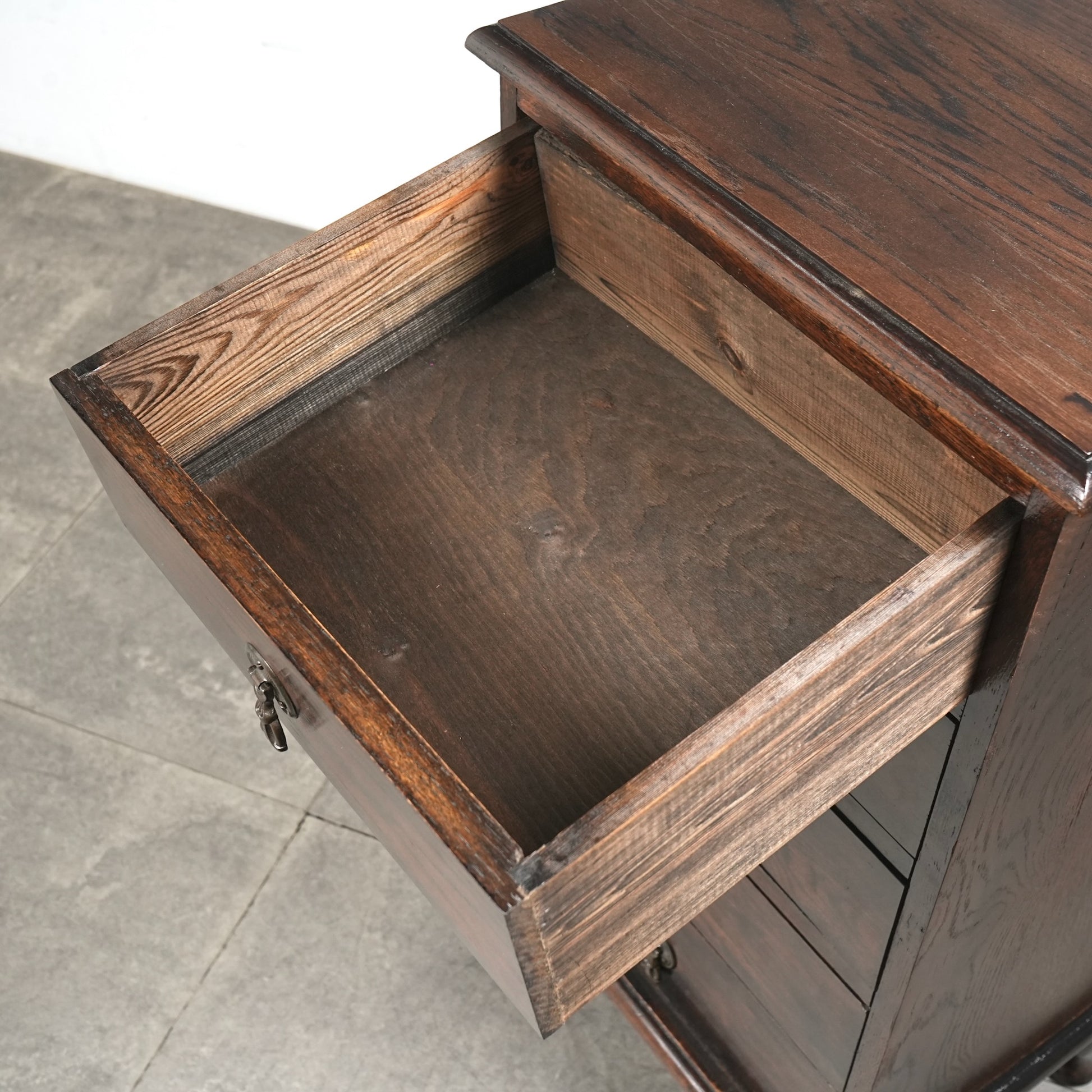 良質なオーク材の見事な木目と質感を感じられる上品な佇まいで、クラシカルな取手や猫脚も可愛らしく、その主張しすぎないデザインが、素材やディテールの美しさと作りの丁寧さを際立たせています。