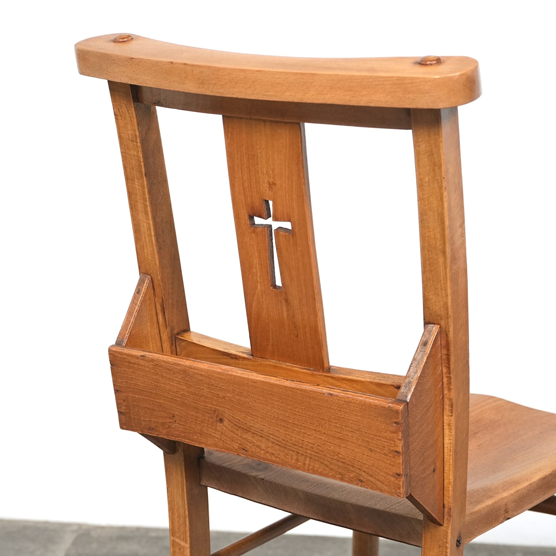 こちらのチャーチチェアは十字架の意匠と聖書を入れるポケットが備えられたモデル。