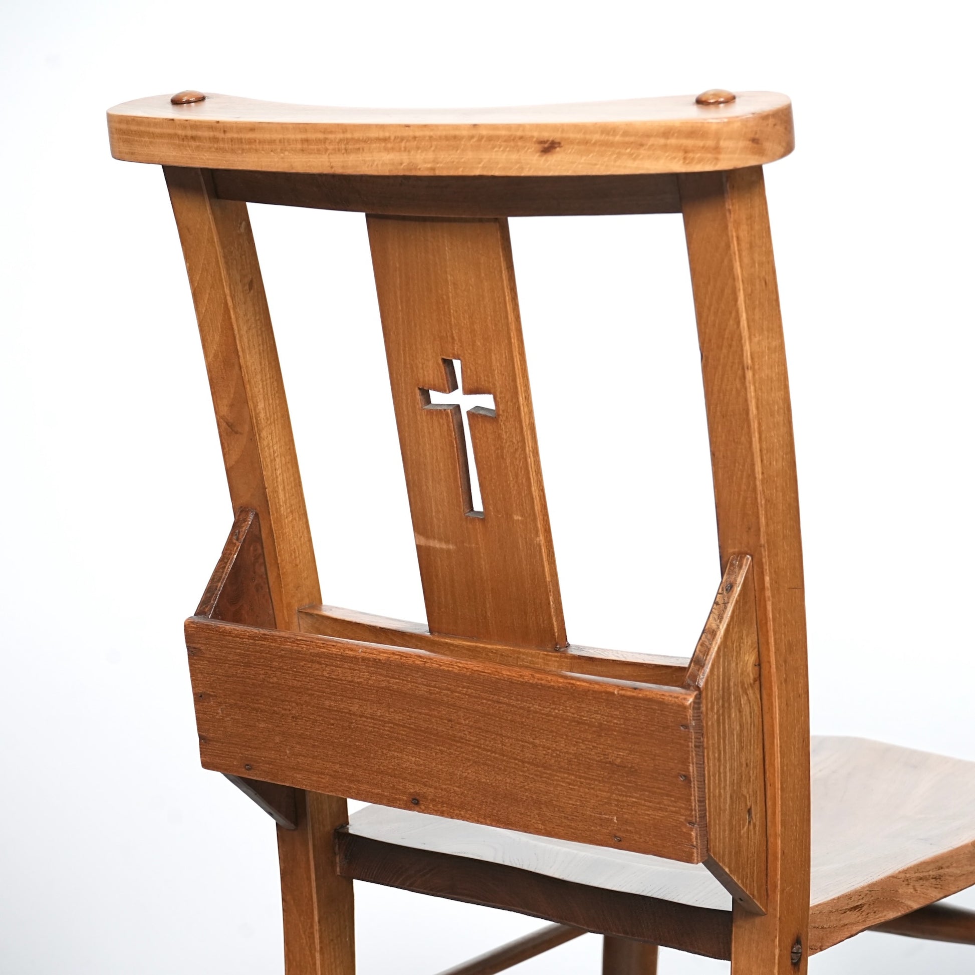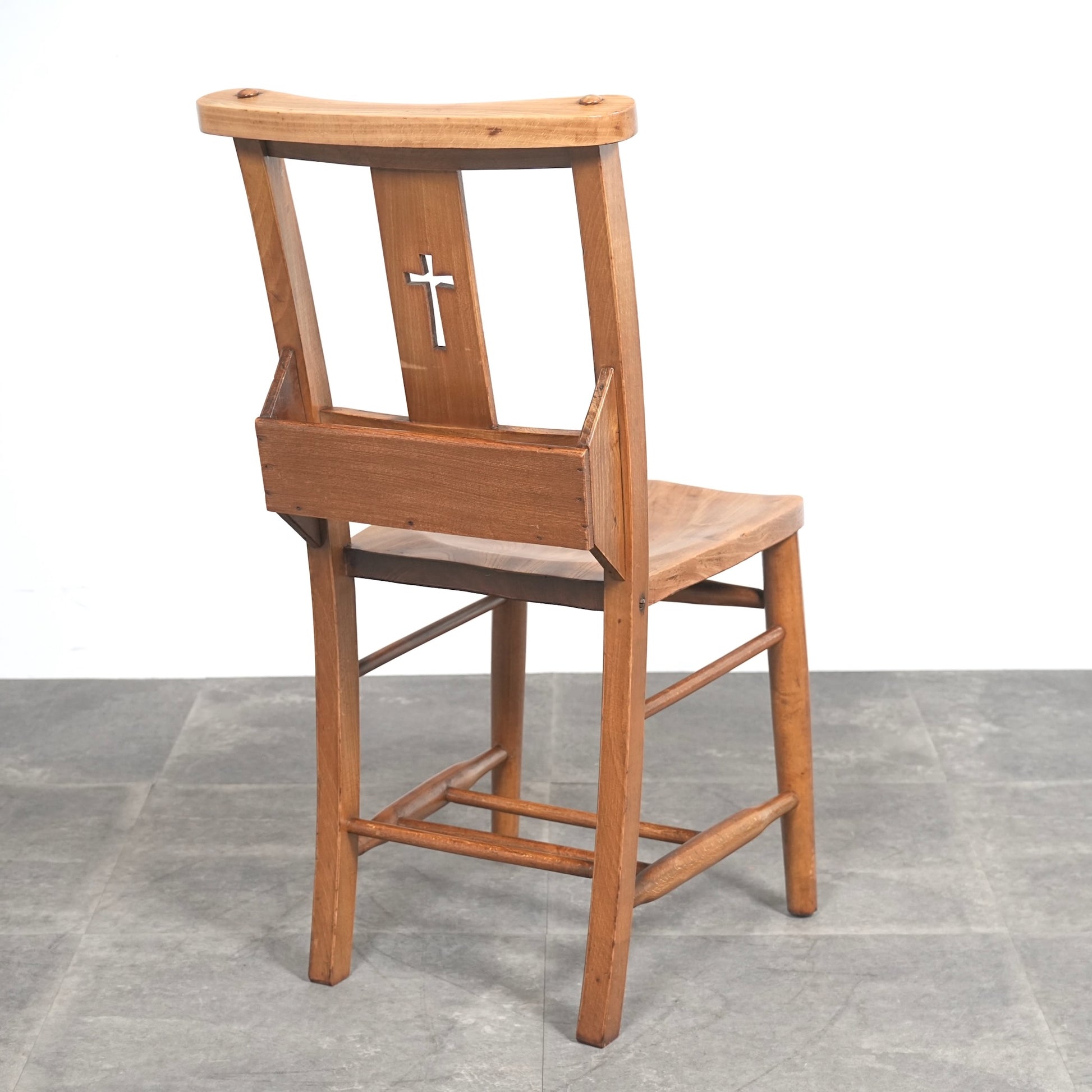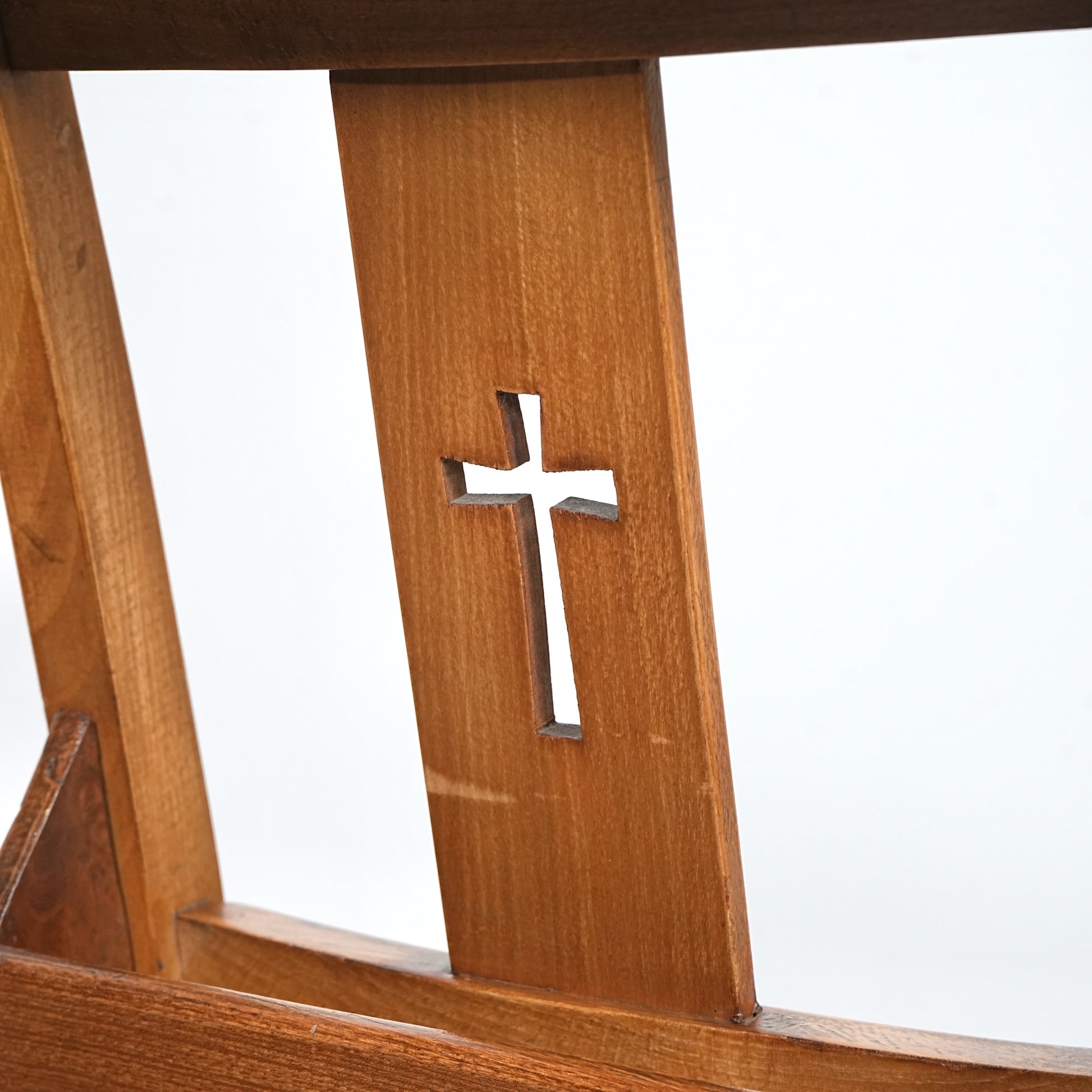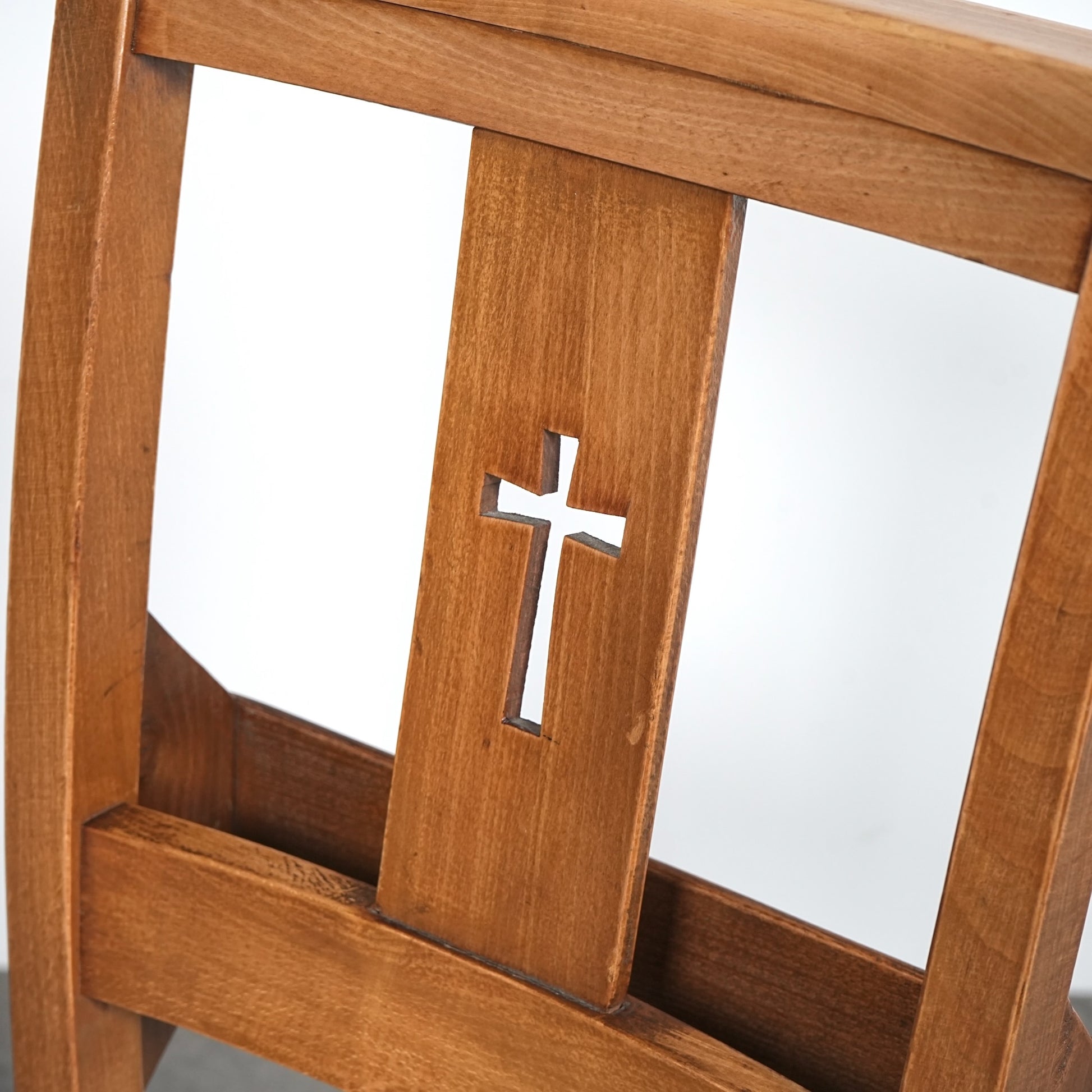 こちらのチャーチチェアは十字架の意匠と聖書を入れるポケットが備えられたモデル。