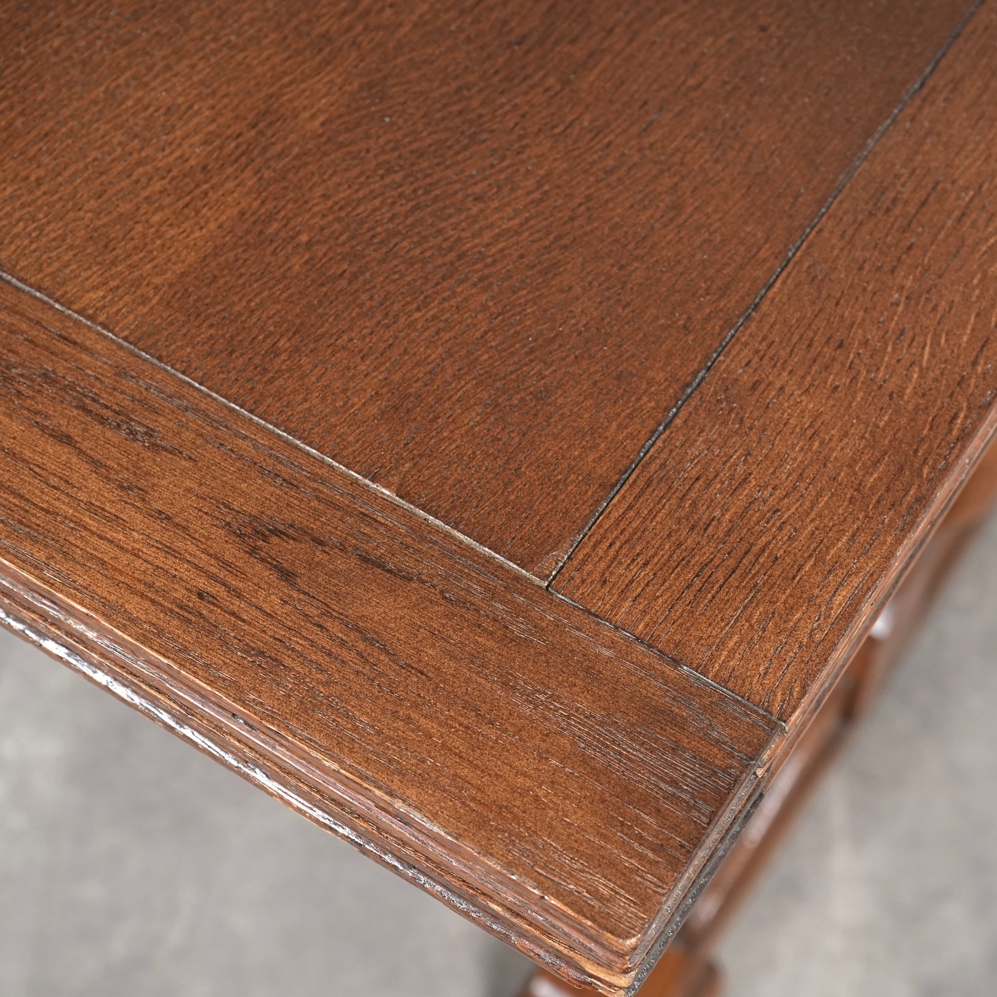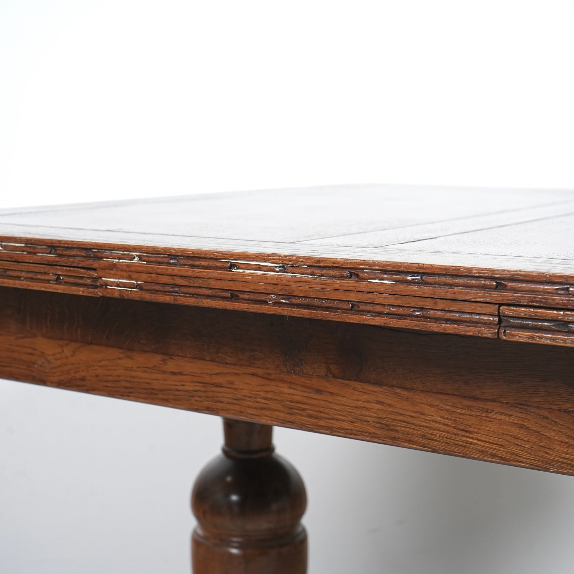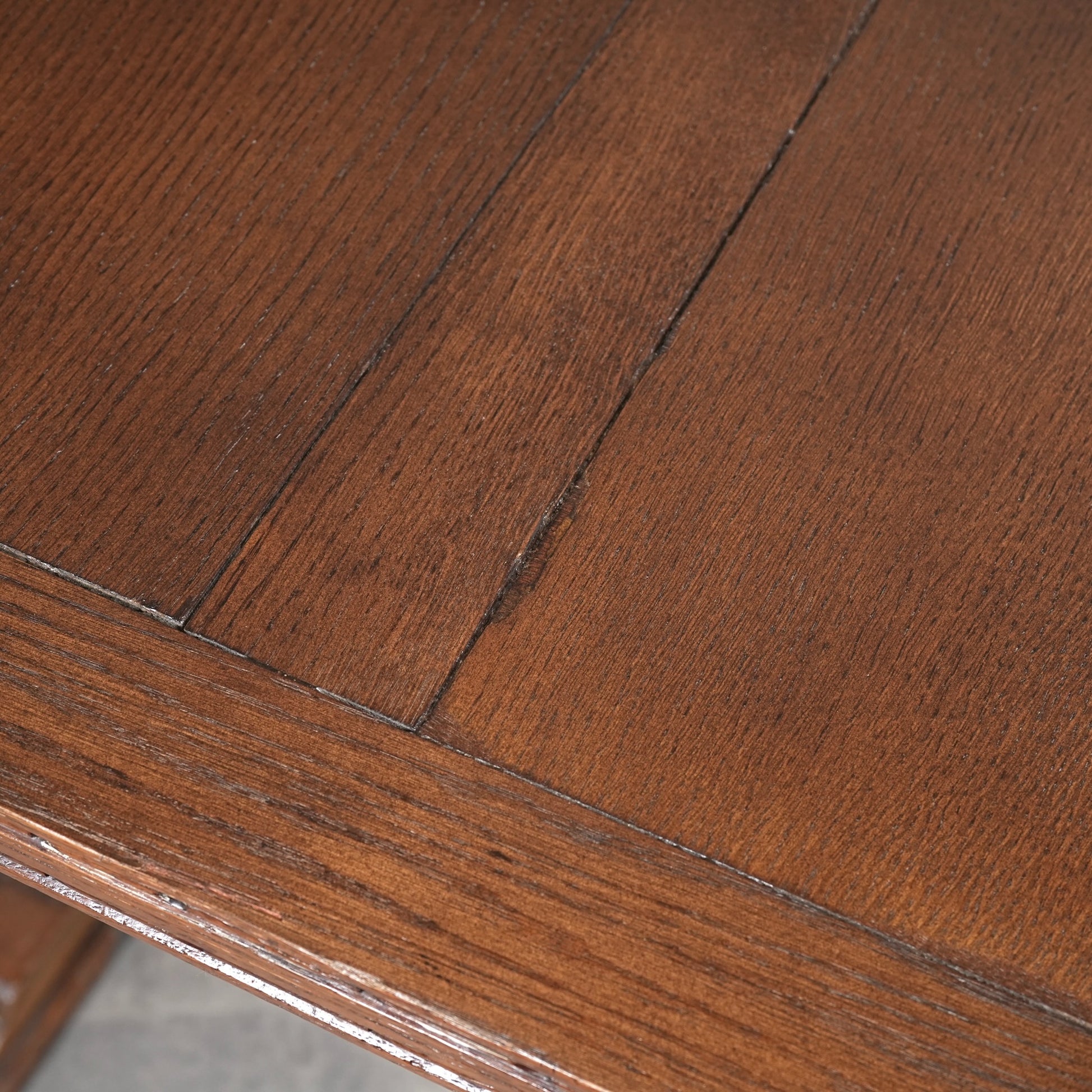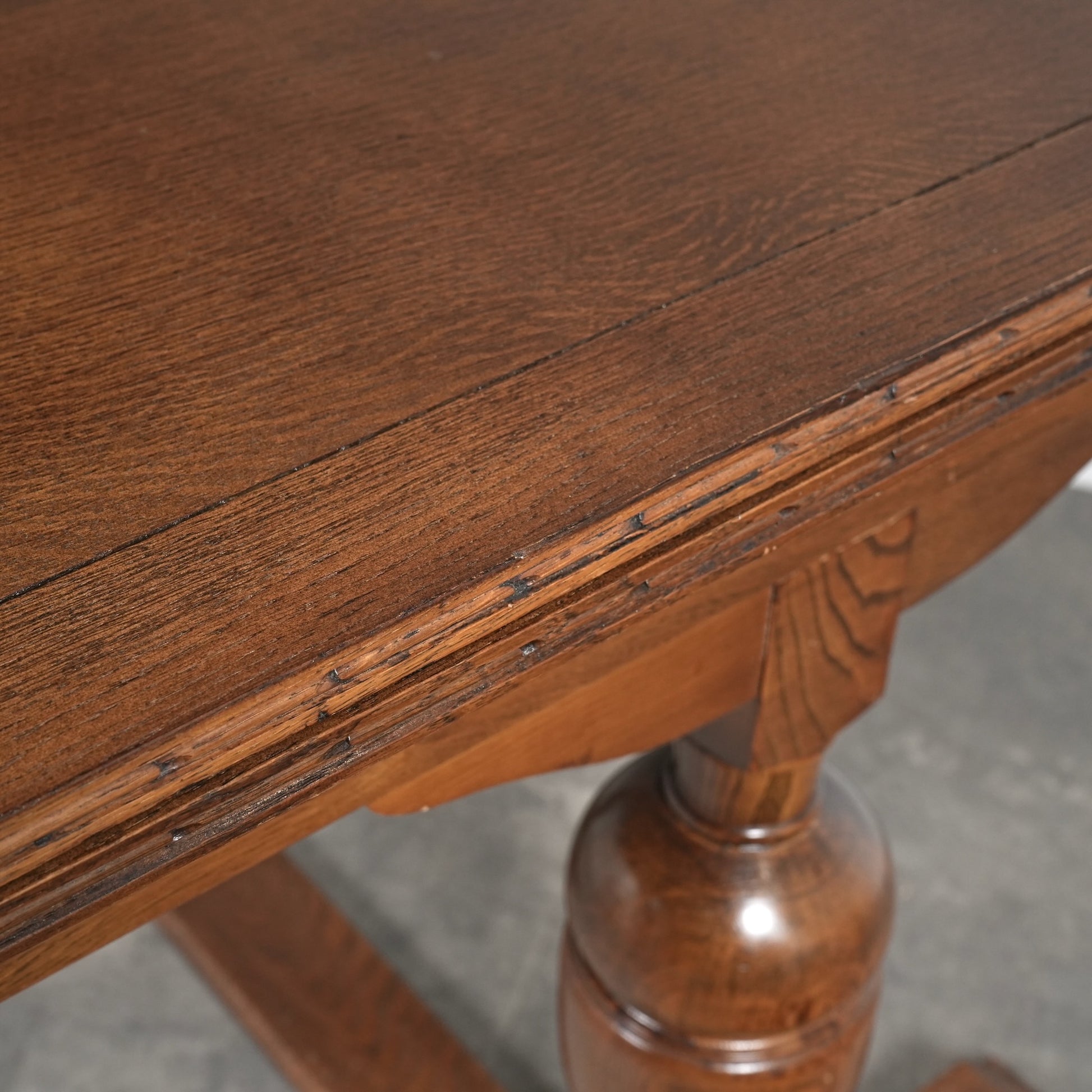 英国アンティークらしい良質なオーク材の木目と質感が見事で、脚部のバルボスレッグは主張しすぎない控えめなバランス。