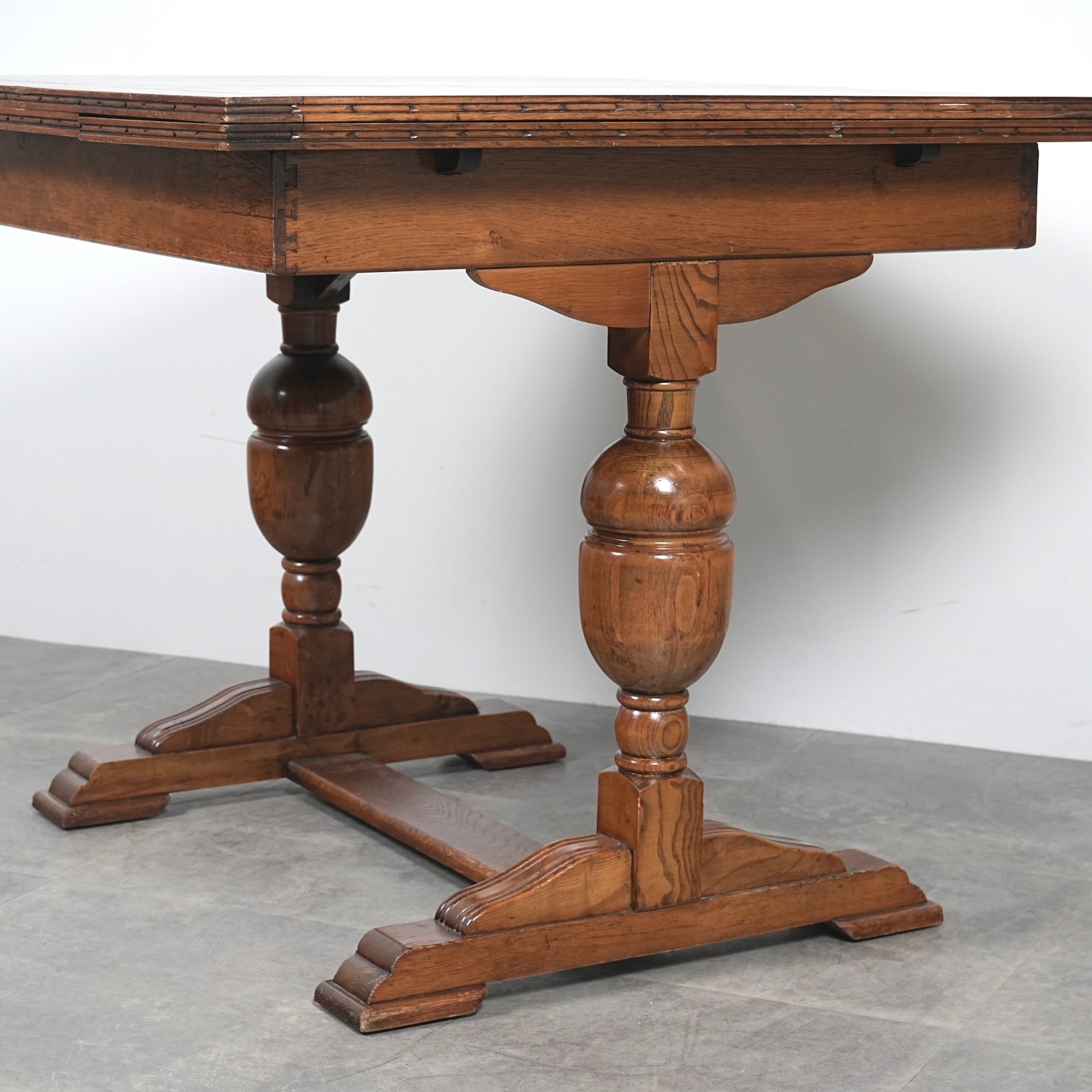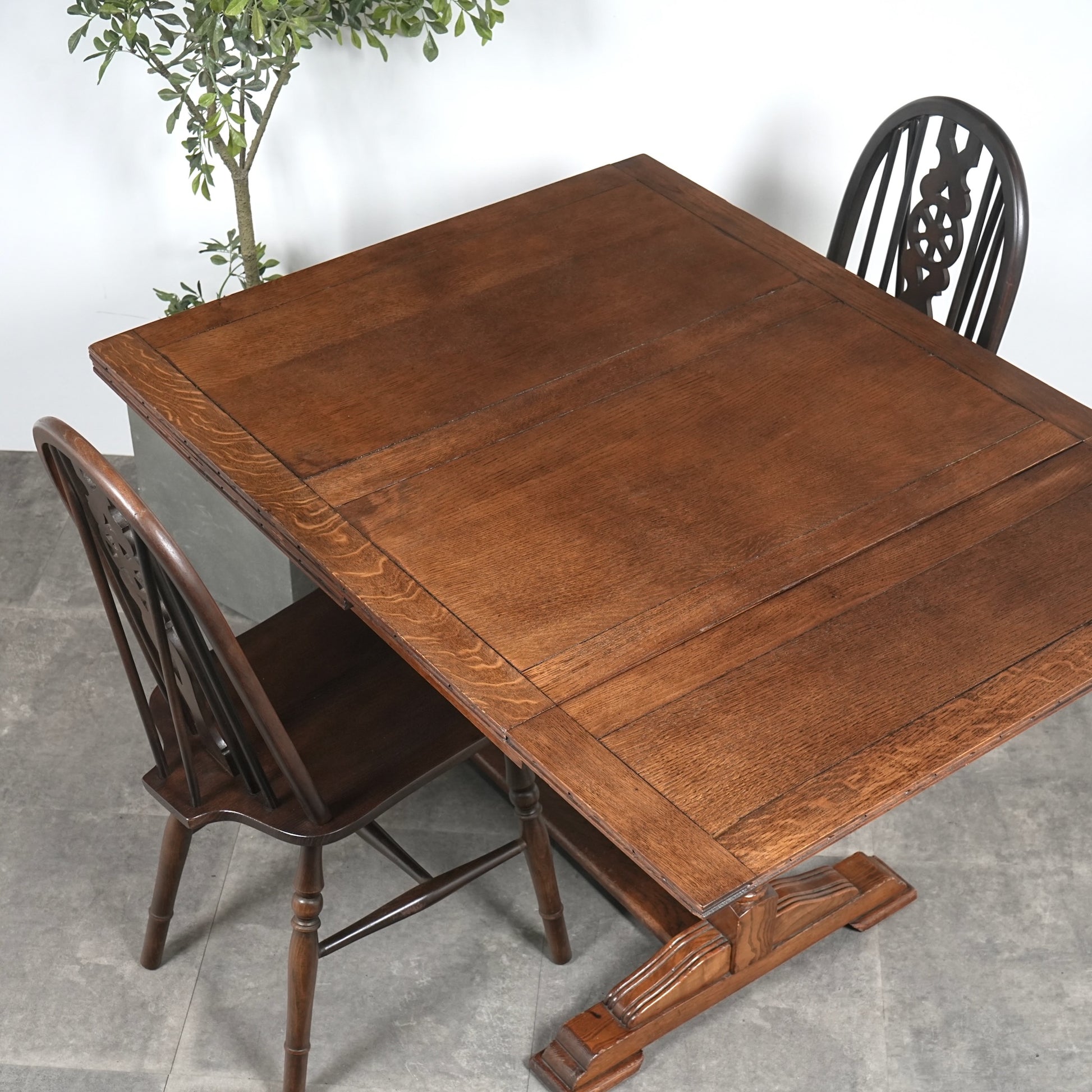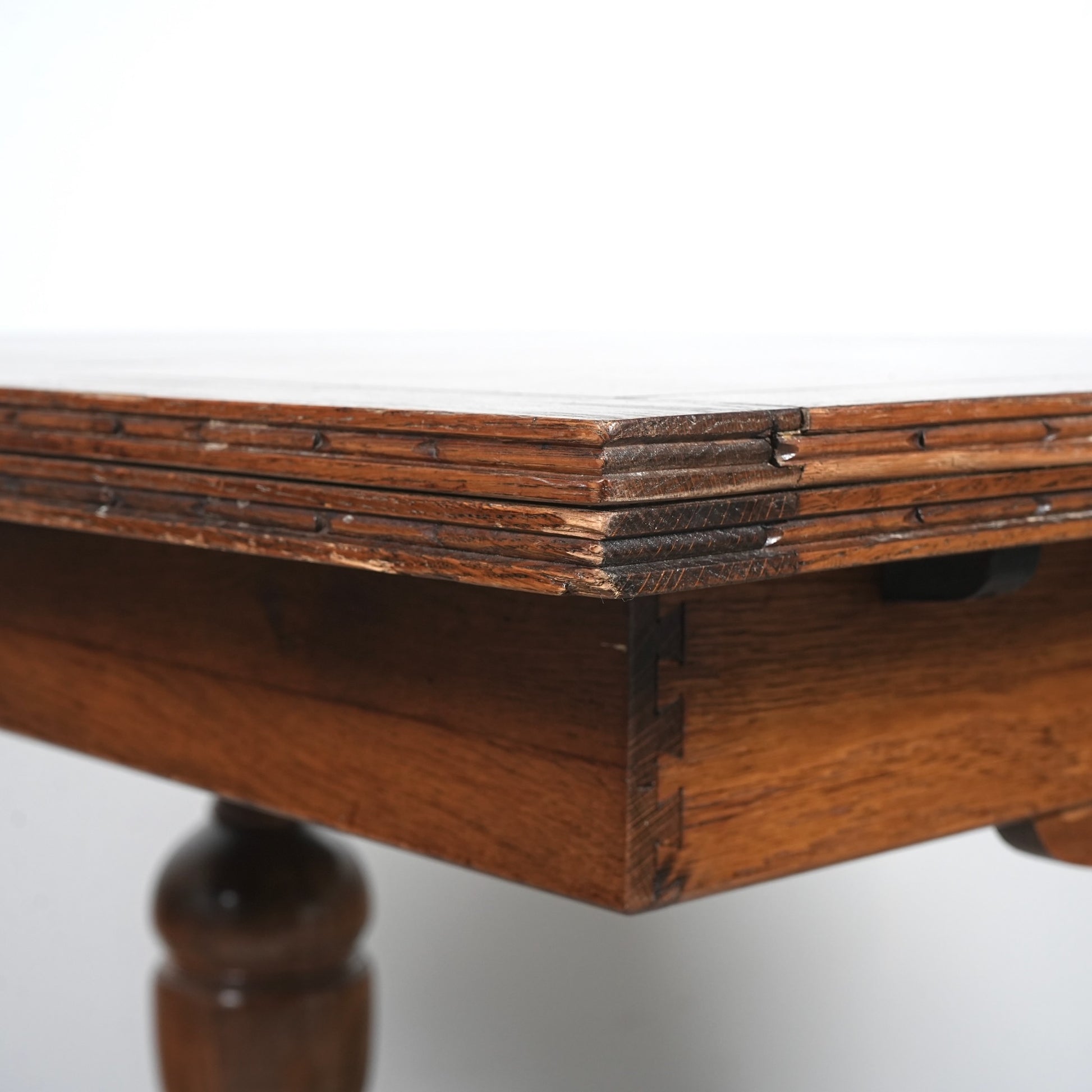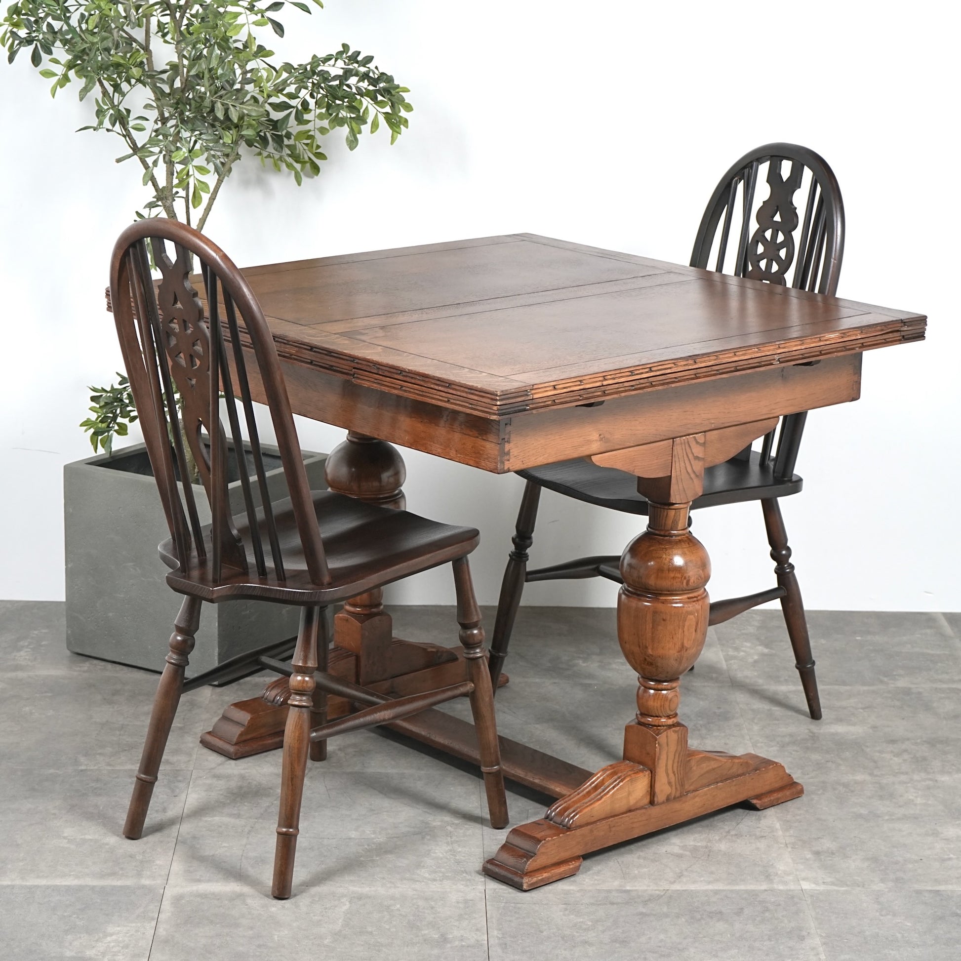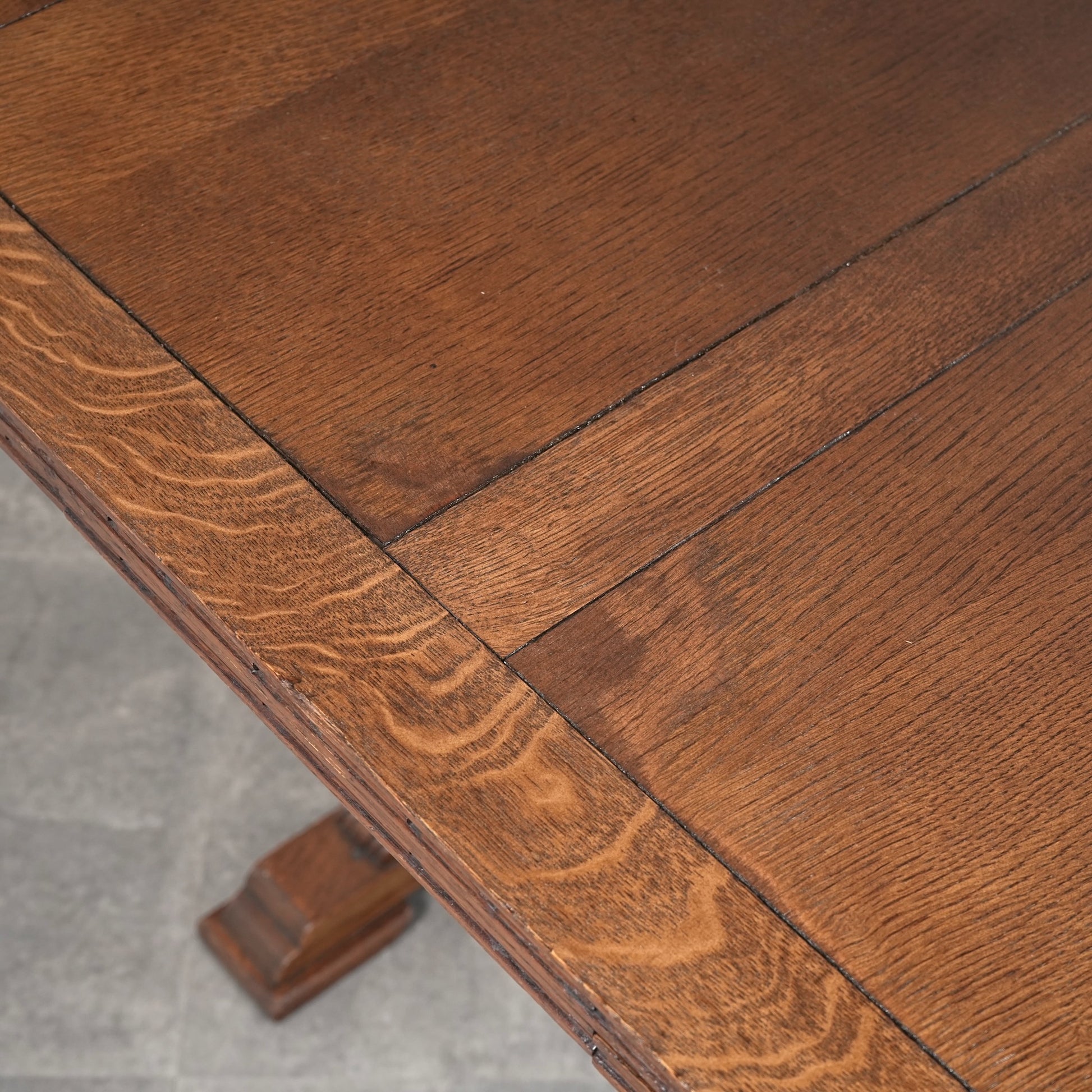 英国アンティークらしい良質なオーク材の木目と質感が見事で、脚部のバルボスレッグは主張しすぎない控えめなバランス。