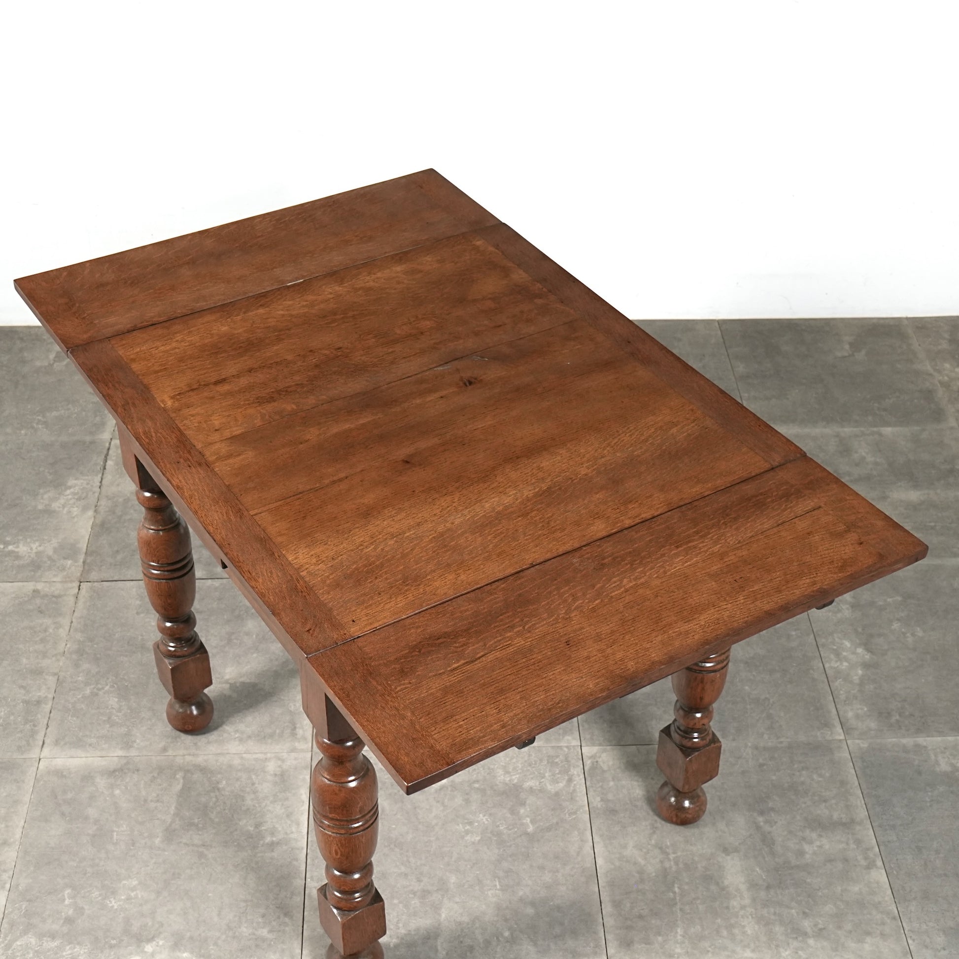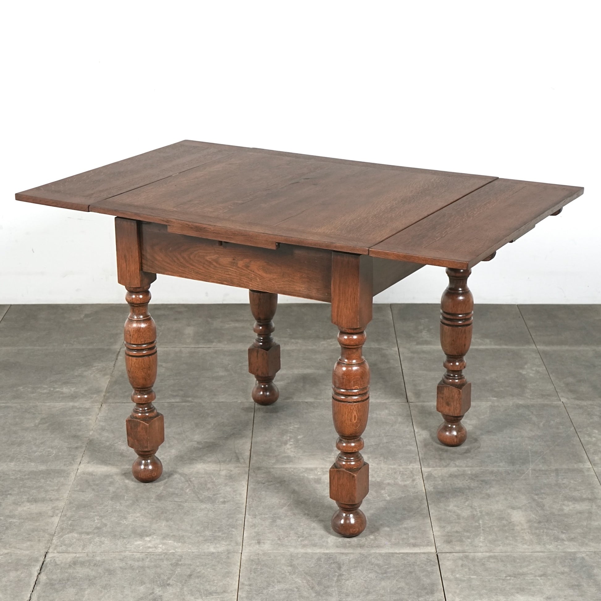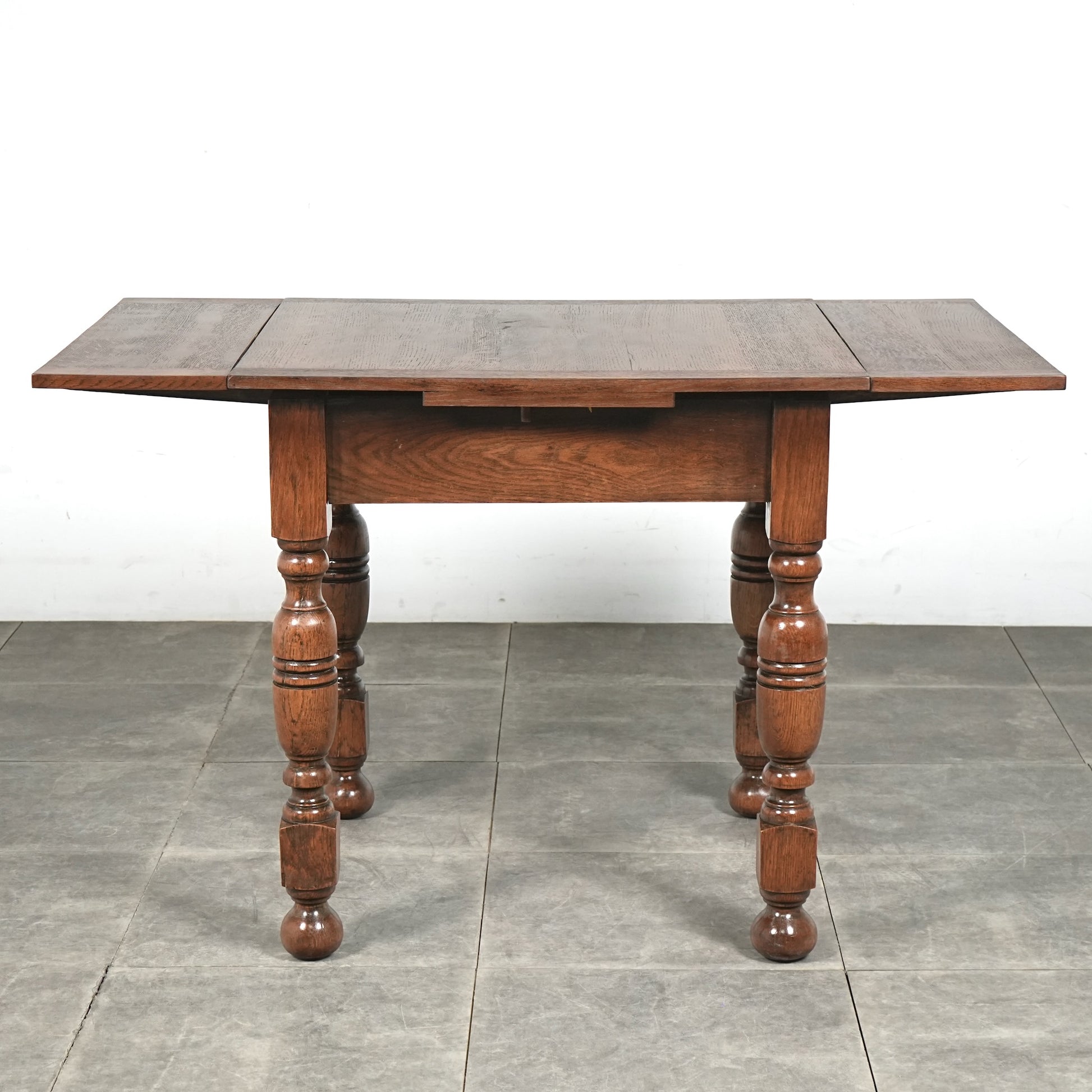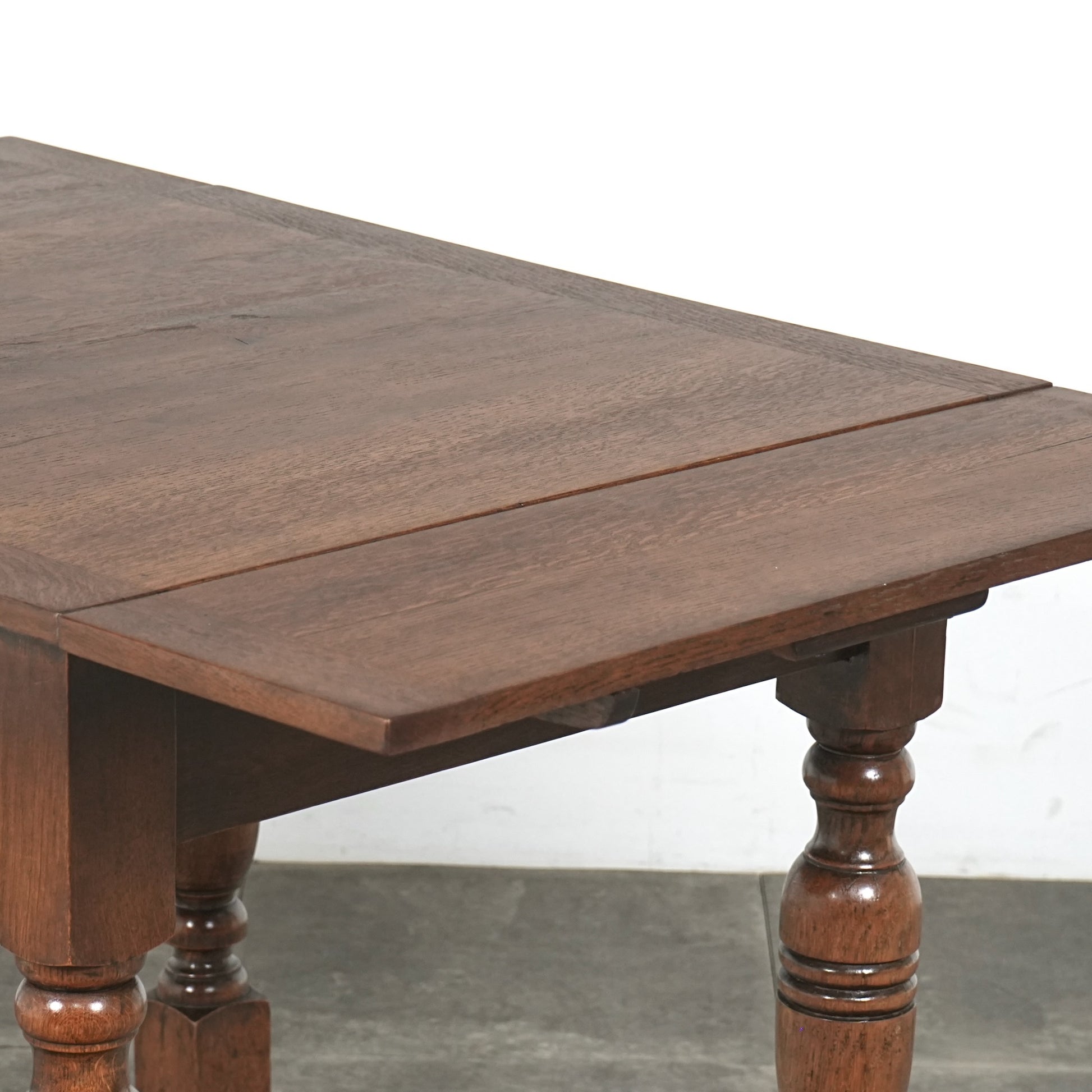アンティーク&ヴィンテージの大定番アイテムとして世界中で愛されるアイテムの1つで、ドローリーフとは天板を拡張する際に軽く持ち上げて下の拡張板を引き出すと上の天板が沈みフラットになる仕組みです。