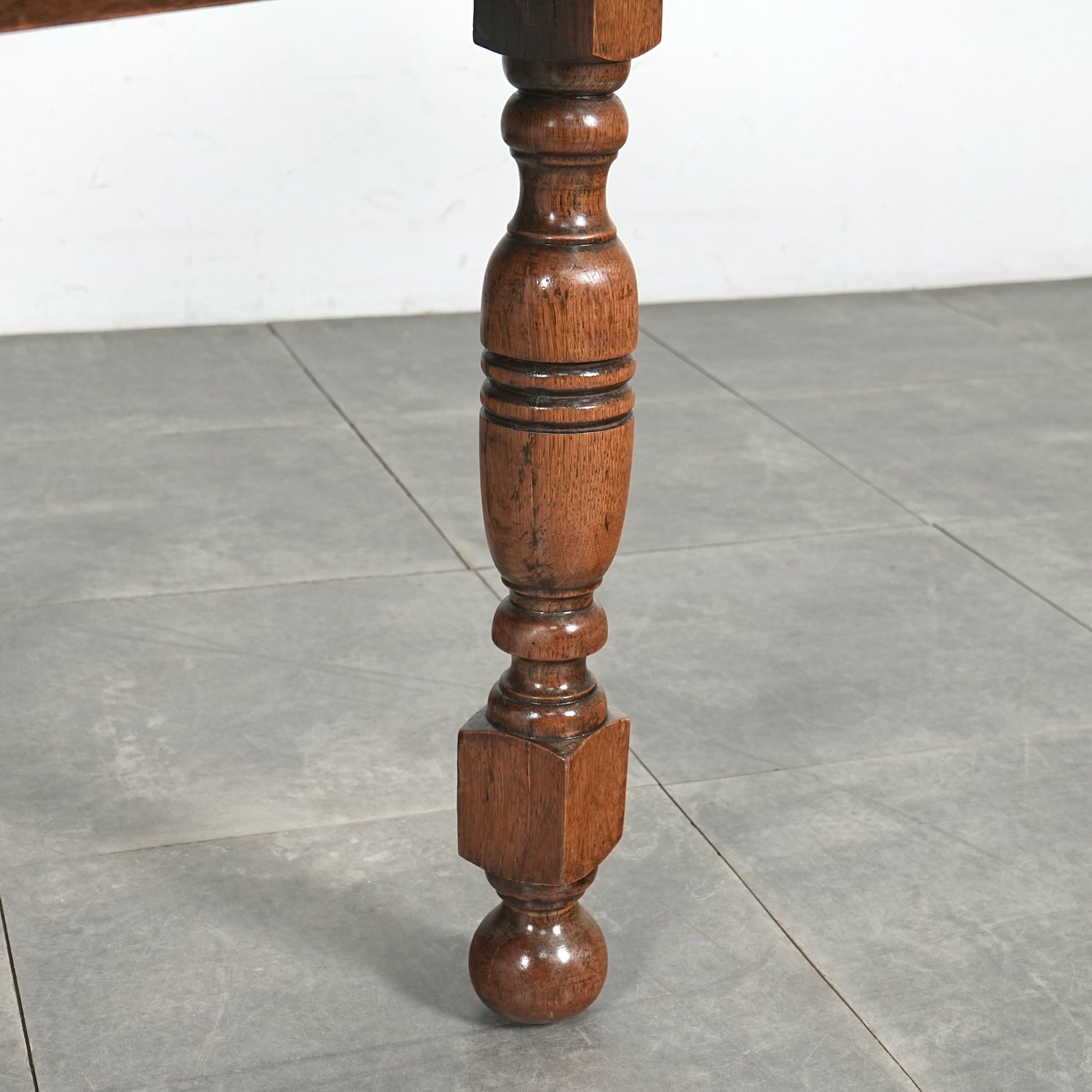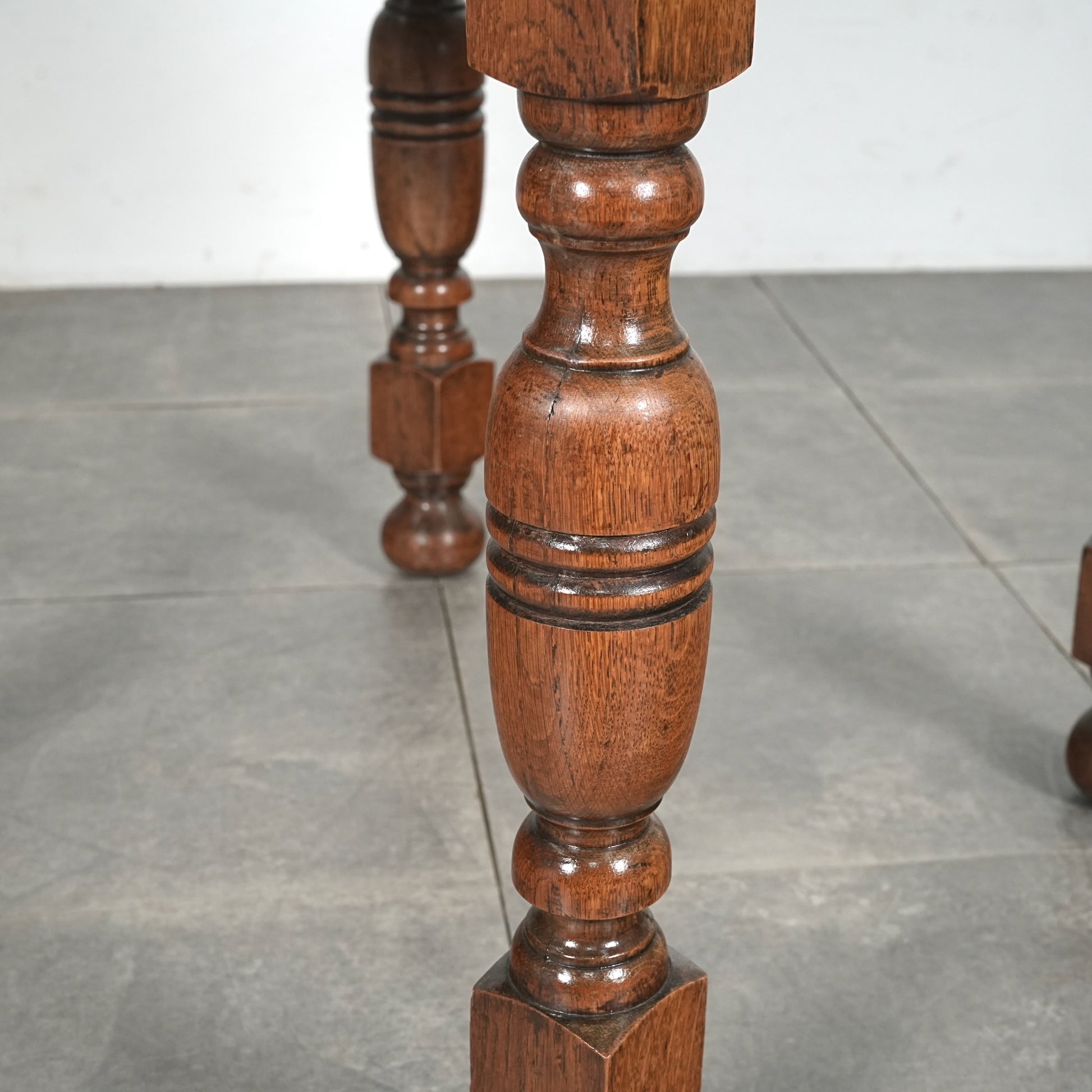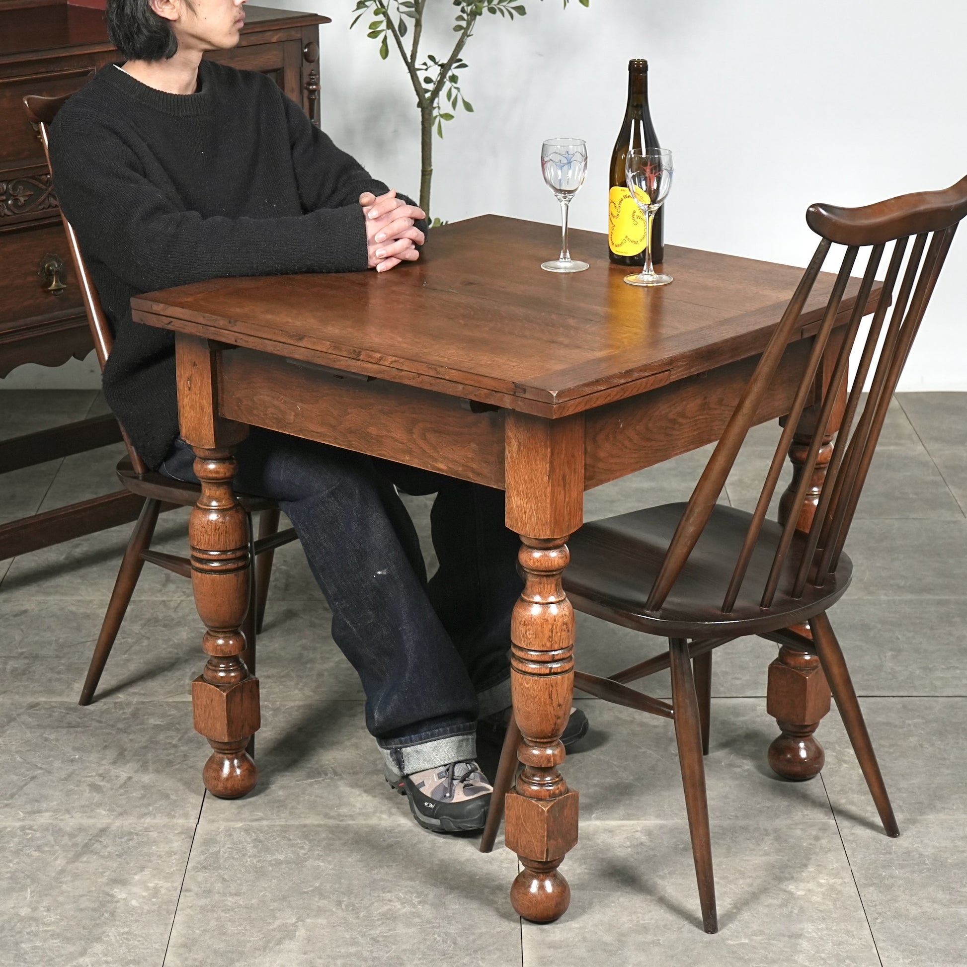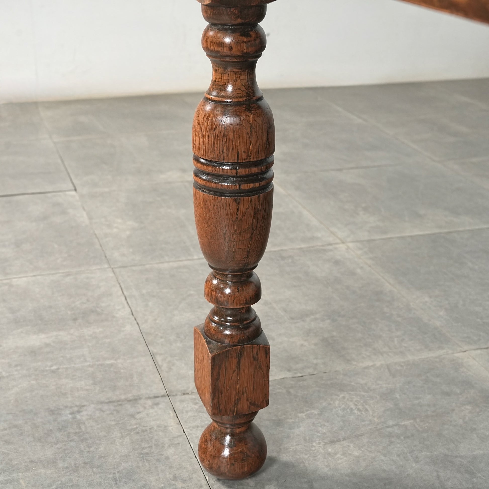 英国アンティークらしい良質なオーク材の木目と質感が見事で、脚部の美しい挽物細工は主張しすぎない絶妙なバランス。