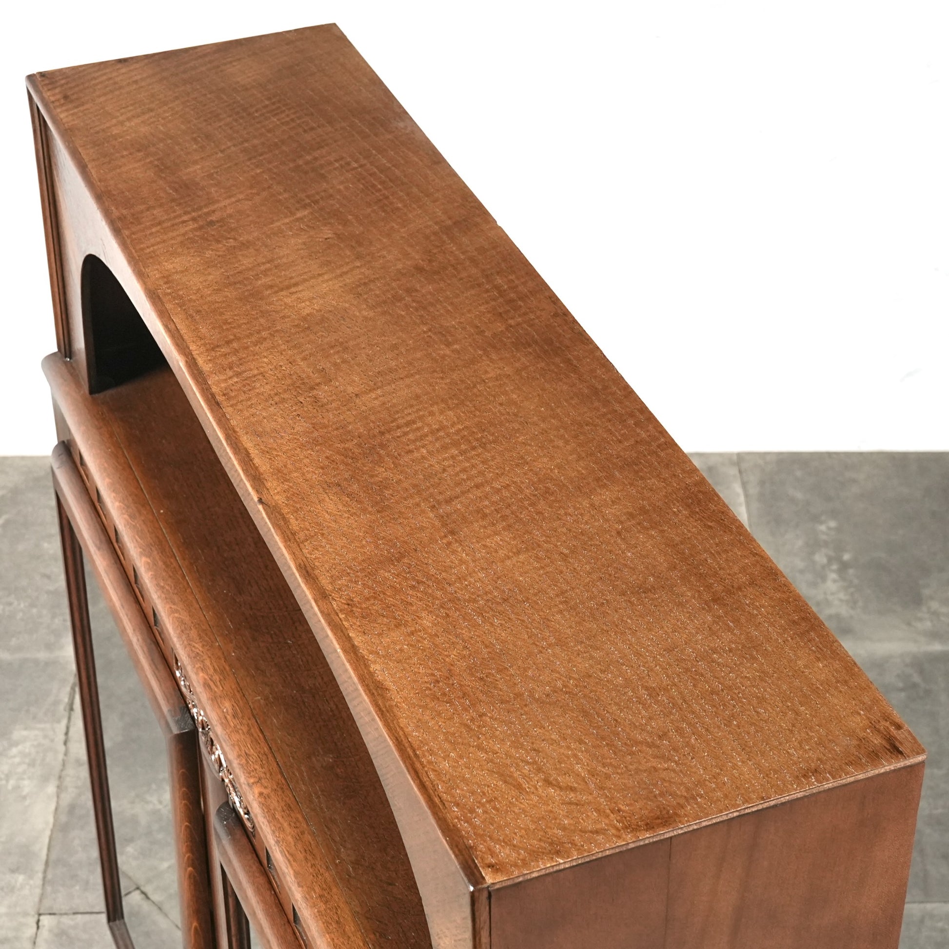 上段オープンスペースには優雅なアーチの意匠が施され、下段のガラス扉やさり気ない装飾とも美しく調和しています。
