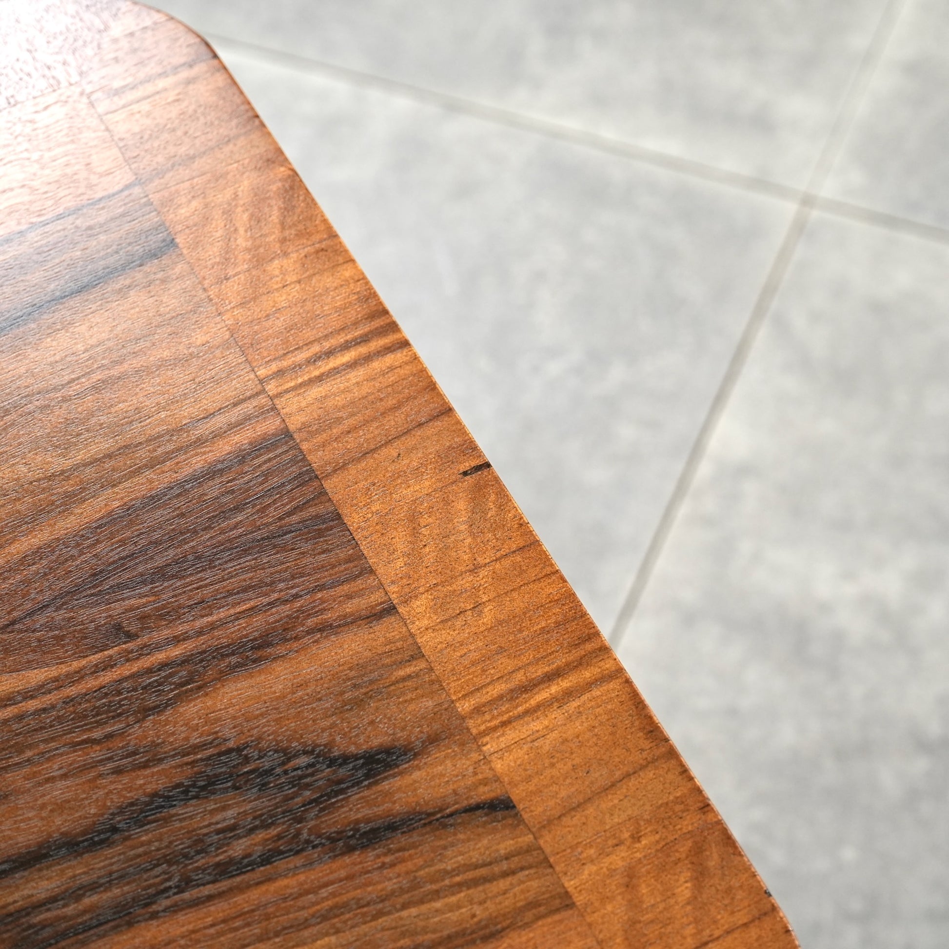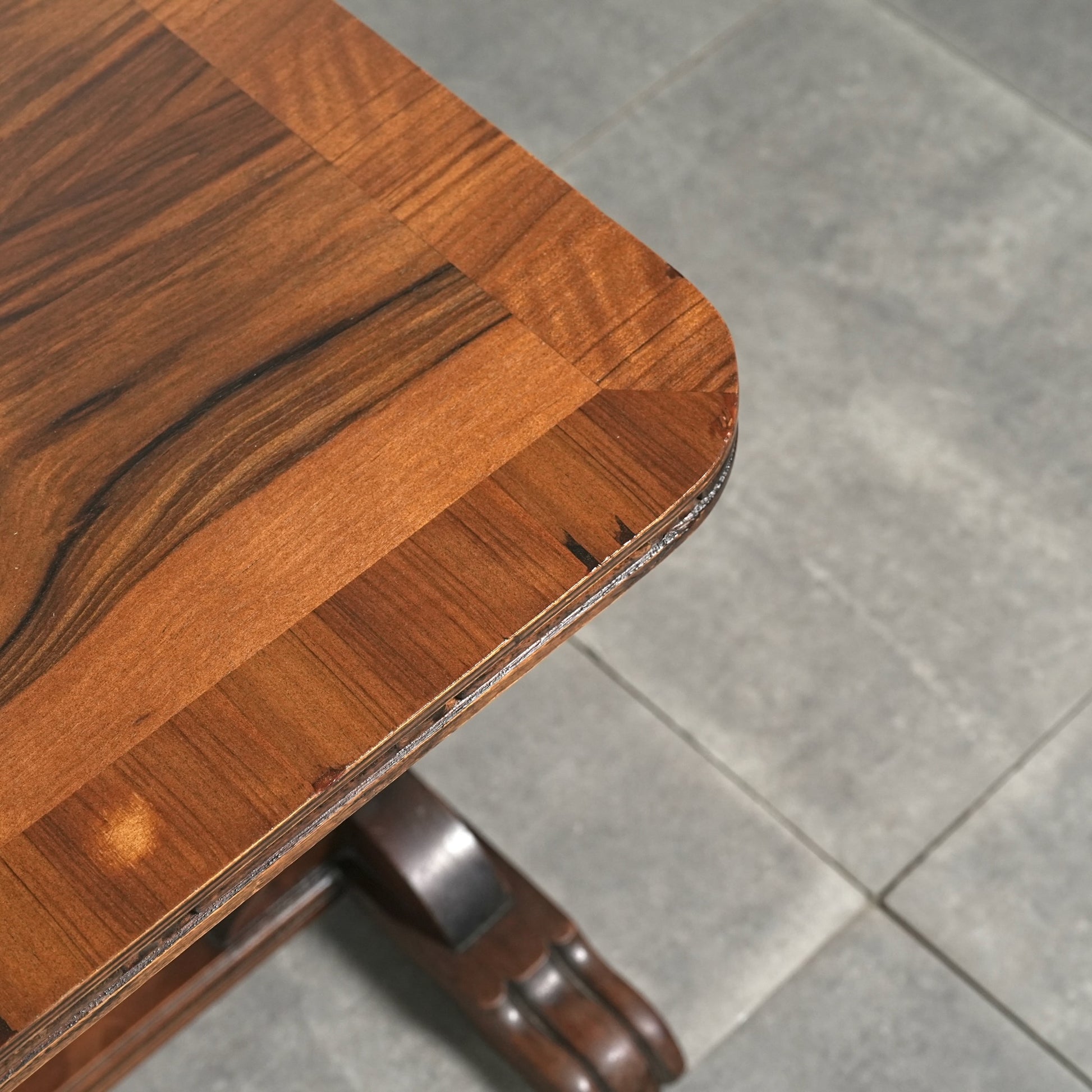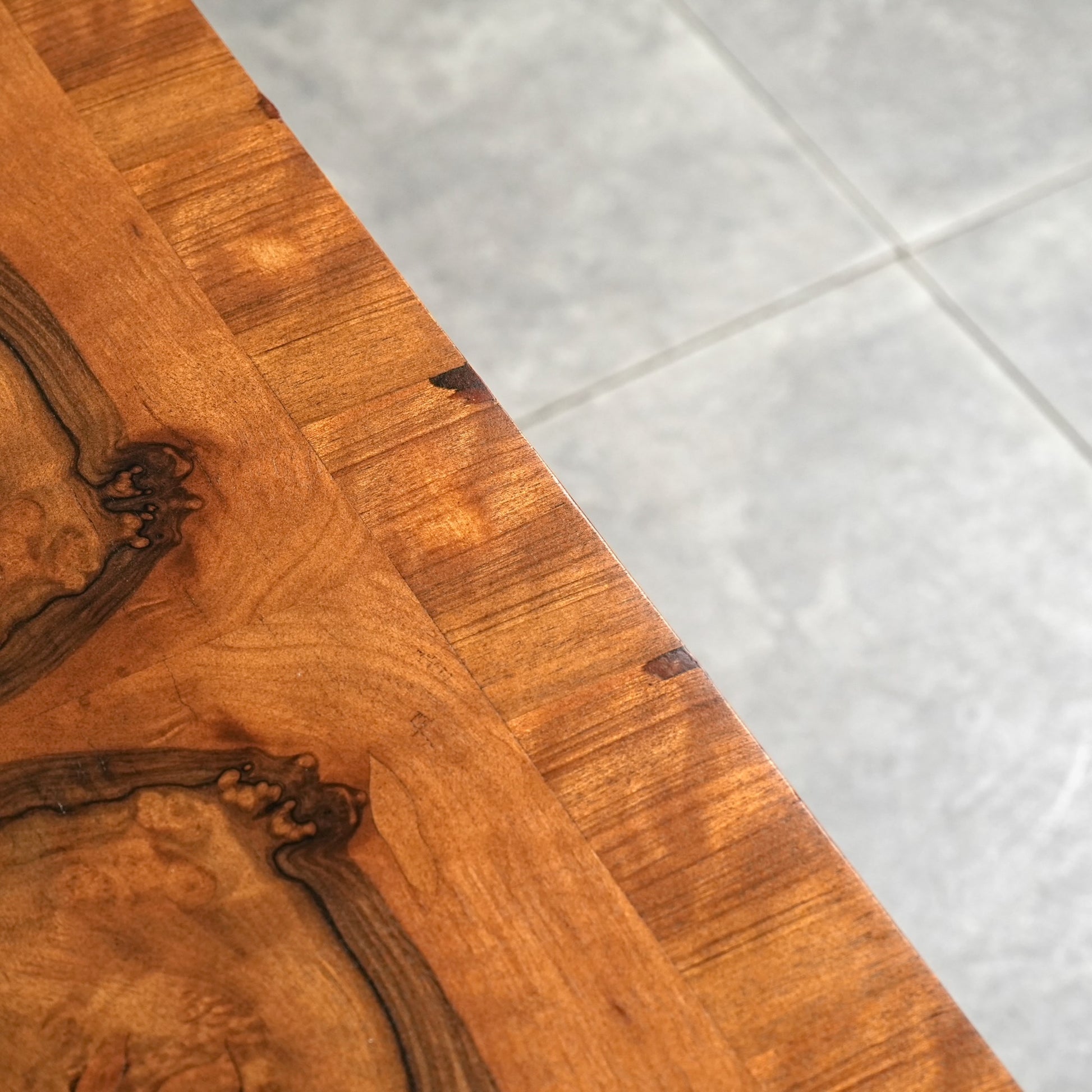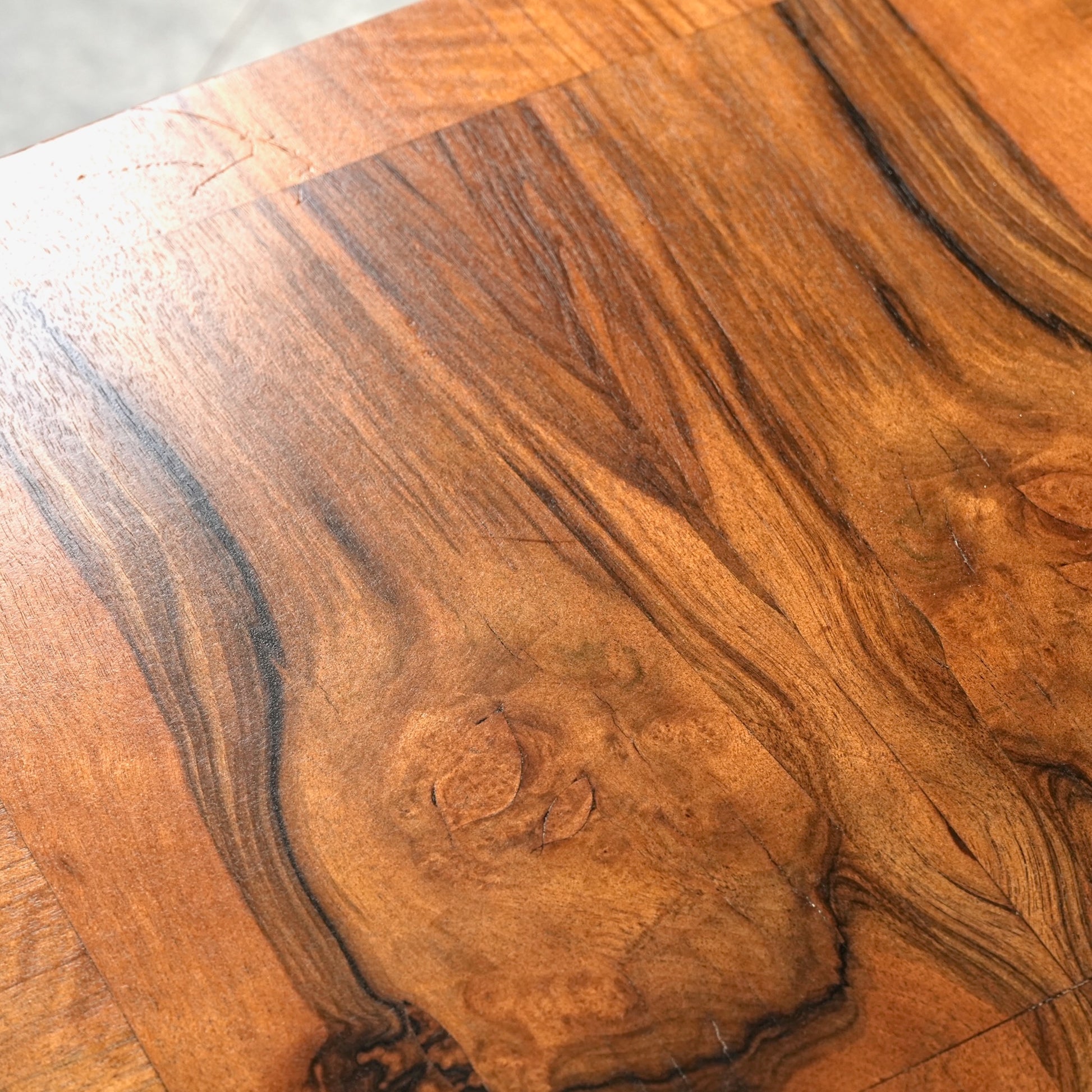三大銘木のウォルナットの見事な杢目と質感が何よりの魅力で、英国伝統のバルボスレッグや天板木口のさり気ない作り込みなど、小型家具ながらも妥協のない丁寧な作り込みが光る、非常に完成度の高いアイテムです。