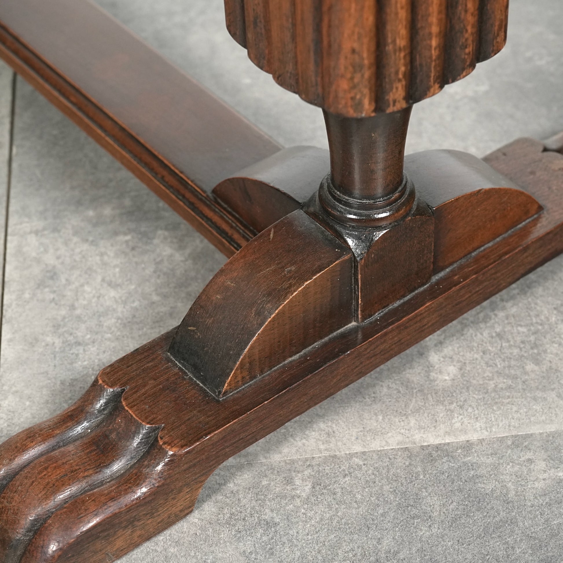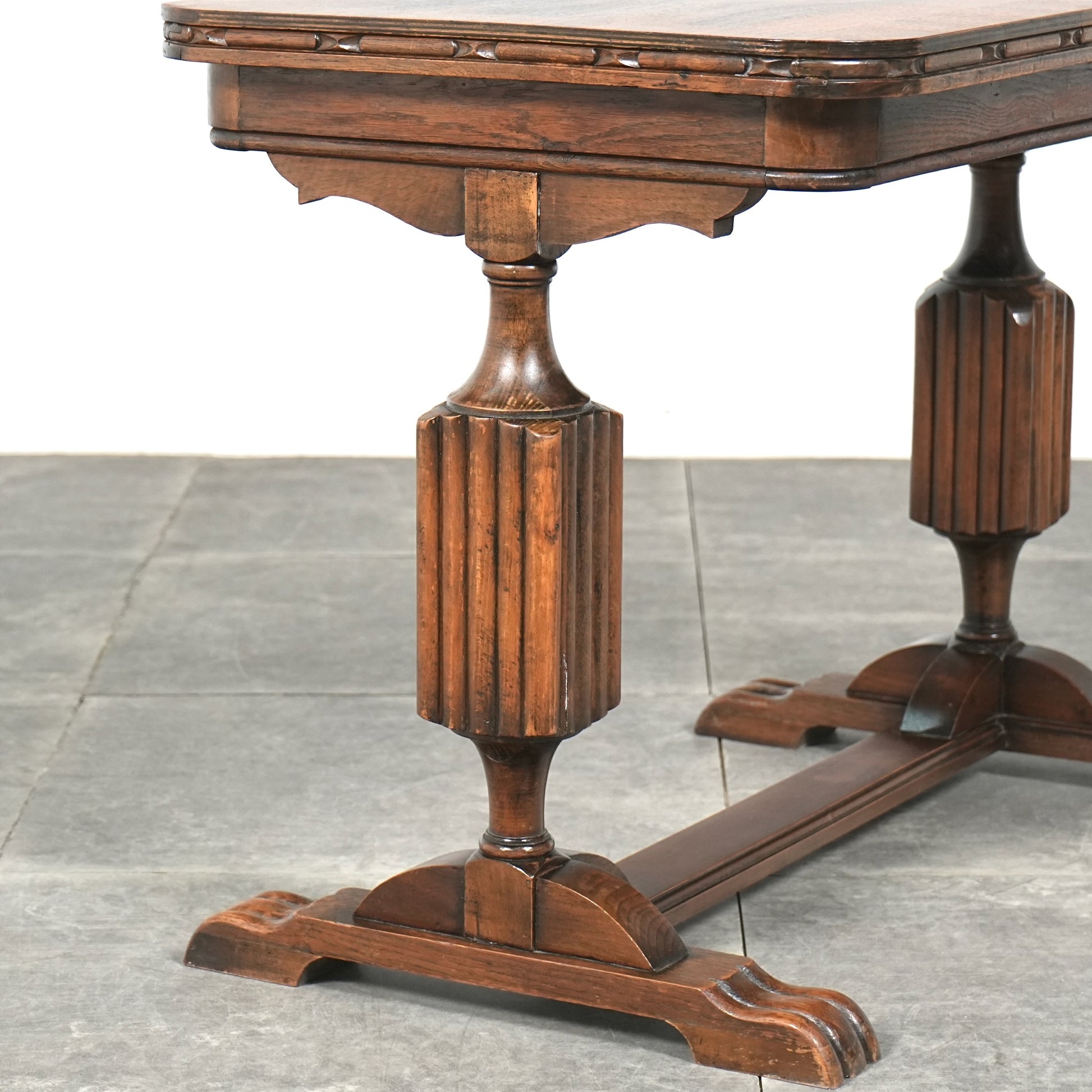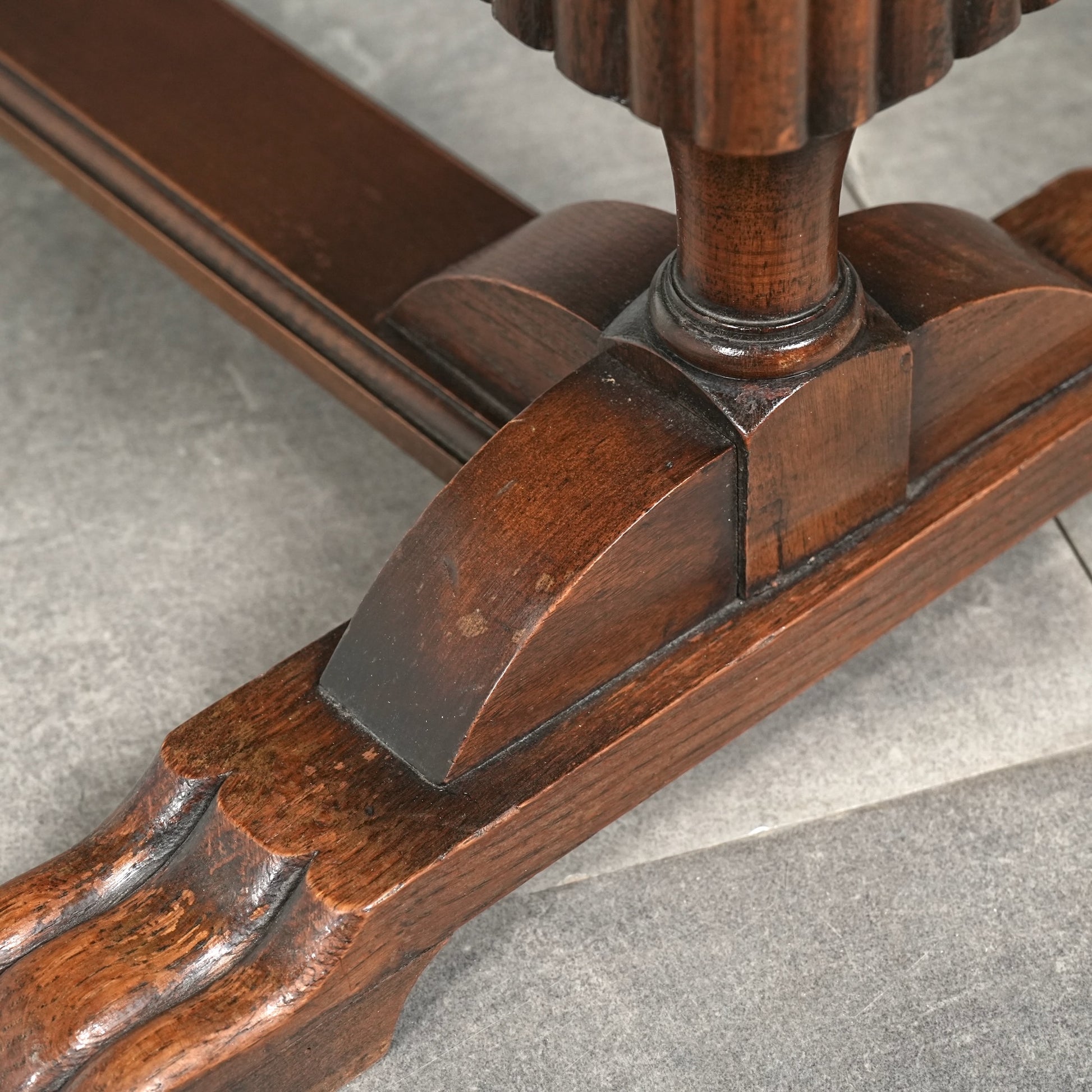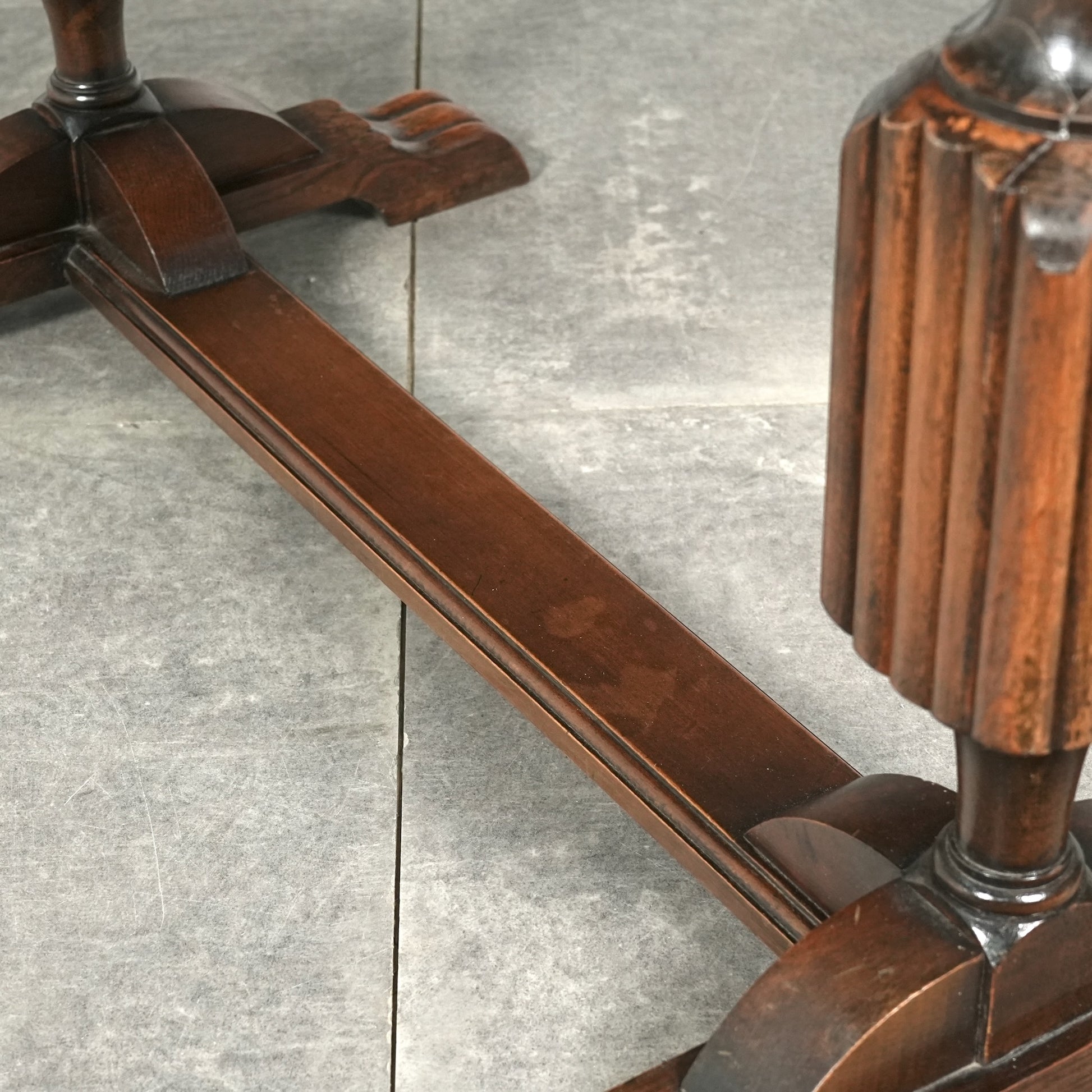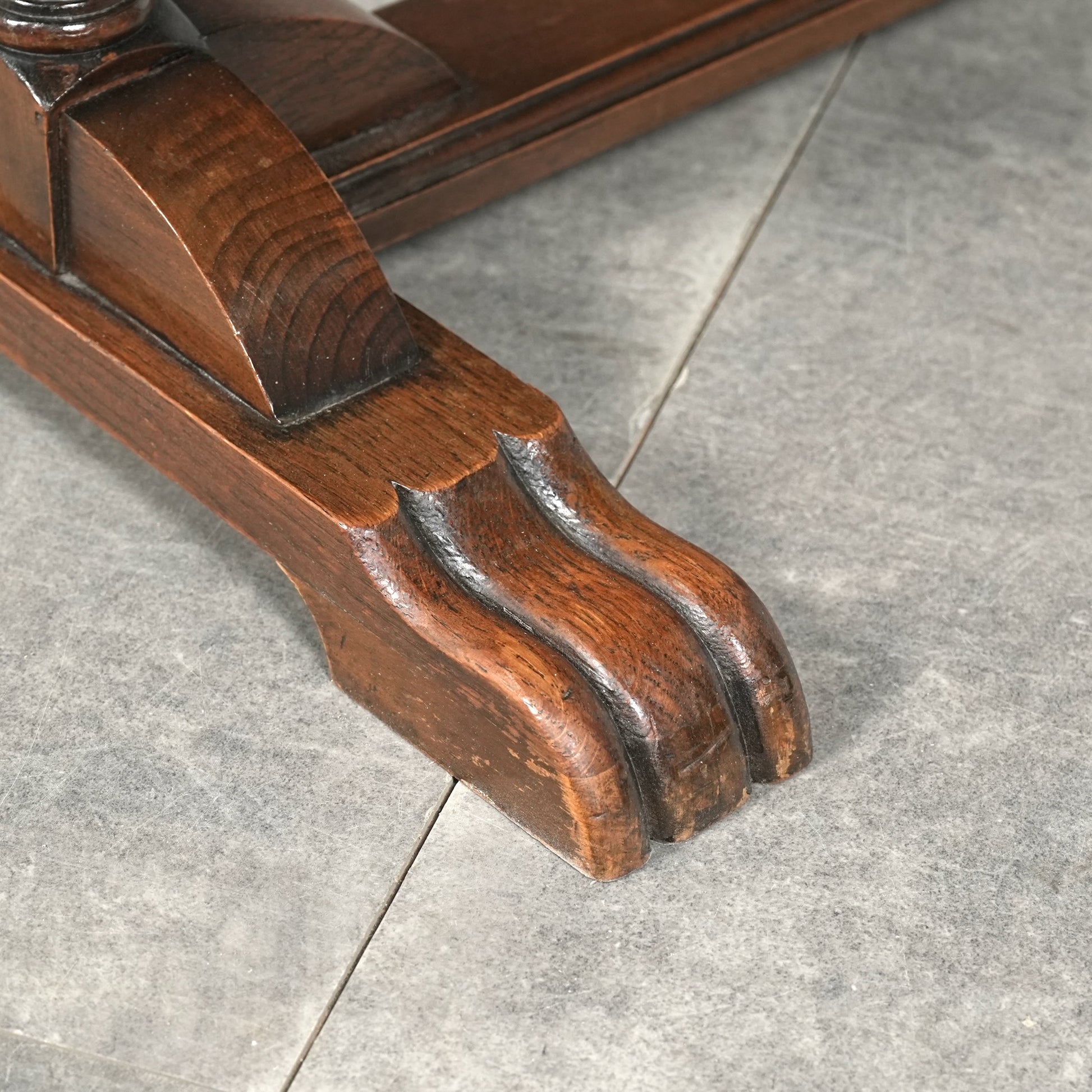 三大銘木のウォルナットの見事な杢目と質感が何よりの魅力で、英国伝統のバルボスレッグや天板木口のさり気ない作り込みなど、小型家具ながらも妥協のない丁寧な作り込みが光る、非常に完成度の高いアイテムです。