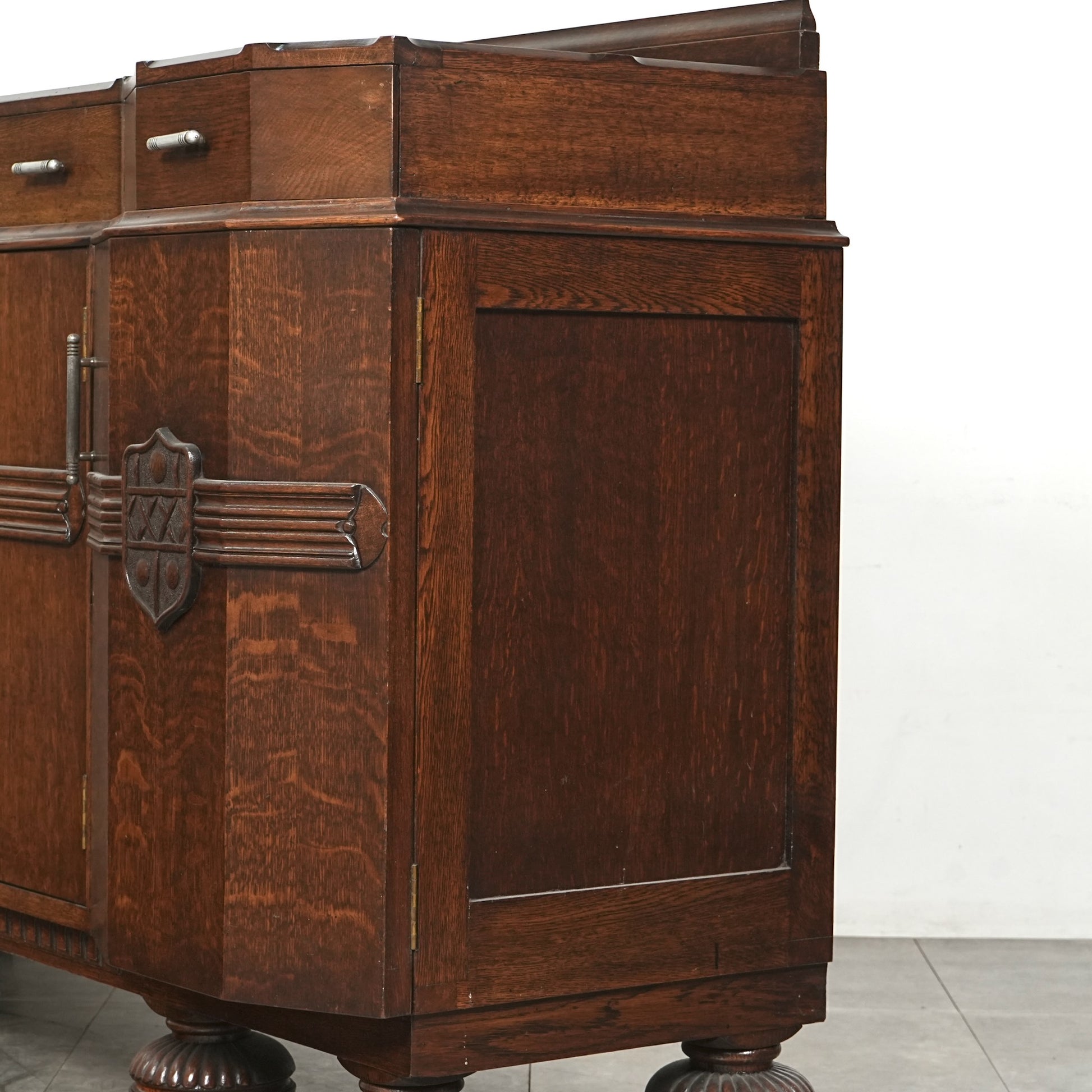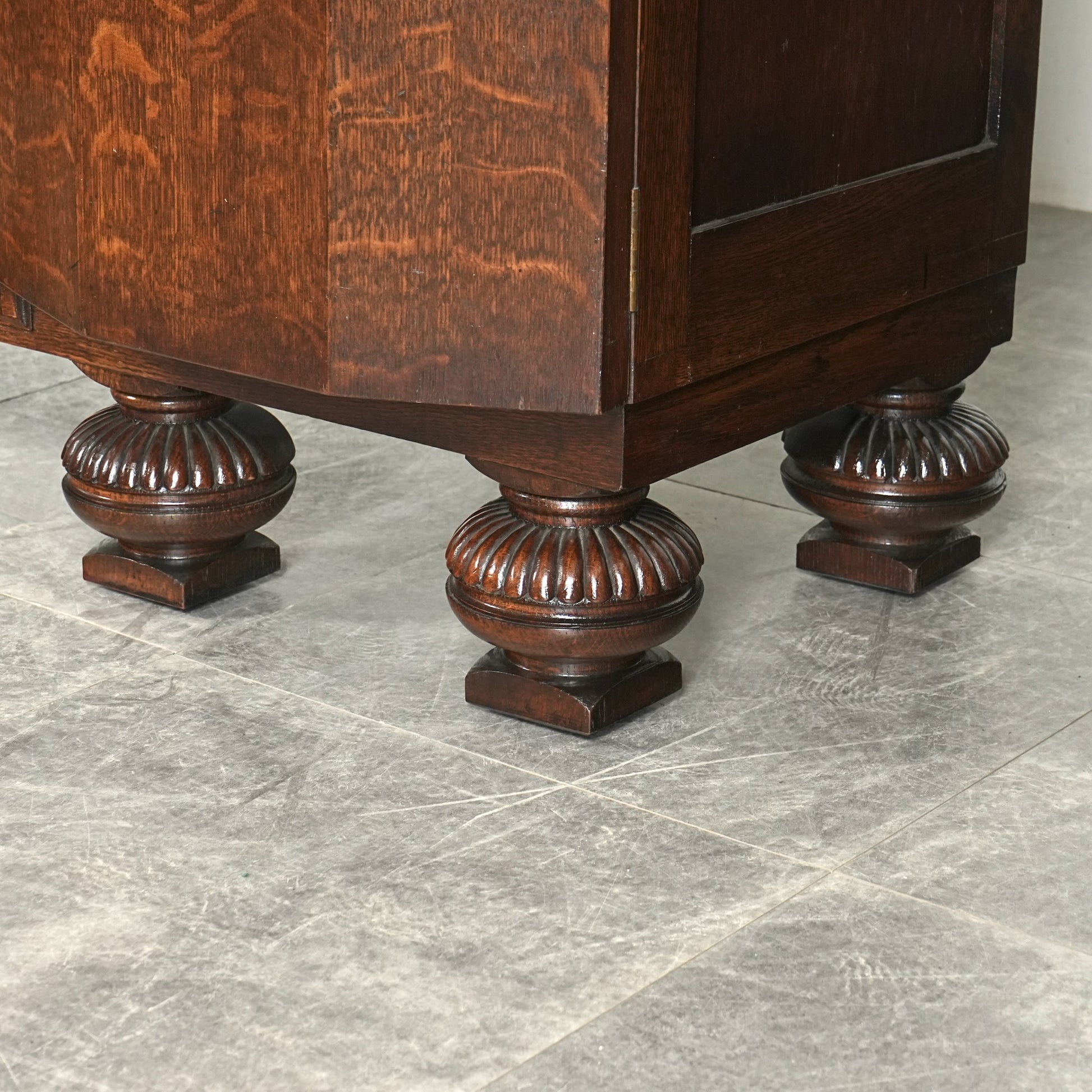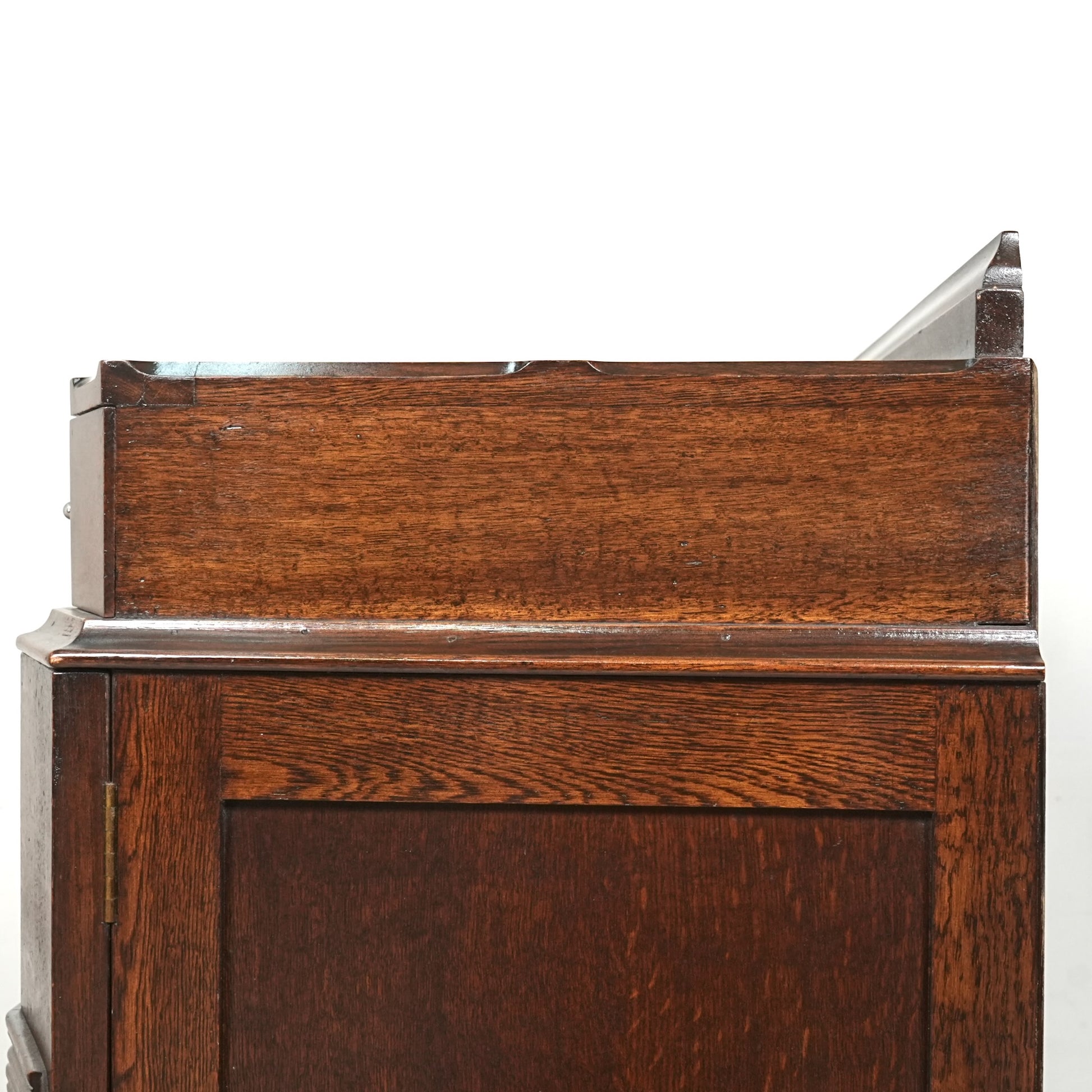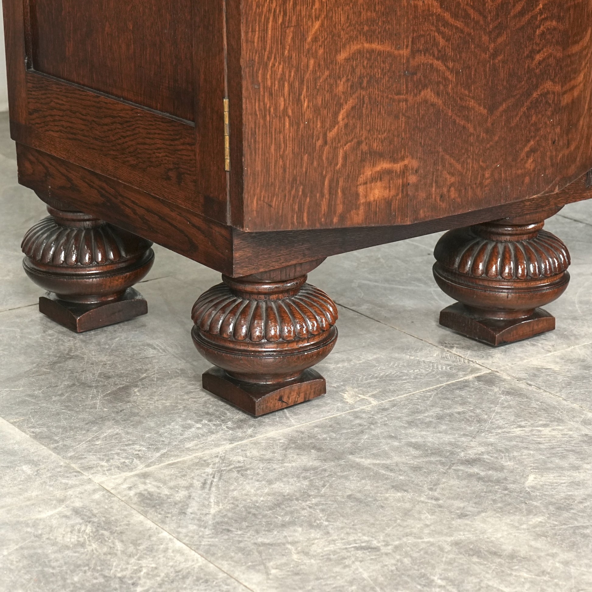 英国の伝統を感じさせる重厚で上品な佇まいで、オーク材の美しい木目と質感、随所に手作業で施された装飾や丁寧な作り込みからは当時の職人の高い技術と多大な労力が窺える上質な逸品。